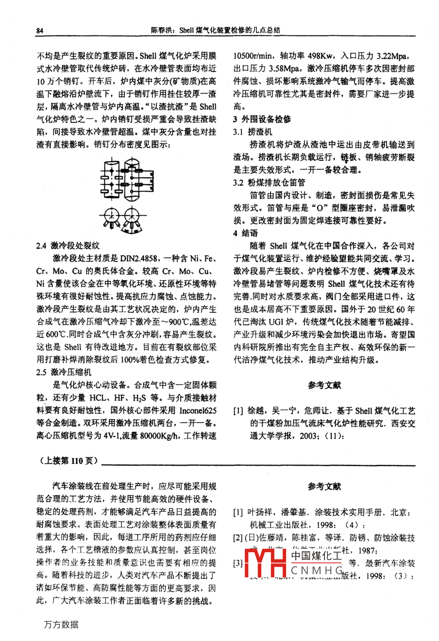 2009年第9期化學(xué)工程與裝備。2009年9月Chemical Engineering & Equipaent83Shell煤氣化裝置檢修的幾點(diǎn)總結(jié)陳春洪(湖北雙環(huán)化工集團(tuán)公司機(jī)械廠,湖北應(yīng)城432407)摘要:針對(duì)煤氣化停車檢修設(shè)備常見(jiàn)故障,分析了原因及修復(fù)措施,指出設(shè)備設(shè)計(jì)、配套需改進(jìn)處。關(guān)鍵詞:煤氣化;檢修;原因Shell煤氣化工藝以其環(huán)保、效率高逐漸成為國(guó)計(jì)壽命可達(dá)8000h.但在實(shí)際運(yùn)行中遠(yuǎn)達(dá)不到設(shè)計(jì)要內(nèi)許多廠家的首選工藝之一,自從殼牌公司與中國(guó)求。根據(jù)歷次停車煤燒嘴檢查情況分析,煤燒嘴壽開展專利授權(quán)、合作以來(lái),全國(guó)有近20多家公司命與工藝指標(biāo)穩(wěn)定有直接關(guān)系。根據(jù)氧煤比、蒸汽選擇利用Shell 煤氣化技術(shù)生產(chǎn)合成氨、甲醇等。煤比特性,煤氣中CO隨氧煤比增加,先上升到最湖北雙環(huán)科技股份有限公司利用煤氣化技術(shù)實(shí)現(xiàn)高點(diǎn)后下降。H2含暈隨氧煤比先上升后下降。隨蒸合成氨原料氣的"油改煤”裝置自2006年5月17汽煤比增加,氣化爐出口煤氣Co呈下降趨勢(shì)。[]日開始運(yùn)行,設(shè)計(jì)日投煤量1000td. 經(jīng)過(guò)多次停車隨氧煤比失控,造成煤燒嘴偏燒或爐溫異常直接影檢修,現(xiàn)設(shè)備磨合逐漸趨于穩(wěn)定。響煤燒嘴壽命。在實(shí)際運(yùn)行中要嚴(yán)格控制氧煤比、1 Shell 煤氣化工藝流程簡(jiǎn)介蒸汽煤比及冷卻水水質(zhì)等工藝指標(biāo)。其次,嚴(yán)格控制煤燒嘴安裝角度及與燒嘴單間隙、伸及進(jìn)爐內(nèi)深度等也是提高煤燒嘴壽命的重要控制點(diǎn)。2.2燒嘴罩點(diǎn)蝕、爆管燒嘴單主要是保護(hù)煤燒嘴作用,其主材質(zhì)是德國(guó)DIN 1.7335,與國(guó)產(chǎn)12CrMo相當(dāng)。在燒嘴單國(guó)產(chǎn)化后,用φ27x6mm換熱管替代原圖φ26.9xS.6mmC國(guó)換熱管。在多次停車中,燒嘴單表面吹損、裂紋、堵管而爆管是主要失效形式。燒嘴罩表面吹損與工藝指標(biāo)控制不穩(wěn)、煤燒嘴與燒嘴單安裝間隙及角度原煤經(jīng)破碎后通過(guò)皮帶輸送機(jī)、振動(dòng)篩、皮帶偏差有直接關(guān)系。而燒嘴罩堵管、爆管與冷卻水結(jié)輸送到磨煤機(jī)。在磨煤機(jī)內(nèi)原煤被磨成煤粉(其90%垢積渣有關(guān)。燒嘴罩制作時(shí)采用手工組對(duì),悍縫有粒度<100um).煤粉經(jīng)千燥后由煤粉倉(cāng)、加料倉(cāng)經(jīng)高120多道,管徑φ27x6mm換熱管組對(duì)焊時(shí)不可避壓氮?dú)馀c氧、蒸汽通過(guò)煤燒嘴送到氣化爐內(nèi)。煤粉、免產(chǎn)生焊瘤、組對(duì)錯(cuò)邊,從而使管內(nèi)水流產(chǎn)生許多氧、蒸汽在氣化爐高溫高壓下發(fā)生氧化轉(zhuǎn)化反應(yīng),.縮口效應(yīng),燒嘴單進(jìn)水節(jié)流孔不到管子通徑的12,生成合成氣(CO、H2、少量CO2),氣化爐反應(yīng)段溫度更易積渣堵管。為保證燒嘴罩流量均勻,燒嘴單制約1500C,激冷 壓縮機(jī)送來(lái)冷煤氣在激冷段處將高作時(shí)要嚴(yán)格控制錯(cuò)邊、焊瘤,制作完工后用超聲流溫合成氣激冷至~900C.合成氣經(jīng)輸氣導(dǎo)管送到合量計(jì)測(cè)量,吹除管內(nèi)制作時(shí)灰、渣,安裝前用氮?dú)獬蓺饫鋮s器回收熱量后進(jìn)干、濕法洗滌系統(tǒng)除塵降對(duì)進(jìn)。出水管吹除.開車后嚴(yán)格控制冷卻水化學(xué)成溫,煤氣塵含量<1mg/m3送變換工序。分及中國(guó)煤化工2常見(jiàn)系統(tǒng)停車設(shè)備原因2.3THCNMHG超溫.2.1煤燒嘴頭部燒損氣化爐膜式水冷壁管材質(zhì)DIN. 1.7335煤燒嘴是Shell 公司核心專利技術(shù)之一-,其設(shè).φ38x6.3mm換熱管,水冷壁管因部分堵管產(chǎn)生換熱84_陳春洪: Shell 煤氣化裝置檢修的幾點(diǎn)總結(jié)不均是產(chǎn)生裂紋的重要原因。Shell煤氣化爐采用膜10500r/min,軸功率498Kw,入口壓力3.22Mpa,式水冷壁管取代傳統(tǒng)爐磚,在水冷壁管表面均布近出口壓力3.58Mpa。激冷壓縮機(jī)停車多次因密封部10萬(wàn)個(gè)銷釘。開車后,爐內(nèi)煤中灰分(礦物質(zhì))在高件腐蝕、損壞影響系統(tǒng)激冷氣輸氣而停車。提高激溫下融熔沿爐壁流下,由于銷釘作用掛住較厚一渣冷壓縮機(jī)可靠性尤其是密封件,需要廠家進(jìn)-步提層,隔離水冷壁管與爐內(nèi)高溫?!耙栽乖笔荢hell氣化爐特色之一.爐內(nèi)銷釘受損嚴(yán)重會(huì)導(dǎo)致掛渣缺3外圍設(shè)備檢修陷,間接導(dǎo)致水冷壁管超溫.煤中灰分含量也對(duì)掛3.1撈渣機(jī)渣有直接影響。銷釘分布密度見(jiàn)圖示:撈渣機(jī)將爐渣從渣池中運(yùn)出由皮帶機(jī)輸送到渣場(chǎng)。撈渣機(jī)長(zhǎng)期負(fù)載運(yùn)行,鏈板、銷軸疲勞斷裂是主要失效形式,- -開一備較合理。3.2粉煤排放倉(cāng)笛管笛管由國(guó)內(nèi)設(shè)計(jì)、制造,密封面損傷是常見(jiàn)失效形式。笛管與座是“O"型圈座密封,易泄漏吹損。更改密封面為固定焊連接可靠性要好。4結(jié)語(yǔ)2.4激冷段處裂紋隨著Shell 煤氣化在中國(guó)合作深入,各公司對(duì)激冷段處主材質(zhì)是DIN2.4858, - -種含Ni、Fe、于煤氣化裝置運(yùn)行、維護(hù)經(jīng)驗(yàn)望能共同交流、學(xué)習(xí)。Cr、Mo、Cu的奧氏體合金。較高Cr、Mo、Cu.激冷段易產(chǎn)生裂紋、爐內(nèi)檢修不方便、燒嘴單及水Ni含量使該合金