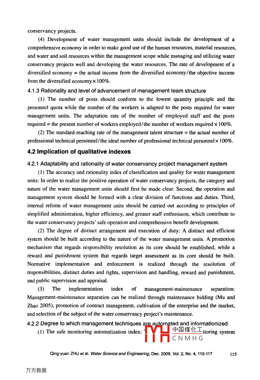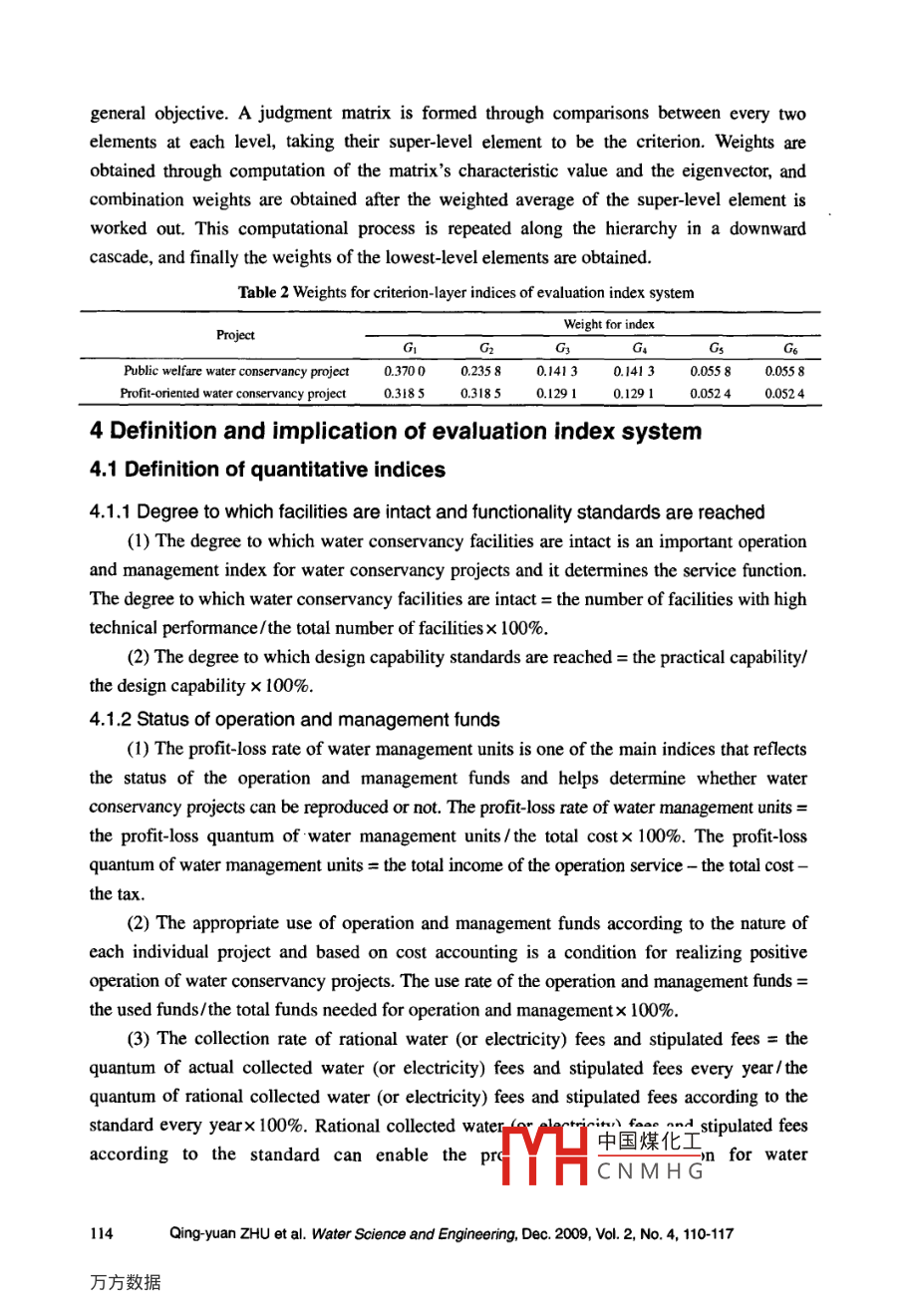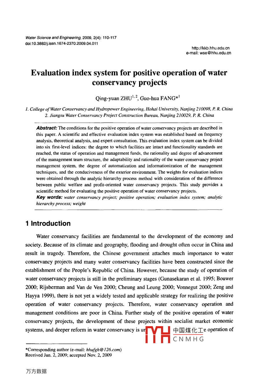 Water Science and Engineering, 2009, 2(4): 110-117doi:10.388/j.isn.1674-2370.2009.04.011htp:/k.hhu.edu.cne-mail: wse @hhu.edu.cnEvaluation index system for positive operation of waterconservancy projectsQing yuan ZHU"2, Guo-hua FANG*'I. College of Water Conservancy and Hydropower Engineering, Hohai University, Nanjing 210098, P. R. China2. Jiangsu Water Conservancy Project Consrruction Bureau, Nanjing 210029, P. R. ChinaAbstract: The conditions for the positive operation of water conservancy projects are described inthis paper. A scientific and effective evaluation index system was established based on frequencyanalysis, theoretical analysis, and expert consultation. This evaluation index system can be dividedinto six first-level indices: the degree to which facilities are intact and functionality standards arereached, the status of operation and management funds, the rationality and degree of advancementof the management team structure, the adaptability and rationality of the water conservancy projectmanagement system, the degree of automatization and informationization of the managementtechniques, and the conduciveness of the exterior environment. The weights for evaluation indiceswere obtained through the analytic hierarchy process method with consideration of the differencebetween public welfare and profit-oriented water conservancy projects. This study provides ascientific method for evaluating the positive operation of water conservancy projects.Key words: water conservancy project; positive operation; evaluation index system; analytichierarchy process; weight1 IntroductionWater conservancy facilities are fundamental to the development of the economy andsociety. Because of its climate and geography, flooding and drought often occur in China andresult in tragedy. Therefore, the Chinese government attaches much importance to waterconservancy projects and many water conservancy facilities have been constructed since theestablishment of the People's Republic of China. However, because the study of operation ofwater conservancy projects is still in the preliminary stages (Gunasekaran et al. 1995; Bouwer2000; Rijsberman and Van de Ven 2000; Cheung and Leung 2000; Vonnegut 2000; Zeng andHayya 1999), there is not yet a widely tested and applicable strategy for realizing the positiveoperation of water conservancy projects. Therefore, water conservancy operation andmanagement conditions are poor in China. Further study of the positive operation of waterconservancy projects, the development of these projects within socialist market economicsystems, and deeper reform in water conservancy is ur中國(guó)煤化工e operation ofYHCNMHG*Corresponding author (e-mail: hhufgh@ 126.com)Received Jun. 2, 2009; accepted Nov. 2, 2009water conservancy projects involves many aspects, its scope is very broad, and its goals arenumerous. If there is no objective and scientific evaluation index system, the study of positiveoperation of water conservancy projects is not practical and cannot guide the management ofwater conservancy projects.Therefore, the conditions for realizing positive operation of water conservancy projectscan be described only after the positive operation of water conservancy projects is defined.Then, a scientfic and effective evaluation index system can be established with a defimitionand implication for each index. Finally, with consideration of the difference between publicwelfare and profit-oriented water conservancy projects, the weights for evaluation indices canbe obtained through the analytic hierarchy process method.2 Definition and implication of positive operation of waterconservancy projectsThe core goal for the positive operation of water conservancy projects is that the incomeis greater than or equal to the expenditure for the water management units. However, there issome one- sidedness in the study of positive operation of water conservancy projects. Forexample, some researchers have only examined social or economic efficiency, while otherresearchers have included the reform of the management system in their investigations. Infurther studies, some scholars have established a definition of positive operation of waterconservancy projects (Yang 1994; Su 2007). Mu et al. (2006) categorized water conservancyprojects as public welfare water conservancy projects, profit-oriented water conservancyprojects, or comprehensive water conservancy projects. The management systems of largecomprehensive water conservancy projects have been studied (Mu et al. 2006). Meanwhile,the basic implications of large comprehensive water conservancy projects were analyzed byMu et al, (2006) as follows: the positive operation of large comprehensive water conservancyprojects means that the hydraulic engineering facilities remain complete and functional until totheir service life, the preliminary design functions and goals can be safely achieved during theoperation period, and sustainable and stable economic or social efficiency is maintainedaccording to the design functions.Therefore, the essence of positive operation of water conservancy projects is as follows:under the condition of national economic benefits being greater than or equal to the costs inwater conservancy projects, the water management units can guarantee the financial balanceof payments and maintain the simple reproduction of projects, as well as the progressiverealization of the projects' expanded reproduction. It can be said that the implications 0positive operation of water conservancy projects are that the water conservancy projects'financial benefits are greater than or equal to financial中國(guó)煤化工a progressiveYHCNMHGQing-yuan ZHU et al. Water Science and Engineering, Dec. 2009, Vol. 2, No. 4, 110-117111realization from simple reproduction to expanded reproduction of hydraulic projects.The conditions for realizing positive operation of water conservancy projects include thefollowing: consistent operation of the project, ade