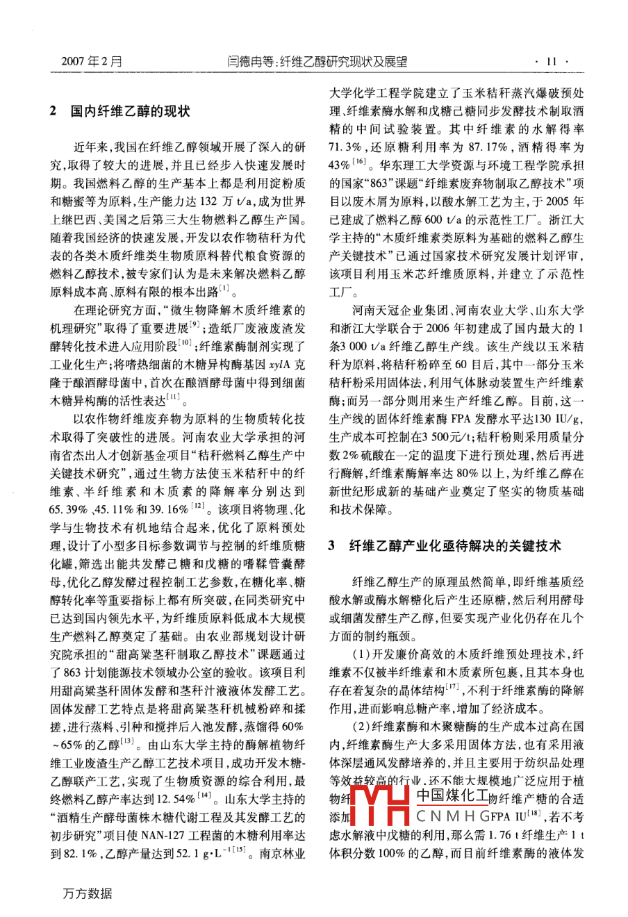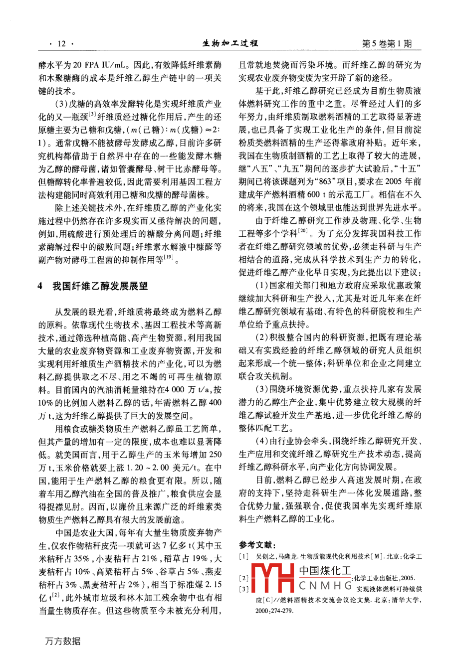 第5卷第1期生物加工過程Feb.20072007年2月Chinese Journal of Bioprocess Engineerin纖維乙醇研究現(xiàn)狀及展望閆德冉,陳偉紅,張麗莉2,杜風(fēng)光!,宋安東(1.河南天冠集團(tuán),南陽(yáng)473000;2.南陽(yáng)市環(huán)??蒲兴?南陽(yáng)473000;3.河南農(nóng)業(yè)大學(xué)生命科學(xué)學(xué)院,鄭州450002)摘要:介紹了近年來國(guó)內(nèi)外纖維乙醇的研究現(xiàn)狀,闡述了目前纖維乙醇生產(chǎn)存在的問題,分析了纖維乙醇產(chǎn)業(yè)化亟待解決的關(guān)鍵技術(shù),展望了纖維乙醇的發(fā)展關(guān)鍵詞:纖維乙醇;糖化;發(fā)酵中圖分類號(hào):S826.5文獻(xiàn)標(biāo)識(shí)碼:A文章編號(hào):1672-3678(2007)01-0004-05Recent research Progress and prospect of cellulose fuel ethanolYAN De-ran', CHEN Wei-hong, ZHANG Li-1i, DU Feng-guang, SONG An-dong(1. Henan Tianguan Group, Nanyang 473000, China2. Institute of Enviromental protection Research, Nanyang 473000, China;3. College of Life Science, Henan Agricultural University, Zhengzhou 450002, China)Abstract The reseach process and application of the cellulose fuel ethanol was introduced. The generalsituation of the cellulose ethanol technology inland and abroad was summarized. The key problems in thecellulose ethanol industrialized process were analyzed. The development strategies of the cellulose ethawasKey words: cellulose fuel ethanol; saccharification; fermentation纖維素制酒精技術(shù)在19世紀(jì)已提出,并在美國(guó)質(zhì)制燃料酒精的技術(shù)。以美國(guó)國(guó)家可再生能源實(shí)和前蘇聯(lián)建有工廠。其方法是把原料中的纖維素驗(yàn)室( National Renewable Energy Laboratory,簡(jiǎn)稱水解為單糖,再把單糖發(fā)酵成為酒精。該工藝的原NREL)為代表的研究者進(jìn)行了大量的工作,使該技料價(jià)格雖然便宜,但生產(chǎn)成本卻很高,隨著以石油術(shù)取得了長(zhǎng)足的進(jìn)步,預(yù)期生產(chǎn)成本已降低一半以為原料的合成酒精大量生產(chǎn),這類廠大都關(guān)閉,只上(。目前纖維乙醇生產(chǎn)在技術(shù)上已無問題,但在有前蘇聯(lián)還有生產(chǎn)。我國(guó)黑龍江省伊春市的南岔經(jīng)濟(jì)性方面仍需要解決許多制約因素因此世界各木材水解廠是20世紀(jì)60年代引進(jìn)前蘇聯(lián)設(shè)備建成國(guó)所建纖維乙醇生產(chǎn)線大多只能算作示范性工廠,的80年代末又引進(jìn)該國(guó)設(shè)備與技術(shù)進(jìn)行改造,以要真正實(shí)現(xiàn)纖維乙醇產(chǎn)業(yè)化還需要很長(zhǎng)的一段路木屑為原料,年產(chǎn)酒精3000t,之后因缺乏原料等原要走。因而停產(chǎn)。本世紀(jì)初,伴隨著國(guó)際石油價(jià)格的一路狂飆及在20世紀(jì)石油危機(jī)后,西方國(guó)家開始重視生物世界各國(guó)對(duì)能源需求的增加,利用纖維質(zhì)原料生產(chǎn)中國(guó)煤化工收稿日期:2006-1019THSCNMH基金項(xiàng)目:國(guó)家科技部“863”資助項(xiàng)目(200AA5140202);河南省杰出可南省科技廳重點(diǎn)攻關(guān)資助項(xiàng)目(0423022900)作者簡(jiǎn)介:閏德冉(1968-),男,河南南陽(yáng)人,工程師,研究方向:生物工程。E-mail;bandera@uom.com·10生物加工過程第5卷第1期乙醇工藝的研究和開發(fā)成為目前國(guó)內(nèi)外研究的重蒸發(fā)器濃縮至糖質(zhì)量分?jǐn)?shù)為11%再進(jìn)行發(fā)酵。點(diǎn),如何開發(fā)高效廉價(jià)的纖維質(zhì)原料預(yù)處理技術(shù)、為了降低纖維酒精的生產(chǎn)成本,美國(guó) Novozymes選育誘變產(chǎn)高酶活的纖維素酶生產(chǎn)菌株、構(gòu)筑能同公司和美國(guó)NREL合作開發(fā)的生物基乙醇燃料項(xiàng)目化五碳糖的酵母菌株以及實(shí)現(xiàn)相對(duì)高濃度發(fā)酵等獲重大進(jìn)展,將生產(chǎn)1L燃料乙醇所需纖維素酶的是降低纖維乙醇成本的關(guān)鍵。國(guó)外在這方面做成本從最初超過1.32美元的水平大幅減少至當(dāng)前了大量的研究工作,并建起了一定規(guī)模的中試生產(chǎn)的低于13.2美分。 Novozymes公司和NREL下一步廠。我國(guó)在“十五”期間已將纖維乙醇研究工作提將努力降低纖維素酶的生產(chǎn)成本,目標(biāo)是在未來的上日程,并在國(guó)家“863”計(jì)劃中作為研究課題進(jìn)行兩年中把生產(chǎn)1L燃料乙醇所需纖維素酶的成本降重點(diǎn)攻關(guān),國(guó)內(nèi)的河南天冠、安徽豐原和河北唐山低至265美分6。另外,美國(guó)普度大學(xué)的何汪媛教的太博爾等企業(yè)也在進(jìn)行這方面的研究工作。授利用基因工程技術(shù)構(gòu)建了可發(fā)酵戊碳糖的酵母菌株,為半纖維素的酒精轉(zhuǎn)化奠定了基礎(chǔ)1國(guó)外纖維乙醇研究的現(xiàn)狀近年來,隨著纖維乙醇技術(shù)的快速發(fā)展,歐美國(guó)家的一些大公司已決定建造較大規(guī)模的工廠纖維乙醇的生產(chǎn)包括酸水解和酶水解兩種工 BC International公司計(jì)劃投資9000萬(wàn)美元(其中能藝。酸水解生產(chǎn)工藝最具代表性的是前蘇聯(lián)的連源部投資1100萬(wàn)美元),將一個(gè)閑置的煉油廠改造續(xù)滲濾水解流程、美國(guó) Vulcan化工公司與加拿大的成年產(chǎn)燃料酒精7600萬(wàn)L的生產(chǎn)廠。該廠以甘蔗Stake公司聯(lián)合研制的 Vulcan- Stake流程。連續(xù)滲殘?jiān)鼮樵?釆用稀硫酸水解,其核心技術(shù)是轉(zhuǎn)基濾水解流程是前蘇聯(lián)木材水解制造酒精的主要工因的E.coli(由佛羅里達(dá)大學(xué)開發(fā)),該菌