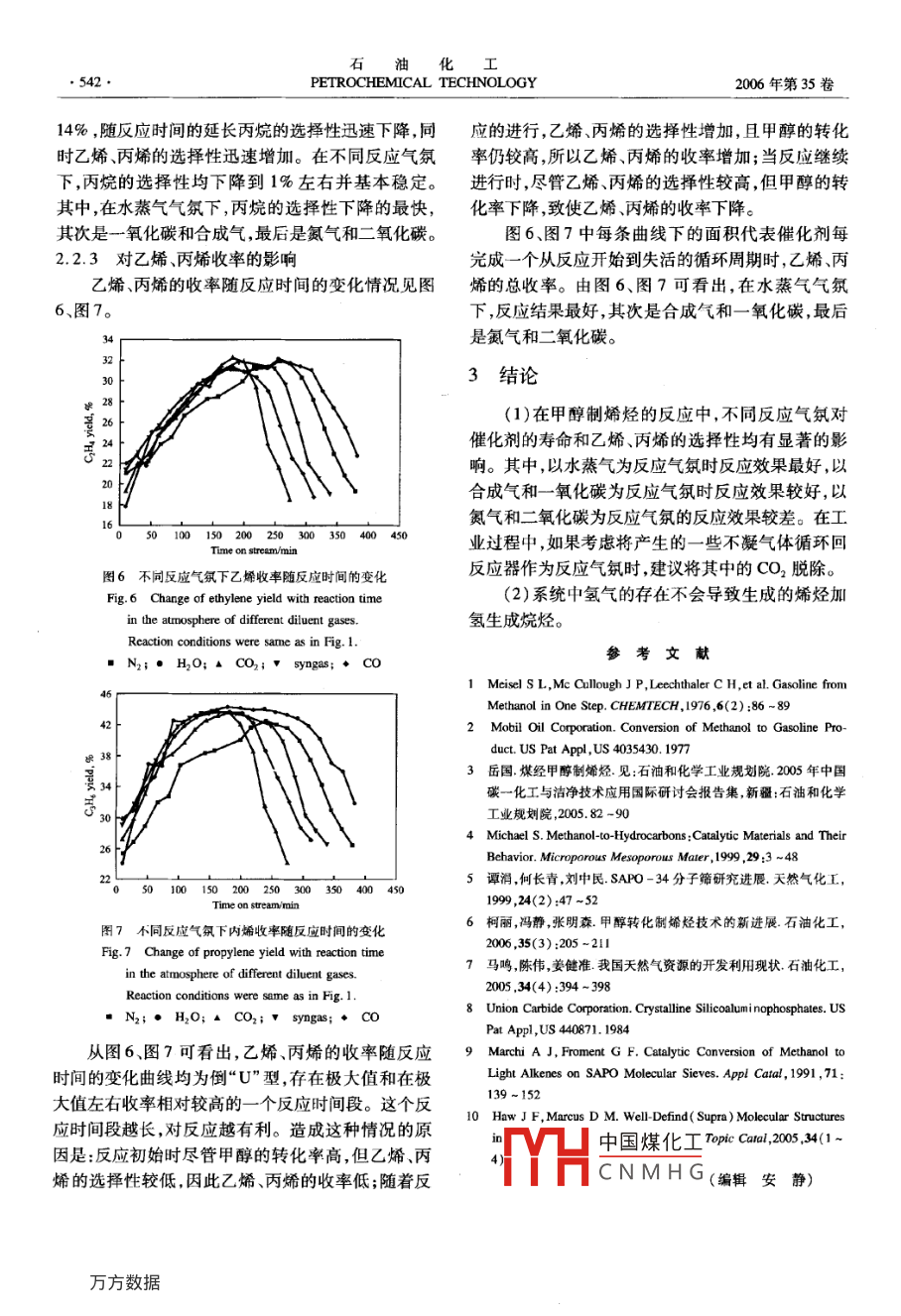 石油化工2006年第35卷第6期PETROCHEMICAL TECHNOLOGY539·反應(yīng)氣氛對(duì)甲醇制低碳烯烴反應(yīng)的影響柯麗,馮靜,馮炎,張明森(中國(guó)石油化工股份有限公司北京化工研究院,北京10013)[摘要]采用水熱合成法合成了SAPO-34分子篩將其制備成催化劑用于甲醇制烯烴反應(yīng);考察了氮?dú)狻⑺魵?、一氧化碳、二氧化碳及合成氣等反?yīng)氣氛對(duì)甲醇制烯烴反應(yīng)的影響;綜合考察了在不同反應(yīng)氣氛下,催化劑的活性隨反應(yīng)時(shí)間的變化。實(shí)驗(yàn)結(jié)果表明,反應(yīng)氣氛對(duì)甲醇制烯烴反應(yīng)有較大影響,以水蒸氣為反應(yīng)氣氛時(shí)反應(yīng)效果較好催化劑壽命最長(zhǎng),在甲醇質(zhì)量空速2h1、反應(yīng)溫度380的條件下,甲醇轉(zhuǎn)化率維持在9%以上的時(shí)間可達(dá)250min,乙烯、丙烯的選擇性及收率最高,可分別達(dá)到33%,45%及3%,45%;以合成氣和一氧化碳為反應(yīng)氣氛時(shí)反應(yīng)效果較差,而以氮?dú)夂投趸紴榉磻?yīng)氣氛時(shí)反應(yīng)效果最差[關(guān)鍵詞]甲醇;低碳烯烴;反應(yīng)氣氛;SAPO-34分子篩;催化劑[文章編號(hào)]1000-8144(2006)06-0539-04[中圖分類(lèi)號(hào)]TQ22.2[文獻(xiàn)標(biāo)識(shí)碼]AEffects of Diluent Gases on Preparation of Light Olefins from MethanolKe li, Feng Jing, Feng Yan, Zhang MingsenBeijing Research Institute of Chemical Industry, SINOPEC, Beijing 100013, China)[Abstract] SAPO-34 molecular sieves, as catalyst for preparation of light olefins from methanol, weresynthesized by hydrothermal crystallization. Effects of diluent gases, namely nitrogen, vapor, carbonmonoxide, carbon dioxide and syngas, on conversion of methanol, selectivity to light olefins and catalystlife were investigated. Changes of catalyst performance with reaction time under different atmosphere ofdiluent gases were studied. Diluent gases affected remarkably the preparation. When vapor was used asdiluent, catalytic activity was the best and catalyst life was the longest. Under reaction temperature380 C, methanol WHSV 2.0 h- and vapor as diluent, methanol conversion could reach 99%andmaintained without change for 250 min, selectivities to ethylene and propylene could reach 33 and45% respectively, and so were their yields. Syngas and carbon monoxide were not suitable to be used asdiluent gases. Nitrogen and carbon dioxide were even worseKeywords]methanol; light olefins; diluent gas; SAPO-34 molecular sieves; catalyst以SAPO-34分子篩為催化劑,甲醇經(jīng)二甲醚司;異丙醇鋁:AR,北京化學(xué)試劑公司;磷酸:質(zhì)量分催化轉(zhuǎn)化制乙烯、丙烯等低碳烯烴技術(shù)的研究始于數(shù)85%,AR,北京化工廠;四乙基氫氧化銨:質(zhì)量分1976年2,近年來(lái)得到了很大的發(fā)展,已接近工業(yè)數(shù)30%,AR,北京興福精細(xì)化工研究所;甲醇:AR,化階段。UOP和 Exxon Mobil等一些大的石化公北京化工廠;氮?dú)?高純,北京化工研究院;合成氣司一直在研究甲醇制烯烴的工藝及催化劑4,大連化一氧化碳、二氧化碳:標(biāo)準(zhǔn)氣,北京氦普北分氣體工北京化工研究院也開(kāi)始關(guān)注這方面的研究進(jìn)暖·業(yè)有限公司學(xué)物理研究所在這方面也作了很多工作5。近年來(lái)1.2SAPO-34分子篩的合成及催化劑的制備發(fā)現(xiàn)在SAPO-34分子篩改性方面的研究較多,而對(duì)采用水熱合成法合成SAPO-34分子篩8不同反應(yīng)氣氛對(duì)甲醇制烯烴反應(yīng)的影響未見(jiàn)報(bào)道將一定量的水、異丙醇鋁、磷酸、硅酸四乙酯及四乙本工作研究了氮?dú)?、水蒸氣、一氧化碳、二氧化基氫氧化錢(qián)按一定的順序加入到四口瓶中劇烈攪碳及合成氣等反應(yīng)氣氛對(duì)甲醇制烯烴反應(yīng)的影響。拌,中國(guó)煤化工溶液轉(zhuǎn)移到高壓釜1實(shí)驗(yàn)部分CNMHG收稿日期]2006-02-13;[修改稿日期]2006-03-27。1.1試劑與原料[作者簡(jiǎn)介]柯麗(1963一),女,河北省青縣人,碩士,高級(jí)工程師硅酸四乙酯:AR,北京益利精細(xì)化學(xué)品有限公電話010-64216131-2526電郵kei@bi.ac.cm石油化工PETROCHEMICAL TECHNOLOGY2006年第35卷中,升到一定溫度,在自生壓力下,結(jié)晶一定時(shí)間;經(jīng)間變化的情況。由圖1可看出,反應(yīng)初始,在所選離心分離得到固體產(chǎn)物,將固體產(chǎn)物用水洗滌,在烘擇的反應(yīng)氣氛下,甲醇的轉(zhuǎn)化率都能達(dá)到100%,箱中烘干,得到SAPO-34分子篩。將一定量的隨反應(yīng)的進(jìn)行,催化劑活性下降,甲醇轉(zhuǎn)化率降SAPO-34分子篩與一定比例的可溶性淀粉、氧化低。但是,不同反應(yīng)氣氛下,催化劑活性下降的情鋁、水混合制成小球狀,在烘箱中烘干后制得催化劑。況有較大差異。水蒸氣為反應(yīng)氣氛時(shí),催化劑維1.3SAPo-34分子篩的表征持高活性的時(shí)間最長(zhǎng),即催化劑的壽命最長(zhǎng)。然采用菲力浦公司X/ pret MPD型X射線衍射后按氮?dú)?、合成氣、一氧化碳、二氧化碳的順?催(XRD)儀檢測(cè)SAPO-34分子篩的結(jié)晶狀態(tài),Cu化劑的壽命依次縮短,從250min縮短到180靶,管電壓40kV,管電流4mA,掃描速率3(反應(yīng)氣氛影響催化活性的因素可能有多種min。采用美國(guó)HI公司Ⅺ-30ESEM型掃描電鏡但甲醇轉(zhuǎn)化制烯烴的反應(yīng)是典型的酸催化反應(yīng),(SEM)觀察SAPO-34分子篩的形貌。因此,可以從不同反應(yīng)氣氛對(duì)催化劑表面酸性的1.4催化劑的評(píng)價(jià)影響進(jìn)行分析。從酸堿性看,這幾種反應(yīng)氣氛中,催化劑的評(píng)價(jià)在微型固定