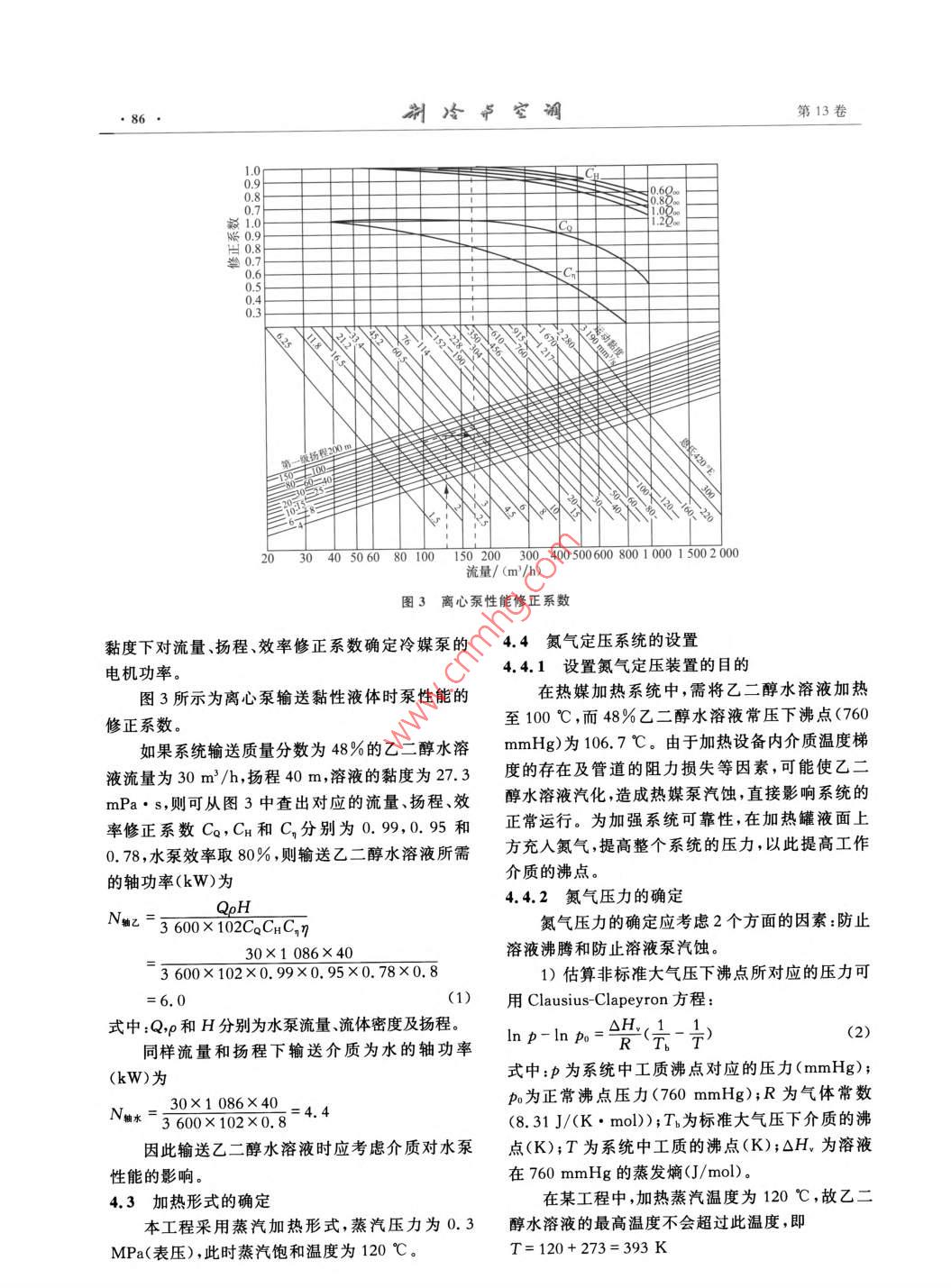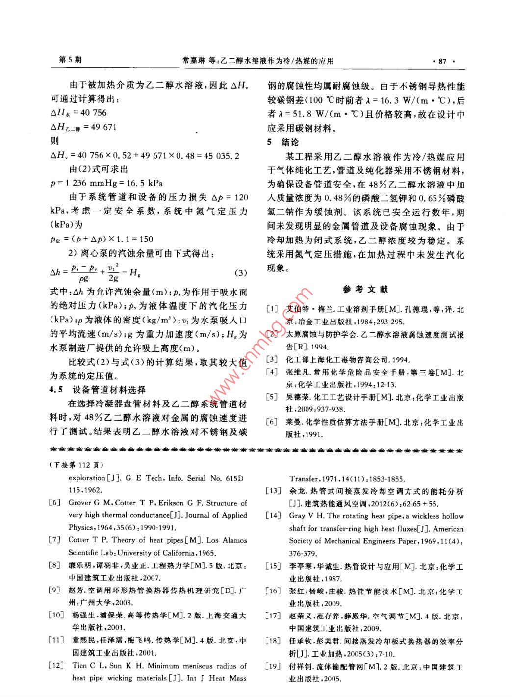 第13卷第5期2013年6月REFRIGERATION AND AIR-CONDITIONING84-87乙二醇水溶液作為冷/熱媒的應(yīng)用常嘉琳唐培亮(深圳市建筑設(shè)計研究總院有限公司)摘要化工生產(chǎn)物料純化工藝需采用冷/熱媒分階段對物料進(jìn)行冷凝、汽化。采用安全可靠、熱力性能滿足使用要求的介質(zhì)是提高生產(chǎn)效率、保證物料質(zhì)量的重要環(huán)節(jié)。本文介紹乙二醇水溶液作為冷/熱媒在物料純化過程中的應(yīng)用關(guān)鍵詞乙二醇水溶液;冷/熱媒;物料純化Application of glycol solution as cooling heating mediumChang Jialin Tang Peiliang(Shenzhen Architecture Design and Research Institute Co. LtdaBSTRact The cooling heating medium is adopted for condensation and gasificationin the material purification process. The medium with safety, reliability and required ther-mal performance is important to improve the productivity and secure the quality. The ap-plication of the glycol solution as cooling heating medium in the material purification isdescribedKEY WORDS glycol solution; cooling heating medium; material purification1我國現(xiàn)有物料純化工藝的冷凍、加熱系統(tǒng)蒸汽在我國一些化工企業(yè)中,物料純化工藝通常采用鹽水冷卻、蒸汽加熱流程(見圖1)。純化器)冷媒網(wǎng))物料冷凝時,將鹽水通人純化器,不斷循環(huán)冷媒泵壓縮待冷凝工序完成后,為將冷凝器盤管內(nèi)殘留的鹽空氣水排人冷凍系統(tǒng),須用壓縮空氣將鹽水排入排液制冷機(jī)組箱,再經(jīng)排液泵注入系統(tǒng)排液箱當(dāng)物料被汽化時,將蒸汽通入純化器盤管,待排液泵汽化過程完成后,再用壓縮空氣將盤管中的凝結(jié)排入下水管水吹掃干凈,以防止鹽水通入時濃度變化引起凝圖1蕪汽(熱媒)鹽水(冷媒)系統(tǒng)流程固點改變。該流程存在以下不足:1)由于冷卻介質(zhì)(冷媒)采用了鹽水,而鹽水對金屬的腐蝕性較強(qiáng)(溫度≤80℃,年腐蝕率為純化器)口(冷媒罐)0.05~0.5mm/a),因此設(shè)備和管道有被腐蝕而發(fā)冷媒泵生泄漏事故的可能性。為防止事故發(fā)生,必須增加設(shè)備和管道的壁厚,工程造價提高。2)由于加熱和冷卻采用不同工質(zhì),在冷熱媒罐)⊙制冷機(jī)組)熱媒泵凝、汽化工序轉(zhuǎn)換時操作程序復(fù)雜,工作周期圖2冷/熱媒采用同一介質(zhì)的系統(tǒng)流程圖延長。收稿日期:2012-10-30作者簡介:常嘉琳,本科,高級工程師,副總工程師,主要研究方向為制冷和暖通第5期常嘉琳等:乙二醇水溶液作為冷/熱媒的應(yīng)用852采用同一種介質(zhì)的冷凍、加熱系統(tǒng)3)密度小。當(dāng)流量一定時輸送密度小的介釆用同一種介質(zhì)作為冷/熱媒,在物料被冷凝質(zhì),其循環(huán)泵的功率消耗小時,將冷媒通入純化器,冷凝工序完成后,切換冷4)化學(xué)穩(wěn)定性好。在大氣條件下不分解,不凍、加熱系統(tǒng)閥門,進(jìn)行汽化過程。流程見圖2。與空氣中的氧化合,不改變其物理化學(xué)性質(zhì)相對采用不同介質(zhì)的冷凍、加熱系統(tǒng),該系統(tǒng)5)對設(shè)備、管道及附件腐蝕性小。具有以下優(yōu)點6)液態(tài)和氣態(tài)時均無毒1)采用同一種工質(zhì)作為冷熱媒,冷凝、汽化工乙二醇的特性見表1~表5。序轉(zhuǎn)化操作簡單。表1化學(xué)穩(wěn)定性2)對系統(tǒng)的管理、自控儀表的檢測更具先名稱燕汽壓(20℃)/揮發(fā)性分解性氧化反應(yīng)進(jìn)性。乙二醇不易3冷/熱媒的選擇1)在該系統(tǒng)的工作溫度范圍內(nèi),所選的冷/熱名稱吸人理想的冷/熱媒應(yīng)具有的特性:誤飲中毒量在空氣中濃度>0.14mg幾L媒是液體狀態(tài),其凝固點應(yīng)比該系統(tǒng)中制冷劑蒸乙醉引起咳嗽人的LD為1.4mL/kg最高溫度。表3燃燒爆炸性2)比熱容大。傳輸一定熱量時,比熱容大的名稱純物質(zhì)爆炸極限(體積分?jǐn)?shù))工質(zhì)流量小,可以減少輸送工質(zhì)循環(huán)泵的功率燃點/℃閃點/℃乙二醇118下限(vol)3.2%消耗表4熱力性能,濃度/凝固點/沸點/使用溫度/使用溫度下密度/使用溫度下比熱容/使用溫度下導(dǎo)熱系數(shù)/使用溫度下%(J/(g·℃))(W/(m·K))動力黏度/(mPa·s)3.640.435乙二醇481061.0863.040.436表5對金屬腐蝕性名稱對不銹鋼(1C18N9T對碳鋼腐蝕性(質(zhì)量分?jǐn)?shù))腐蝕性未加緩蝕劑加緩蝕劑溫度/℃年腐蝕率/(mm/a)溫度/℃年腐蝕率/(mm/a)溫度/℃年腐蝕率/(mm/a二醇(48%)25~1000.05~0.50.1631000.0336表6乙二醇水溶液(C1HO2)物性表溫度/℃10黏度/(mPa·s)20.712.07.482.391.501.141.091.07密度/(g/cm3)1.081.081.071.051.061.061.051.041.041.031.021.01導(dǎo)熱系數(shù)/(W/(m·℃))0.440.430.430.43430.430.430.420.420.420.420.42比熱容/(J/(g·℃))3.023.083.153.223.393.423.463.493.533.573.613.64注:乙二醇水溶液質(zhì)量分?jǐn)?shù)為48%,沸點為106℃,凝固點為-33℃通過上述分析可知,乙二醇水溶液作為冷/熱從表6可看出,乙二醇水溶液的質(zhì)量分?jǐn)?shù)為48%媒應(yīng)用于該類工程是安全可靠的。時,凝固點為-33℃,沸點為106℃,可滿足使用要4采用乙二醇水溶液為冷/熱媒的系統(tǒng)設(shè)計要點求。該質(zhì)量分?jǐn)?shù)下的導(dǎo)熱系數(shù)隨溫度的變化較小,但4.1乙二醇水溶液濃度的確定黏度隨溫度的變化較大,在設(shè)計中需考慮此因素。在某工程物料裝置的乙二醇系統(tǒng)中,其工作4.2冷媒泵功率的確定溫度為-25~100℃,因此乙二醇水溶液的濃度首普通離心泵是在一定流量下,根據(jù)揚(yáng)程確定先要滿足凝固點-30℃以下、沸點105℃以上