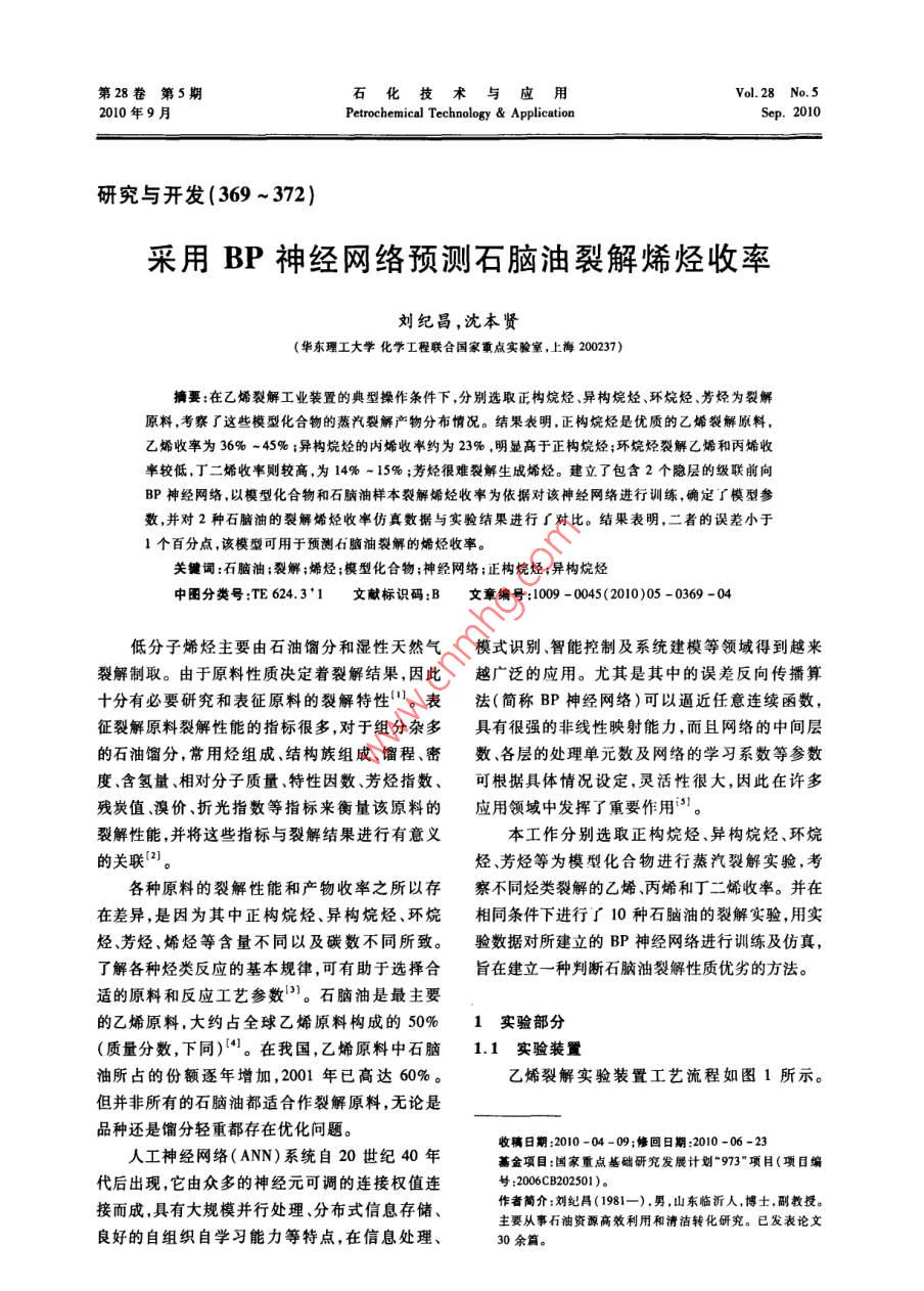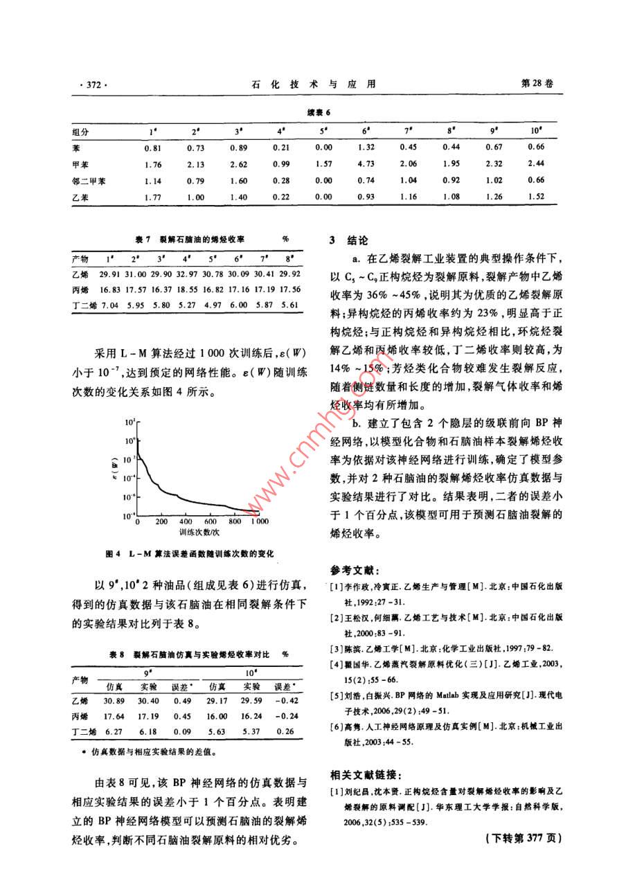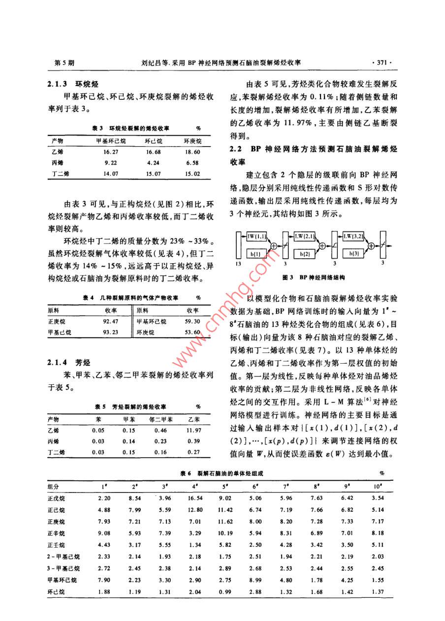 第28卷第5期石化技術(shù)與應(yīng)用Vol.28 No.52010年9月Petrochemical Technology & ApplicationSep. 2010研究與開發(fā)(369 ~372)采用BP神經(jīng)網(wǎng)絡(luò)預(yù)測石腦油裂解烯烴收率劉紀(jì)昌,沈本賢(華東理工大學(xué)化學(xué)I程聯(lián)合國家重點(diǎn)實驗室,上海200237)摘要:在乙烯裂解工業(yè)裝置的典型操作條件下,分別選取正構(gòu)烷烴、異構(gòu)烷烴、環(huán)烷烴、芳烴為裂解原料,考察了這些模型化合物的蒸汽裂解產(chǎn)物分布情況。結(jié)果表明,正構(gòu)烷烴是優(yōu)質(zhì)的乙烯裂解原料,乙烯收率為36%~45%;異構(gòu)烷烴的內(nèi)烯收率約為23%,明顯高于正構(gòu)烷烴;環(huán)烷烴裂解乙烯和丙烯收率較低,丁二烯收率則較高,為14% ~ 15% ;芳烴很難裂解生成烯烴。建立了包含2個隱層的級聯(lián)前向BP神經(jīng)網(wǎng)絡(luò),以模型化合物和石腦油樣本裂解烯烴收率為依據(jù)對該神經(jīng)網(wǎng)絡(luò)進(jìn)行訓(xùn)練,確定了模型參數(shù),并對2種石腦油的裂解烯烴收率仿真數(shù)據(jù)與實驗結(jié)果進(jìn)行了對比。結(jié)果表明,二者的誤差小于1個百分點(diǎn),該模型可用于預(yù)測石腦油裂解的烯烴收率。關(guān)鍵詞:石腦油;裂解;烯烴;模型化合物;神經(jīng)網(wǎng)絡(luò);正構(gòu)烷烴;異構(gòu)烷烴中圈分類號:TE 624.3"1文獻(xiàn)標(biāo)識碼:B文章編號:1009 - 0045(2010)05 - 0369 -04低分子烯烴主要由石油餾分和濕性天然氣模式識別、智能控制及系統(tǒng)建模等領(lǐng)域得到越來裂解制取。由于原料性質(zhì)決定著裂解結(jié)果,因此越廣泛的應(yīng)用。尤其是其中的誤差反向傳播算十分有必要研究和表征原料的裂解特性"。表.法(簡稱BP神經(jīng)網(wǎng)絡(luò))可以逼近任意連續(xù)函數(shù), .征裂解原料裂解性能的指標(biāo)很多,對于組分雜多具有很強(qiáng)的非線性映射能力,而且網(wǎng)絡(luò)的中間層的石油餾分,常用烴組成、結(jié)構(gòu)族組成、餾程、密.數(shù)、各層的處理單元數(shù)及網(wǎng)絡(luò)的學(xué)習(xí)系數(shù)等參數(shù)度、含氫量、相對分子質(zhì)量、特性因數(shù)、芳烴指數(shù)、可根據(jù)具體情況設(shè)定,靈活性很大,因此在許多殘?zhí)恐?、溴價、折光指數(shù)等指標(biāo)來衡量該原料的應(yīng)用領(lǐng)域中發(fā)揮了重要作用。裂解性能,并將這些指標(biāo)與裂解結(jié)果進(jìn)行有意義本工作分別選取正構(gòu)烷烴、異構(gòu)烷烴、環(huán)烷的關(guān)聯(lián)(2]。烴芳烴等為模型化合物進(jìn)行蒸汽裂解實驗,考各種原料的裂解性能和產(chǎn)物收率之所以存察不同烴類裂解的乙烯、丙烯和丁二烯收率。并在在差異,是因為其中正構(gòu)烷烴、異構(gòu)烷烴、環(huán)烷.相同條件下進(jìn)行了10種石腦油的裂解實驗,用實烴芳烴、烯烴等含量不同以及碳數(shù)不同所致。驗數(shù)據(jù)對所建立的BP神經(jīng)網(wǎng)絡(luò)進(jìn)行訓(xùn)練及仿真,了解各種烴類反應(yīng)的基本規(guī)律,可有助于選擇合旨在建立一種判斷石腦油裂解性質(zhì)優(yōu)劣的方法。適的原料和反應(yīng)工藝參數(shù))。石腦油是最主要的乙烯原料,大約占全球乙烯原料構(gòu)成的50%1實驗部分(質(zhì)量分?jǐn)?shù),下同)[*]。在我國,乙烯原料中石腦1.1實驗裝置油所占的份額逐年增加,2001年已高達(dá)60%。乙烯裂解實驗裝置工藝流程如圖1所示。但并非所有的石腦油都適合作裂解原料,無論是品種還是餾分輕重都存在優(yōu)化問題。收稿日期:2010 - 04 -09;修回日期:2010-06 -23人工神經(jīng)網(wǎng)絡(luò)(ANN)系統(tǒng)自20世紀(jì)40年基金項目:國家重點(diǎn)基礎(chǔ)研究發(fā)展計劃*973”項目(項目編代后出現(xiàn),它由眾多的神經(jīng)元可調(diào)的連接權(quán)值連號:2006CB202501)。接而成,具有大規(guī)模并行處理、分布式信息存儲、作者簡介:劉紀(jì)月(1981-),男,山東臨沂人,博士,副教授。主要從事石油資源高效利用和清潔轉(zhuǎn)化研究。已發(fā)表論文良好的自組織自學(xué)習(xí)能力等特點(diǎn),在信息處理、30余篇?!?70.石化技術(shù)與應(yīng)用第28卷原料油經(jīng)過油汽化器汽化后與稀釋蒸汽混合,進(jìn)化學(xué)品有限公司生產(chǎn)。甲基環(huán)已烷,質(zhì)量分?jǐn)?shù)人預(yù)熱爐預(yù)熱,然后進(jìn)入裂解爐,烴類原料在爐98% ,國藥集團(tuán)化學(xué)試劑有限公司生產(chǎn)。環(huán)庚管內(nèi)發(fā)生裂解反應(yīng)生成小分子烯烴,裂解氣在急烷,質(zhì)量分?jǐn)?shù)98% ,德國默克(Merck)公司生產(chǎn)。冷器中迅速冷卻。參照乙烯裂解工業(yè)裝置的操甲苯,分析純,上海聯(lián)試化工試劑有限公司生產(chǎn)。作條件,控制停留時間為0.39 s,稀釋蒸汽比為鄰二甲苯,化學(xué)純,國藥集團(tuán)化學(xué)試劑有限公司0.6,橫跨溫度為590 C。生產(chǎn)。乙苯,化學(xué)純,上海天蓮精細(xì)化工有限公.司生產(chǎn)。2結(jié)果與討論2.1模型化合物的蒸汽裂解產(chǎn)物分布四-0-2.1.1正構(gòu)烷烴由圖2可見,以C, ~C,正構(gòu)烷烴為裂解原料1-油計最罐;2- -水計量罐:3- -油泵;4- -水泵:s一油汽化器;時,乙烯收率較高(36.0% ~45. 0%),這與根據(jù)6-水汽化器;7- -預(yù)熱爐;8-裂解爐;9- 急冷器;10- -氣液分離器;11-氣體質(zhì)址t流量計;12- -尾油計量罐芳烴關(guān)聯(lián)指數(shù)(BMCI)判斷裂解原料性質(zhì)