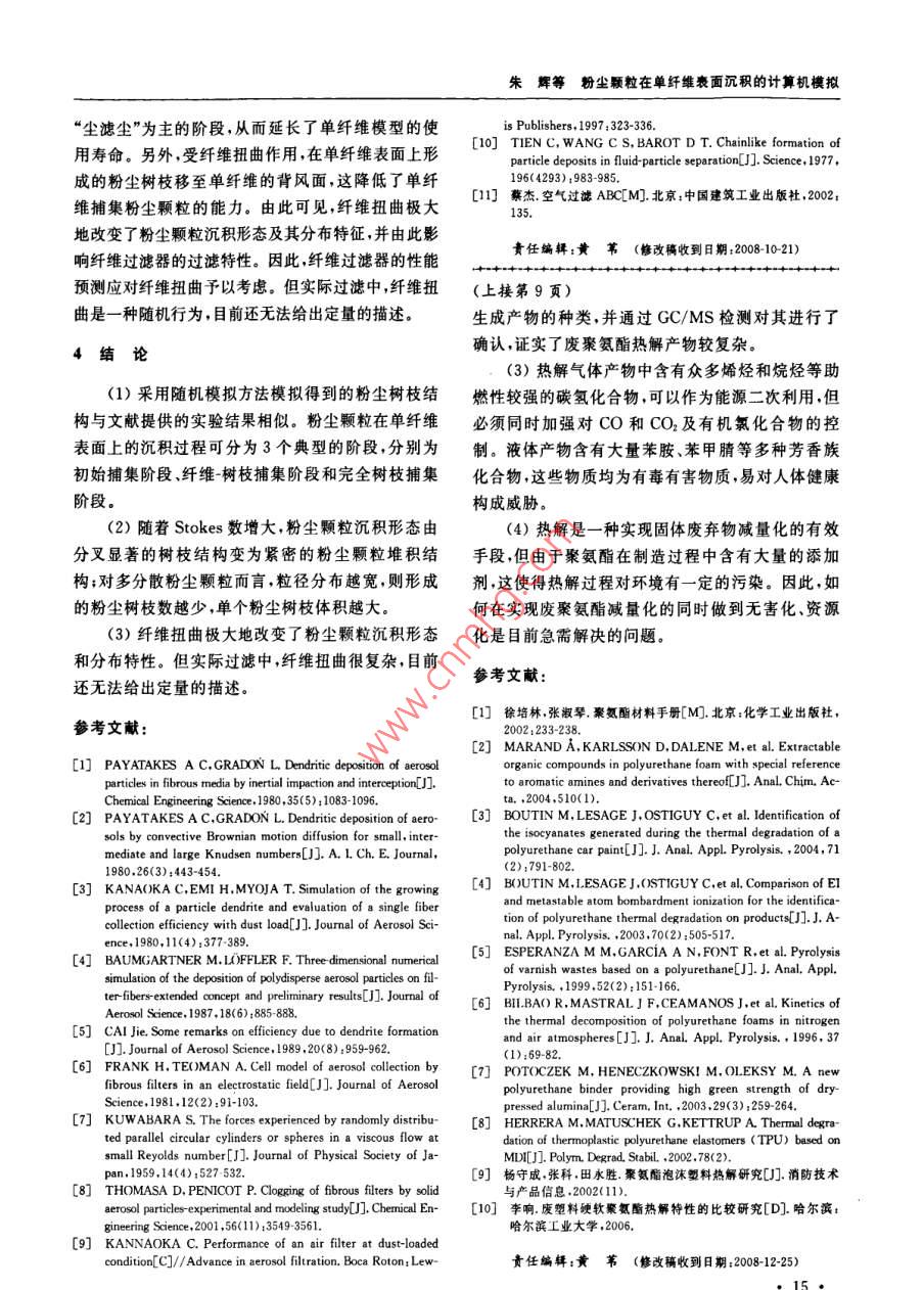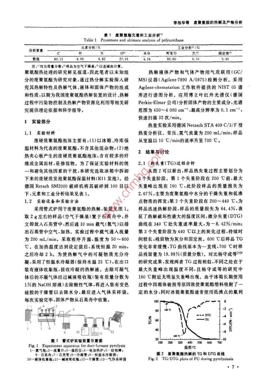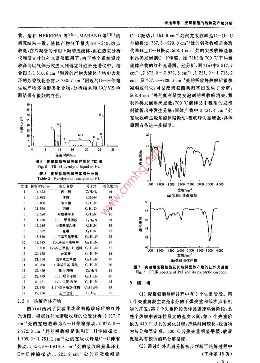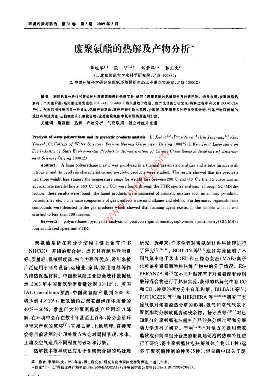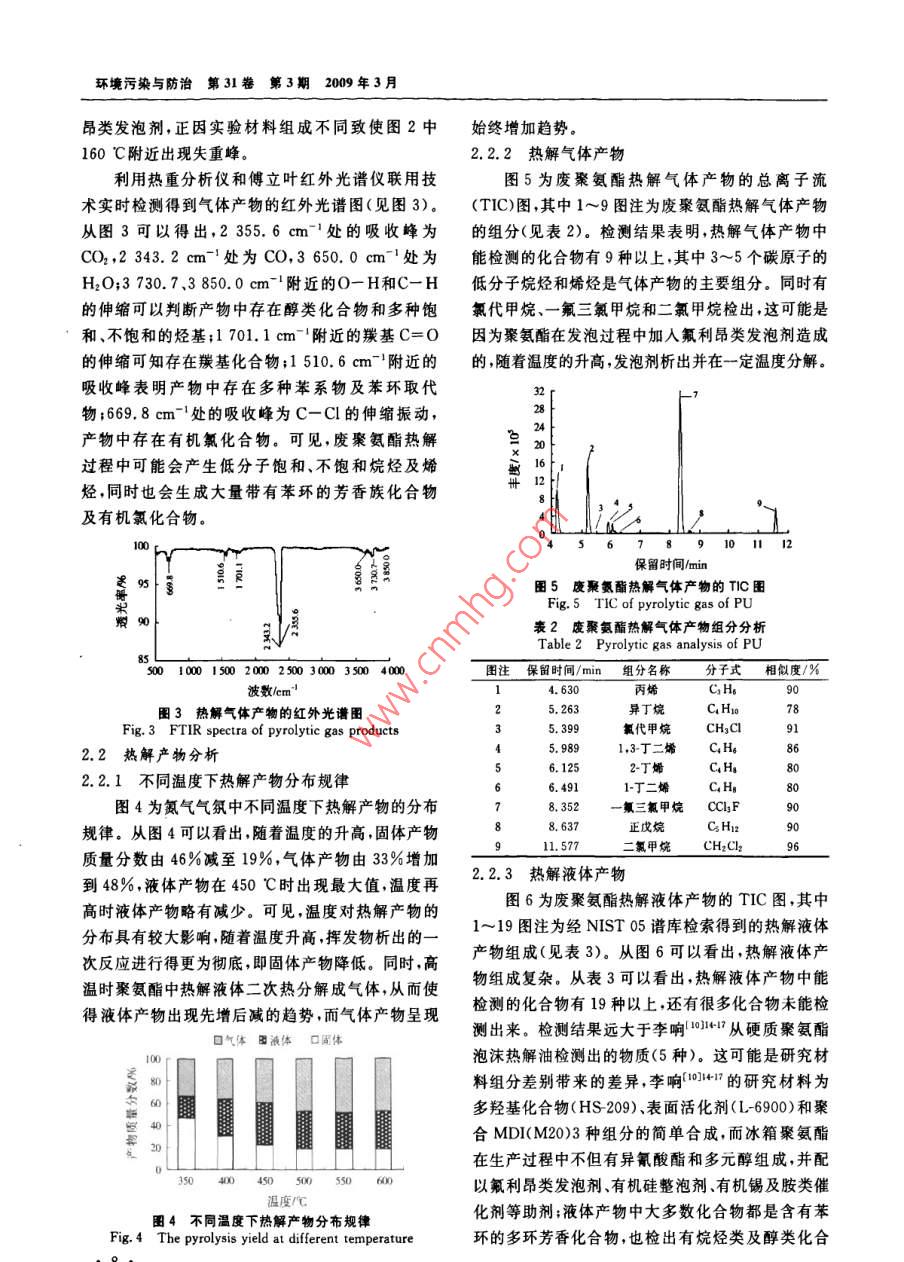 環(huán)境污染與防治第31卷第3期2009年3月廢聚氨酯的熱解及產(chǎn)物分析李旭華1段寧12#劉景洋1郭玉文2(1.北京師范大學(xué)水科學(xué)研究院,北京100875;2.中國(guó)環(huán)境科學(xué)研究院國(guó)家環(huán)境保護(hù)生態(tài)工業(yè)重點(diǎn)實(shí)驗(yàn)室,北京100012)摘要利用熱重分析儀和管式爐對(duì)廢聚氨酯進(jìn)行熱解實(shí)驗(yàn),研究了廢聚氨酯的熱解特性及熱解產(chǎn)物,結(jié)果表明,廢聚氨酯熱解有3個(gè)失重階段熱失重主要發(fā)生在200~440℃,600℃熱失重趨于穩(wěn)定,紅外光譜圖分析發(fā)現(xiàn)熱解過(guò)程中有大量CO和CO2產(chǎn)生。氣質(zhì)聯(lián)用檢測(cè)結(jié)果分析顯示,熱解產(chǎn)物復(fù)雜液體產(chǎn)物中檢出苯胺、p苯胺、苯甲腈等多種芳香類化合物氣體產(chǎn)物以低碳的烷烴和烯烴為主,還檢測(cè)出有機(jī)氯化合物,這是廢聚氨酯中氟利昂類發(fā)泡劑所致關(guān)鍵詞聚氨酯熱解產(chǎn)物分析氣質(zhì)聯(lián)用傅立葉紅外光譜Pyrolysis of waste polyurethane and its pyrolytic products analysis Li Xuhua, Duan Ning., Liu Jingyang.,GuoYuwen.(1. College of Water ScBeijing Normal University, Beijing 100875:2. Key Joint Laboratory onEcoIndustry of State Environmental Production Administration of China, China Research Academy of environ-Abstract: A foam polyurethane plastic was pyrolysed in a thermal gravimetric analyzer and a tube furnace withnitrogen, and its pyrolysis characteristics and pyrolytic products were studied. The results showed that the pyrolysishad three weight loss stages, the temperature range for weight loss between 200 C and 440 C, the TG curve was anapproximate parallel line at 600 C. CO and CO, were found through the FtiR spectra analysis. Through GC/Ms de-tection, these results were found: the liquid products were consisted of aromatic mixture such as aniline, pranilinebenzonitrile, etc. i The main components of gas products were mild alkanes and olefins. Furthermore, organochlorinecompounds were detected in the gas products which showed that foaming agent existed in the sample when it wascrushed to less than 100 meshesKeywords: polyurethane: pyrolysis analysis of products; gas chromatography-mass spectrometry(GC/MS);fourier infrared spectrum(FTIR)聚氨酯是指在高分子結(jié)構(gòu)主鏈上含有許多研究。近年來(lái),許多學(xué)者對(duì)聚氨酯材料熱處理進(jìn)行NHCO(-基團(tuán)的聚合物。因其具有絕熱性能良了研究(10 BOUTIN等3:4通過(guò)實(shí)驗(yàn)證明了不好、質(zhì)量輕、機(jī)械強(qiáng)度高、粘合力強(qiáng)等優(yōu)點(diǎn),近年來(lái)被同氣氛中電子轟擊(ED和亞穩(wěn)態(tài)轟擊(MAB)離子廣泛應(yīng)用于制冷設(shè)備、運(yùn)輸業(yè)、家具、家用電器等作化可鑒別聚氨酯涂料熱解產(chǎn)物中的分子情況。ES為絕熱保溫材料。中國(guó)聚氨酯工業(yè)協(xié)會(huì)統(tǒng)計(jì)數(shù)據(jù)顯 PerANZA等在不同升溫速率下對(duì)聚氨酯和硬脂示,2005年中國(guó)聚氨酯消費(fèi)量達(dá)到3×10t,英國(guó)酸鋅混合物進(jìn)行了熱解實(shí)驗(yàn)獲得的熱解氣中有COIAL Consultants預(yù)測(cè),中國(guó)聚氨酯產(chǎn)量到2009年和CO2,冷凝的揮發(fā)分中有苯和萘。 BILBAO等(將達(dá)到4X10°t,聚氨酯約占聚氨酯泡沫體質(zhì)量的POTOCZEK等和 HERRERA等123研究了實(shí)驗(yàn)氣氛對(duì)聚氨酯熱分解的影響,氮?dú)夂涂諝鈿夥障?0%~50%。數(shù)量巨大的聚氨酯廢棄后因難以降聚氨酯均分解成低含碳?xì)堄辔?。楊守成等?duì)已解在環(huán)境中會(huì)存在數(shù)十年甚至上百年勢(shì)必會(huì)給環(huán)知組分的聚氨酯泡沫塑料產(chǎn)品的熱分解過(guò)程和分解境帶來(lái)嚴(yán)重的破壞口,直接丟棄、土地填埋、直接焚動(dòng)力學(xué)進(jìn)行了研究。李響1H對(duì)制方向盤用聚氨燒等目前常用的處理處置方法會(huì)對(duì)周圍景觀、水體、酯軟泡和簡(jiǎn)單組分合成的聚氨酯硬泡的熱解特性進(jìn)土壤及空氣造成不同程度的破壞和污染。行了研究,得出聚氨酯軟泡熱解液體產(chǎn)物(11種)遠(yuǎn)熱解技術(shù)很早就已應(yīng)用于含碳聚合物的熱處理多于聚氨酯硬泡的種類(5種)。但目前中國(guó)關(guān)于廢第一作者:李旭華,女,1980年生博士研究生,研究方向?yàn)楣腆w廢物資源化?!巴ㄓ嵶髡邍?guó)家“十-五”科技支撐計(jì)劃項(xiàng)目(No,2006BAC02A19);環(huán)境保護(hù)部公益項(xiàng)目(No.HBGY200709022),李旭華等廢聚氨酯的熱解及產(chǎn)物分析1廢聚氨酯元素和工業(yè)分析Table 1 Proximate and ultimate analysis of polyurethane元素分析/%分析要素工業(yè)分析2)/水分固定炭89.60注:均為質(zhì)囊分?jǐn)?shù);2樣品為空氣干燥基;3以差減法計(jì)算。聚氨酯熱處理的研究鮮見報(bào)道,因此筆者以未知組熱解液體產(chǎn)物和氣體產(chǎn)物用氣質(zhì)聯(lián)用(GC/分的廢聚氨酯為研究對(duì)象,通過(guò)熱分解實(shí)驗(yàn)深人研MS)儀器( Agilent7890A/5975)檢測(cè)分析。采用究其熱解特性及熱解氣體、液體和固體產(chǎn)物的組成 Agilent-chemstation工作軟件提供的NlST05譜和性質(zhì)以期為我國(guó)廢聚氨酯熱解裝置的設(shè)計(jì)、熱解庫(kù)進(jìn)行譜圖分析。應(yīng)用傅立葉紅外光譜儀(德國(guó)過(guò)程中污染物控制及熱解產(chǎn)物資源化利用等相關(guān)研 Perkin-Elmer公司)分析固體產(chǎn)物的主要成分,光譜究提供理論依據(jù)和科學(xué)指導(dǎo)。范圍為450~4000cm-1,最高