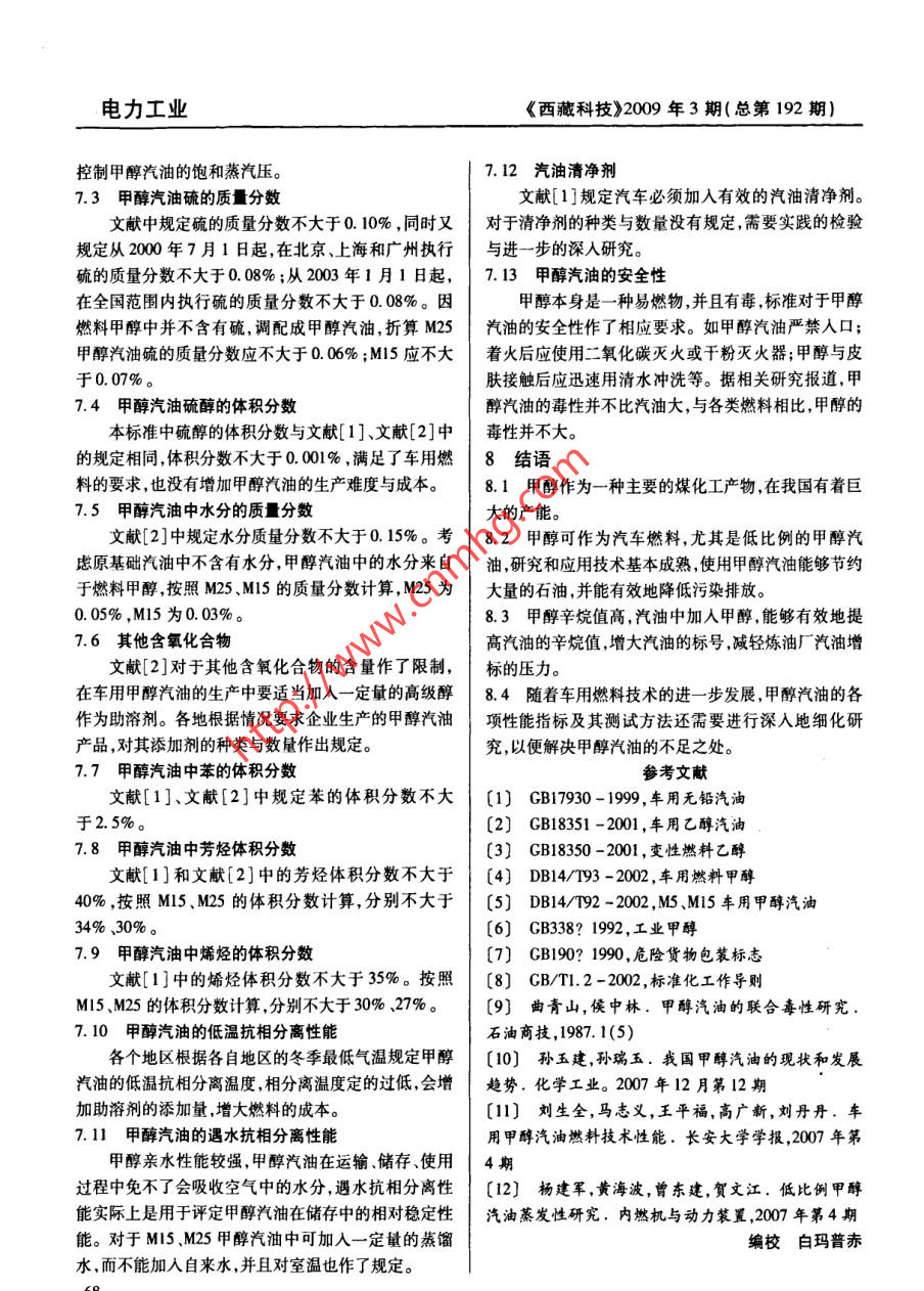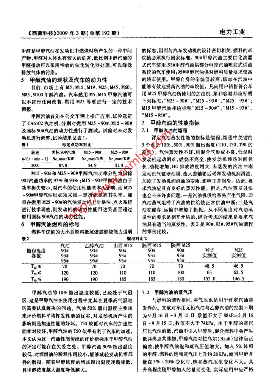 電力工業(yè)《西藏科技》2009年3期(總第192期)車用甲醇汽油分析李林震(西藏自治區(qū)質(zhì)量技術(shù)監(jiān)督局,西藏 拉薩850008 )摘要:能源枯竭和環(huán)境污染 是世界面臨的嚴(yán)重問題,隨著世界汽車保佑量的增長,在世界范圍內(nèi)石油系燃料的供需矛盾日益突出,汽車發(fā)動(dòng)機(jī)消耗石油總量巨大,廢氣的排放也成為大氣污染的主要來源之一。從資源、經(jīng)濟(jì)、實(shí)用等方面來考慮,開發(fā)新的清潔代用燃料成為重要的研究課題。甲醇燃料來源豐.富,能夠節(jié)約汽車運(yùn)營成本,節(jié)約大量的石油資源。本文以M5、M15甲醇汽油為例分析了使用甲醇汽油的經(jīng)濟(jì)性和推廣性。關(guān)鍵詞:汽車甲醇汽油 分析中圖分類號(hào):U473.14“富煤貧油"是我國一個(gè)重要的資源特點(diǎn),決定了甲醇裝置已積累了足夠的技術(shù)基礎(chǔ);水煤漿為原料的在今后較長的一段時(shí)間內(nèi)我國仍將呈現(xiàn)以煤為主的能大型氣化爐已運(yùn)行多年,可實(shí)現(xiàn)長周期運(yùn)轉(zhuǎn);新型水煤源消耗結(jié)構(gòu)。因此,發(fā)展煤基車用替代燃料不失為- -漿氣化爐與干煤加壓氣化爐正在積極開發(fā)中;各種低種較好的策略。甲醇作為一種主要的煤化工產(chǎn)物,在.能耗的天然氣蒸汽轉(zhuǎn)化技術(shù)均已掌握;低成本以空氣我國有著巨大的產(chǎn)能, 2004年底,陜北甲醇的生產(chǎn)能為氣化劑的天然氣轉(zhuǎn)化制合成氣技術(shù)已經(jīng)開發(fā);多種力達(dá)到年產(chǎn)100萬噸,其產(chǎn)品具有明顯的價(jià)格.質(zhì)量優(yōu)的脫碳脫硫工藝已成熟用于工業(yè)生產(chǎn);變換、精脫硫、勢(shì),若能得到大規(guī)模應(yīng)用,將能夠節(jié)省大量石油資源。甲醇合成催化劑均已國產(chǎn)化;新型甲醇合成反應(yīng)器已甲醇CH20H是一種輕質(zhì)、無色、略有臭味、低污染的形成專利技術(shù);精餾裝備已達(dá)到節(jié)能和優(yōu)化水平。目可燃液體,甲醇只含一個(gè)C原子,沒有C一C鍵,并含前,國內(nèi)已掌握了建設(shè)10 ~30萬噸/年,單系列甲醇裝有50%的氧,C/H原子量比為3,是一-種燃燒后生成的置的設(shè)計(jì)技術(shù)。排氣較清潔的含氧燃料,甲醇可以以一定比例添加在甲醇與汽油的互溶性汽油中成為甲醇汽油。甲醇汽油燃料本身含氧,在汽汽車要求甲醇與汽油必須溶合使用,互溶性除受車發(fā)動(dòng)機(jī)中燃燒更加完全,效率高,排放污染少,并且甲醇與汽油各自的物化性能的影響外,還與儲(chǔ)存、使用燃料辛烷值提高,發(fā)動(dòng)機(jī)抗煤震性能增強(qiáng)是- -種性能的溫度燃料中水分的含量、助溶劑的種類與數(shù)量等密優(yōu)良的汽車燃料。1甲醇的現(xiàn)狀,生產(chǎn)技術(shù)的成熟性與可靠性切相關(guān)。低比例甲醇和較高比例甲醇與汽油相對(duì)容易2006年,我國甲醇生產(chǎn)874.7萬噸,進(jìn)口甲醇.溶合,而中等比例的甲醇汽油則較難以溶合。112.7萬噸,出口19萬噸,表觀消費(fèi)量968.4萬噸,共.3甲醇的腐蝕性有甲醇生產(chǎn)企業(yè)167家,產(chǎn)能合計(jì)為1344.4萬噸/年。甲醇對(duì)汽車發(fā)動(dòng)機(jī)的銅、鋁等金屬部件和橡膠、塑據(jù)統(tǒng)計(jì),“十一五”期間我國新建擬建甲醇項(xiàng)目共42.料等彈性體具有一定的腐蝕作用,并且隨著甲醇汽油個(gè)(不包括二甲醚、甲醇制烯烴生產(chǎn)企業(yè)自身配套的中甲醇體積分?jǐn)?shù)的增加,腐蝕性能增強(qiáng)。而通過對(duì)材甲醇生產(chǎn)裝置)。其中,“十一五”期間可以投產(chǎn)的項(xiàng)料的選擇可以減少這種侵害。胺類、有機(jī)磷酸酯類、有目為35個(gè),產(chǎn)能合計(jì)1198萬噸/年。預(yù)計(jì)到“十一機(jī)羧酸類氮雜環(huán)類、屏蔽酚類五種防腐劑進(jìn)行復(fù)配,五"末期,我國甲醇生產(chǎn)企業(yè)將為200家左右,產(chǎn)能將制成的甲醇燃料金屬腐蝕抑制劑對(duì)銅、鋁、45號(hào)鋼、達(dá)到2500萬噸/年~4850萬噸/年。鋅氣化器材質(zhì)等多種金屬具有良好的腐蝕抑制能力,我國甲醇的合成裝置基本上使用煤、油、天然氣三且溶解性能優(yōu)良,滿足甲醇燃料防腐蝕性能的要求。種原料;現(xiàn)代甲醇生產(chǎn)技術(shù)幾乎均為低壓法。英國ICI4甲醇汽油 燃燒后甲醛的排放污染公司和LURGI公司的低壓甲醇生產(chǎn)技術(shù)占全世界甲汽車發(fā)動(dòng)機(jī)燃燒甲醇汽油時(shí), CO、HC、NOx等常醇總量的70%以上。我國自行設(shè)計(jì)、制造和運(yùn)行大型規(guī)排放物質(zhì)大幅度減少,而甲醛的排放量有所上升。56電力工業(yè)《西藏科技》2009年3期(總第192期)控制甲醇汽油的飽和蒸汽壓。7.12汽油清凈劑.3 甲醇汽油硫的質(zhì)量分?jǐn)?shù)文獻(xiàn)[1]規(guī)定汽車必須加入有效的汽油清凈劑。文獻(xiàn)中規(guī)定硫的質(zhì)量分?jǐn)?shù)不大于0.10% ,同時(shí)又對(duì)于清凈劑的種類與數(shù)量沒有規(guī)定,需要實(shí)踐的檢驗(yàn)規(guī)定從2000年7月1日起,在北京、上海和廣州執(zhí)行與進(jìn)一步的深人研究。硫的質(zhì)量分?jǐn)?shù)不大于0.08% ;從2003年1月1日起,7.13甲醇汽油的安全性在全國范圍內(nèi)執(zhí)行硫的質(zhì)量分?jǐn)?shù)不大于0.08%。因甲醇本身是- -種易燃物,并且有毒,標(biāo)準(zhǔn)對(duì)于甲醇燃料甲醇中并不含有硫,調(diào)配成甲醇汽油,折算M25汽