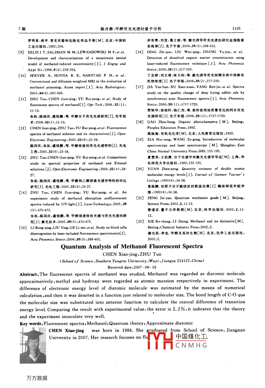 第37卷第7期學(xué)報VoL 37 No. 72008年7月ACTA PHOTONICA SINICAJuly 2008甲醇熒光光譜的量子分析陳肖靜,朱拓(江南大學(xué)理學(xué)院,江蘇無錫214122)摘要:通過量子近似計算研究了甲醇的熒光光譜.將甲醇分子近似看成雙原子分子,甲基和羥基分別為原子實,氧原子未共享電子對看成價電子.剩用數(shù)值計算的方法對雙原子分子電子能級差進(jìn)行估算,得到電子能級差為一個僅與分子線度相關(guān)的函數(shù).然后把C-O鍵長作為分子線度代入前面得到的函數(shù)中,算出甲醇分子主躍遷能級差,并將所得結(jié)果與實驗值進(jìn)行對比,誤差僅為2.2%理論計算與實驗結(jié)果吻合關(guān)鍵詞:熒光光譖;甲醇;量子理論;數(shù)值計算;雙原子近中圖分類號:Q632文獻(xiàn)標(biāo)識碼:A文章編號:1004-4213(2008)07-1433-30引言到,而且用量子化學(xué)計算單純物質(zhì)的能級差與實客觀所得的實驗結(jié)果有很大差異,因此,本文采用各甲醇是工業(yè)上廣泛應(yīng)用的有機(jī)化工原料13,長種近似方法期以來很多學(xué)者認(rèn)為甲醇是非熒光物質(zhì),在有關(guān)研甲醇的成鍵軌道模型如圖1,由于C和H、O和究報道中,只是將甲醇作為有機(jī)溶劑,考慮它對其他H的軌道作用較C和O之間的作用強(qiáng),分析中把甲分子以及生物大分子紫外光譜的影響,對于甲醇自基和羥基分別當(dāng)成一個原子實來看待.又因為甲基身產(chǎn)生熒光的特性和機(jī)理未見研究和羥基總的核電荷數(shù)都是9,所以可以近似將甲醇甲醇屬劇毒化合物,嚴(yán)重的可引起失明或死分子看成雙原子分子,甲基和羥基各看成一個原子亡1,這就使得對物質(zhì)中甲醇含量的測定問題日實,氧原子未共享電子對看成價電子.這樣熒光的產(chǎn)益顯現(xiàn)傳統(tǒng)的甲醇含量測試方法,如分光光度計測生就可以看成是由一個雙原子分子其中一個原子中試,氣相色譜儀或離子色譜法測試,要么費時繁瑣,價電子的躍遷放出的光子利用這種近似可以大大要么需大型貴重儀器設(shè)備.而利用靈敏高效的光譜地簡化分析過程,將一個復(fù)雜分子簡化為一個較為學(xué)方法測定物質(zhì)中甲醇的含量,特別是微量含量的簡單的分子模型測試,其可行性和準(zhǔn)確性都具有很大的優(yōu)勢.因此些學(xué)者就致力于甲醇自身熒光特性的研究上文獻(xiàn)[11-14]報道了對美國天地公司生產(chǎn)的色譜純甲醇液體進(jìn)行熒光光譜實驗的研究.研究發(fā)現(xiàn)甲醇是熒光物質(zhì),熒光峰值位置在340nm左右,熒光峰展寬為60nm左右.但這些研究主要集中在對實驗現(xiàn)象、結(jié)果和熒光產(chǎn)生機(jī)理的分析上,并沒有深入的用一套完備的量子理論去解釋.目前有關(guān)激光圖1甲醇成鍵軌邀模型誘導(dǎo)熒光光譜法510和同步熒光法的相關(guān)實驗Fig. 1 The bonding orbital model研究報導(dǎo)較多,但相關(guān)理論研究確少之又少,本文運2雙原子分子電子能級差估算用理論方法通過量子近似計算得到一個躍遷能量值,并與實驗值進(jìn)行比較,從而建立一個甲醇熒光光通過對分子光譜的研究1可以知道,產(chǎn)生分子譜的完善又簡易的理論解釋.光譜較為復(fù)雜的根本原因在于分子內(nèi)部存在復(fù)雜的運動狀態(tài).分子內(nèi)部的運動狀態(tài)有分子的轉(zhuǎn)動、分子1甲醇分子的雙原子近似中各中國煤化工石動,在分子運由于分子體系定態(tài)薛定諤方程的嚴(yán)格解很難得動的難求的,這是因為它屬CNMHG國家自然科學(xué)基金(20671044)資勳從文獻(xiàn)[20]的幾點討論可見,對分子的電子態(tài)Tel,0510-85913899Email:tzhu@sytu,edu.cn能量要明確求出其表達(dá)式和精確值是比較困難的收稿日期:2007-06-16但采用數(shù)值估算的方法,可將許多步驟簡化1434光子學(xué)報37卷按各種分子的線度基本屬于同一數(shù)量級的概返回基態(tài)時發(fā)射的熒光波長范圍較大,實驗測得的念,統(tǒng)一以a表示分子的線度,因在不確定關(guān)系中,311~371mm的寬譜峰正是它的體現(xiàn).理論近似計位置的不確定量△x與分子線度屬同一數(shù)量級,即:算得到的能級差(3.74eV)對應(yīng)的波長為331.9mm,△x~a.所以根據(jù)不確定關(guān)系:△x·△p≥h,則動由于經(jīng)過了多次近似,并且忽略了電子的轉(zhuǎn)動能級,量的不確定量為△p=h/△x≈h/a.又在近似情況下因此得到的波長并不是一個范圍數(shù)值計算的結(jié)果可認(rèn)為P與△P的數(shù)量級是相同的,即P≈△P=h/a.使得雙原子電子能級差是一個僅與分子線度有關(guān)的于是電子的動能就可以表達(dá)成函數(shù).對于甲醇的研究,本文是將其近似成雙原子分E:=p2/2m,子以后,再將CO鍵鍵長作為分子線度帶人函數(shù)求在有心力場中,電子動能的絕對值與總能量相得的能級差,這可能是誤差產(chǎn)生的關(guān)鍵所在.但是該同.對于分子中的電子,雖然它處于非中心力場中,值仍然落在實驗所得的譜峰范圍之內(nèi),說明該理論但其能量的數(shù)量級可以與前者是相同的因此,分子分析與實驗相當(dāng)吻合中一個電子所對應(yīng)的能級可近似表示為:E≈E4結(jié)論對于能量增量△E,可以得到△E=2p/(2m,)·△p=p/m。·△p=h2/m2a2(1)研究結(jié)果表明,用數(shù)值計算和雙原子近似的方式中m。均為電子的質(zhì)量法能很好的解釋甲醇熒光光譜的實驗,從而達(dá)到理這樣就得到了雙原子分子電子躍遷的近似表達(dá)