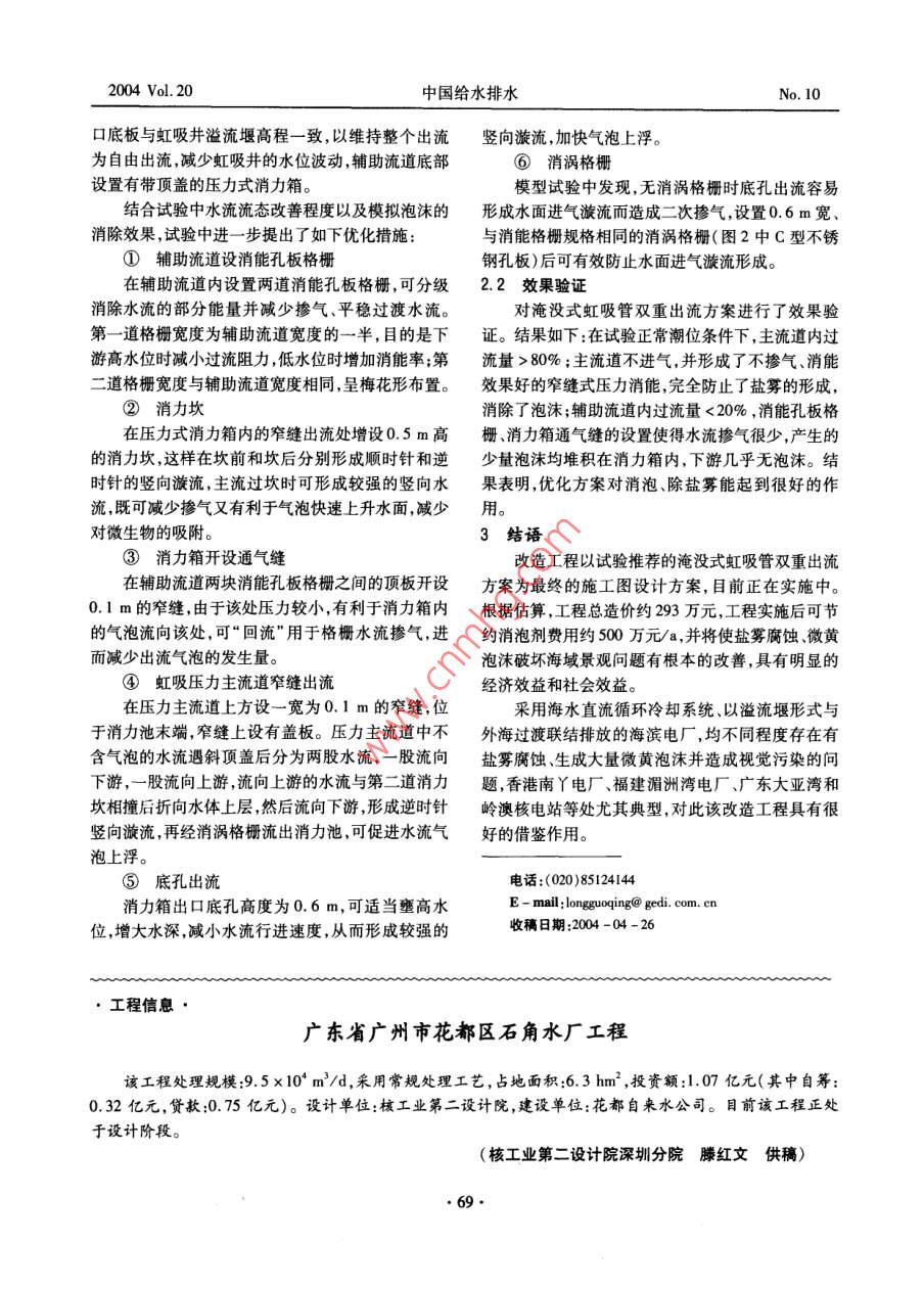 中國(guó)給水排水2004Vol.20CHINA WATER WASTEWATERNo.10核電站循環(huán)水虹吸井出水口改造設(shè)計(jì)龍國(guó)慶廣東省電力設(shè)計(jì)研究院,廣東廣州510600)摘要:大亞灣核電站的循環(huán)冷卻水為海水,虹吸井出水口的水流從溢流堰跌落后產(chǎn)生了大量的小水滴和鹽霧,造成電氣設(shè)備嚴(yán)重腐蝕,同時(shí)水流跌落后產(chǎn)生的大量微黃色泡沫嚴(yán)重影響海域景觀。為此,在模型試驗(yàn)的基礎(chǔ)上提出了棱塊體擋流堰改造方案,并采取了相應(yīng)的優(yōu)化措施。模擬試驗(yàn)結(jié)果顯示,除鹽霧消沫效果良好。關(guān)鍵詞:核電站;循環(huán)冷卻水;消泡沫;除鹽霧中圖分類號(hào):TU99141文獻(xiàn)標(biāo)識(shí)碼:C文章編號(hào):1000-4602(2004)10-0067-03Design for the Renovation of Circular Water Siphon Well Outlet inNuclear power plantLONG Guo-qingGuangdong Electric Power Design and Research Institute, Guangzhou 510600, China)Abstract: Seawater is used as the circulating cooling water in Daya Bay Nuclear Power Plant.Thewater flow of siphon well outlet from overlow weir falls off rapidly with drips and salt mists, causing seri-ous corrosion to electric equipments. Meantime, a lot of tint yellow foams resulted from down pour destroythe landscape in seashore. For this reason a renovation design of building a prism shape of overfall weir tostop the water flow and optimal measures were proposed and adopted. Simulation experiment result showsthat it is effective for eliminating salt mists and foams.Key words: nuclear powCIrcng coonfoam eliminating大亞灣核電站的裝機(jī)容量為2×900MW,由法1改造方案國(guó)中央電力公司負(fù)責(zé)總體設(shè)計(jì),電廠循環(huán)冷卻水虹吸井堰后跌水產(chǎn)生的高速水流卷吸摻混、剪( Circulating Cooling water,簡(jiǎn)稱CC)采用海水,一次切作用以及水躍形成的強(qiáng)迫摻氣,是小水滴鹽霧和循環(huán)后再排入大海,循環(huán)冷卻水量約90m3/s。自泡沫生成的主要原因。1994年4月1號(hào)機(jī)組發(fā)電以后,電站CC出水口的要解決該問(wèn)題,就要通過(guò)一定的可行性工程措水流從溢流堰頂?shù)浜蟀樯罅康男∷魏望}霧,施來(lái)改善水流流態(tài)及現(xiàn)有的堰后水力消能條件,使在常年主導(dǎo)風(fēng)向(E、ESE)下,鹽霧隨風(fēng)飄到附近的水流跌落平順且堰后水面相對(duì)穩(wěn)定,削弱高速水流廠區(qū),造成廠房的鋼結(jié)構(gòu)、保衛(wèi)系統(tǒng)鐵絲網(wǎng)露天電中的摻混作用和剪切作用,做到既消能又不摻氣或氣設(shè)備嚴(yán)重腐蝕;同時(shí),水流從5m多高的溢流堰跌減少摻氣,使微小氣泡減少,從而達(dá)到既消能又除鹽落后產(chǎn)生大量難分解的微黃色泡沫,并隨水流延伸霧、消泡的目的,為此提出了棱塊體擋流堰方到附近海域,嚴(yán)重影響海域景觀,電站對(duì)此采用了在案。CC出水口加消泡劑的方法,但費(fèi)用較高。具體設(shè)想為:在原有的克一奧型堰后的適當(dāng)位672004Vol.20中國(guó)給水排水No.10置上,設(shè)置鋼筋混凝土帶底部箱涵的棱塊體。棱塊垂向水簾。擋流堰下部為斷面B×H=4750mmx體可做成預(yù)制件,在現(xiàn)場(chǎng)吊裝拼接而形成擋流體。2000m的出流箱涵其孔口數(shù)與堰前出流口個(gè)數(shù)預(yù)制件側(cè)面接縫處預(yù)留300mmx250mm的凹型相對(duì)應(yīng);擋流堰上部標(biāo)高與堰的分隔墻墻頂標(biāo)髙一槽,在吊裝拼接完成后向槽內(nèi)插入混凝土板,再灌以致,做成寬為1-1.5m的過(guò)道,其上面可擱置梁框摻有速凝減水劑的混凝土,以防止堰后接縫處產(chǎn)生式導(dǎo)流翼板和消渦柵(見(jiàn)圖1)。s,:∞Jnis圖1棱塊體擋流堰方案設(shè)想Fig. 1 Scheme of prism-breakwater weir導(dǎo)流翼板起整流和支撐消渦柵作用,消渦柵能工程改造的預(yù)期目的,設(shè)計(jì)中特委托中國(guó)水利水電起到消除水面旋滾減少水流卷吸的作用,同時(shí)也可科學(xué)研究院進(jìn)行了物理模型試驗(yàn),試驗(yàn)中對(duì)工程方保證堰后水流有一定的水位,以盡量減少對(duì)堰頂水案進(jìn)行了優(yōu)化并對(duì)消泡除鹽霧效果進(jìn)行了驗(yàn)證。位的影響。出流涵管后設(shè)墩基式潛堰,以保證在外2.1優(yōu)化措施海處于低潮位時(shí),管孔出流均為淹沒(méi)出流。潛堰亦矩形水股自由跌落水墊塘的摻氣程度與單寬流為預(yù)制鋼筋混凝土塊體,現(xiàn)場(chǎng)吊裝拼接而成。為保量水流落差、水流入射角、消能率、水墊塘深度等有證經(jīng)改造后的虹吸井立面效果和人員安全,井上可關(guān),因此試驗(yàn)中主要采取了如下分項(xiàng)措施:采用雙重加撐尼龍偽裝網(wǎng),并利用原有排水渠的閘槽設(shè)置攔出流減少單寬流量;通過(guò)分級(jí)消能減少水流落差和泡柵,以徹底清除渠內(nèi)殘余的泡沫。消能率;增大堰后消力池水深以減少摻氣濃度。2方案優(yōu)化試驗(yàn)中對(duì)上述各項(xiàng)措施組合后,提出了淹沒(méi)式鑒于改造工程水量大、流態(tài)復(fù)雜,為更好地達(dá)到虹吸管雙重出流的優(yōu)化方案,詳見(jiàn)圖2。A型不銹倒孔板比分積不孔板環(huán)冷水來(lái)DENBRRLERU I圖2淹沒(méi)式虹吸管雙重出流方案Fig. 2 Scheme of submerge-siphon double flo淹沒(méi)式虹吸管雙重出流方案對(duì)虹吸井溢流堰出用壓力式消能可以不摻氣或減少摻氣,主流道進(jìn)水采用虹吸壓力主流道和無(wú)壓輔助流道的雙重泄流口位于虹吸井水面下而形成虹吸過