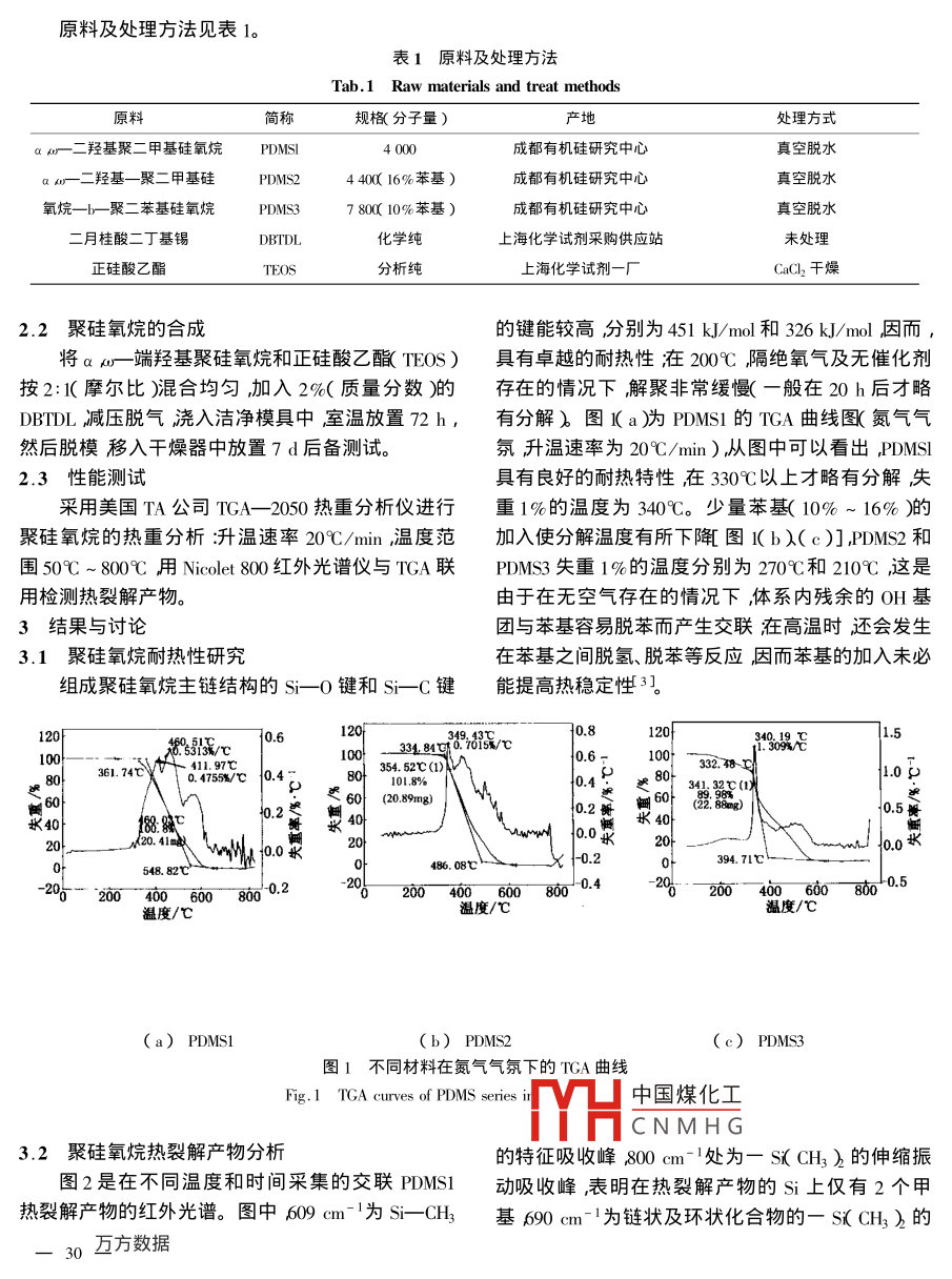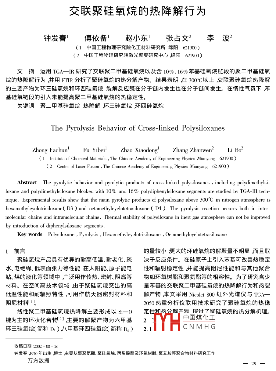 交聯(lián)聚硅氧烷的熱降解行為鐘發(fā)春1傅依備1趙小東1張占文2李波21中國工程物理研究院化工材料研究所綿陽619002中國工程物理研究院激光聚變研究中心綿陽621900文摘運用TGA_R研究了交聯(lián)聚二甲基硅氧烷以及含10%、16%苯基硅氧烷鏈段的聚二甲基硅氧烷旳熱降解行為并用R分析了聚硅氧烷的熱分解產(chǎn)牣。結(jié)果表明在3∽0℃以上交聯(lián)聚硅氧烷熱降解的主要產(chǎn)物為環(huán)三硅氧烷和環(huán)四硅氧烷裂解反應既在分子鏈內(nèi)發(fā)生也在分子鏈間發(fā)生。在惰性氣氛下苯基硅氧鏈段的引入未能提高聚二甲基硅氧烷的熱穩(wěn)定性。關(guān)鍵詞聚二甲基硅氧烷熱降解環(huán)三硅氧烷環(huán)四硅氧烷The pyrolysis Behavior of Cross-linked polysiloxanesZhong Fachun' FuYibei Zhao xiaodeZhang Zhanwen Li(1 Institute of Chemical Materials The Chinese Academy of Engineering Physics Mianyang 621900(2 Center of Laser Fusion, The Chineademy of Engineering Physics ,MiarAbstract The pyrolytic behavior and pyrolytic products of cross-linked polysiloxanes, including polydimethylsiloxane and polydimethylsiloxane blocked with 10% and 16% polydiphenylsiloxane segments are studied by TGA-IR technique. Experimental results show that the main pyrolytic products of polysiloxane above 300C in nitrogen atmosphere ishexamethylcyclotrisiloxane( D3)and octamethylcyclotetrasiloxane( D4 ). The pyrolysis reaction occurrs botmolecular chains and intramolecular chains. Thermal stability of polysiloxane in inert gas atmosphere can not be improvedby introduction of diphenylsiloxane segmentsKey words Polysiloxane Pyrolysis Hexamethylcyclotrisiloxane Octamethylcyclotetrasiloxane1前言的量較小更大的環(huán)硅氧烷的解聚量不明顯而且取聚硅氧烷產(chǎn)品具有優(yōu)異旳耐髙低溫、耐老化、疏決于反應條件。在硅原子上引λ苯基可改善熱穩(wěn)定水、電絕緣、低表面張力等性能在太陽能、原子能電性和輻射穩(wěn)定性并能提高阻尼性能和與其他聚合站、煤的液化等領域中廣泛用作傳熱、密封、阻燃等物如環(huán)氧樹脂和聚氨酯等的相容性。為了研究含少材料。在空間高技術(shù)領域,由于聚硅氧烷突岀的高量苯基的交聯(lián)聚二甲基硅氧烷旳熱降解行為和熱裂低溫性能和耐輻照特性,可用作航天器密封材料和解產(chǎn)物本文采用 Nicoletˉ800紅外光譜儀與TGA阻尼材料1。2050熱重分析儀聯(lián)用技術(shù)研究了聚硅氧烷的熱穩(wěn)線性聚二甲基硅氧烷熱降解主要形成以S-O定性和執(zhí)仝鰩產(chǎn)物探討τ娶硅氧烷的熱分解杋理。鍵為主的環(huán)狀化合物21主要的解聚產(chǎn)物為六甲基2中國煤化工環(huán)三硅氧烷簡稱D3)八甲基環(huán)四硅氧烷簡稱D)2.1CNMHG收稿日期2002鐘發(fā)春J970年出生博士主要從事聚氨酯、聚硅氧烷、丙烯酸酯及環(huán)氧樹脂、聚苯胺等聚合物材料研究工作原料及處理方法見表1。表1原料及處理方法Tab. 1 Raw materials and treat methods原料簡稱規(guī)格(分子量)處理方式αωr二羥基聚二甲基硅氧烷 PDMSI4000成者都有機硅研究中心真空脫水a(chǎn)a二羥基一聚二甲基硅PDMS2440(16%苯基成都有機硅研究中心真空脫水氧烷—b聚二苯基硅氧烷PDMS378010%苯基)成都有機硅研究中心真空脫水二月桂酸二丁基錫DBTDI上?;瘜W試劑采購供應站正硅酸乙歸X分析純上淘化學試劑一廠千燥2.2聚硅氧烷的合成的鍵能較高分別為451kJ/mol和326kJ/mol因而將αμr-端羥基聚硅氧烷和正硅酸乙酩TFC具有卓越的耐熱性在200℃隔絕氧氣及無催化劑按2:摩爾比〕合均勻加入2%(質(zhì)量分數(shù)〕的存在的情況下,解聚非常緩慢(一般在20h后才略DBTDL減壓脫氣澆入潔凈模具中室溫放置η2h,有分解)圖Ka)為PDMS1的TGA曲線圖(氮氣氣然后脫模移入干燥器中放置7d后備測試。氛升溫速率為20℃/min)隊從圖中可以看出 PDMSI2.3性能測試具有良好的耐熱特性在330℃以上才略有分解失采用美國TA公司TGA-2050熱重分析儀進行重1%的溫度為340℃。少量苯基(10%~16%)的聚硅氧烷的熱重分析:升溫速率20℃/min,溫度范加入使分解溫度有所下聞圖1b)(c)],PDMS2和圍50℃~800℃用 Nicolet800紅外光譜儀與TGA聯(lián)PDMs3失重1%的溫度分別為270℃和210℃這是用檢測熱裂解產(chǎn)物由于在無空氣存在的情況下體系內(nèi)殘余的OH基3結(jié)果與討論團與苯基容易脫苯而產(chǎn)生交聯(lián)在高溫時還會發(fā)生3.1聚硅氧烷耐熱性研究在苯基之間脫氫、脫苯等反應因而苯基的加入未必組成聚硅氧烷主鏈結(jié)構(gòu)的Si-0鍵和s-C鍵能提高熱穩(wěn)定性360.6100361.740.4755/℃1048035452℃1.0g遲耗水E40燬胭20394.71℃548.82℃0486.08℃00400600801--200-4006008605溫度/℃溫度/℃溫度/℃(a)PDMS1(c)PDMS3圖1不同材料在氮氣氣氛下的TGA曲線Fig 1 TGA curves of PDMs series中國煤化工CNMHG3.2聚硅氧烷熱裂解產(chǎn)物分析的特征吸收峰800cm處為一SCH3)的伸縮振圖2是在不同溫度和時間采集的交聯(lián)PDMS1動吸收峰,表明在熱裂解產(chǎn)物的S上僅有2個甲熱裂解產(chǎn)物的紅外光譜。圖中609cm-1為S-CHl基690cm-1為鏈狀及環(huán)狀化合物的_s(CH3)的30互方數(shù)據(jù)另一特征吸收峰在1250cm-處無吸收峰存在表動吸收峰614cm-、1557~cm-為苯環(huán)的特征吸收明熱裂解產(chǎn)物為環(huán)狀化合物。1028.9cm-1為三聚峰;l429cm-1為Si-Ph的伸縮振動吸收峰,698D3肭S—O—Si的特征伸縮振動』083.8cm-1cm-1、718cm-1為單取代苯環(huán)的特征吸收峰表明在為四聚環(huán)D4肭的$r-O-Si的特征伸縮振動,從二裂解產(chǎn)