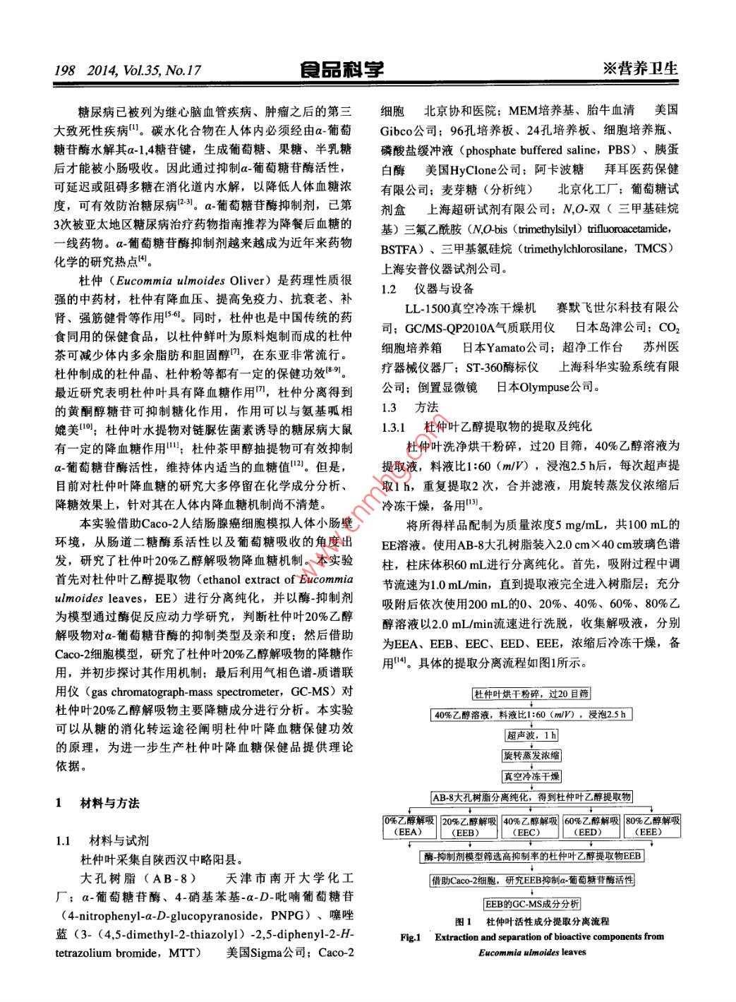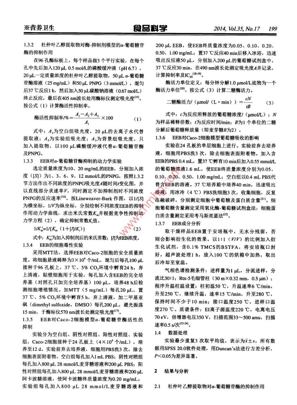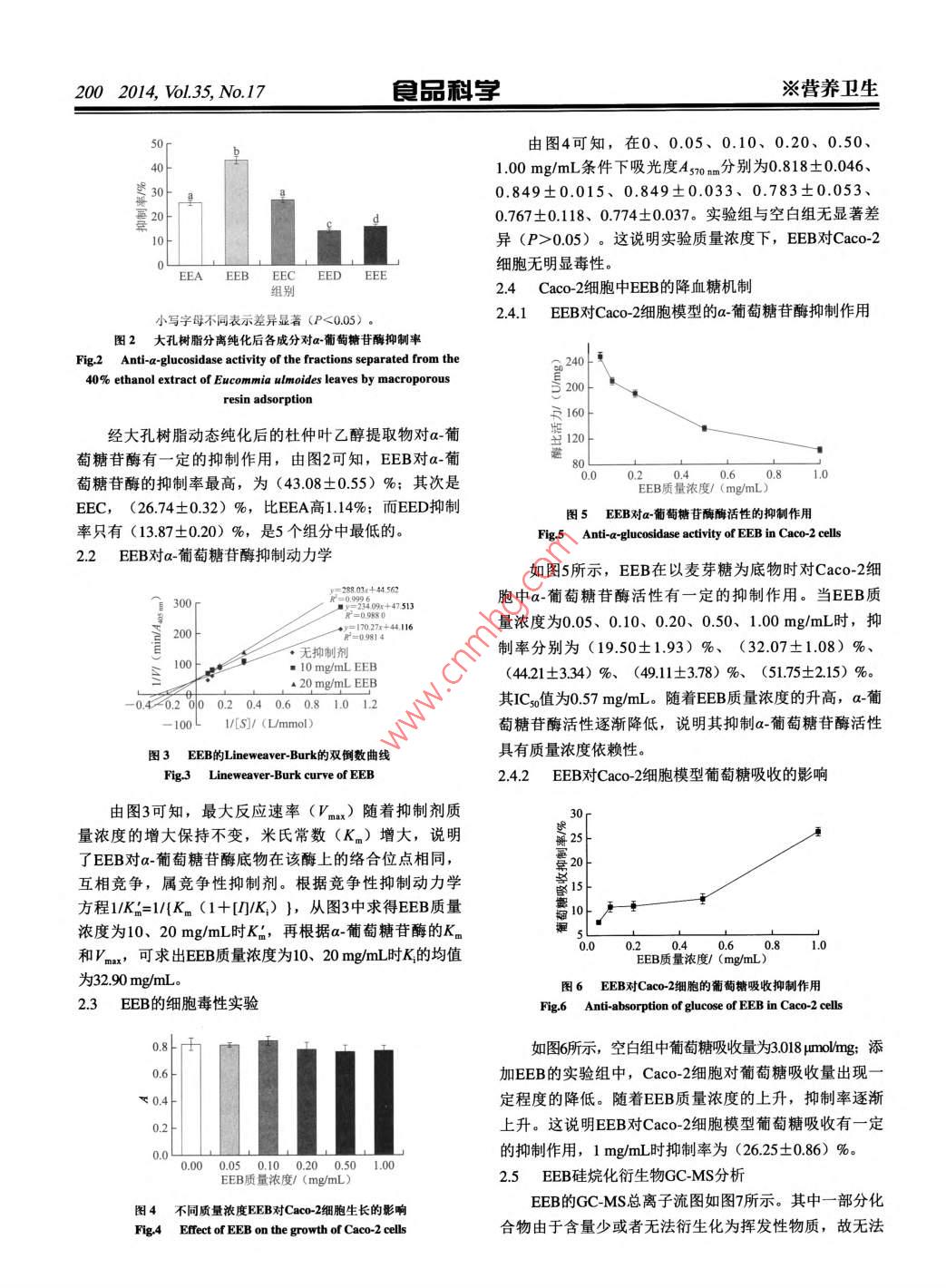 ※營(yíng)養(yǎng)衛(wèi)生品科獸2014V.35,No.17197杜仲葉乙醇提取物的降糖作用機(jī)理張紅霞,楊丹丹,王鳳,李伊嬌,范俊峰(北京林業(yè)大學(xué)生物科學(xué)與技術(shù)學(xué)院,北京100083)摘要:為了闡明杜仲葉的降血糖功效及其機(jī)制,采用酶抑制劑模型,篩選高抑制率的杜仲葉乙醇提取物并判斷其對(duì)α-葡萄糖苷酶的抑制類型;借助caco-2人結(jié)腸腺癌細(xì)胞模型,研究杜仲葉20%乙醇解吸物對(duì)α-葡萄糖苷酶活性及葡萄糖轉(zhuǎn)運(yùn)蛋白的影響;氣相色譜質(zhì)譜聯(lián)用分析杜仲葉20%乙醇解吸物主要成分。杜仲葉20%乙醇解吸物可競(jìng)爭(zhēng)性地抑制a葡萄糖苷酶,其抑制常數(shù)K值為3290mg/mL。它對(duì)Caco-2細(xì)胞中的a-葡萄糖苷酶有較強(qiáng)抑制作用,其ICs為0.57mg/mL,且對(duì)Cac-2細(xì)胞攝取葡萄糖也有一定抑制作用,1mg/m時(shí)抑制率可達(dá)2625%。氣相色譜質(zhì)譜分析表明杜仲葉20%乙醇解吸物主要有DL異檸檬酸內(nèi)酯、百里酚、兒茶素、2,6-二羥基苯甲酸和3,4-羥基苯丙烯酸等。這些結(jié)果表明,杜仲葉乙醇提取物可以通過抑制a-葡萄糖苷酶活性,降低葡萄糖吸收來實(shí)現(xiàn)降血糖的效果。關(guān)鍵詞:杜仲葉;Caco-2細(xì)胞;α-葡萄糖苷酶;降血糖;葡萄糖轉(zhuǎn)運(yùn):兒茶素Ethanol Extract of Eucommia ulmoides Leaves Inhibits Alpha-Glucosidase in Caco-2 CellsZHANG Hong-xia, YANG Dan-dan, WANG Feng, LI Yi-jiao, FAN Jun-fengCollege of Biological Sciences and Technology, Beijing Forestry University, Beijing 100083, China)Abstract: The inhibitory effects of 40% ethanol extract of Eucommia ulmoides leaves on alpha-glucosidase and glucosetransport were investigated in Caco-2 cells in vitro to elucidate the anti-hyperglycemic mechanism of Eucommia ulmoideleaves. The alpha-glucosidase inhibitors in the ethanol extract were also identified by GC-MS analysis. The kinetic studyshowed that the 20% ethanol elution fraction(EEB)from macroporous resin AB-8 of the ethanol extract of Eucommiaulmoides leaves could competitively inhibit alpha-glucosidase with a K, value of 32.90 mg/mL, indicating that alphaglucosidase has a strong affinity with the extract. Meanwhile, the inhibition was found to be reinforced as the concentrationof EEB increased. For investigation of the inhibitory effect of EEB in Caco-2 cells, cytotoxicity assays were firstly conductedby using different concentrations of EEB (0.05, 0.10, 0.20, 0.50 and 1.00 mg/mL)to determine the safety level at which cellgrowth and viability could not be affected. All tested concentrations of EEB had no effect on the growth or viability of Caco-2cells. Subsequently, EEB at various concentration exhibited effective suppression on alpha-glucosidase by using maltose(28 mmol/L) as the substrate in Caco-2 cells in a concentration-dependent manner with an ICs of 0.57 mg/mL. FurthermoreEEB could also attenuate glucose transport in Caco-2 cells, which could be decreased to 26. 25% by EEB(1 mg/mL).Theseresults indicate that EEB exerts strong anti-hyperglycemic effect by suppressing disaccharidase and glucose transportorsGC-MS analysis was conducted to elucidate the composition of the ethanol extract of Eucommia ulmoides leaves. It wasfound that acids, monosaccharides, polyphenols, esters, amino acids were the main components of EEB. Further analysis byGC-MS revealed that the ethanol extract was rich in DL-isocitric acid lactone, thymol, catechin, 2, 6-dihydroxybenzoic acidand 3, 4-dihydroxy cinnamic acid. These compounds may play important roles in the hypoglycemic effect of the extract.Thepresent study suggests Eucommia ulmoides leaves are a medicinal food material for preventing and treating diabetes,andcould be further developed into healthful productsKey words: Eucommia ulmoides leaves; Caco-2 cells; a-glucosidase; hypoglycemic; glucose transport; catechin中圖分類號(hào):TS2521文獻(xiàn)標(biāo)志碼:A文章編號(hào):1002-6630(2014)17-019707doi:10.7506spkx1002-6630201417038收稿日期:2013-11-03基金項(xiàng)目:國(guó)家自然科學(xué)基金面上項(xiàng)目(J103516)作者簡(jiǎn)介:張紅霞(1988-),女,碩士研究生,研究方向?yàn)楣δ苄允称贰-mail:Luludeert305@sina.cn*通信作者:范俊峰(1970—),男,副教授,博士,研究方向?yàn)橹苍葱远嚯暮忘S酮的抗血栓、抗糖尿病功能。1982014,.35,No.17自品科字※營(yíng)養(yǎng)衛(wèi)生糖尿病已被列為繼心腦血管疾病、胂瘤之后的第三細(xì)胞北京協(xié)和醫(yī)院;MEM培養(yǎng)基、胎牛血清美國(guó)大致死性疾病凹。碳水化合物在人體內(nèi)必須經(jīng)由α-葡萄 Gibco公司;96孔培養(yǎng)板、24孔培養(yǎng)板、細(xì)胞培養(yǎng)瓶、糖苷酶水解其α-1,4糖苷鍵,生成葡萄糖、果糖、半乳糖磷酸鹽緩沖液( phosphate buffered saline,PBS)、胰蛋后才能被小腸吸收。因此通過抑制a葡萄糖苷酶活性,白酶美國(guó) Hy Clone公司;阿卡波糖拜耳醫(yī)藥保健可延遲或阻礙多糖在消化道內(nèi)水解,以降低人體血糖濃有限公司;麥芽糖(分析純)北京化工廠:葡萄糖試度,可有效防治糖尿病。a-葡萄糖苷酶抑制劑,已第劑盒上海超研試劑有限公司:N,O-雙(三甲基硅烷3次被亞太地區(qū)糖尿病治療藥物指南推薦為降餐后血糖的基)三氟乙酰胺(MObs( (trimethylsi) trifluoroacetamide,線藥物。a-葡萄糖苷酶抑制劑越來越成為近年來藥物 BSTFA)、三甲基氯硅烷( trimethylchlorosilane,TMcs)化學(xué)的研究熱點(diǎn)。上海安普儀器試劑公司。杜仲( Eucommia uLmoides oliver)是藥理性質(zhì)很強(qiáng)的中藥材,杜仲有降血壓、提高免疫力、抗衰老、補(bǔ)12儀器與設(shè)備腎、強(qiáng)筋健骨等作用6。同時(shí),杜仲也是中