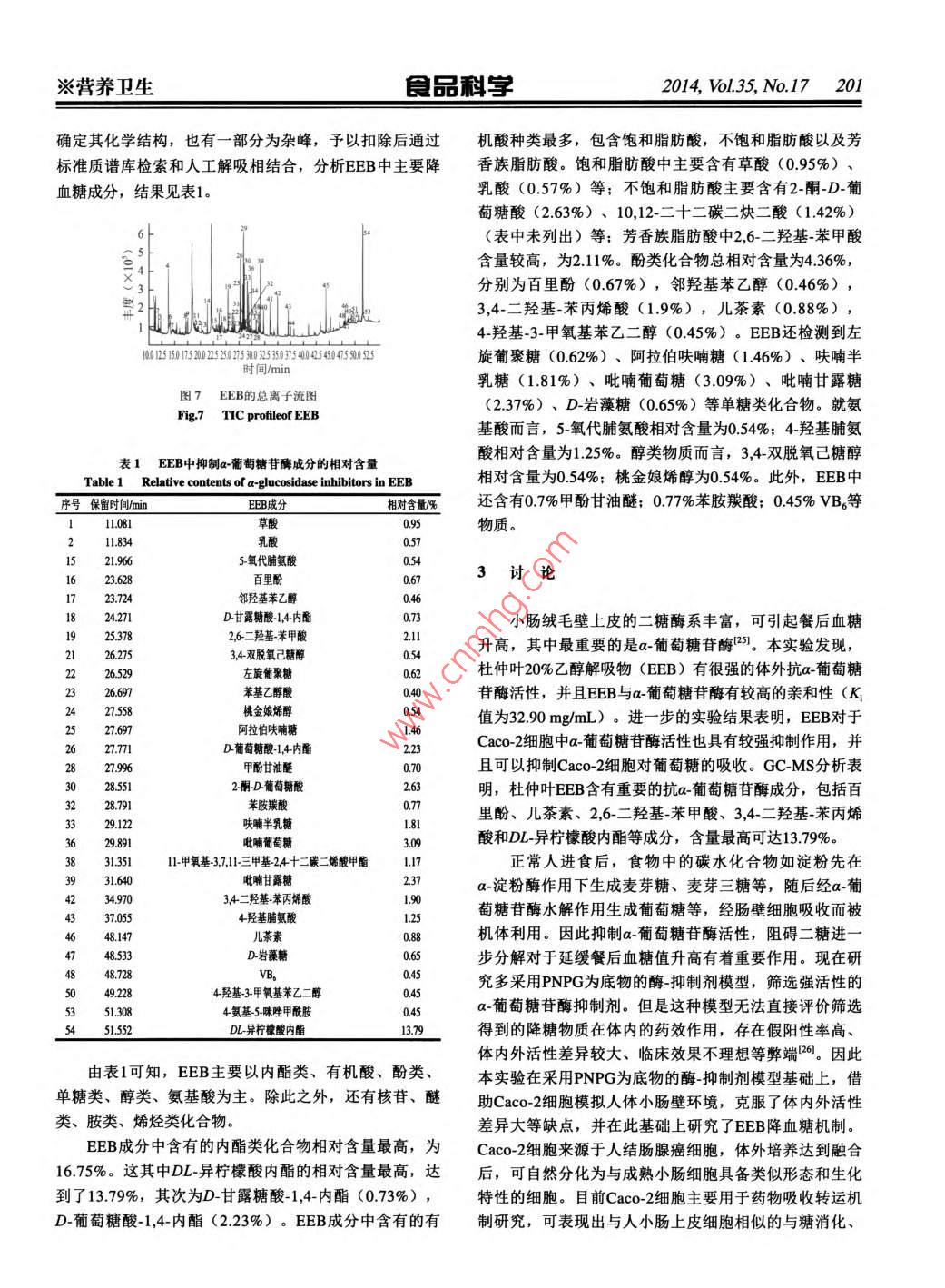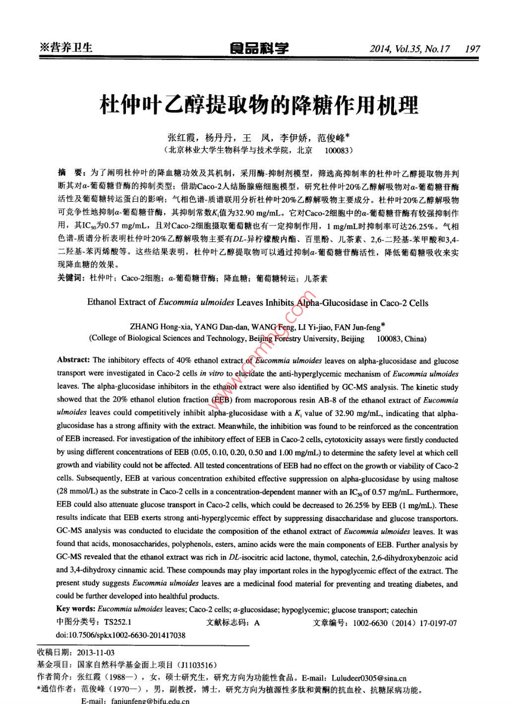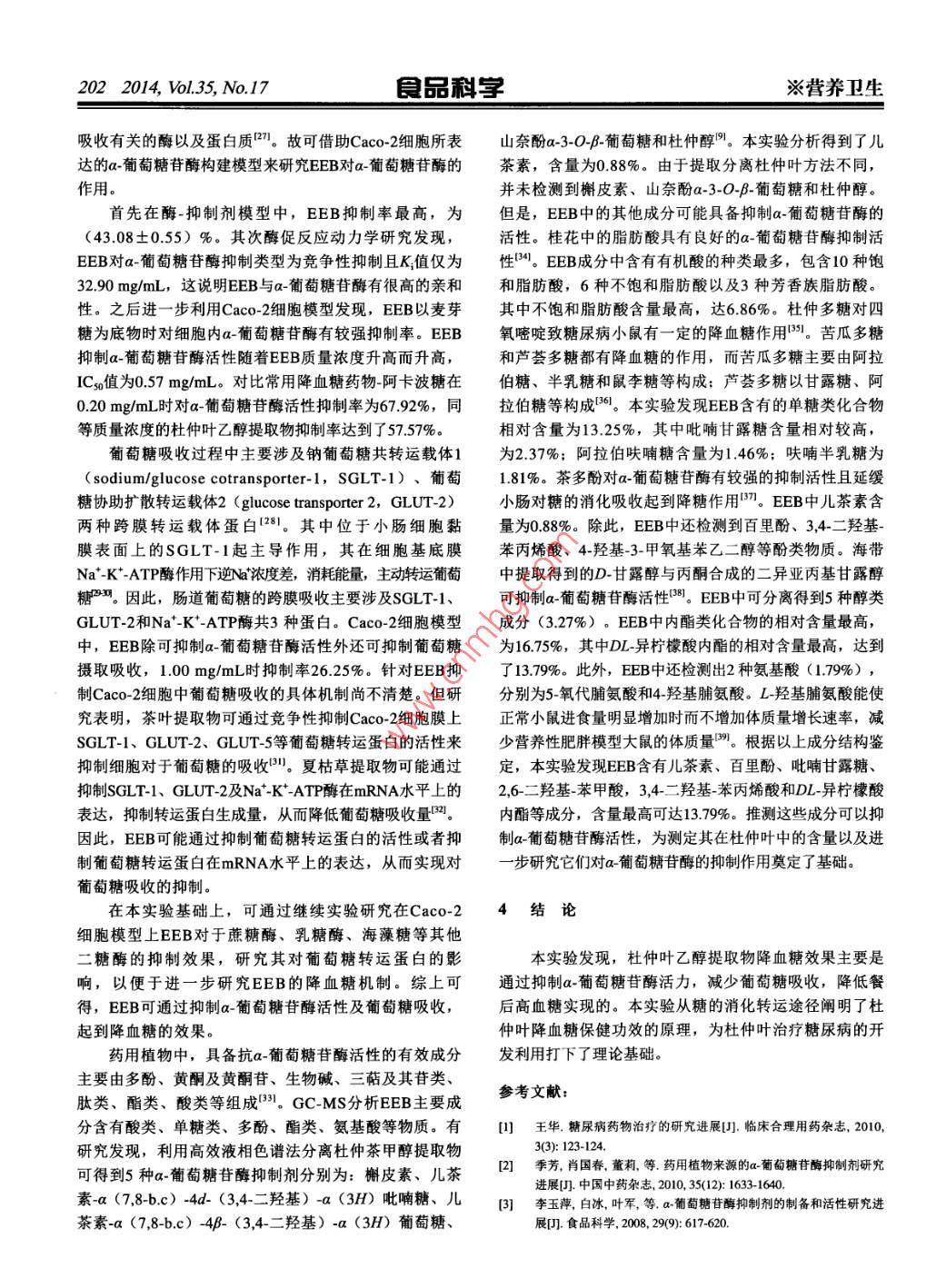 ※營(yíng)養(yǎng)衛(wèi)生品科獸2014V.35,No.17197杜仲葉乙醇提取物的降糖作用機(jī)理張紅霞,楊丹丹,王鳳,李伊嬌,范俊峰(北京林業(yè)大學(xué)生物科學(xué)與技術(shù)學(xué)院,北京100083)摘要:為了闡明杜仲葉的降血糖功效及其機(jī)制,采用酶抑制劑模型,篩選高抑制率的杜仲葉乙醇提取物并判斷其對(duì)α-葡萄糖苷酶的抑制類型;借助caco-2人結(jié)腸腺癌細(xì)胞模型,研究杜仲葉20%乙醇解吸物對(duì)α-葡萄糖苷酶活性及葡萄糖轉(zhuǎn)運(yùn)蛋白的影響;氣相色譜質(zhì)譜聯(lián)用分析杜仲葉20%乙醇解吸物主要成分。杜仲葉20%乙醇解吸物可競(jìng)爭(zhēng)性地抑制a葡萄糖苷酶,其抑制常數(shù)K值為3290mg/mL。它對(duì)Caco-2細(xì)胞中的a-葡萄糖苷酶有較強(qiáng)抑制作用,其ICs為0.57mg/mL,且對(duì)Cac-2細(xì)胞攝取葡萄糖也有一定抑制作用,1mg/m時(shí)抑制率可達(dá)2625%。氣相色譜質(zhì)譜分析表明杜仲葉20%乙醇解吸物主要有DL異檸檬酸內(nèi)酯、百里酚、兒茶素、2,6-二羥基苯甲酸和3,4-羥基苯丙烯酸等。這些結(jié)果表明,杜仲葉乙醇提取物可以通過抑制a-葡萄糖苷酶活性,降低葡萄糖吸收來實(shí)現(xiàn)降血糖的效果。關(guān)鍵詞:杜仲葉;Caco-2細(xì)胞;α-葡萄糖苷酶;降血糖;葡萄糖轉(zhuǎn)運(yùn):兒茶素Ethanol Extract of Eucommia ulmoides Leaves Inhibits Alpha-Glucosidase in Caco-2 CellsZHANG Hong-xia, YANG Dan-dan, WANG Feng, LI Yi-jiao, FAN Jun-fengCollege of Biological Sciences and Technology, Beijing Forestry University, Beijing 100083, China)Abstract: The inhibitory effects of 40% ethanol extract of Eucommia ulmoides leaves on alpha-glucosidase and glucosetransport were investigated in Caco-2 cells in vitro to elucidate the anti-hyperglycemic mechanism of Eucommia ulmoideleaves. The alpha-glucosidase inhibitors in the ethanol extract were also identified by GC-MS analysis. The kinetic studyshowed that the 20% ethanol elution fraction(EEB)from macroporous resin AB-8 of the ethanol extract of Eucommiaulmoides leaves could competitively inhibit alpha-glucosidase with a K, value of 32.90 mg/mL, indicating that alphaglucosidase has a strong affinity with the extract. Meanwhile, the inhibition was found to be reinforced as the concentrationof EEB increased. For investigation of the inhibitory effect of EEB in Caco-2 cells, cytotoxicity assays were firstly conductedby using different concentrations of EEB (0.05, 0.10, 0.20, 0.50 and 1.00 mg/mL)to determine the safety level at which cellgrowth and viability could not be affected. All tested concentrations of EEB had no effect on the growth or viability of Caco-2cells. Subsequently, EEB at various concentration exhibited effective suppression on alpha-glucosidase by using maltose(28 mmol/L) as the substrate in Caco-2 cells in a concentration-dependent manner with an ICs of 0.57 mg/mL. FurthermoreEEB could also attenuate glucose transport in Caco-2 cells, which could be decreased to 26. 25% by EEB(1 mg/mL).Theseresults indicate that EEB exerts strong anti-hyperglycemic effect by suppressing disaccharidase and glucose transportorsGC-MS analysis was conducted to elucidate the composition of the ethanol extract of Eucommia ulmoides leaves. It wasfound that acids, monosaccharides, polyphenols, esters, amino acids were the main components of EEB. Further analysis byGC-MS revealed that the ethanol extract was rich in DL-isocitric acid lactone, thymol, catechin, 2, 6-dihydroxybenzoic acidand 3, 4-dihydroxy cinnamic acid. These compounds may play important roles in the hypoglycemic effect of the extract.Thepresent study suggests Eucommia ulmoides leaves are a medicinal food material for preventing and treating diabetes,andcould be further developed into healthful productsKey words: Eucommia ulmoides leaves; Caco-2 cells; a-glucosidase; hypoglycemic; glucose transport; catechin中圖分類號(hào):TS2521文獻(xiàn)標(biāo)志碼:A文章編號(hào):1002-6630(2014)17-019707doi:10.7506spkx1002-6630201417038收稿日期:2013-11-03基金項(xiàng)目:國(guó)家自然科學(xué)基金面上項(xiàng)目(J103516)作者簡(jiǎn)介:張紅霞(1988-),女,碩士研究生,研究方向?yàn)楣δ苄允称贰-mail:Luludeert305@sina.cn*通信作者:范俊峰(1970—),男,副教授,博士,研究方向?yàn)橹苍葱远嚯暮忘S酮的抗血栓、抗糖尿病功能。1982014,.35,No.17自品科字※營(yíng)養(yǎng)衛(wèi)生糖尿病已被列為繼心腦血管疾病、胂瘤之后的第三細(xì)胞北京協(xié)和醫(yī)院;MEM培養(yǎng)基、胎牛血清美國(guó)大致死性疾病凹。碳水化合物在人體內(nèi)必須經(jīng)由α-葡萄 Gibco公司;96孔培養(yǎng)板、24孔培養(yǎng)板、細(xì)胞培養(yǎng)瓶、糖苷酶水解其α-1,4糖苷鍵,生成葡萄糖、果糖、半乳糖磷酸鹽緩沖液( phosphate buffered saline,PBS)、胰蛋后才能被小腸吸收。因此通過抑制a葡萄糖苷酶活性,白酶美國(guó) Hy Clone公司;阿卡波糖拜耳醫(yī)藥保健可延遲或阻礙多糖在消化道內(nèi)水解,以降低人體血糖濃有限公司;麥芽糖(分析純)北京化工廠:葡萄糖試度,可有效防治糖尿病。a-葡萄糖苷酶抑制劑,已第劑盒上海超研試劑有限公司:N,O-雙(三甲基硅烷3次被亞太地區(qū)糖尿病治療藥物指南推薦為降餐后血糖的基)三氟乙酰胺(MObs( (trimethylsi) trifluoroacetamide,線藥物。a-葡萄糖苷酶抑制劑越來越成為近年來藥物 BSTFA)、三甲基氯硅烷( trimethylchlorosilane,TMcs)化學(xué)的研究熱點(diǎn)。上海安普儀器試劑公司。杜仲( Eucommia uLmoides oliver)是藥理性質(zhì)很強(qiáng)的中藥材,杜仲有降血壓、提高免疫力、抗衰老、補(bǔ)12儀器與設(shè)備腎、強(qiáng)筋健骨等作用6。同時(shí),杜仲也是中
