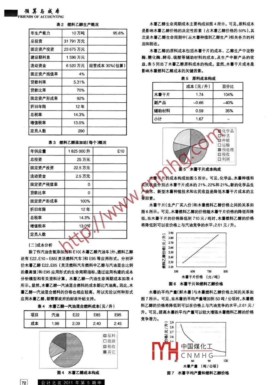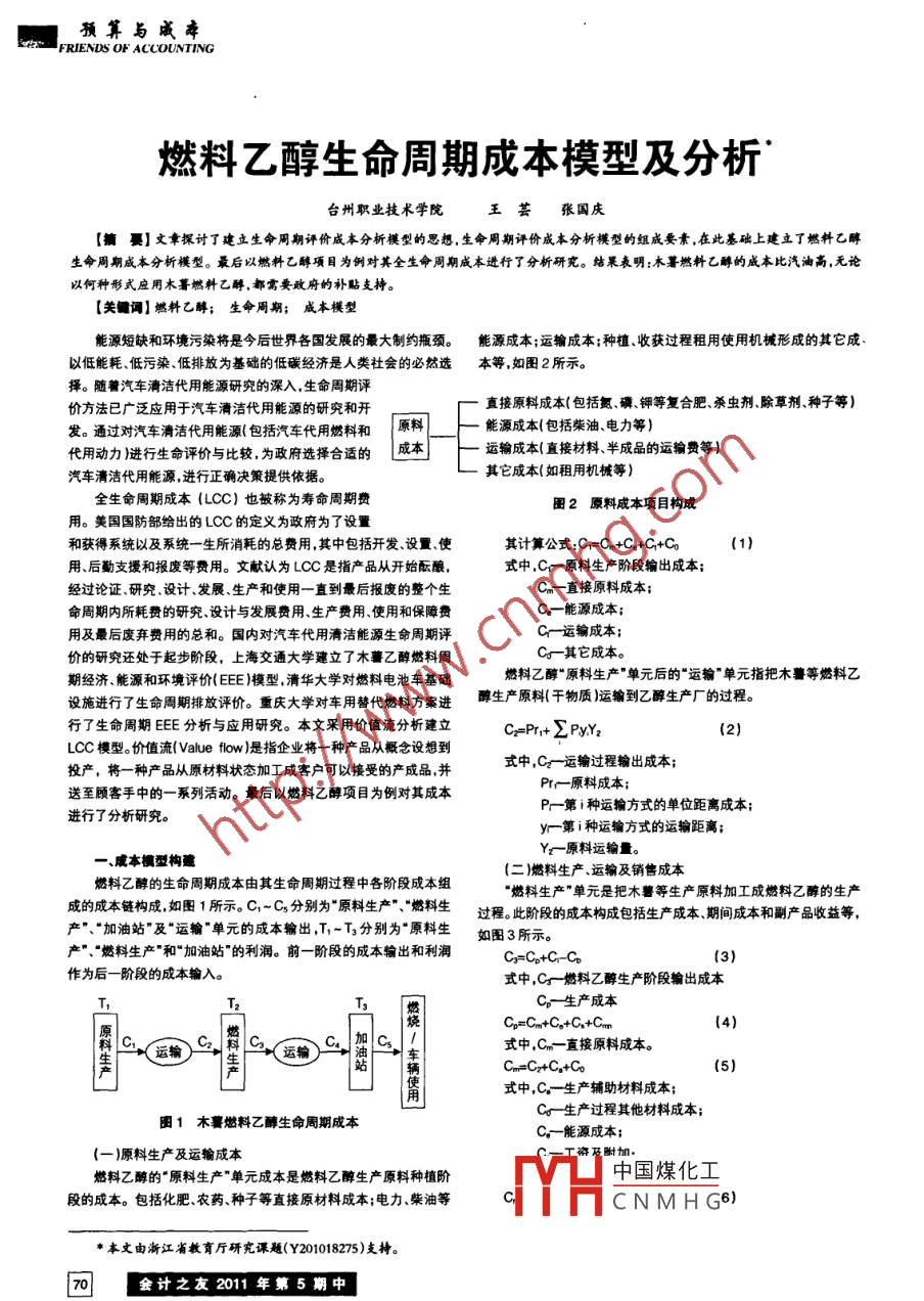 n預(yù)成。燃料乙醇生命周期成本模型及分析臺(tái)州職業(yè)技術(shù)學(xué)院王甚張國(guó)慶【犒顎】文章探討了建立生命周期評(píng)價(jià)成本分析模型的忠想,生命周期評(píng)價(jià)成本分析模型的組成要素,在此基礎(chǔ)上建立了然料乙醇生命周期成本分析模型。最后以燃料乙醵項(xiàng)目為例對(duì)其全生命周期成本進(jìn)行了分析研究。站果表明:木薯然料乙醇的成本比汽油高,無論以何種形式應(yīng)用木薯燃料乙醉,都需要政府的補(bǔ)貼支持?!娟P(guān)調(diào)】燃料乙醇;生命周期;成本模型能源短缺和環(huán)境污染將是今后世界各國(guó)發(fā)展的最大制約瓶頸。能源成本;運(yùn)輸成本;種植、收獲過程租用使用機(jī)械形成的其它成低能耗、低污染、低排放為基礎(chǔ)的低碳經(jīng)濟(jì)是人類社會(huì)的必然選本等,如圖2所示擇。隨著汽車清潔代用能源研究的深入,生命周期評(píng)價(jià)方法已廣泛應(yīng)用于汽車清潔代用能源的研究和開直接原料成本包括氮磷、鉀等復(fù)合肥、殺蟲劑除草劑、種子等)發(fā)。通過對(duì)汽車清潔代用能源(包括汽車代用燃料和原料能源成本(包括柴油、電力等代用動(dòng)力進(jìn)行生命評(píng)價(jià)與比較,為政府選擇合適的成本運(yùn)輸成本(直接材料、半成品的運(yùn)輸費(fèi)等汽車清潔代用能源進(jìn)行正確決策提供依據(jù)。其它成本(如租用機(jī)械等全生命周期成本(LCC)也被稱為壽命周期費(fèi)圖2原料成本項(xiàng)目構(gòu)成美國(guó)國(guó)防部給出的LCc的定義為政府為了設(shè)置和獲得系統(tǒng)以及系統(tǒng)一生所消耗的總費(fèi)用,其中包括開發(fā)設(shè)置使其計(jì)算公式:C=Cm+C+C+C0【1用、后勤支援和報(bào)廢等費(fèi)用。文獻(xiàn)認(rèn)為L(zhǎng)cC是指產(chǎn)品從開始醞酸式中,C一原料生產(chǎn)階段輸出成本;經(jīng)過論證、研究設(shè)計(jì)發(fā)展、生產(chǎn)和使用一直到最后報(bào)廢的整個(gè)生c直接原料成本;命周期內(nèi)所耗費(fèi)的研究設(shè)計(jì)與發(fā)展費(fèi)用生產(chǎn)費(fèi)用使用和保障費(fèi)c一能源成本;用及最后廢棄費(fèi)用的總和。國(guó)內(nèi)對(duì)汽車代用清潔能源生命周期評(píng)C運(yùn)輸成本價(jià)的研究還處于起步階段,上海交通大學(xué)建立了木薯乙醇燃料周一其它成本。期經(jīng)濟(jì)、能源和環(huán)境評(píng)價(jià)EEE)模型,清華大學(xué)對(duì)燃料電池車基礎(chǔ)燃料乙醇原料生產(chǎn)單元后的“運(yùn)輸”單元指把木薯等燃料乙設(shè)施進(jìn)行了生命周期排放評(píng)價(jià)。重慶大學(xué)對(duì)車用替代燃料方案進(jìn)醇生產(chǎn)原料(干物質(zhì))運(yùn)輸?shù)揭掖忌a(chǎn)廠的過程行了生命周期EEE分析與應(yīng)用研究。本文采用價(jià)值流分析建立y2LCC模型。價(jià)值流( Value flow)是指企業(yè)將一種產(chǎn)品從概念設(shè)想到投產(chǎn),將一種產(chǎn)品從原材料狀態(tài)加工成客戶可以接受的產(chǎn)成品,并式中,C一運(yùn)輸過程輸出成本;送至顧客手中的一泵列活動(dòng)。最后以燃料乙醇項(xiàng)目為例對(duì)其成本P一原料成本;進(jìn)行了分析研究一第i種運(yùn)輸方式的單位距離成本;y一第i種運(yùn)輸方式的運(yùn)輸距離Y一原料運(yùn)輸量。一成本型構(gòu)薹二)燃料生產(chǎn)運(yùn)輸及銷售成本燃料乙醇的生命周期成本由其生命周期過程中各階段成本組燃料生產(chǎn)”單元是把木薯等生產(chǎn)原料加工成燃料乙醇的生產(chǎn)成的成本鏈構(gòu)成如圖1所示。C1~C分別為“原料生產(chǎn)”、“燃科生過程。此階段的成本構(gòu)成包括生產(chǎn)成本期間成本和副產(chǎn)品收益等,產(chǎn)、“加油站"及“運(yùn)輸”單元的成本輸出,T,-T分別為“原料生如圖3所示。產(chǎn)”、“燃料生產(chǎn)”和“加油站"的利潤(rùn)。前一階段的成本輸出和利潤(rùn)C(jī)a=Co+C-Co作為后一階段的成本輸入。式中,C燃料乙醇生產(chǎn)階段輸出成本C生產(chǎn)成本Cp=Cm+C,+C,+Cm4運(yùn)輸)星9<運(yùn)輸)加式中,C直接原料成本。Cm=C+C, +Co式中,C一生產(chǎn)輔助材料成本;C生產(chǎn)過程其他材料成本田1木薯燃料乙醇生命周期成本C能源成本;一)原料生產(chǎn)及運(yùn)輸成本燃料乙醇的“原料生產(chǎn)單元成本是燃料乙醇生產(chǎn)原料種植階中國(guó)煤化工段的成本。包括化肥、農(nóng)藥種子等直接原材料成本;電力柴油等CNMHG6本文由漸淅江省教育廳研究課題(Y201018275)支持。7[金計(jì)之友2011年第5期中預(yù)總瀛■式中,C折舊費(fèi)用Co=F【1-RLAR/Dc=P+∑PyY3(7式中,F固定資產(chǎn)原值;式中,C一運(yùn)輸過程輸出成本;R殘值率;P一第i種運(yùn)輸方式的單位距離成本;R固定資產(chǎn)原形成率y一第i種運(yùn)輸方式的運(yùn)輸距離;D—折舊年限;燃科運(yùn)輸量。c保養(yǎng)及維修成本加油站是燃料乙醇生命周期過程中的銷售環(huán)節(jié),其成本計(jì)算c一其它成本。方法與乙醇生產(chǎn)過程的成本計(jì)算方法相同C=Cma+Cr+CCs=Co+C式中,C一期間費(fèi)用;(15)C管理費(fèi)用C=Ca+C,+Co16C財(cái)務(wù)費(fèi)用;Cm=Co+CR+CorC-銷售費(fèi)用(18)Pr3=Cs+Ta+Ps【19)乙醇的生產(chǎn)價(jià)格為:式中,P燃料乙醇銷售價(jià)格9T。乙醇銷售環(huán)節(jié)稅金式中,P燃料乙醇生產(chǎn)價(jià)格;P乙醇銷售利潤(rùn)。T乙醇