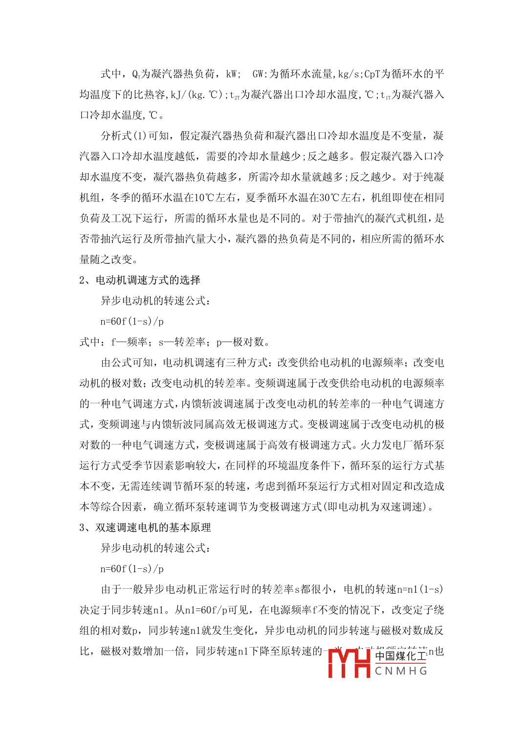 火力發(fā)電廠循環(huán)水泵雙速節(jié)能改造張緒溫'劉文超2李媛3山東華電節(jié)能技術(shù)有限公司山東250014摘要:在電力市場(chǎng)日益竟?fàn)幖ち业沫h(huán)境下,電機(jī)雙速技術(shù)應(yīng)用具有較大推廣價(jià)值。循環(huán)泵電機(jī)改造雙速調(diào)節(jié)后,將大大提高機(jī)組循環(huán)水調(diào)節(jié)的靈活性,優(yōu)化了循環(huán)泵運(yùn)行方式,提高了機(jī)組運(yùn)行的經(jīng)濟(jì)性,節(jié)約廠用電和降低供電煤耗,經(jīng)濟(jì)效益顯著。電機(jī)雙速改造屬于較為成熟的技術(shù),具有較大的可靠性、經(jīng)濟(jì)性。關(guān)鍵詞:火力發(fā)電廠;循環(huán)水泵;雙速節(jié)能;改造中圖分類號(hào): TM621 文獻(xiàn)標(biāo)識(shí)碼: A引言火力發(fā)電廠循環(huán)泵是發(fā)電機(jī)組冷卻水系統(tǒng)中重要的運(yùn)行設(shè)備,循環(huán)水入口溫度的升高,將導(dǎo)致機(jī)組經(jīng)濟(jì)性降低。在機(jī)組運(yùn)行中,為了保證機(jī)組- -直處在最優(yōu)化運(yùn)行狀態(tài),就必須保持機(jī)組在各種工況下的循環(huán)水經(jīng)濟(jì)流量,從而得到凝汽器運(yùn)行的最佳真空。原機(jī)組調(diào)節(jié)循環(huán)水流量的措施,是采用啟停循環(huán)泵臺(tái)數(shù)的方式,調(diào)節(jié)凝汽器的循環(huán)水量,來提高機(jī)組的經(jīng)濟(jì)性。在某電廠#2機(jī)循環(huán)水系統(tǒng),設(shè)置兩臺(tái)50%容量的循環(huán)泵,凝汽器所需水量與進(jìn)水溫度有關(guān),運(yùn)行人員主要根據(jù)運(yùn)行經(jīng)驗(yàn)和環(huán)境溫度等因素啟停循環(huán)泵運(yùn)行臺(tái)數(shù),一般情況下,冬季運(yùn)行1臺(tái),春、夏、秋季運(yùn)行2臺(tái)。這種調(diào)節(jié)循環(huán)水流量運(yùn)行方式,雖然有- -定的經(jīng)濟(jì)性,但不能滿足機(jī)組在不同負(fù)荷和春、夏、秋、冬四季環(huán)境溫度變化對(duì)循環(huán)水入口溫度的要求,同時(shí),也存在“大馬來小車”的現(xiàn)象。為降低發(fā)電成本,根據(jù)水泵的機(jī)械特性,泵的流量與轉(zhuǎn)速一次方成正比,揚(yáng)程與轉(zhuǎn)速平方成正比,軸功率與轉(zhuǎn)速立方成正,當(dāng)通過降低轉(zhuǎn)速以減少流量來達(dá)到節(jié)流的目的時(shí),所消耗的功率降低很多。經(jīng)綜合調(diào)研,確定通過電氣調(diào)節(jié)循環(huán)泵轉(zhuǎn)速方法,來提高機(jī)組循環(huán)水系統(tǒng)調(diào)節(jié)的靈活性,更好地滿足機(jī)組對(duì)循環(huán)水入口的要求,降低循環(huán)泵的能耗,節(jié)約廠用電量,達(dá)到節(jié)能增效的目的。1、循環(huán)水量應(yīng)隨冷卻水溫和熱負(fù)荷的變化進(jìn)行調(diào)整循環(huán)水的作用是冷卻,簡(jiǎn)稱冷卻水,旨在將排入凝汽器的熱量帶走。凝汽器熱負(fù)荷與循環(huán)水的關(guān)系式:Q=GmXCp(txr-trn)中國(guó)煤化工MHCNMH G式中,Q,為凝汽器熱負(fù)荷,kW; GW: 為循環(huán)水流量, kg/s;CpT為循環(huán)水的平均溫度下的比熱容, kJ/ (kg. C); tu為凝汽器出口冷卻水溫度, °C;tr為凝汽器入口冷卻水溫度, °C。分析式(1)可知,假定凝汽器熱負(fù)荷和凝汽器出口冷卻水溫度是不變量,凝汽器入口冷卻水溫度越低,需要的冷卻水量越少;反之越多。假定凝汽器入口冷.卻水溫度不變,凝汽器熱負(fù)荷越多,所需冷卻水量就越多;反之越少。對(duì)于純凝機(jī)組,冬季的循環(huán)水溫在10°C左右,夏季循環(huán)水溫在30°C左右,機(jī)組即使在相同負(fù)荷及工況下運(yùn)行,所需的循環(huán)水量也是不同的。對(duì)于帶抽汽的凝汽式機(jī)組,是否帶抽汽運(yùn)行及所帶抽汽量大小,凝汽器的熱負(fù)荷是不同的,相應(yīng)所需的循環(huán)水量隨之改變。2、電動(dòng)機(jī)調(diào)速方式的選擇異步電動(dòng)機(jī)的轉(zhuǎn)速公式:n=60f(1-s)/p式中: f-頻率; s- 轉(zhuǎn)差率; p-極對(duì)數(shù)。由公式可知,電動(dòng)機(jī)調(diào)速有三種方式:改變供給電動(dòng)機(jī)的電源頻率;改變電動(dòng)機(jī)的極對(duì)數(shù);改變電動(dòng)機(jī)的轉(zhuǎn)差率。變頻調(diào)速屬于改變供給電動(dòng)機(jī)的電源頻率的一種電氣調(diào)速方式,內(nèi)饋斬波調(diào)速屬于改變電動(dòng)機(jī)的轉(zhuǎn)差率的一一種電氣調(diào)速方式,變頻調(diào)速與內(nèi)饋斬波同屬高效無極調(diào)速方式。變極調(diào)速屬于改變電動(dòng)機(jī)的極對(duì)數(shù)的一種電氣調(diào)速方式,變極調(diào)速屬于高效有極調(diào)速方式?;鹆Πl(fā)電廠循環(huán)泵運(yùn)行方式受季節(jié)因素影響較大,在同樣的環(huán)境溫度條件下,循環(huán)泵的運(yùn)行方式基本不變,無需連續(xù)調(diào)節(jié)循環(huán)泵的轉(zhuǎn)速,考慮到循環(huán)泵運(yùn)行方式相對(duì)固定和改造成本等綜合因素,確立循環(huán)泵轉(zhuǎn)速調(diào)節(jié)為變極調(diào)速方式(即電動(dòng)機(jī)為雙速調(diào)速)。3、雙速調(diào)速電機(jī)的基本原理由于一般異步電動(dòng)機(jī)正常運(yùn)行時(shí)的轉(zhuǎn)差率s都很小,電機(jī)的轉(zhuǎn)速n=n1(1-s)決定于同步轉(zhuǎn)速n1。從n1=60f/p可見,在電源頻率f不變的情況下,改變定子繞.組的相對(duì)數(shù)p,同步轉(zhuǎn)速n1就發(fā)生變化,異步電動(dòng)機(jī)的同步轉(zhuǎn)速與磁極對(duì)數(shù)成反比,磁極對(duì)