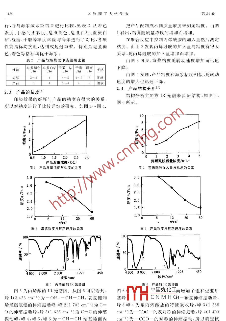 第34卷第4期太原理工Vol 34 No 42003年7月JOURNAL OF TAIYUAN UNIVERSITY OF TECHNOLOGYJuly 2003文章編號(hào):1007-9432(2003)04-0449-03丙烯酸鹽和丙烯酰胺共聚物的制備李愛(ài)秀太原理工大學(xué)測(cè)試中心,山西太原030024)摘要:以丙烯酸為原料,加入少量丙烯酰胺和礦物鹽,用偶氮二異丁腈為引發(fā)劑速聚而成種新型增稠劑。并將其性能和印染效罘與藻朊酸鈉作了對(duì)比。鮚釆表明,該増稠劑増稠效果與藻朊酸鈉相當(dāng),并用紅外光譜驗(yàn)證了產(chǎn)品的結(jié)構(gòu)。關(guān)鍵詞:丙烯酸;丙烯酰胺;偶氪二異丁腈;藻朊酸鈉;引發(fā)劑中圖分類號(hào):TQ203;TQ610.4文獻(xiàn)標(biāo)識(shí)碼:A目前國(guó)內(nèi)外多數(shù)紡織印染廠用藻朊酸鈉作活性反應(yīng)液倒入盛有引發(fā)劑溶液的塑料速聚反應(yīng)器中染料的糊料,但是藻朊酸鈉是一種天然的增稠劑,資進(jìn)行速聚得白色孔性固體產(chǎn)物,在105℃烘干并粉源奇缺,價(jià)格昂貴,所以開(kāi)發(fā)它的代用品是勢(shì)在必碎。行。許多國(guó)家正在研究開(kāi)發(fā)藻朊酸鈉的代用品。日本的KoKo, Shigetoshi等所申請(qǐng)的專利是用羧甲2結(jié)果與討論基淀粉纖維素混合物的堿金屬鹽來(lái)代替藻朊酸鈉2.1工藝的選擇網(wǎng)印棉織物。 Ortega Theresa m申請(qǐng)的歐洲專利合成工藝主要選擇引發(fā)劑及配料比。引發(fā)劑是用一種雜環(huán)化合物和水溶性的多糖與藻朊酸鈉混有:高錳酸鉀檸檬酸引發(fā)體系,過(guò)硫酸鉀引發(fā)體系,合印染棉織品與地毯。埃及的A. Hebeish等先后偶氮二異丁腈的引發(fā)體系。最后選擇最佳的一種偶發(fā)表了幾篇論文2-,研究以聚丙烯酸淀粉組成物氮二異丁腈的引發(fā)體系,該引發(fā)劑能在低沸點(diǎn)有機(jī)代替藻朊酸鈉,印染物的著色強(qiáng)度、水洗牢度和干磨溶劑中迅速溶解,而且速聚速度快產(chǎn)量高。合成工牢度等指標(biāo)不穩(wěn)定,其主要原因是未接枝的淀粉在藝見(jiàn)表1起作用。本文研究的是一種丙烯酸與少量丙烯酰胺表1合成工藝配方及少量礦物鹽的共聚物,其增稠效果與藻朊酸鈉相當(dāng),優(yōu)點(diǎn)是價(jià)格低,抗菌性好,易洗除,著色強(qiáng)調(diào)高會(huì)入原料丙烯酸丙烯酰膠發(fā)劑礦物鹽1物鹽2碳酸堿水滲透性好。實(shí)驗(yàn)部分1.1原料與儀器原料:丙烯酸(工業(yè)級(jí)),碳酸鉀(工業(yè)級(jí))丙烯[注:+”為合成時(shí)所加人的原料,一”表示合成時(shí)沒(méi)有該原料酰胺(工業(yè)級(jí)),偶氮二異丁腈(工業(yè)級(jí)),高錳酸鉀(CP),檸檬酸(CP),過(guò)硫酸鉀(CP),藻朊酸鈉(工業(yè)從表1知,配方Ⅰ粘度低厚度不夠;配方Ⅱ加入級(jí))。設(shè)備:塑料速聚反應(yīng)器;電動(dòng)攪拌器;升降臺(tái)礦物鹽1后,厚度增加,但粘度仍小;配方Ⅲ加入礦電熱套;水浴鍋;ND旋轉(zhuǎn)式粘度計(jì);FTIR1730紅物鹽2后厚度增加不如礦物鹽1明顯;配方N加入外光譜儀(美國(guó)PE公司)丙烯酰胺后粘度增大且流線性好但厚度差;配方V1.2合成方法克服中國(guó)煤化工選擇配方Ⅴ進(jìn)行平行在500mL的不銹鋼杯中安裝電動(dòng)攪拌器,加試驗(yàn)CNMHG入一定量水,同時(shí)加入一定量堿,直到堿全部溶解。2.2試印染結(jié)果然后慢慢加入丙烯酸和礦物鹽,pH=6~7,最后將產(chǎn)品試印染小樣試驗(yàn)在山西省紡織印染廠進(jìn)收稿早請(qǐng)數(shù)(56-),女、山西忻州人,高級(jí)工程師,主要從事淀粉深加工及儀器分析研究150太原理工大學(xué)學(xué)報(bào)第34卷行,并與海漿試印染結(jié)果進(jìn)行比較,見(jiàn)表2.從著色把產(chǎn)品配制成不同質(zhì)量濃度來(lái)測(cè)定粘度。由圖強(qiáng)度、手感的柔軟度、皂煮褪色、皂煮白沾、濕燙白1看岀,粘度隨質(zhì)量濃度的增加而增加沾、濕磨、干磨等牢度試驗(yàn)與海漿進(jìn)行了對(duì)比,各項(xiàng)在聚合反應(yīng)中控制丙烯酰胺的加入量然后測(cè)定性能指標(biāo)均接近,達(dá)到或超過(guò)海漿。特別是皂煮褪粘度。由圖2發(fā)現(xiàn)丙烯酰胺的加入量與粘度有很大色、著色等指標(biāo)均優(yōu)于海漿。關(guān)系,隨丙烯酰胺的加人量增加而增加表2產(chǎn)品與海漿試印染結(jié)果比較由圖3可見(jiàn),海漿粘度隨轉(zhuǎn)動(dòng)速度增加而迅速性能!煮褪色皂煮白沾濕燙白沾干磨下降。海漿由圖4發(fā)現(xiàn),產(chǎn)品粘度和海漿粘度相似,隨轉(zhuǎn)動(dòng)2柔軟速度的增大也迅速下降。2.4產(chǎn)品結(jié)構(gòu)分析2.3產(chǎn)品的粘度6結(jié)構(gòu)分析主要靠IR光譜來(lái)驗(yàn)證結(jié)構(gòu),如圖5,印染效果的好壞與產(chǎn)品的粘度有很大的關(guān)系圖6所示。所以對(duì)粘度進(jìn)行了比較詳細(xì)的研究。如圖1~圖4420051.01.520253.0產(chǎn)品質(zhì)量濃度/gL內(nèi)烯酰胺質(zhì)量濃度/gL1質(zhì)量濃度與粘度的關(guān)系圖2丙烯酰胺加入量與粘度的關(guān)系2.430圖3海漿粘度與轉(zhuǎn)動(dòng)速度的關(guān)系圖4產(chǎn)品粘度與轉(zhuǎn)動(dòng)速度的關(guān)系400030002000400030002000波數(shù)/cm圖5丙烯酸的IR光譜圖圖6產(chǎn)品的IR光譜圖圖5為丙烯酸的R光諧圖。從圖5可以看到.圖6V山中國(guó)煤化工而增加了飽和烴亞甲峰1(3423cm-1)為-OH,CH=CH2氧氫鍵和基峰CNMHGH-碳?xì)渖炜s振動(dòng)峰烯烴碳?xì)滏I的伸縮振動(dòng)峰,峰2(lτσ3cm-)為C≡峰3峰Δ為聚丙烯酸鹽的特征吸收峰,峰3(1568O