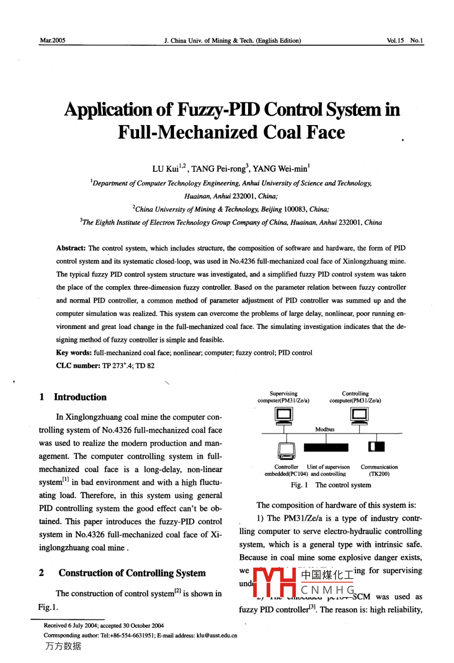 Mar 2005J. China Univ. of Mining Tech (English Edition)VoL 15 No. 1Application of Fuzzy-PID Control System inFull-Mechanized Coal faceLU Kui", TANG Pei-rong, YANG Wei-miDepartment of Computer Technology Engineering, Anhui University of Science and TechnologyHuainan, Anhui 232001. China2 China University of mining Technology, Beijing 100083, China;The Eighth institute of Electron Technology Group Company of China, Huainan, Anhui 232001, ChinaAbstract: The control system, which includes structure, the composition of software and hardware, the form of PIDcontrol syd its systematic closed-loop, was used in No 4236 full-mechanized coal face of Xinlongzhuang mineThe typical fuzzy PID control system structure was investigated, and a simplified fuzzy PID control system was takenthe place of the complex three-dimension fuzzy controller. Based on the parameter relation between fuzzy controllerand normal PID controller, a common method of parameter adjustment of Pid controller was summed up and thecomputer simulation was realized. This system can overcome the problems of large delay, nonlinear, poor running en-vironment and great load change in the full-mechanized coal face. The simulating investigation indicates that the de-signing method of fuzzy controller is simple and feasible.Key words: full-mechanized coal face; nonlinear; computer; fuzzy control; PID controlCLCr:TP2734;TD821 Introductioncomputer(PM3 I/Ze/a)computer(PM31/Ze/a)In Xinglongzhuang coal mine the computer controlling system of No 4326 full-mechanized coal faceModbuswas used to realize the modern production and man-agement. The computer controlling system in full-mechanized coal face is a long-delay, non-linearembedded(PC104)and controllingTK200)systemin bad environment and with a high fluctu-Fig. 1 The control systemating load. Therefore, in this system using generalPID controlling system the good effect can't be ob-The composition of hardware of this system istained. This paper introduces the fuzzy-PID control1)The PM31/Ze/a is a type of industry contrsystem in No 4326 full-mechanized coal face of Xi- lling computer to serve electro-hydraulic controllininglongzhuang coal minesystem, which is a general type with intrinsic safe.Because in coal mine some explosive danger exists,2 Construction of Controlling System中國煤化工 ing for supervisingThe construction of control systemis shown inCNMHGu PlIer SCM was used asFig 1fuzzy PID controller 3. The reason is: high reliability,Received 6 July 2004: accepted 30 October 2004Corresponding author: Tel: +86-554-6631951; E-mail address: klu@ aust. eduLU Kui et alapplication of Fuzzy- PID Control System in Full-Mechanized Coal Faceuninterrupted working; adaptability for bad working function buttons can be set on the main interfaceenvironment; lower power consumption; friendly1)Selection of strategies for fuzzy controllingfigure interface; smaller volume; standard vo port to select the fuzzy controlling method, such as, basicand easy developmentconsulting-tables, triangle subj3)The AT89C52-SCM was used as supervising able field fuzzy algorithm and Basseville fuzzyand controlling unit. By means of series A/D 8 chan- trolling etc.nel 4-20 mA current was converted into digital sig-2)Selection of shape for subjection functionsnalto involve triangle, Gauss and trapezium3)Setting the fuzzy parameters: to selecfor electronic controller. By this protocol, communvariable of input, and to define the valuecation can be realized between controller and other each variable and its fuzzy subsetdevices4- It has become a standard industrial proto-4)Setting the precision parameters: to select thecan industrial web in which supervision can be car- each variable and its fuzzy subser e value range ofcol. All controlling devices can be connected with variables of output, and to define the value range ofried outIn the coal mine for computer fuzzy controlling5)The TK200 is a system of communication, the basic algorithm includes: Firstly, the fuzzy concontrol, and protection. On the basis of the TK100 trolling algorithms are compiled using C languagesystem it has some new functions such as protecting dLL by iFix's OLE container function; Secondly, thecoal carrier in coal face, controlling, communication, specified Active X controller is called; Finally, theseexploring fault point, display and alarmActive X controllers are embedded in iFix systemand every algorithm is conveniently implemented3 Software Designthrough iFix platform3.2 Function of the software running in3.1 Basic scheme of supervising computer in coal1)Collecting and managing data by MODBUSThe pm31/zela computer was supplied by Ger2)Through Win Socket setting up the TCP/P li-many, which is compatible with X86. The operating nk, sending data, receiving information, configuringsystem is windows 2000. The configuration softwarestate and controlling actionis iFix which is used in both ground and underground3) Realizing visible production process by graphTherefore, in the ground the configuration schemecan be carried out and transferred to the underground4) Managing the alarm, such as early warningThe TCP/IP(PPP/SLIP) protocol was used as com- and alarm of the system fault and the dangerous reIter communication in ground, and the MODBUs sultsprotocol was used as communication between super-5)Controlling or locking supervision sets of thevising computer and embedded PC104-SCM in the system6)Coordinating each sub-systemThe iFix-Dynamics system platform provides a 3.3 The software scheme of PC104 embeddedgood developing environment for industrial control,SCMwhich is developed by American Interlution Group1)Operation system: Because PC104 embeddedand can connect with Modbus. Using its graph-base, SCM中國煤化工emoy. indowsthe manufacturing flow can be drawn, and each in- CE wdustrial parameter can be showed in time with dy- tionsCNMHGalize their funcnamic fashion otherwise the current trend curve and2)Interface software: iFix Dynamihistorical trend curve 