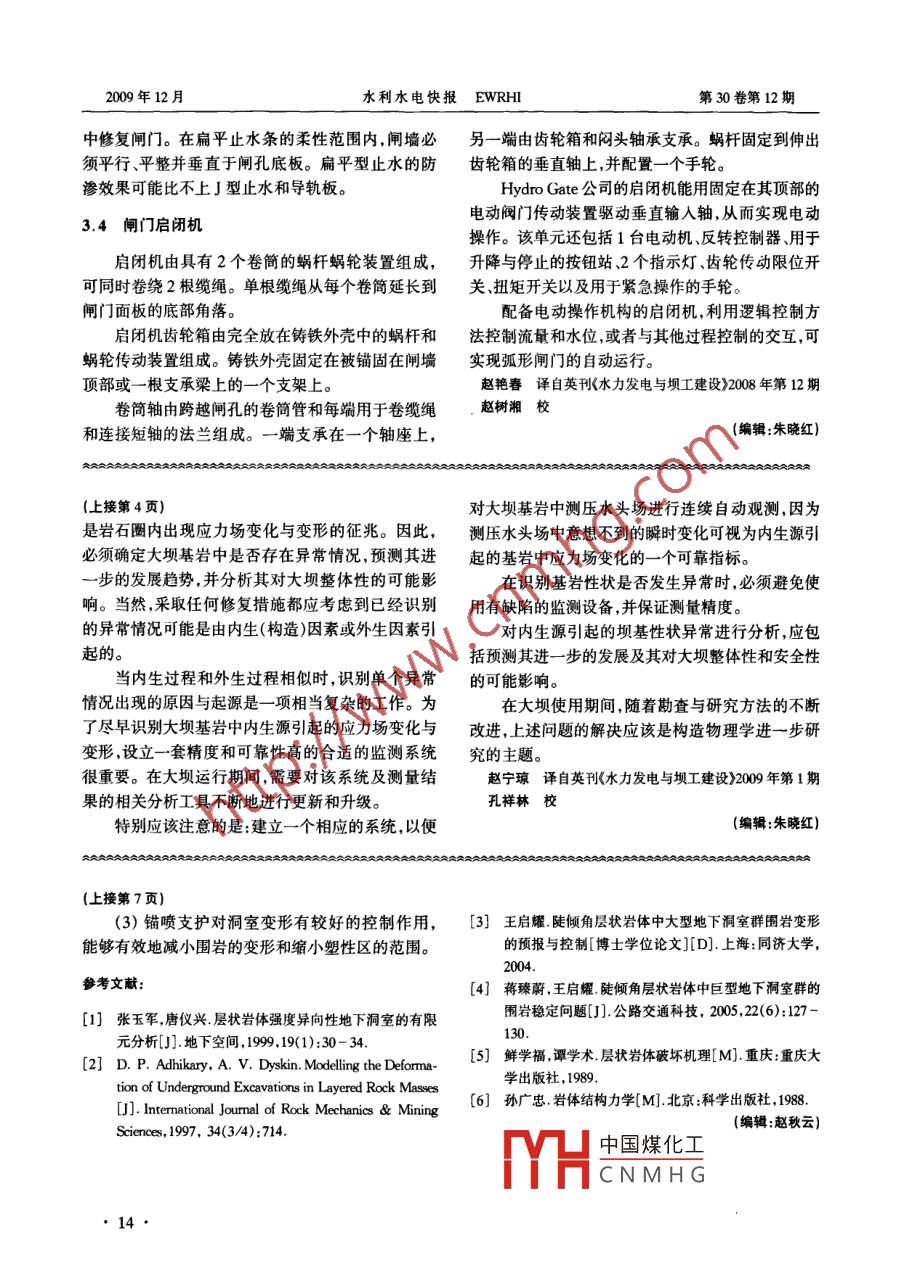 2009年12月.水利水電快報EWRHI .第30卷第12期試驗與研究文章編號: 100102009020000大壩性狀分析[塞爾維亞] B.J. 古濟納摘要:地殼的應力場變化與變形大多是由構(gòu)造活動引起的,不一定伴有表觀動態(tài)效應(即地震),并通過相互作用可能經(jīng)過壩基影響大壩。隨著大壩使用壽命的臨近,這種現(xiàn)象的發(fā)生及其對大壩性狀的累積影響變得更加可能。為了監(jiān)測大壩性狀并檢測可能存在的偏差,從設計階段開始直至整個運行期,都需要對其進行觀測。尤其是要盡早報告各種變化、確定其起源、預測其進一步的發(fā)展趨勢及其對大壩安全的影響。關鍵詞:大壩;壩變形;性能分析;應力分析中團分類號:TV698. 11文獻標識碼:A確定引起大壩性狀變化的實際原因,特別是在塊與不連續(xù)面)的特點是:具有影響地殼變形和應力早期觀測其變化,是一項極為復雜、涉及多個學科的場(即其對外生與內(nèi)生活動的響應)的地質(zhì)力學特工作。性。大壩性狀發(fā)生變化可能與以下情況有關:可以證明,地殼中表面應力場極不均勻,而且受(1)大壩和(或其基巖的物理力學性能發(fā)生了地形 溫度變化等的制約。地殼或巖石變形因荷載變化;變化產(chǎn)生的變化與基質(zhì)巖塊和一系列不連續(xù)面的變(2)巖石圈發(fā)生內(nèi)生演變過程(構(gòu)造活動),然形有關。不連續(xù)面的變形可能在兩個方向發(fā)生,或后經(jīng)過基巖傳遞到大壩。者垂直于不連續(xù)面(包括張開),或者沿不連續(xù)面可在上述兩種情況下,大壩性狀的變化或異??赡墚a(chǎn)生滑移,甚至可能兼而有之。第1種變形是垂能相似,本文對這兩個問題進行了研究。直于平面節(jié)理的應力變化的非線性函數(shù)。如果裂縫由于內(nèi)生活動引起的壩基性狀異常一般是間斷張開,巖石圈半空間就會發(fā)生局部斷裂。由于應力性發(fā)展和出現(xiàn)的,只有在大壩運行一段時期后 ,大壩變化,垂直于不連續(xù)面的應力趨于拉伸時,就會產(chǎn)生或其附屬建筑物已經(jīng)發(fā)生破壞時才能被發(fā)現(xiàn)。不連續(xù)面張開。本文旨在幫助及早發(fā)現(xiàn)和識別上述第2種現(xiàn)象地殼上部的應力場是由于重力、構(gòu)造活動以及及其對壩基性狀的影響,以及促進對監(jiān)測系統(tǒng)數(shù)據(jù)溫度變化形成的。應力場由主應力及最大主應力軌跡線表示。巖石圈內(nèi)的主應力通常隨深度的增加而解讀手段的升級和現(xiàn)代化。增大。觀測到地殼構(gòu)造活動區(qū)的應力場容易隨時間1地殼的應 力場變化與變形的變化而變化,即應力場是變化的,不受控制。某- -給定巖石圈區(qū)域發(fā)生變化的位置、范圍與速度及其本文將地殼視為- -個非均勻的半空間(或準空地質(zhì)力學特性取決于構(gòu)造活動以及外部因素的變間),將其分成若千個基質(zhì)巖塊和網(wǎng)格不連續(xù)面來進化,如土壤沖刷、石冰川巖層融化靜水壓力變化、滑行分析。不連續(xù)面主要是構(gòu)造活動和其他荷載及其坡活動、水庫蓄水等。變化產(chǎn)生的斷裂。半空間的兩個組成部分(基質(zhì)巖中國煤化工應的變形與位移收稿日期:2009-08-20FYHCNMHG2009年12月水利水電快報EWRHI .第30卷第12期(包括其上部區(qū)域)以及變形特性的潛在變化(局在非承壓含水層中,含水層內(nèi)構(gòu)造荷載的變化部)。后者可能是局部或者區(qū)域性出現(xiàn),沿不連續(xù)面引起測壓水頭梯度臨時發(fā)生變化,并導致水通過水呈均勻或不均勻分布。此外,應力場即使沒有發(fā)生力有效孔隙向自由表面流動,反之亦然。對于后一重大變化,地殼也可能產(chǎn)生位移。種情況,水的流動一直持續(xù)到在水力有效孔隙內(nèi)形應力場的變化常常是無規(guī)律的,變化強度有大成測壓水頭場的初始變化狀態(tài)。在該過程期間,最有小,不- -定產(chǎn)生察覺得到的動態(tài)效應(地震)。在后在巖石基質(zhì)中形成應力場,在節(jié)理系中形成接觸橫跨構(gòu)造驅(qū)動力軌跡線的區(qū)域內(nèi),應力場變化以及應力,其前提都是含水層的水文條件(人流量或者出伴生的變形可能是相當發(fā)散和無法預測的。流量)沒有發(fā)生變化。對于地殼上部區(qū)域的應力場變化及變形,可以測壓水頭場臨時變化的幅度與持續(xù)時間取決利用壩址地形加以調(diào)整。變化可能包括殘余應力釋于:放,伴有變形以及動態(tài)效應。內(nèi)生過程和/或外生過(1)構(gòu)造荷載變化的量級與時程;程叮能引發(fā)這些變化。(2)幾何形狀、水力特性和含水層的邊界條件;如果地殼中外部(外生)荷載的變化與構(gòu)造活動(3)節(jié)理系孔隙的變形特性。-致,其相互作用可能產(chǎn)生額外的效應。水庫蓄水如果發(fā)生地震,預計測壓水頭場的短期變化可與放空以及地下水位的大幅變動,都有可能造成沿能有所加快。由于測壓水頭場的瞬時變化,可能導不連續(xù)面的不均勻位移。沿現(xiàn)有的和新發(fā)育的不連致巖石圈產(chǎn)生額外(局部)的可恢復變形。相應位移續(xù)面無論是否產(chǎn)生不均勻位移都會使應力場發(fā)生變一直持續(xù)到測壓水頭場達到穩(wěn)定狀態(tài)以及與斷裂半化,使地殼變形,并可能伴有動態(tài)效應。在應力場不空間構(gòu)造荷載變化有關的巖石圈發(fā)生最后變形。穩(wěn)定的區(qū)域,外部(外生)荷載的變化可能產(chǎn)生