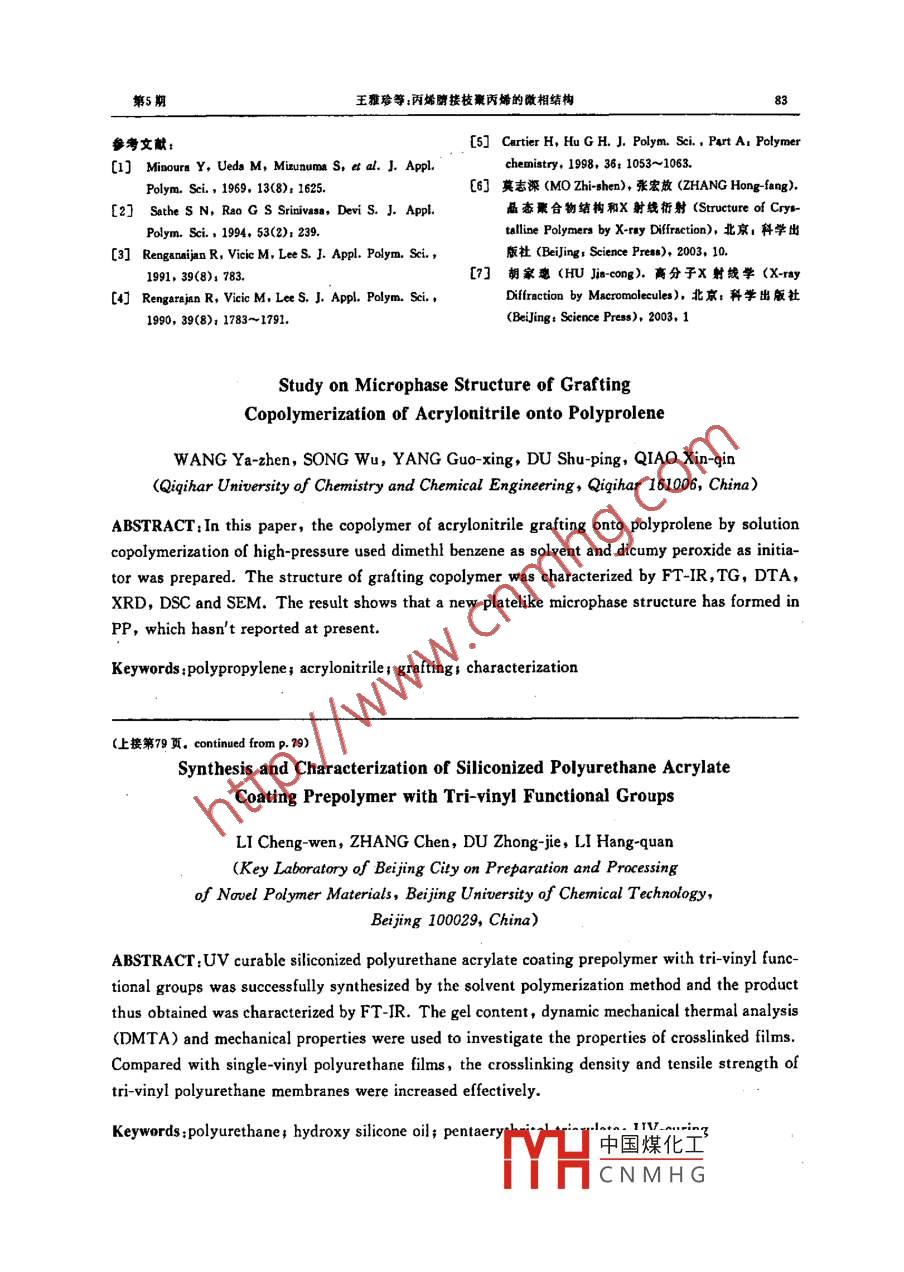 第23卷第5期高分子材料科學(xué)與工程Vol 23, No2007 4F9 POL YMER MATERIAL S SCIENCE AND ENGINEERING Sept 2007丙烯腈接枝聚丙烯的微相結(jié)構(gòu)王雅珍,宋武,楊國興,杜淑平,譙興芹(齊齊哈爾大學(xué)化學(xué)與化工學(xué)院,龍江齊齊哈爾161006)擴(kuò)要:研究了以二甲菲為溶劑,過氧化二弄丙苯DCP)為引發(fā)劑,采用高壓溶液法制備了兩烯腈-聚丙枝共聚物,用傅立葉變換紅外光譜、X射線衍射、差示掃描量熱(DSC)、掃描電子顯薇(SEM)對(duì)其結(jié)構(gòu)進(jìn)行了表征。發(fā)現(xiàn)在聚丙烯中形成了斷的片狀微相結(jié)構(gòu),此種微相結(jié)構(gòu)目前尚未見報(bào)道。關(guān)鍵調(diào):聚丙烯;丙烯腈;接枝;表征中圖分類號(hào):TQ316.343文獻(xiàn)標(biāo)識(shí)碼:A文章編號(hào):1007555(2007)05-0080-04聚丙烯(PP)是一種綜合性能優(yōu)異的熱塑純。性通用塑料,但由于PP的非極性,使其與極性1.2丙烯腈接枝聚丙烯的合成聚合物、無機(jī)填料以及增強(qiáng)性纖維之間的相容將一定量的PPAN,DCP放入500mL的性差,從而極大地阻礙了PP高性能化的進(jìn)程。反應(yīng)釜中,抽真空后采用N2保護(hù),并將釜內(nèi)升到目前為止,常用的提高聚合物改性體系相容至一定的壓力(6MPa~10MPa)和溫度(120性的方法主要是在體系中加人接枝、嵌段共聚℃~150℃),反應(yīng)一定的時(shí)間后,停止反應(yīng)靜物或低分子量化合物作相容劑。置至室溫取出樣品,過濾后浸泡N,N-二甲基甲PP的接枝改性方法主要有溶液接枝酰胺(DMF)48h沉淀抽濾,而后用丙酮沉淀48法121、熔融接枝法、固相接枝法”、輻射接枝h抽濾,再置于烘箱中加熱干燥(60℃干燥48法等。用于接枝改性的單體是一些一端帶有可h)。待完全干燥后進(jìn)行接枝率分析。與其它棗合物或無機(jī)填料、纖維表面形成作用13分離提純力較強(qiáng)的化學(xué)鍵或氫鍵的極性基團(tuán),另一端帶將一定量的 PP-g-AN接枝物置于三頸瓶有可接枝在PP上的乙烯基或不飽和鍵的低分中加入二甲苯加熱回流約40min,直至接枝物子有機(jī)化合物,可分為酸性官能團(tuán)單體、堿性官全部溶解然后快速倒入冷的過量丙酮中沉淀,能團(tuán)單體及其鹽類。沉淀一段時(shí)間后經(jīng)布氏漏斗抽濾,再真空烘干(60℃干燥48h)。1實(shí)驗(yàn)部分1.4接技率的測定1.1原料提純后的接枝物在190℃C熱壓成膜,用FT-聚丙烯(PP粉末):大慶石化總廠丙烯腈IRl型傅立葉紅外光譜儀對(duì)樣品進(jìn)行紅外光AN):天津市科密歐化學(xué)試劑開發(fā)中心,分析譜分析。以2723cm-處聚丙烯骨架的特征峰為純;丙酮:天津市凱通化學(xué)試劑有限公司,分析內(nèi)標(biāo),用AN中腈基的特征峰(23cm-)與聚純,二甲苯哈爾濱和順化工有限公司,分析純;丙烯的特征峰(2723cm-)的峰面積之比,即N,N二甲基甲酰胺(DMF):天津市科密歐化兩基團(tuán)吸光度之比(A/A2a2)表示AN接枝學(xué)試劑開發(fā)中心,分析純;過氧化二異丙苯率的相對(duì)大小。由吸光度比與絕對(duì)接枝率間的DCP):中國醫(yī)藥集團(tuán)上海化學(xué)試劑公司,化學(xué)工作曲線可得到AN的絕對(duì)接枝率,記為G。M凵中國煤化工收稹日期:2006-06-05;修訂日期:2006-09-21CNMHG聯(lián)系人:王雅珍,主要從事聚合物材料的功能化和聚合物改性的研究, E-mail, wyz6166@163,com第5期王雅珍等丙烯腐接枝聚丙烯的微相結(jié)構(gòu)811.5接枝物的紅外光譜表征共聚物經(jīng)過浸泡NN-二甲基甲酰胺(DMF)和將純PP和純化后 PP-g-AN的接技物分別丙酮已經(jīng)完全除去了聚丙烯腈和其它的共聚熔融壓制成膜,用美國 Perkin Elmer公司的物,因此通過上述分析完全可以判斷AN已經(jīng)FTIR01型傅立葉紅外光譜儀進(jìn)行測定。接枝到PP上,形成了 PP-g-AN接枝物共聚物。1.6X射線衍射分析2.2x射線衍射分析將純PP和純化后 PP-g-AN的接枝物分別由Fig,2中PP的X射線衍射可見衍射角研磨成適當(dāng)粒度的粉末,用北京大學(xué)儀器廠的為5.47°,9.68°,13.97和16.7附近為間規(guī)立構(gòu)BDX3200型X射線射儀,在管壓為35kV以rPP晶型的衍射峰特別是衍射角度為1397°Cu做陽極靶經(jīng)N濾波掃速為4/min的條件和16,7附近為間規(guī)立構(gòu)rPP晶型的正交晶系下進(jìn)行測定(晶胞參數(shù)為a=1.45mm,b=0.58mm,c=1.7差示掃描量熱(DSC)分析0.74nm)的111和008晶面的特征衍射峰將純PP和純化后 PP-g-AN的接枝物分別Fg3為純化后 PP-g-AN接枝共聚物的X研磨成適當(dāng)粒度的粉末用德國 Netzsch公司射線術(shù)射圖由Fig3可見除了射角在5.47°,的Dsc204F1進(jìn)行測試,升溫速度為10℃/9.68°,1397°和16.7附近出現(xiàn)rPP的衍射峰,min的條件下進(jìn)行測定。且衍射角16.7°的術(shù)射強(qiáng)度減弱,表明rPP的1.8掃描電子顯微鏡(SEM)分析結(jié)晶區(qū)域減小結(jié)晶度有所降低并且在衍射角用日本電子的sM-560LV型掃描電子顯1843°和21.64°也出現(xiàn)衍射峰,為AN的010和微鏡(SEM對(duì)純PP和純化后 PP-g-AN的接枝物進(jìn)行測試,加速電壓為10kV記錄不同分辨率的電子照片l67.6414591367:842H(128385Fig 2 XRD spectra of PP4000.030002000150010u400.0Fie.1 FT-IR spectra of PP and PP-g-AN2結(jié)果與討論21紅外譜圖Fig.1給出了PP及 PP-g-AN接枝物共聚物的傅立葉紅外光譜圖,其中PP譜線上31005105202530354045555cm1~2700cm-范圍內(nèi),最大值位于2920cm-附近的波峰歸因于CH3和CH2中C一H的Fig 3 XRD spectra of PP-g-AN伸縮振動(dòng)。發(fā)生在1459cm-1,1376cm-1,1167300晶面的特征術(shù)射峰,表明AN接枝