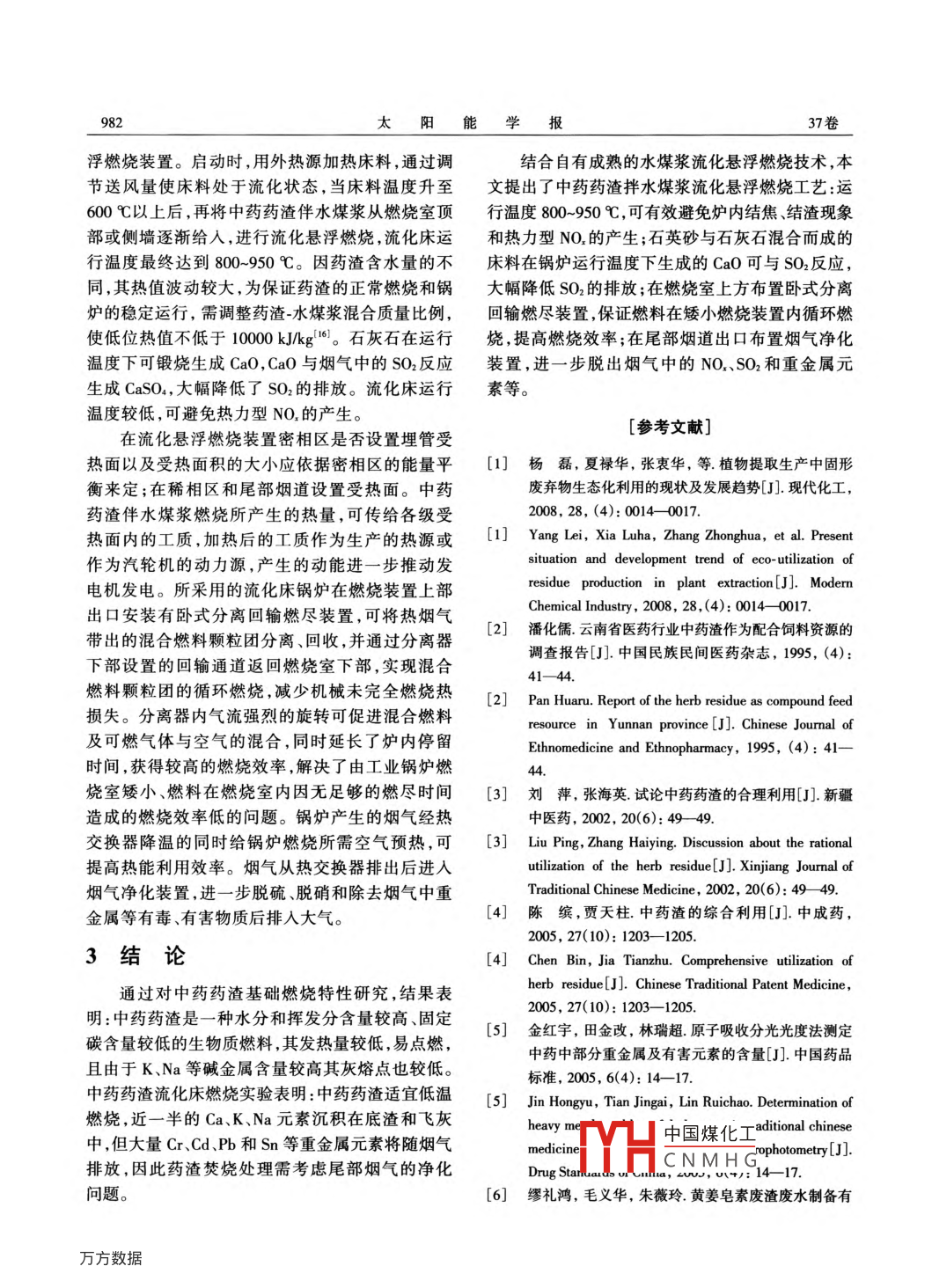 第37卷第4期太陽能學(xué)報Vol. 37. No 4016年4月ACTA ENERGIAE SOLARIS SINICAApr,2016文章編號:02540096(2016)040979-06中藥藥渣拌水煤漿混燒工藝研究毛宏雷,韓向新,嚴(yán)君偉,劉建國,姜秀民(上海交通大學(xué)機(jī)械與動力工程學(xué)院,上海200240)摘要:以某藥廠實際生產(chǎn)過程中采集的中藥藥渣廢棄物樣品為研究對象,通過實驗分析的方法,結(jié)合自有成熟的水煤漿流化懸浮燃燒技術(shù),分析中藥藥渣拌水煤漿混合燃燒處理工藝的可行性。研究結(jié)果表明:中藥藥渣為高水分、高可燃揮發(fā)分、低熱值、低灰熔點的固體廢棄物。拌水煤漿流化懸浮混合燃燒處理工藝可使中藥藥渣在進(jìn)行無害化處理的同時進(jìn)一步利用其中潛在的能量。低溫燃燒可有效避免結(jié)焦和熱力型NO,產(chǎn)生,可有效控制SO2的排放,具有處理量大、處理中藥藥渣的種類范圍廣、能量合理回收利用等優(yōu)點關(guān)鍵詞:中藥;植物藥;中藥藥渣;水煤漿;流化床鍋爐中圖分類號:TQ546.2文獻(xiàn)標(biāo)識碼:A0引言水沖淋后會污染堆放處周圍的環(huán)境。焚燒法是解決大量中藥藥渣最可行的方法。但目前植物中藥生產(chǎn)伴隨著大量中藥藥渣的產(chǎn)生。據(jù)統(tǒng)提取后的固體廢棄物投入轉(zhuǎn)窯焚燒爐直接燃燒計,中國每年產(chǎn)生的含水分植物類中藥藥渣可達(dá)數(shù)存在中藥藥渣燃燒不充分、效率低等問題。為解百萬噸2),這些中藥藥渣含水量較高且含有一些營決以上問題,本文考慮將中藥藥渣作為燃料與水養(yǎng)物質(zhì)4,極易腐敗并引發(fā)蚊蟲滋生,成為多種傳煤漿混合投入流化床鍋爐中進(jìn)行燃燒處理,在對染病的溫床,加之一些中藥藥渣含有有毒重金屬,其進(jìn)行無害化處理的同時進(jìn)一步利用其潛在的如不妥善處理,會對土壤和水源造成極大破壞。能量。在實際生產(chǎn)過程中,我國中成藥生產(chǎn)表現(xiàn)出生產(chǎn)地區(qū)相對集中的特點,如圖1所示,產(chǎn)地主要集1中藥藥渣燃燒特性中在華中和東北地區(qū),這兩個地區(qū)產(chǎn)量合計超過全11工業(yè)分析、元素分析和發(fā)熱量測定國總產(chǎn)量的50%。目前中藥藥渣處理的形式主要包括填埋、焚燒、固定區(qū)域堆放等,其中堆放為主要為合理確定中藥藥渣廢棄物燃燒處理裝置的運行參數(shù),首先需了解該廢棄物的一些基本特性形式6。由于中藥藥渣多堆放在田地、山區(qū),受雨包括工業(yè)分析、元素分析和發(fā)熱量測定等。本文以某藥廠實際生產(chǎn)過程中采集得到的中藥藥渣廢棄口華中29團(tuán)東北23%物樣品為研究對象,并將其與其他中藥藥渣進(jìn)行□西南18%比較。圓華南13%利用碳?xì)錅y定儀、氮測定蒸餾裝置和硫測定裝華東12%目華北3%置按照GBT476008和GBT242007標(biāo)準(zhǔn)對曰西北2%中藥藥渣樣品進(jìn)行元素分析測定樣品中C、H、N、S圖1中藥生產(chǎn)分布圖的質(zhì)量含量;利用恒溫式氧彈量熱法發(fā)熱量測定裝Fig. 1 The distribution of herb production置按照GBT213-2003標(biāo)準(zhǔn)對樣品的發(fā)熱量進(jìn)行v凵中國煤化工收稿日期:201404-11CNMHG通信作者:韓向新(1974—),男,博士、副教授,主要從事油頁巖、工業(yè)有機(jī)廢棄物綜合利用與流化床燃燒技術(shù)開發(fā)方面的研究。980太陽能學(xué)報37卷測定。根據(jù)收到樣品全水分含量和干燥后樣品的的收到基結(jié)果。按照國標(biāo)測定的工業(yè)分析、元素分測試結(jié)果將上述干燥基測試結(jié)果換算成含全水分析和發(fā)熱量分析結(jié)果參見表1。表1藥渣的工業(yè)分析發(fā)熱量分析和元素分析Table 1 The ultimate analysis, heat analysis and proximate analysis of the herb residue工業(yè)分析%,wt元素分析低位發(fā)熱量名稱M v A FC [C] [H] [O] [N] [S] [H/C] Qn/kJ.kg收到基6740196411511.4414571.844.200.430.051.52361560空氣干燥基180591734694.3543.8955512651.280.141.521670540丹參中藥藥渣空氣干燥基3.6274211.0221.1543.3158444.151.780.281.62兩面針中藥藥渣空氣干燥基’71198242691152042254703834050161.33注:1.通過差減法得到;2.原子比。據(jù)上述實驗結(jié)果,該中藥藥渣含水量很高,約升至1050℃時樣品體積已明顯收縮,但形狀未發(fā)生為70%。中藥藥渣樣品中的揮發(fā)分較一般生物質(zhì)顯著變化;試樣冷卻后,發(fā)現(xiàn)試樣顆粒變硬且不易低且灰分較高,加上其較高的水分含量,使其發(fā)熱破碎。據(jù)此可判斷出藥渣熔點應(yīng)高于1050℃,但不量比一般生物質(zhì)低,該中藥藥渣收到基低位發(fā)熱量會過高,因此燃燒該類藥渣的燃燒溫度應(yīng)盡量控制約為標(biāo)煤的124%。對于空氣干燥基,從實驗結(jié)果在950℃以下,以免產(chǎn)生結(jié)焦。和參考文獻(xiàn)[7,8]中所列的數(shù)據(jù)較易得出,揮發(fā)分所占比例較高,為主要可燃物類型。而從元素分析13流化床燃燒實驗來看,中藥藥渣樣品成分主要由C、H、O這3種元為考察灰渣中重金屬元素對環(huán)境的影響需對中素組成,以C元素含量最高。HC原子比較高,著藥藥渣原樣和燃燒后灰分的重金屬元素含量進(jìn)行火容易,N和S含量較低。測定。流化床燃燒實驗在如圖3所示的小型流化1.2熱顯微鏡實驗床實驗臺系統(tǒng)上進(jìn)行。首先將小塊狀的空氣干燥利用德國 LeitzⅡ-A型熱顯微鏡對制作成標(biāo)準(zhǔn)基中藥藥渣破碎成一定粒徑范圍的樣品;再向小型試樣的樣品進(jìn)行測定。