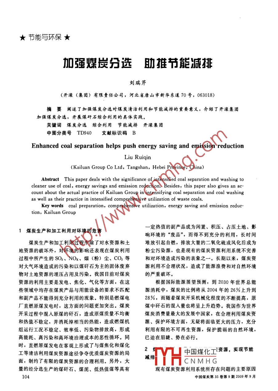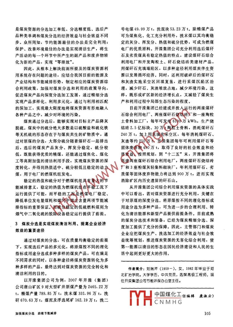 ★節(jié)能與環(huán)?!锛訌?qiáng)煤炭分選助推節(jié)能減排劉瑞芹(開灤(集團(tuán))有限責(zé)任公司,河北省唐山市新華東道70號,063018)摘要闡述了加強(qiáng)煤炭分選對煤炭清潔利用和節(jié)能減排的重要意義,介紹了開灤集團(tuán)加強(qiáng)煤炭分選,開展煤矸石綜合利用的具體實(shí)踐。關(guān)鍵詞煤炭分選 綜合利用 .節(jié)能減排開灤集團(tuán)中圖分類號TD940文獻(xiàn)標(biāo)識(shí)碼BEnhanced coal separation helps push energy saving and emission reductionLiu Ruiqin(Kailuan Group Co Ltd, Tangshan, Hebei Province, China)Abstract This paper deals with the significance of intensified coal separation and washing tocleaner use of coal, energy savings and emission reduction. Besides, this paper also gives an ac-count about the actual practice of Kailuan Group in intensifying coal separation and coal washingas well as their practice in intensified comprehensive utilization of waste coals.Key words coal preparation, comprehensive utilization, energy saving and emission reduc-tion, Kailuan Group一定熱值的副產(chǎn)品成為閑置、積壓、占壓土地、影1煤炭生產(chǎn)和加工利用對環(huán)境的危害響環(huán)境的“廢品”, 而得不到充分的利用,長時(shí)間煤炭生產(chǎn)和加工利用過程中除了對水資源和土堆放引起自燃,排放大量的二氧化硫或風(fēng)化后成為地資源的破壞外,對環(huán)境的影響還表現(xiàn)在煤炭利用粉塵污染源,也是現(xiàn)有的煤炭資源利用系統(tǒng)不完善過程中所產(chǎn)生的SO2、NOx.煙(粉)塵、CO2等和對環(huán)境造成污染的表象之一。長期以來,煤炭資對大氣環(huán)境造成的污染和以煤矸石為主的固體廢棄源利用不合理狀況,造成了能源浪費(fèi)和對自然環(huán)境物對土地資源的埋壓占用及污染。我國目前對煤炭的嚴(yán)重破壞。資源的利用主要是發(fā)電、焦化、氣化等方面,在這根據(jù)國際能源展望預(yù)測,到2030年世界總能些領(lǐng)域中均存在煤炭產(chǎn)品與用能設(shè)備的要求不匹配源消耗中,煤炭的比例將從2004年的26%上升到和副產(chǎn)品不能得到充分利用的現(xiàn)象。特別是燃煤電28%,而隨著煤炭開采機(jī)械化程度的不斷提高,原廠直燃原煤發(fā)電時(shí),這方面的問題更加突出。煤炭煤中矸石的混入量也將呈上升趨勢。我國作為世界開采過程中混入原煤的矸石,造成原煤質(zhì)量不均衡煤炭消費(fèi)量最大的發(fā)展中國家,在合理利用煤炭資和熱值不穩(wěn)定,并消耗掉相當(dāng)?shù)臒崮埽斐扇济簷C(jī)源、保護(hù)環(huán)境方面,無疑將面臨更大的壓力,充分組運(yùn)行工況不穩(wěn)定、效率低、污染物排放高,形成利用有限的不可再生資源,保護(hù)脆弱的自然環(huán)境,高能耗、高污染和高環(huán)境治理成本的惡性循環(huán)。同已迫在眉睫、勢在必行。時(shí),直燃原煤發(fā)電在客觀上形成了與煤焦化和煤化工等清潔利用煤炭資源途徑爭奪優(yōu)質(zhì)煤炭資源的局減排中國煤化工資源,實(shí)現(xiàn)節(jié)能面,制約了有限的煤炭資源的合理利用。另外,大TYHCNMHG量的經(jīng)分選生產(chǎn)的煤矸石、煤泥、低熱值煤等具有現(xiàn)有煤炭資源利用系統(tǒng)所存在問題的主要原因104中國煤炭第35卷第9期2009年9月是煤炭資源的分選加工率低、分選精度低、選后產(chǎn)號電煤49.99萬t,洗混塊53. 23萬t。除精煤產(chǎn)品品種類單調(diào)和煤炭分選的經(jīng)濟(jì)效益與社會(huì)效益不同可為煤焦化、化工充分利用外,洗末煤以其均衡穩(wěn)步。眾所周知,節(jié)約能源最佳的辦法是完全利用;定的灰分、揮發(fā)分、熱值和硫分優(yōu)勢,可成為燃煤保護(hù)、改善環(huán)境最佳的辦法是實(shí)現(xiàn)清潔生產(chǎn),將生電廠的優(yōu)質(zhì)原料。開灤集團(tuán)公司充分利用選后煤矸產(chǎn)活動(dòng)的每一個(gè)環(huán)節(jié)中所產(chǎn)生的副產(chǎn)品和廢棄物轉(zhuǎn)石及劣質(zhì)煤具有穩(wěn)定熱值的特點(diǎn),建設(shè)煤矸石綜合.化為新的產(chǎn)品,實(shí)現(xiàn)“零排放”。利用電廠和開發(fā)陶粒土、矸石燒結(jié)磚類建材產(chǎn)品,因此,從根本.上解決前面所提及的煤炭資源利用煤矸石充填塌陷區(qū),以多種途徑利用煤炭伴生資用系統(tǒng)存在問題的途徑,應(yīng)結(jié)合我國目前的能源及源以發(fā)展循環(huán)經(jīng)濟(jì)。同時(shí),還利用破碎后的煤矸石產(chǎn)業(yè)結(jié)構(gòu)和節(jié)能減排形勢,制定相應(yīng)的煤炭資源綜和灰渣實(shí)施采空區(qū)回填復(fù)墾,進(jìn)行采煤沉陷區(qū)治合利用政策,加強(qiáng)對煤炭分選和利用的政策導(dǎo)向,理,減少研石、灰渣堆放占地,減少環(huán)境污染。這促進(jìn)煤炭產(chǎn)品向深度分選加工發(fā)展,通過精細(xì)分選樣,既形成礦區(qū)新的經(jīng)濟(jì)增長點(diǎn),又減輕了煤炭生實(shí)現(xiàn)產(chǎn)品多樣化、利用多元化,通過與利用相匹配產(chǎn)和利用過程中局部生態(tài)污染的程度。的深加工,實(shí)現(xiàn)最大限度地將煤炭資源有形地融人目前開灤集團(tuán)已經(jīng)建成并投入運(yùn)行的兩座煤矸各種產(chǎn)品之中,減少對環(huán)境的污染。石綜合利用電廠、兩座煤矸石燒結(jié)磚廠和一座陶粒煤炭通過分選后,能夠?qū)崿F(xiàn)對目標(biāo)主產(chǎn)品降灰土骨料加工廠,每年可發(fā)電6100萬kWh,生產(chǎn)燒脫硫。煤炭中的