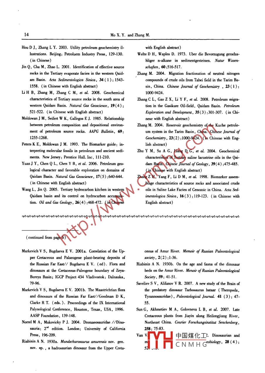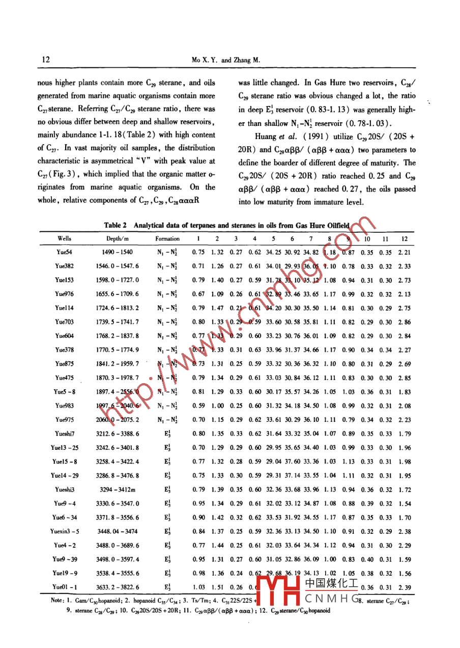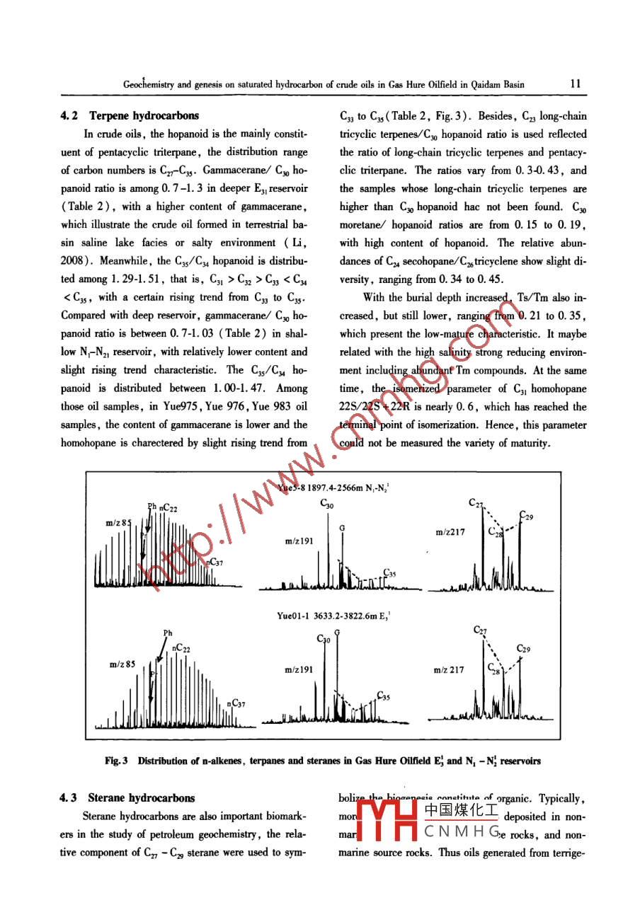 Global Geology, 14(1): 7-14(2011)10.3969/isn16739736.2011.01.02Article Il:16739736(201l)01-0007-0Geochemistry and genesis on saturated hydrocarbonof crude oils in Gas Hure Oilfield in Qaidam BasinMO Xiaoye and ZHANG Min1. Department of Geochemistry, Yangtze University, Jingzhou 434023, Hubei, China2. Key Laboratory of Exploration Technologies for Oil and Gas Resources, Ministry of Education, Yangtze UniversityJingzhou 434023, Hubei, ChinaAbstract: Gas Hure Oilfield is the biggest one in the Qaidam Basin, Through intensive sampling and GC-MS a-alysis, the authors analyzed the geochemical characteristics of the crude oils in the Gas Hure Oilfield. The re-sults show that the crude oils have even-odd carbon predominance for n-alkanes. In shallow reservoir, part ofcrude oils suffered biogenic degradation. As for normal oils, they have low Pr/Ph ratios with abundant gammatrane and Cas homohopane, which indicate that the crude oils are formed in strong reducing salt water environ-ment. Compared deep(E])reservoir with shallow(N, -N2)reservoir, the ancient salinity of sedimentary environment of N- N; crude oils is slightly higher than that of E]crude oils; the C2/C* ratios of crude oils are1. 02-1. 71 with a higher abundance of Cz7 sterane, which shows that their mainly origin matrix are bacteria andalgae; the C2g sterane 20S/(20S+20R)is generally low, the ratio in deep E;reservoir distributes between 0. 31and 0. 40, but in shallow reservoir is relatively low with 0. 29-0. 36. At the same time, Czg sterane aBB/(aBB+aaa)and Ts/Tm both are extremely lower. All the above show that the crude oils in gas hure are mainly lowmature oils, although the maturity of deep reservoir crude oils is slightly higher than shallow oneKey words: Qaidam Basin; Gas Hure Oilfield; crude oil; saturated hydrocarbon; geochemical characteristics1 Introductionsource rocks and crude oils from Qaidam Basin havebeen reported( Zhu, 2004; Huang, 1989, 1991The biomarkers analysis of saturated hydrZhang, 2004; Zhang, 2008; Li, 2008). Under thisfraction is the essential study area in oil-gas geochemcircumstances, the biomarkers study of oil samples isistry, which refers to many kinds of compounneeded more analysis resources to enrich it. Based onrated hydrocarbon fraction is one of the important the results of previous studies, the purpose of thischemical compositions in crude oils and source rocks, study is to analyze the distribution characteristics andcompositional diversities of saturated hydrocarbons indepositional environments, source input, and thermal Qaidam oils from saline lacustrine depositional envi-naturity, oil-source rock correlations. Qaidam Basin ronments. Focusing on the different series of biomarkis one of the most important oil fields in northwestern ers in saturated hydrocarbon, the 25 oil samples wereChina, representing saline lacustrine depositional en-the nomnneitional charractenstcsvironments. Many studies of saturated hydrocarbons in中國煤化工to provide clues toCNMHGReceived 12 December 2010, accepted 11 January 2011ported by the National Natural Science Foundation of China( No. 40973041)Mo x.y and Zhang mthe genetic classification of oilsblock is east-west trend. Based on acquainting thecharacteristics of Tertiary strata saline lake faces2 Geological settingChen et al., 2006; Zhu et al., 2004: Wang et alower Oligocene reservoirs of this basin were de- 2005: Huang et al., 1989; Jin et al., 2001), 25posited in high calcium-polyhaline interior lake de- crude oil samples from two reservoirs were well septrital sedimentary under the dry climates. Gas Hure rated and analyzed by column chromatography andoilfield, located in the east of Gas Hure Lake, deposit GC-MS. This paper will further figure out the geohuge Tertiary System strata( Zhang et al., 2008; chemistry characteristics of saturated hydrocarbon andYuan et al., 2006), which is the most oil and gas aGas Hure oilfield combined its geo-bundance zone in western Qaidam Basin with high relogical background and analysis resultsserves and yIIt formed deep(Ey)eservoirand shallow(N,-N, )reservoir( Fig. 1). Deep El 3 Samples and methodsreservoir is a well-structured program, anticline struc-Oil samples(25)were used in this study. Afterture by nearly north-south axis, with even axial re- collecting, those oil samples were carried back to lagion, asymmetry flanks, widely gradient eastern side boratory and kept at low temperature. Oil samplesnd narrowly precipitous western side. The shallow Nwere isolated by chromatogram and mass spectrumN; reservoir structure was divided into upper andChromatogram and mass spectrum conditionsdown two parts by Youshashan Fault. Down-dip block The equipment is HP6890GC/5973MSD GC-Ms ap-has remarkable inheritances and tectonic axis with paratus, HP-5 MS (30 m x0. 25 mm x 0. 25 um)north-south trend. whose structural feature is familiarcapillary column. Temperature-programmed of saturat-with the E)reservoir; the tectonic axis of upper-faulted ed hydrocarbon as follow: keeping the temperature atNShizigeFaultstructural belttarget zoBeiwustYuejinOilfield D]target zoneFig 1 Structural geographic location of Gas HrHH中國煤化工CNMHGGeochemistry and genesis on saturated hydrocarbon of crude oils in Gas Hure Oilfield in Qaidam Basin50C for 2 min, then the heating rate from 50C to immature-low mature oil or source rocks in saline la-100℃is20℃/min,foml00℃to310eis3℃/ custine facies show an even carbon number predormin, finally keeping it at 310C for 15.5 min. The nance(Zhang, 1998). The distribution characteris-injector temperature is 300, He as carrier gas, flow tics of n-alkanes in this region show predominance inrate at 1. 04 ml/ min, the m/e range of 50-550 Amu. low carbon number. The CM/Cn ratios are from 1. 02Detection method is multiple ion scan, ionizing power to 1. 71 (Table 1), which reflected that the sourceis 70 evmaterial comes from the homoneneae aquatic organism4 Results and discussion( Welte, 1973 ) Compared with i