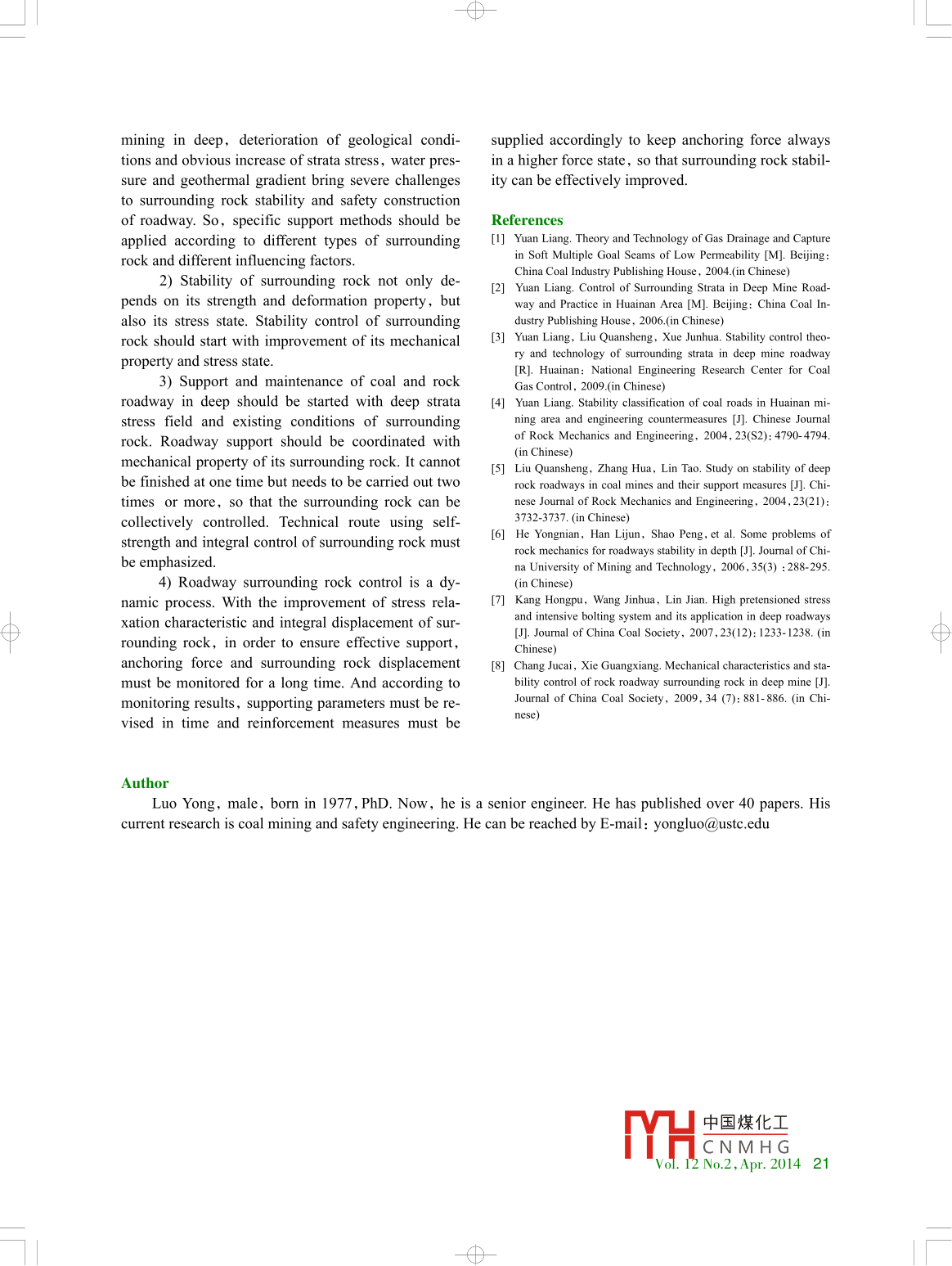 Experimental study on stability controltechnology of surrounding rock ofdeep roadways in coal mineLuo Yong,.Yuan liang,. Yang Yang(l. National Engineering Research Center for Coal Gas Control, Huainan, Anhui 232001, China2. Huainan Mining( Group)Co Ltd, Huainan, Anhui 232001, China)Abstract: In order to solve effectively the problems of deep mining with safety and high efficiency, the multiple factors influencing the stability of deep rock roadway and technical problems are analyzed in the light of thesevere situation of effective mining for deep coal resource, and the stability control methods for deep rock roadway are provided, which are based on the idea of combined support with separated steps and integral control ofsurrounding rock of deep rock roadway. The suggested methods were applied to a deep rock roadway with-648 mdepth in Gubei coal mine of Huainan area. The field test was carried out and the in-situ monitoring was implemented, and the support scheme was optimized and adjusted to improve the stability of the surrounding rock ofthe roadway based on the feedback analysis. The results showed that the stability can be improved greatly by theprovided control methods for deep roadway. The present methods for stability control of deep rock roadway canbe used to other deep rock roadways with the similar conditionsKey words deep rock roadway; mining with safety and high efficiency: stability; in-situ monitoring; softrock1 Introductioncreep; outstanding phenomena of dilatancy arshown as internal joints, fractures, cracks and theirwith the development of coal mine production, opening under high deviatoric stress; the concussioncoal resources in shallow are gradually exhausted and of coal and rock deformation is displayed as suddenthe inevitable trend of coal extraction is to stretch to and sharp increase in the course of deformation indeep. At present, the major countries of coal produc- stead of continuous and gradual deformation. Accor-tion in the world have successively gone into deep ex- ding to the actual mining practices at home andtraction, such as England, Japan and poland, etc.abroad, once the mining depth reaches 700 m toThe mining depths of these countries reach 1 1001 000 m, obvious characteristics of deep mining willto 1 400 m In Germany, the mining depth is general- be presentedly between 700 m and 1 500 m, and the averageDeep mining environment and the deformationdepth is close to 930 m. The mining depth of many behavior of coal and rock bring a series of severe chalmining areas in our country had already exceeded lenges to surrounding rock control and mining safety800 m, even some were over 1 000 m. Compared to Theoretical researches and practices indicate that thethose in shallow, the deformation characteristics of load of support in deep roadway is related to self-loadcoal and rock in deep change radically as followcapacity and released expansion energy of surrounBrittleness in shallow is transformed into plasticity in ding rock. The stronger the latter two influence facdeep; strong time effect of coal and rock under tors are, the smaller support load and the easier road-highstrata stress is presented as obvious rheology or way support are. But the contradiction between sur-Received 11 January 2013中國煤化工CNMHG12 ENGINEERING SCIENCErounding rock self-load capacity and released expan- size and the direction of ground stress have a directsion energy is that they cannot reach their maximum impact on roadway section optimization, roadway po-ly. In deep roadway, a large sition selection, support scheme, supporting parameamount of expansion energy at the beginning of road- ter design, etc. In particular, horizontal stress has anway excavation must be released in some ways. It cer- important impact on the stability of roadway surtainly will cause the strength of surrounding rock to rounding rock Because underground rock is not ondecrease rapidly if it is uncontrolled, which goes ly influenced by gravity but also affected by geologiagainst roadway maintenancecal structure movement the direction of maximumHuainan mining area, in which geological corstress is consistent with the stress direction in generalditions are very complicated, is characterized by frac- which is revealed by geological structure movementtrajectod stressconcentration stress caused by mining can reach 2- field of the coal and rock must be grasped by field5 times of original rock stress. The scope of fracture tests and other research means before the design ofzone and plastic zone of roadway surrounding rock roadway direction, shape and supporting parametersusually reaches 3-5 m, and roadway will be serious- With the development of mining depth, geological enly damaged by high stress and roadway maintenance vironment deteriorates, cracked rock increasesvery difficult. So it is the typical represd stress upind inflsoft strata mining area in our country. In Huwater increase, and ground temperature also rises. Soarea, based on introducing and employing ad- a series of severe challenges will be encountered fored foreign technologies, technical route for sudeep coal mining 2.3)rounding rock overall control by rock self-strengthFirst of all, because of ground stress increaand pre-stress truss support in"wedge-shaped rein- strength and deformation characteristics of surroun-proposed, and a series of support ding rocks in deep are vastly different fromtechnical systems with independent intellectual prop- shallow, and most surrounding rocks in shallow areerty right, which can be applied to different types of in elastic state. After mining in deep due to the seriroadways, are successfully developed, such as high ous contradiction between high ground stress and lowpretension steel strand truss support technology, small self-strength of surrounding rocks, high stress con-aperture steel strand pretension cable beam technolo- centration, which is caused by secondary stress fieldleads to the result that thehigh stres
