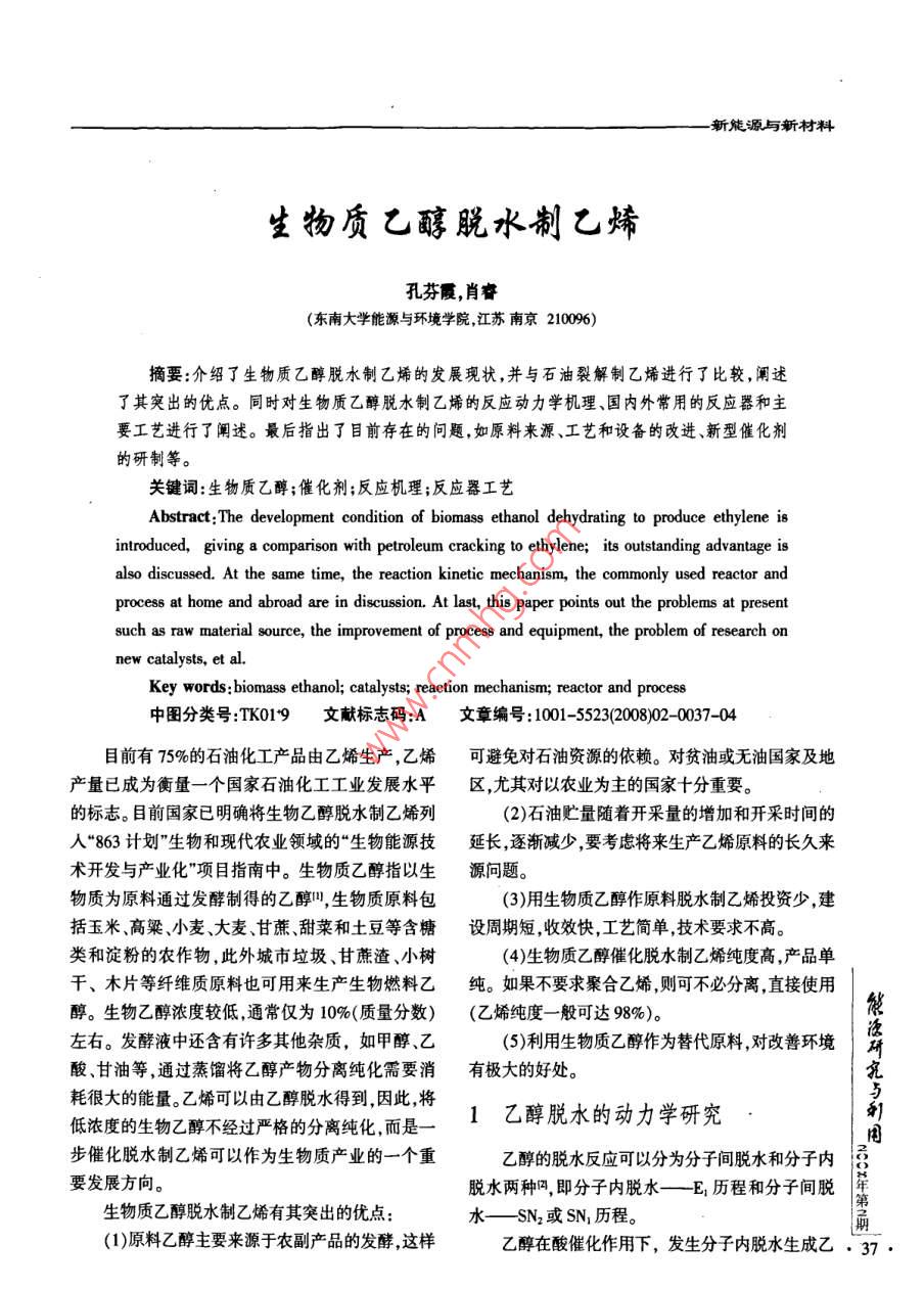 新能源與新材料生物質(zhì)乙醇脫水制乙烯孔芬霞肖睿(東南大學(xué)能源與環(huán)境學(xué)院江蘇南京210096)摘要:介紹了生物質(zhì)乙醇脫水制乙烯的發(fā)展現(xiàn)狀,并與石油裂解制乙烯進(jìn)行了比較,闡述了其突出的優(yōu)點(diǎn)。同時(shí)對(duì)生物質(zhì)乙醇脫水制乙烯的反應(yīng)動(dòng)力學(xué)機(jī)理、國(guó)內(nèi)外常用的反應(yīng)器和主要工藝進(jìn)行了闡述。最后指出了目前存在的問(wèn)題,如原料來(lái)源、工藝和設(shè)備的改進(jìn)、新型催化劑的研制等。關(guān)鍵詞:生物質(zhì)乙醇;催化劑;反應(yīng)機(jī)理;反應(yīng)器工藝Abstract: The development condition of biomass ethanol dehydrating to produce ethylene isintroduced, giving a comparison with petroleum cracking to ethylene; its outstanding advantage isalso discussed. At the same time the reaction kinetic mechanism, the commonly used reactor andprocess at home and abroad are in discussion. At last, this paper points out the problems at presentsuch as raw material source, the improvement of process and equipment, the problem of research onnew catalysts, et al.Key words: biomass ethanol; catalysts; reaction mechanism; reactor and process中圖分類(lèi)號(hào):TK019文獻(xiàn)標(biāo)志碼:A文章編號(hào):1001-55232008)02-0037-04目前有75%的石油化工產(chǎn)品由乙烯生產(chǎn),乙烯可避免對(duì)石油資源的依賴。對(duì)貧油或無(wú)油國(guó)家及地產(chǎn)量已成為衡量一個(gè)國(guó)家石油化工工業(yè)發(fā)展水平區(qū),尤其對(duì)以農(nóng)業(yè)為主的國(guó)家十分重要。的標(biāo)志。目前國(guó)家已明確將生物乙醇脫水制乙烯列(2)石油貯量隨著開(kāi)采量的增加和開(kāi)采時(shí)間的入“863計(jì)劃”生物和現(xiàn)代農(nóng)業(yè)領(lǐng)域的“生物能源技延長(zhǎng)逐漸減少,要考慮將來(lái)生產(chǎn)乙烯原料的長(zhǎng)久來(lái)術(shù)開(kāi)發(fā)與產(chǎn)業(yè)化"項(xiàng)目指南中。生物質(zhì)乙醇指以生源問(wèn)題。物質(zhì)為原料通過(guò)發(fā)酵制得的乙醇叫,生物質(zhì)原料包(3)用生物質(zhì)乙醇作原料脫水制乙烯投資少,建括玉米、高粱、小麥、大麥、甘蔗、甜菜和土豆等含糖設(shè)周期短,收效快,工藝簡(jiǎn)單技術(shù)要求不高。類(lèi)和淀粉的農(nóng)作物,此外城市垃圾、甘蔗渣、小樹(shù)(4)生物質(zhì)乙醇催化脫水制乙烯純度高,產(chǎn)品單干、木片等纖維質(zhì)原料也可用來(lái)生產(chǎn)生物燃料乙純。如果不要求聚合乙烯則可不必分離,直接使用醇。生物乙醇濃度較低,通常僅為10%(質(zhì)量分?jǐn)?shù))(乙烯純度一般可達(dá)98%)。左右。發(fā)酵液中還含有許多其他雜質(zhì),如甲醇、乙(5)利用生物質(zhì)乙醇作為替代原料對(duì)改善環(huán)境便酸、甘油等,通過(guò)蒸餾將乙醇產(chǎn)物分離純化需要消有極大的好處。耗很大的能量。乙烯可以由乙醇脫水得到,因此將低濃度的生物乙醇不經(jīng)過(guò)嚴(yán)格的分離純化,而是1乙醇脫水的動(dòng)力學(xué)研究次研究與用步催化脫水制乙烯可以作為生物質(zhì)產(chǎn)業(yè)的一個(gè)重乙醇的脫水反應(yīng)可以分為分子間脫水和分子內(nèi)要發(fā)展方向。脫水兩種,即分子內(nèi)脫水—E1歷程和分子間脫生物質(zhì)乙醇脫水制乙烯有其突出的優(yōu)點(diǎn)水—SN2或SN1歷程(1)原料乙醇主要來(lái)源于農(nóng)副產(chǎn)品的發(fā)酵這樣乙醇在酸催化作用下,發(fā)生分子內(nèi)脫水生成乙,37孔謄霞,生物質(zhì)乙醇水制乙烯新能源與新村料烯的反應(yīng)屬于E1消除反應(yīng)歷程,反應(yīng)機(jī)理可用下式催化劑提出乙醇脫水反應(yīng)屬于平行反應(yīng),會(huì)生成乙示氧基這一中間產(chǎn)物; Junko n Kondo等利用原為紅CH, CH2 0H+H*++CHCH OH,(1)外檢測(cè)也證實(shí)了在反應(yīng)過(guò)程中乙氧基這一中間產(chǎn)物的存在;河北工業(yè)大學(xué)的劉雁等利用序貫?zāi)K法CH, CH,OH2*-+CH3CHr+H,0(2)對(duì)乙醇脫水反應(yīng)的動(dòng)力學(xué)進(jìn)行了研究,也認(rèn)為乙醇H-CH,-CH2++CH=CHr-H*(3)脫水反應(yīng)符合平行反應(yīng)機(jī)理。乙醇分子間脫水生成乙醚實(shí)質(zhì)上是親核取代反Changh等提出只要催化劑上存在足夠多的酸應(yīng),基本按SN2歷程進(jìn)行:性位,乙醇可以直接反應(yīng)生成乙烯 RLE VAN MACH CHOH+H快 CHCH,OH2(4)等在2SM5分子師基礎(chǔ)上提出523598K范圍內(nèi)乙醇直接生成乙烯,448-498K范圍內(nèi)乙醇生成乙C2 HSOH+CH,CH-OH+→CH√O(píng)C2H+H1O(5)醚,而498-523K范圍內(nèi)乙醚生成乙烯和乙醇反CHSOCHSCHSOC Hs+H+應(yīng)是在B酸中心上進(jìn)行綜上所述乙醇脫水可生成乙烯和乙醚但高溫該反應(yīng)同樣是先生成鐸鹽,使碳氧鍵的極性增有利于乙烯的生成,較低溫度時(shí)主要生成乙醚這是強(qiáng)烷基中的碳原子帶有部分正電荷使之與另一分因?yàn)榉磻?yīng)過(guò)程中生成的碳正離子很活潑,尤其在高子乙醇中的氧原子結(jié)合,生成二乙基鹽離子,然溫,它的存在壽命更短來(lái)不及與乙醇相遇時(shí)已經(jīng)失后失去質(zhì)子得乙醚。有人認(rèn)為乙醇分子間脫水是按去質(zhì)子變成乙烯;而在較低溫度時(shí)碳正離子存在時(shí)sN1歷程啊,開(kāi)始同E1歷程中的前兩式當(dāng)產(chǎn)生碳正間長(zhǎng)些,與乙醇分子相遇的機(jī)率增多生成乙醚。離子后如果不進(jìn)一步消去質(zhì)子,而是與