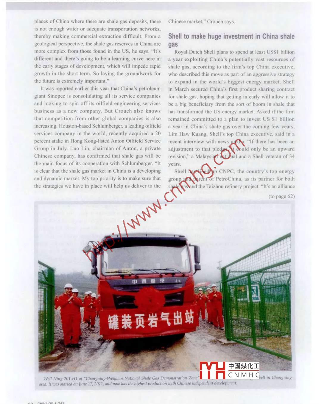 EXCHANGE and COOPERATIONForeign Oil Giants Seek ShaleGas Opportunities in ChinaBaker Hughes ready for Chinas shale gas Hughes has already made a start in the shale gas marketdevelopmentand has been doing the heavy lifting for global oil giantsBaker Hughes, one of the largest oil field service including the Royal Dutch Shell Plc. The US companyproviders in the world, lays the groundwork in China's has seen its revenue double to USS19. 8 billion in 2011shale gas sector though the country's shale gas industry is compared with USS10. 4 billion in 2007still in its early days. However, it has not deterred foreign According to Crouch, the development of shale gas inoilfield companies from trying to get into the market with North America and the integration of some other businessimmense potentialunits,which enables the company to service the entireAfter spending nearly 20 years of his working career life cycle of the well, are the major growth drivers forin the oil industry, Crouch, the vice-president of the Baker Hughes. The company's business in North AmericaHouston, Texas-based oilfield company Baker Hughes, accounted for nearly 52 percent of its total revenue inbelieves that despite its complexity, shale gas does 2011.""In China, shale gas seems to be developing a lotopen up new possibilities for global oilfield equipment more slowly than in the other markets. But there has alsocompanies in China. Crouch's assessment of the industry been an increase in the number of appraisal wells beingcould not be far off the mark considering that in April this dug. This will help us to know more about the reserves,year, a month after China announced its shale gas goals, and the capabilities and technologies needed to extract thehe was appointed managing director of Baker Hughes for resources, "he says. China's market is one of the fastestNorth Asia, with special emphasis on shale gas projects in growing markets for Baker Hughes, though its revenueChinain China ranks around 15th among the company's 23China has set a target of producing 6.5 billion cubic regionsmeters a year of shale gas by 2015 from virtually none The conventional energy market still accounts forthis year and hopes to produce between 60 billion and 100 most of Baker Hughes'business in China, Crouch says,billion cubic meters a year by 2020. Crouch says that the without revealing any revenue numbers. Baker Hughesimportant thing for oilfield companies like Baker Hughes is also bullish on the South China Sea and other deepis to lay the proper groundwork for a strong futureater projects. " There has also been a strong growth inUnlike conventional energy resources, shale gas our unconventional resources business, such as shale gasinvolves complex extraction procedures, equipment and he says. China has drilled 63 appraisal wells for shaletechnology before it can be successfully commercialized. gas till the end of April this year. Baker Hughes, alonShale gas is natural gas that is trapped inside shale with Chinas State-owned oil giants Sinopec Group androck and is extracted by using highly pressurized water PetroChina, is associated with a dozen of these wellsmixed with chemicals to crack open the rock. China does Crouch says that Baker Hughes rich legacy in Northnot have any commercial production of shale gas, but American shale gas development will helD it have anexploratory drilling for shale has increased greatly in the edge over competit中國煤化工companypast year. Global oilfield majors like Baker Hughes are does have some hiCNMHGperfectlyexpected to be key players that can provide a wide range suited for China, it will be wrong to assume that theof operational services for shale-gas developers. Baker US and Chinese markets are the same, he says. In someCHINA OIL&GAS 59places of China where there are shale gas deposits, there Chinese market, " Crouch saysis not enough water or adequate transportation networksthereby making commercial extraction difficult From a Shell to make huge investment in China shalegeological perspective, the shale gas reserves in China are gasmore complex from those found in the US, he says. " It's Royal Dutch Shell plans to spend at least USSI billiondifferent and there's going to be a learning curve here in a year exploiting China's potentially vast resources ofthe early stages of development, which will impede rapid shale gas, according to the firm's top China executivegrowth in the short term. So laying the groundwork for who described this move as part of an aggressive strategythe future is extremely important.to expand in the world's biggest energy market. ShellIt was reported earlier this year that Chinas petroleum in March secured China's first product sharing contractgiant Sinopec is consolidating all its service companies for shale gas, hoping that getting in early will allow it toand looking to spin off its oilfield engineering services be a big beneficiary from the sort of boom in shale thatbusiness as a new company. But Crouch also knows has trans formed the US energy market. Asked if the firmthat competition from other global companies is also remained committed to a plan to invest US SI billionincreasing Houston-based Schlumberger, a leading oilfield a year in China's shale gas over the coming few years.services company in the world, recently acquired a 20 Lim Haw Kuang, Shell's top China executive, said in apercent stake in Hong Kong-listed Anton Oilfield Service recent interview with news media: "If there has been anGroup in July. Luo Lin, chairman of Anton, a private adjustment to that pledge, it could only be an upwardChinese company, has confirmed that shale gas will be revision, "a Malaysian national and a Shell veteran of 34the main focus of its cooperation with Schlumberger. "It yearsis clear that the shale gas market in China is a developing Shell has lined up CNPC, the country's top energyand dynamic market. My top priority is to make sure that group and parent of Petro China, as its partn