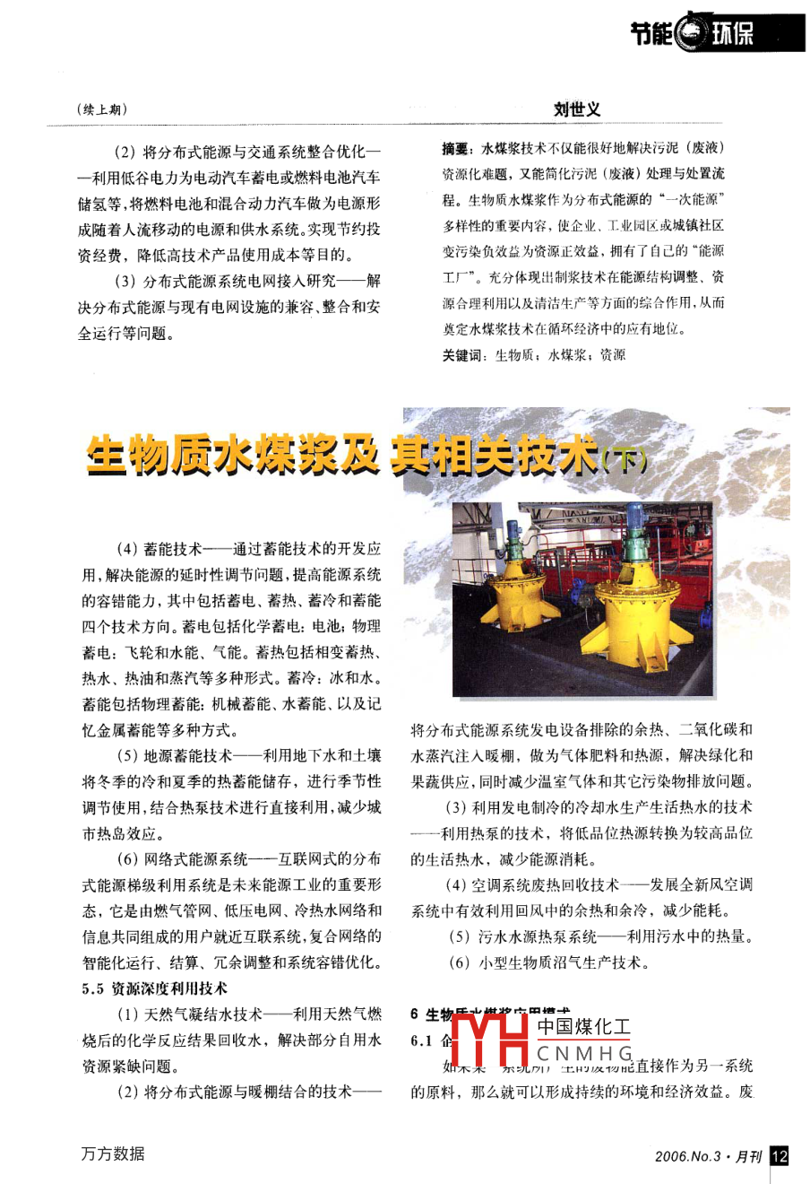 節(jié)能環(huán)保(續(xù)上期)劉世義(2)將分布式能源與交通系統(tǒng)整合優(yōu)化摘要:水煤漿技術(shù)不僅能很好地解決污泥(廢液)一利用低谷電力為電動汽車蓄電或燃料電池汽車資源化難題,又能簡化污泥(廢液)處理與處置流儲氫等,將燃料電池和混合動力汽車做為電源形程。生物質(zhì)水煤漿作為分布式能源的“一次能源成隨著人流移動的電源和供水系統(tǒng)。實現(xiàn)節(jié)約投多樣性的重要內(nèi)容,使企業(yè)、工業(yè)園區(qū)或城鎮(zhèn)社區(qū)資經(jīng)費,降低高技術(shù)產(chǎn)品使用成本等目的變污染負(fù)效益為資源正效益,擁有了自己的“能源(3)分布式能源系統(tǒng)電網(wǎng)接入研究—解工廠”。充分體現(xiàn)出制漿技術(shù)在能源結(jié)構(gòu)調(diào)整、資決分布式能源與現(xiàn)有電網(wǎng)設(shè)施的兼容、整合和安源合理利用以及清潔生產(chǎn)等方面的綜合作用,從而全運(yùn)行等問題奠定水煤漿技術(shù)在循環(huán)經(jīng)濟(jì)中的應(yīng)有地位。關(guān)鍵詞:生物質(zhì);水煤漿;資源生物質(zhì)水漿返式涯天水4)蓄能技術(shù)——通過蓄能技術(shù)的開發(fā)應(yīng)用,解決能源的延時性調(diào)節(jié)問題,提高能源系統(tǒng)的容鋯能力,其中包括蓄電、蓄熱、蓄冷和蓄能四個技術(shù)方向。蓄電包括化學(xué)蓄電:電池;物理蓄電:飛輪和水能、氣能。蓄熱包括相變蓄熱、熱水、熱油和蒸汽等多種形式。蓄冷:冰和水。蓋能包括物理蓄能:機(jī)械蓄能、水蓄能、以及記憶金屬蓄能等多種方式。將分布式能源系統(tǒng)發(fā)電設(shè)備排除的余熱、二氧化碳和(5)地源蓄能技術(shù)——利用地下水和土壤水蒸汽注入暖棚,做為氣體肥料和熱源,解決綠化和將冬季的冷和夏季的熱蓄能儲存,進(jìn)行季節(jié)性果蔬供應(yīng),同時減少溫室氣體和其它污染物排放問題。調(diào)節(jié)使用,結(jié)合熱泵技術(shù)進(jìn)行直接利用,減少城(3)利用發(fā)電制冷的冷卻水生產(chǎn)生活熱水的技術(shù)市熱島效應(yīng)利用熱泵的技術(shù),將低品位熱源轉(zhuǎn)換為較高品位(6)網(wǎng)絡(luò)式能源系統(tǒng)——互聯(lián)網(wǎng)式的分布的生活熱水,減少能源消耗式能源梯級利用系統(tǒng)是未來能源工業(yè)的重要形(4)空調(diào)系統(tǒng)廢熱回收技術(shù)——發(fā)展全新風(fēng)空調(diào)態(tài),它是由燃?xì)夤芫W(wǎng)、低壓電網(wǎng)、冷熱水網(wǎng)絡(luò)和系統(tǒng)中有效利用回風(fēng)中的余熱和余冷,減少能耗。信息共同組成的用戶就近互聯(lián)系統(tǒng),復(fù)合網(wǎng)絡(luò)的(5)污水水源熱泵系統(tǒng)—利用污水中的熱量。智能化運(yùn)行、結(jié)算、冗余調(diào)整和系統(tǒng)容錯優(yōu)化。(6)小型生物質(zhì)沼氣生產(chǎn)技術(shù)。5.5資源深度利用技術(shù)(1)天然氣凝結(jié)水技術(shù)—利用天然氣燃6生物燒后的化學(xué)反應(yīng)結(jié)果回收水,解決部分自用水6.1中國煤化工CNMHG資源緊缺問題。1王成忉能直接作為另一系統(tǒng)(2)將分布式能源與暖棚結(jié)合的技術(shù)的原料,那么就可以形成持續(xù)的環(huán)境和經(jīng)濟(jì)效益。廢2006N.3月刊2研我抓討物輸出的系統(tǒng)為此節(jié)省了廢物處理和處置的費用,料,再將失效后的濾料與污泥做為原料用于生物質(zhì)水而接受廢物的系統(tǒng)則節(jié)省了購買原材料的費用。煤漿的制備。煤炭所具備的活性炭性質(zhì),使煤漿制備與此同時,因廢物處置和原材料開采所導(dǎo)致的環(huán)和污水治理很好地結(jié)合,促成了企業(yè)“能源車間”的誕境風(fēng)險也隨之降低。生?!澳茉窜囬g”較好地解決了當(dāng)前困擾水處理的三大工業(yè)生態(tài)學(xué)是以對自然生態(tài)系統(tǒng)的直接模仿難題,如投資與運(yùn)行成本過高、污水處理過程中的臭為基礎(chǔ)的。自然系統(tǒng)傾向于使廢物的產(chǎn)生最少化:味以及污泥處置等。營養(yǎng)物從一種生物傳遞給另一種生物,在不同的生物質(zhì)水煤漿技術(shù)多功能衍生模式如圖5所示,是生物之間即允許合作亦允許競爭,一種生物的產(chǎn)將兩個或多個流程合并,使此流程中產(chǎn)生的廢物成為出成為另一種生物的投入,并使每個過程的效益彼流程的原料,從而達(dá)到綜合利用,減少污染之目的最大化。工業(yè)生態(tài)學(xué)按照自然系統(tǒng)來塑造工業(yè)系其的創(chuàng)新之處在于集成了污泥(廢液)制漿、煤炭濾統(tǒng),可以把若干相互作用的系統(tǒng)視為生態(tài)系統(tǒng)。料、余熱利用、型煤型焦生產(chǎn)及煤漿氣化等諸多高新生態(tài)企業(yè)是指仿照自然界生態(tài)物質(zhì)循環(huán)的方技術(shù)形式,是在充分利用現(xiàn)有資源和成熟技術(shù)前提下式來規(guī)劃企業(yè)生產(chǎn)系統(tǒng)的一種工業(yè)模式。在生態(tài)的“系統(tǒng)創(chuàng)新”,為解決企業(yè)污泥(廢液)綜合利用問企業(yè)中,各個生產(chǎn)系統(tǒng)不是孤立的,而是通過物料題和環(huán)境保護(hù)問題提供了一條極為有效的新途徑。余流、能量流、價值流和信息流互相關(guān)聯(lián)的。生態(tài)企熱利用部分形式如圖6所示。業(yè)追求的是系統(tǒng)內(nèi)各生產(chǎn)過程從原料,中間產(chǎn)物水燃燒發(fā)電余熱利用廢物到產(chǎn)品的鏈接和耦合,完成