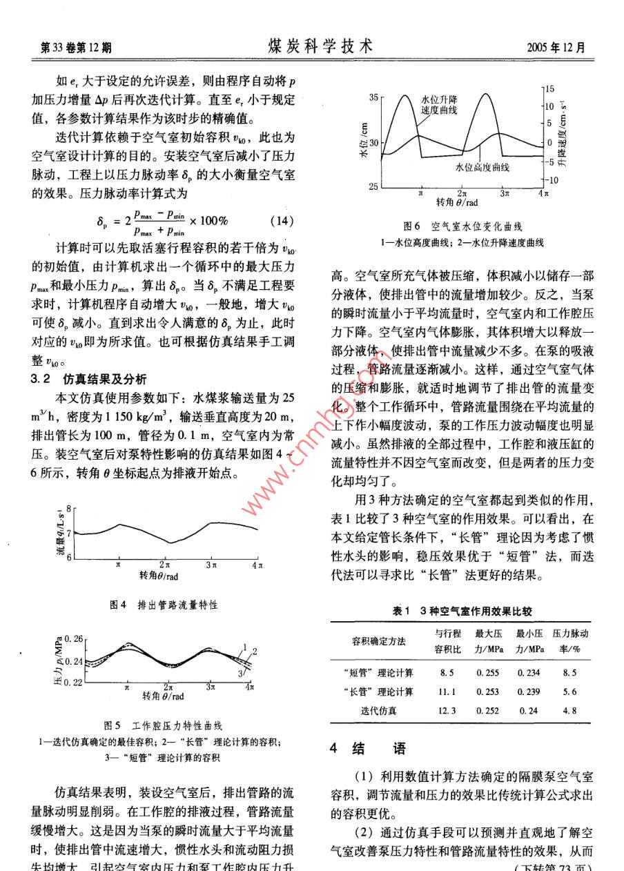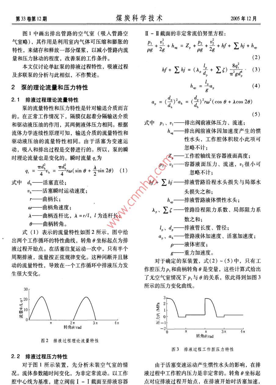 第30卷第12期煤炭科學技術2005年12月試驗研我空氣室對水煤漿隔膜泵性能影響的仿真研究陳燎原’,尹兆友2,陳歲繁(1.安徽理工大學,安徽淮南232001;2.淮南礦業(yè)(集團)有限責任公司謝家集一礦,安徽淮南232001)摘要:建立了水煤漿隅膜泵工作特性的數(shù)學模型,不依賴傳統(tǒng)的“長管”和“短管”設計計算公式,用數(shù)值計算方法求解空氣室容積。利用計算機對其影響泵的特性進行仿真,從而直觀地檢驗該容積值是否恰當。關鍵詞:水煤漿隔膜泵;空氣室;計算機仿真中圖分類號:TH323文獻標識碼:A文章編號:0253-2336(2005)12-0041-04Simulation research on air chamber affected to features ofcoal water mixture membrane pumpCHEN Liao-yuan, YIN Zhao-you, CHEN Sui-fan(l. Anhui Uniersity of Science and Technology, Huainan 232001, China;2. Xiejiaji No. I Mine, Huainan Coal Mining Gorup Corporation Ld., Huainan 232001, ChinaAbstract: A mathematics model for the operation features of the coal water mixture membrs established. The volume of theair chamber was calculated with a numerical calculation methodbase on the calculation formula of the traditional "long tubeand"short tube"design. The features affected to the pump were simulated with computer, which could directly inspect the volume valuesuitable or notKey words: coal water mixture membrane pump; air chamber; computer simulation隔膜泵是泵行業(yè)中技術難度最大、產(chǎn)品附加值壓油分隔,曲柄連桿機構(gòu)帶動活塞往復運動,并通最高的產(chǎn)品種類之一。它采用隔膜將輸送介質(zhì)與驅(qū)驅(qū)動液壓缸的油液推動隔膜作左右擺動,從而對動介質(zhì)隔開,使輸送的固體顆粒與活塞運動部件不輸送介質(zhì)作功。排出閥4和吸入閥5交替打開和關接觸,避免了對泵造成的磨損。在國內(nèi),水煤漿隔閉,使工作腔完成吸液和排液過程?;钊髯兯龠\膜泵近年來才開始研制,產(chǎn)品還沒有形成系列化動,使得吸人和排出管內(nèi)液體存在加速度和慣性水主要元件的設計也是借鑒機動往復泵的設計方法。頭,必然會產(chǎn)生流量和壓力的脈動其中,空氣室的設計有所謂“短管”設計理論和n「Pn“長管”設計理論。文獻[1,2]并沒有嚴格界定兩種理論公式的適用范圍,按不同理論設計的空氣室,對水煤漿隔膜泵特性的影響的差異也難以預測。本文避開傳統(tǒng)設計公式,采用計算機數(shù)值模擬,仿真空氣室對泵特性的影響,從而可以直觀地斗。7少確定空氣室的合理尺寸。1水煤漿隔膜泵工作原理圖1水煤漿隔膜泵工作原理水煤漿隔膜泵的工作原理如圖1所示。用一柔排液容器;2一排出管;3一空氣室;4排出閥;5-吸人第33卷第12期煤炭科學技術2005年12月圖1中畫出排出管路的空氣室(吸入管路空Ⅱ-Ⅱ截面的非定常流伯努里方程:氣室略),其作用是利用室內(nèi)氣體可壓縮和膨脹的Pg2g+hu =z,+P2.U2PI特性,來儲存和釋放一部分煤漿,以減小管路內(nèi)流+礦f+∑勾+h量和壓力脈動的程度,改善泵的工作條件。本文僅討論單缸泵的排液過程特性,吸液過程f+∑礦=(λ+∑(3)及多聯(lián)泵的分析與此相似,不作贅述。2泵的理論流量和壓力特性h(4)2.1排液過程理論流量特性2a,=(e)ira( cos 8+ Acos 20泵的流量特性和壓力特性是針對輸送介質(zhì)而言的。在正常工作情況下,隔膜僅起著分隔輸送介質(zhì)(5)和驅(qū)動液壓油的作用,其兩側(cè)液體壓力相同。根據(jù)式中p1、n—排出閥前液體壓力、流速;流體力學連續(xù)性原理可知,輸送介質(zhì)的流量特性和hn—排出閥前液體因加速度產(chǎn)生的慣驅(qū)動液壓油的流量特性相同。由于活塞為變速運性水頭,工作腔體積較小此項可動,吸入和排出過程是交替進行的。所以,泵的瞬忽略不計時理論流量也是變化的。瞬時流量q為Z,工作腔軸線至容器液面高度P2、v2容器液面壓力、流速,t2很小可9. =Un ="ro( sin 8+sin 20)(1)忽略不計;式中d—活塞直徑;f+∑——排液管路沿程水頭損失與局部水活塞瞬時運動速度頭損失之和;曲柄長;hn排液管路液體慣性水頭;—曲柄角速度;λ,、∑—管路沿程阻力系數(shù)、局部阻力系A—曲柄連桿比,A=r/,l為連桿長;數(shù)之和—曲柄轉(zhuǎn)角式(1)表示的流量特性如圖2所示,圖中給l、d排液管長度、管徑管路液體加速度、活塞加速度出兩個工作循環(huán)的特性曲線,轉(zhuǎn)角6坐標起點為排液過程開始點。在活塞往復運動一次中,只有半個p液體密度;周期排液,流量按正弦規(guī)律變化。這種間斷并且脈g——重力加速度。對于確定的泵裝置,式(2)~(5)中,只有工動的流量特性,導致在一個工作循環(huán)中排液壓力發(fā)作腔壓力p1和曲柄轉(zhuǎn)角8是變量,這些計算式給出生很大變化。了無空氣室情況下p1與θ的關系,依此得到如圖3所示的壓力變化曲線。轉(zhuǎn)角8/rad轉(zhuǎn)角rad圖2排液過程理論流量特性圖3排液過程工作腔壓力特性22排液過程壓力特性對于圖1所示裝置,先分析未裝空氣室的情由于活塞變速運動產(chǎn)生慣性水頭的影響,在排況。流體參數(shù)隨時間變化,為非定常流動。以工作液過程中工作腔內(nèi)壓力是非定常的。轉(zhuǎn)角θ坐標起腔中心線為基準,建立閥前I-I截面至排液容器點對應排液過程開始點,在排液開始時活塞加速,第33卷第12期煤炭科學技術005年12月形成正的壓力尖峰值,遠遠超過排液管路內(nèi)靜水壓很小,所以有:力(圖3中水平線)。其中,克服沿程阻力和局部P3Pk≈P阻力引起的壓力升高,相對于慣性水頭要小得多。因為空氣室內