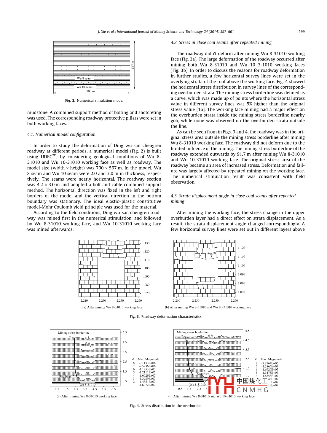 International Journal of Mining Science and Technology 24(2014)597-601Contents lists available at Science DirectInternational Journal of Mining Science and TechnologyELSEVIERurnalhomepagewww.elsevier.com/locate/ijmstDeformation effect of lateral roof roadway in close coal seams afterrepeated miningXie Jianlin Xu Jialin Wang Feng Guo Jiekai Liu donglintate Key laboratory of Coal Resources and Safety Mining, China University of Mining and Technology, Xuzhou 221008, Chinab School of Mines, China University of Mining and Technology, Xuzhou 221008, ChinacNo. 1 Coal Mine of Pingdingshan Tian' an Coal Industry CO Ltd, Pingdingshan 467011, chinaARTICLE INFOABSTRACTArticle historThis paper analyzed the deformation mechanism in lateral roof roadway of the ding Wu-3 roadwayReceived 12 December 2013hich was disturbed by repeated mining of close coal seams Wu-8 and Wu-10 in Pingdingshan No. 1Received in revised form 13 January 2014Mine. To determine the strata disturbance scope, the strata displacement angle was used to calculatepted 10Available online 18 August 2014the protection pillar width. a numerical model was built considering the field geological conditionssimulation, the mining stress borderline was defined as the contour where the induced stress is 1.5 timesKeywordsof the original stress. Simulation results show the mining stress borderline of the lateral roadwayxtended 91.7 m outward after repeated mining. Then the original stress increased, deforming the road-ng stress borderlineway of interest. This deformation agreed with the in situ observations. Moreover, the strata displacementStrata displacement angleangle changed due to repeated mining. Therefore, reselection of the displacement angle was required tolesign the protective pillar width. Since a constant strata displacement angle was used in traditionalProtective pillardesign, the proposed method was beneficial in field caseso 2014 Published by Elsevier B V on behalf of China University of Mining TechnologyIntroductionwas used to calculate the width of a protective pillar. The analyticalresults indicated that the roadway would not distort or fail when itUnderground roadways are often deformed when they are was out of the strata displacement scope after mining. The actualaffected by nearby working faces. Thus, a reasonable location is field results showed that the roadway didn ' t distort after miningan important precondition for guaranteeing the stability of a Wu 8-31010 working face. However, serious distortion occurredroadway [1-7. The roadway could be protected by coal pillars. after mining Wu 10-31010 working face in close distance seamsThe traditional way is to calculate the protective pillar width with Affected by repeated mining, the roof roadway has more complexthe strata displacement angle as a main design parameter, combin- influencing factors on deformation than that in single coal seaming geological conditions and empirical data. Many geologic and mining [11-15 It is inadequate to make judgments merely onmining factors are related to strata displacement angle, such as the traditional strata displacement angle. The width of a protectivethe upper layer rock stress characteristics, mining method, mining pillar based on traditional methods cannot satisfy practicaldepth, mining height of coal seams and repeated mining [8, 9 The requirements, This study will further research on the deformationstrata displacement angles used in protective pillar design are effects in lateral roof roadways in close coal seams after repeatedcommonly acquired from observation data within 300 m mining mining by employing mining stress evolution as well as stratadepth. It seems that the strata displacement angle in the same displacement.mining area is consistent. However, whether the strata displace-ment angle is dependent on the mining depth remains unknown2. Engineering situationIn order to protect the Ding wu-san chengren roadway in theroofs of Wu 8-31010 and Wu 10-31010 working faces(miningWu 8 and wu 10 coal seams are close seams of no. 1 Mine indepth was about 600 m in each case)of No. 1 Mine of Pingding- Pingdingshan Tianan Coal Industry Limited Company.Theirhan, the strata displacement angle selected from statistical data vertical distances are about 10 m on average. Mining on the Wu8-31010 working faAnril 2.009 and stopped in January.Corresponding author. Tel. +86 138520831422010. Mining the中國煤化工 began in January2012 and stoppedCNMHGhttp://dx.doiorg/10.1016/j.ijmst.2014.04.0032095-2686 2014 Published by Elsevier B V on behalf of China University of Mining TechnologyJ. Xie et al/ International Journal of mining Science and Technology 24(2014)597-601200mface. For each of the 20 observation points, deformation of theDing wchengren roadwayroadway roof and floor as well as two brackets was measured by240mcross measurement. The initial data were measured on January280m21,2012.280mWu 8-31010 working facField measurements were carried out on the ding wu-san320m320mhengren roadway on February 12, March 10, April 6, April 30, June48 Wu 10-31010 working face9 and july 7 in 2012 respectively. table 1 shows the results. Thedata show the difference between measured data and initial data-400mSome positive values were obtained because of field measurementerror due to manual measurement by tape.Fig. 1. Relationship between location of Ding wu-san chengren roadway alThe positions of large deformation in the roof and floor causedworking facesby mining were from the 5th observation point to the 14th one(Table 1). The maximum relative displacement value of roof andig. 1 shows the adjacent position relationship between Ding floor at the 7th observation point was 587 mm. The positions ofwu-san chengren roadway and the two working faces. The protec- two influenced brackets were from the 3rd observation point totive pillar was designed 48 as the unified strata displacement the 10th one. The maximum relative displacement value of twoangle. The protective pil