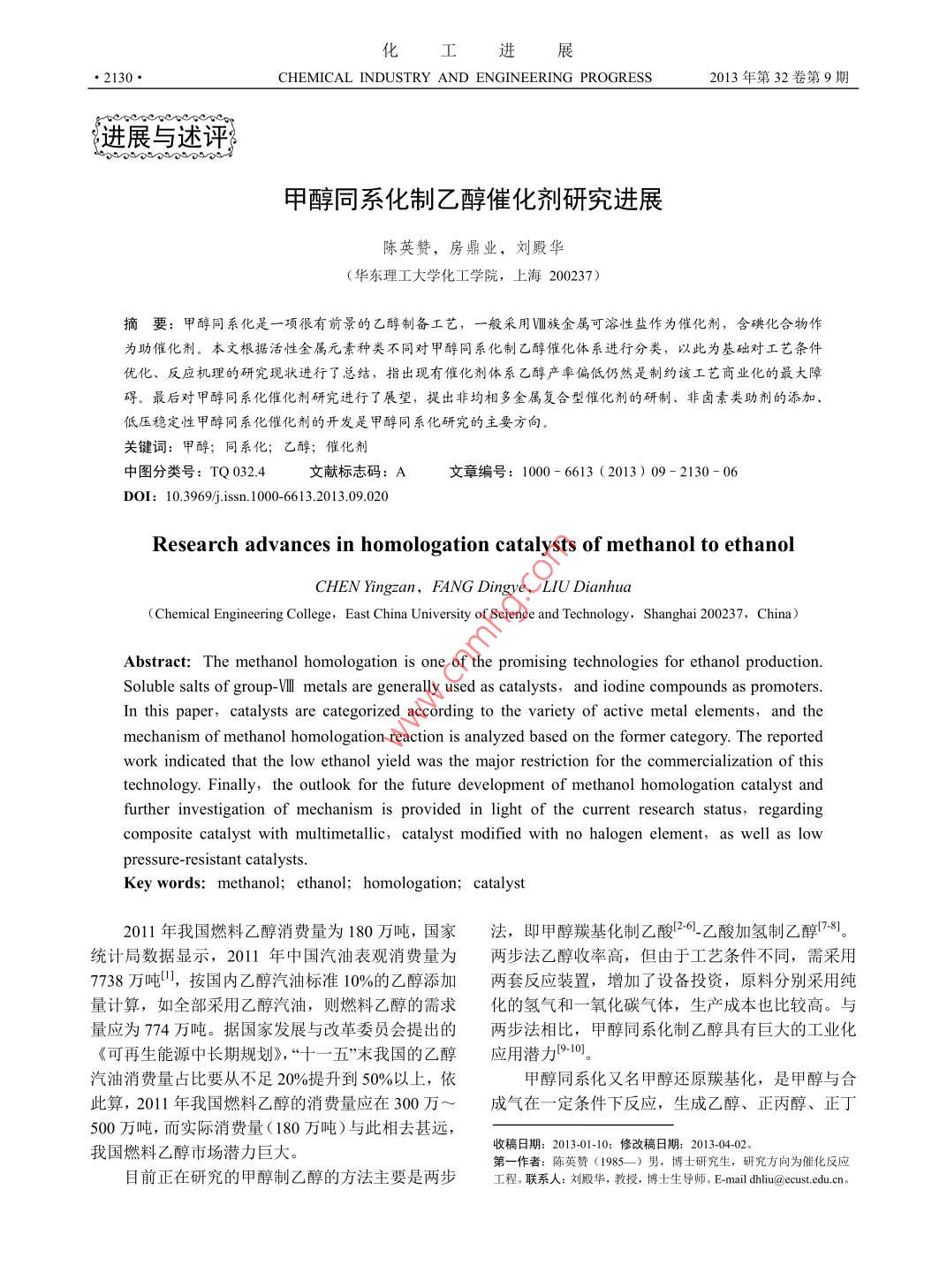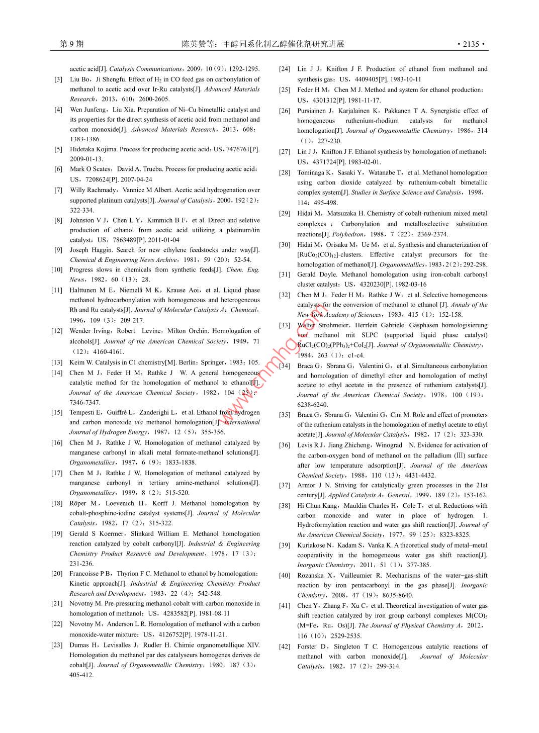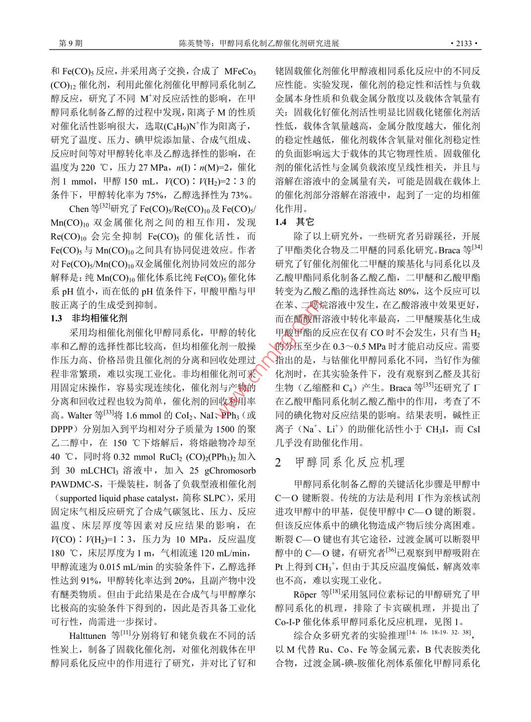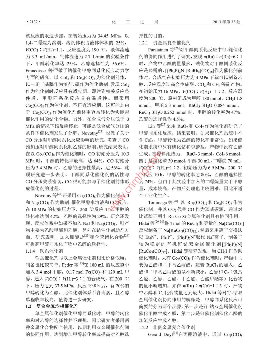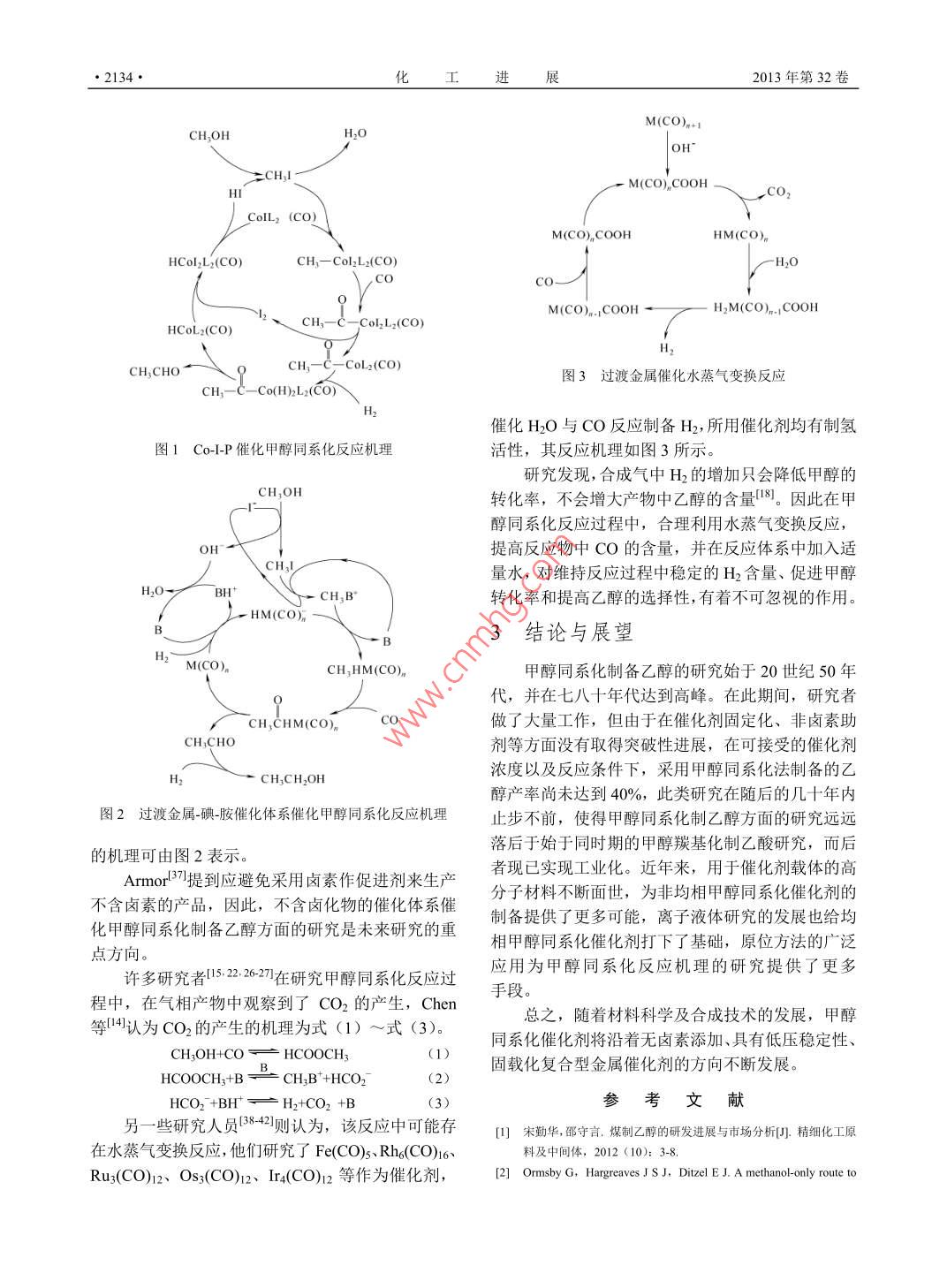 化工進展2130CHEMICAL INDUSTRY AND ENGINEERING PROGRESS2013年第32卷第9期進展與述評甲醇同系化制乙醇催化劑研究進展陳英贊,房鼎業(yè),劉殿華(華東理工大學化工學院,上海200237)摘要:甲醇同系化是一項很有前景的乙醇制備工藝,一般采用Ⅷ族金屬可溶性鹽作為催化劑,含碘化合物作為助催化劑。本文根據(jù)活性金屬元素種類不同對甲醇同系化制乙醇催化體系進行分類,以此為基礎對工藝條件優(yōu)化、反應機理的研究現(xiàn)狀進行了總結(jié),指岀現(xiàn)有催化劑體系乙醇產(chǎn)率偏低仍然是制約該工藝商業(yè)化的最大障礙。最后對甲醇同系化催化劑硏究進行了展望,提岀非均相多金屬復合型催化劑的研制、非鹵素類助劑的添加壓穩(wěn)定性甲醇同系化催化劑的開發(fā)是甲醇同系化研究的主要方向關鍵詞:甲醇;同系化;乙醇;催化劑中圖分類號:TQ0324文獻標志碼:A文章編號:1000-6613(2013)09-2130-06DOI:10.3969/sn.10006613.2013.09020Research advances in homologation catalysts of methanol to ethanolCHEN Yingzan, FANG Dingye, LIU Dianhua( Chemical Engineering College, East China University of Science and Technology, Shanghai 200237, ChinaAbstract: The methanol homologation is one of the promising technologies for ethanol productionSoluble salts of group -VIll metals are generally used as catalysts, and iodine compounds as promotersIn this paper, catalysts are categorized according to the variety of active metal elements, and themechanism of methanol homologation reaction is analyzed based on the former category. The reportedwork indicated that the low ethanol yield was the major restriction for the commercialization of thistechnology. Finally, the outlook for the future development of methanol homologation catalyst andfurther investigation of mechanism is provided in light of the current research status, regardingcomposite catalyst with multimetallic, catalyst modified with no halogen element, as well as lowpressure-resistant catalystsKey words: methanol; ethanol; homologation; catalyst2011年我國燃料乙醇消費量為180萬噸,國家法,即甲醇羰基化制乙酸26-乙酸加氫制乙醇。統(tǒng)計局數(shù)據(jù)顯示,2011年中國汽油表觀消費量為兩步法乙醇收率高,但由于工藝條件不同,需采用7738萬噸,按國內(nèi)乙醇汽油標準10%的乙醇添加兩套反應裝置,增加了設備投資,原料分別采用純量計算,如全部釆用乙醇汽油,則燃料乙醇的需求化的氫氣和一氧化碳氣體,生產(chǎn)成本也比較高。與量應為774萬噸。據(jù)國家發(fā)展與改革委員會提出的兩步法相比,甲醇同系化制乙醇具有巨大的工業(yè)化《可再生能源中長期規(guī)劃》,“十一五”末我國的乙醇應用潛力0汽油消費量占比要從不足20%提升到50%以上,依甲醇同系化又名甲醇還原羰基化,是甲醇與合此算,2011年我國燃料乙醇的消費量應在300萬成氣在一定條件下反應,生成乙醇、正丙醇、正丁500萬噸,而實際消費量(180萬噸)與此相去甚遠,我國燃料乙醇市場潛力巨大。攸稿日期:2013-01-10:修改稿日期:2013-04-02第一作者:陳英贊(1985—)男,博士研究生,研究方向為催化反應目前正在研究的甲醇制乙醇的方法主要是兩步工程,聯(lián)系人:劉殿華,教授,博士生導師。 E-mail dhliuaecust. edu. cn第9期陳英贊等:甲醇同系化制乙醇催化劑研究進展2131·醇等一系列正醇叫的過程。自從 Wender等12于解負載在ZrO2上制備了非均相催化劑(以羰基金屬1949年首次報道了烷基醇同系化反應制備更高級化合物計,負載量占載體質(zhì)量的2.5%),以H作烷基醇后,相關研究不斷深入,并取得了一系列成為助催化劑硏究了甲醇同系化制乙醇。結(jié)果發(fā)現(xiàn)果。甲醇同系化制乙醇由于所用原料甲醇、合成氣在沒有銠化合物的單純碘化物催化體系,產(chǎn)物中沒均可由煤制得,這一乙醇制取路線更適合我國“富煤有發(fā)現(xiàn)甲烷,當反應體系中存在銠化合物時,甲烷貧油”的能源結(jié)構(gòu),對于我國擺脫進口石油依賴具有的生成量與合成氣中H2的量成正比,另外產(chǎn)物中乙深遠意義。本文對甲醇同系化反應的主要催化劑進醇和乙醛的含量以及乙酸與乙酸酯的含量,都與初行了分析比較,并對其催化機理和發(fā)展前景作了簡始原料中CO與H2的比例有關要介紹。1.1.2錳系催化劑1甲醇同系化催化劑Chen等1研究了堿金屬甲酸-乙醇溶液中,羰基錳催化甲醇同系化,采用甲酸作為溶劑的目的目前,甲醇同系化主要采用含釕、銠、錳、鐵、是與甲醇先反應生成甲酸甲酯,甲酸甲酯中的甲基鈷等金屬均相催化劑,非均相催化劑的研究較少。更容易游離出來,從而轉(zhuǎn)移到M(CO)5上,形成甲醇同系化制乙醇的主催化劑一般為可溶性金屬配CH3Mn(COs反應中間體。作者提出催化體系中加合物,助催化劑為碘化物,有時也直接采用金屬碘入叔胺(三甲基胺)的作用是穩(wěn)定羰基金屬離子和化物作為催化劑。加入到反應體系的一般認為是催催化甲酸甲酯的生成,也可以作為甲酸甲酯和羰基化劑前體,在一定條件下才會形成具有催化活性的金屬之間的甲基轉(zhuǎn)移催化劑。該研究是以堿金屬取催化劑代叔胺溶液來研究其助催化劑效果。提高一氧化碳11單金屬均相催化劑的分壓可降低CH4的生成,反應中羰基錳濃度減小1.1.1銠系催化劑是因為生成了碳酸錳沉淀,在沒有甲酸鉀加入時,銠由于其出色的羰基化性能而被廣泛應用于甲只有30%的十羰基二錳轉(zhuǎn)化為Mn(CO),證明了甲醇羰基化催化劑中,Keim13認為銠作為甲醇同系化酸鉀可以作為助催化
