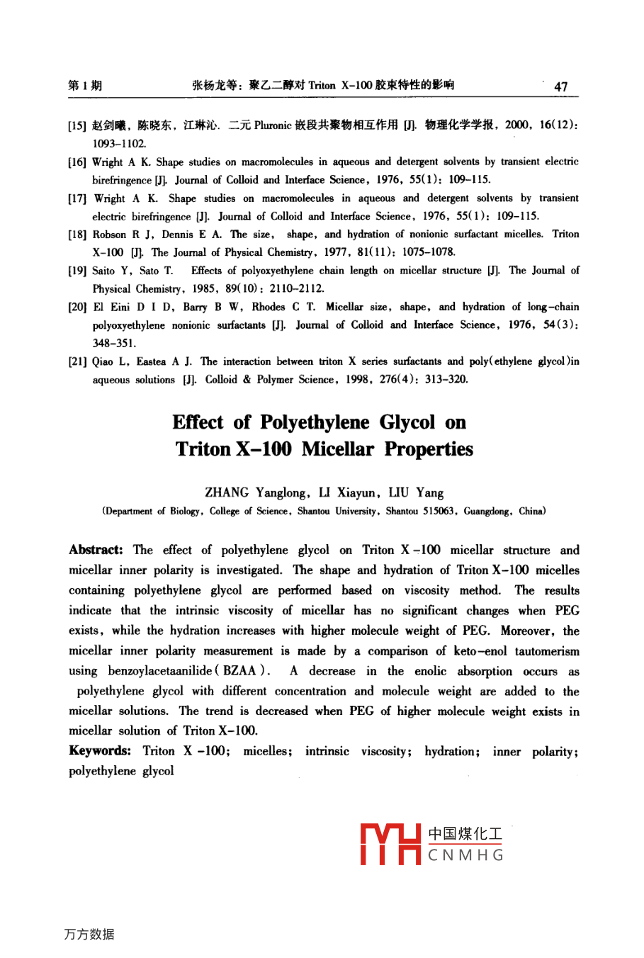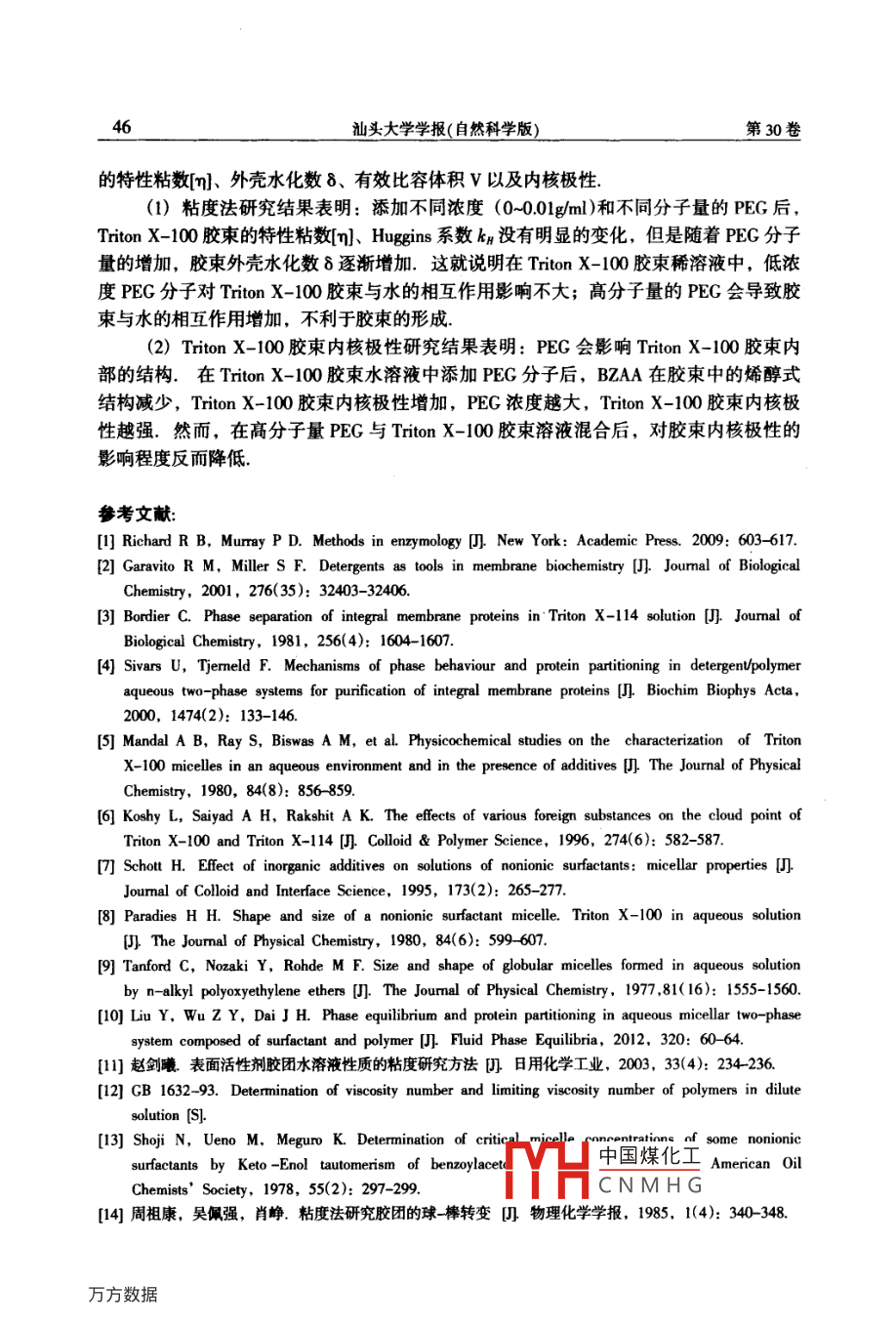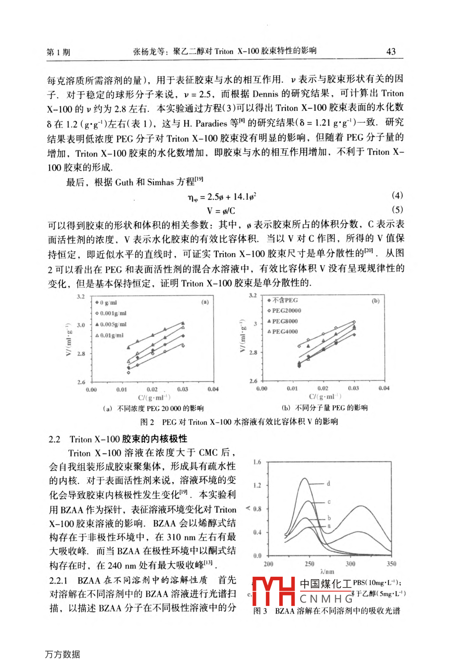2015年2月汕頭大學學報(自然科學版第30卷第1期Feb 2015Journal of Shantou University(Natural Science文章編號:1001-4217(2015)01-0040-08聚乙二醇對 Triton X-100膠束特性的影響張楊龍,李夏云,劉楊(汕頭大學理學院生物系,廣東汕頭515063摘要:為深入探索PEG/ Triton X-100雙水相體系中PEG分子對非離子型表面活性劑Triton X-100膠束特性的影響,利用粘度法對非離子型表面活性劑 Triton x-100水溶液的膠束化行為進行表征,研究了PEG分子對 Triton X-100水溶液膠束特性粘數(shù)]和水化程度的影響.結果表明,在含有PEG分子的 Triton X-100膠束稀溶液中,PEG的分子量和濃度變化對膠束的特性粘數(shù)影響并不顯著;但隨著PEC分子量的增加, Triton X-100膠束的水化程度增加,膠束外殼與水溶液的相互作用增大.進一步以苯甲?;阴1桨?BZAA)作為探針,研究PEG分子對膠束內(nèi)核極性的影響.結果顯示PEG分子對 Triton X-100膠束內(nèi)核極性具有顯著的影響:PEG濃度越大,BZAA在膠束內(nèi)烯醇式結構減少,表明膠束內(nèi)核極性增加;同時隨著PEG分子量的增加,對內(nèi)核極性的影響程度降低關鍵詞: Triton X-100;膠束;特性粘度;水化程度;內(nèi)核極性;聚乙二醇中圖分類號:Q5文獻標志碼:ATriton X-100(辛基苯基聚氧乙烯醚)是一種非離子型表面活性劑,分子結構由聚氧乙烯鏈的親水性頭基和烷烴鏈的疏水性尾基組成.當其水溶液濃度超過其臨界膠束濃度(CMC=0.138×103-0.15×10gml-1)時, Triton X-100分子能夠聚集在一起形成膠束其疏水性尾部聚合形成疏水性內(nèi)核,對疏水性分子有良好的增溶作用,可應用于強疏水性內(nèi)在膜蛋白研究.由非離子型表面活性劑形成的雙水相體系是一種分離和純化膜蛋白的有效手段,尤其是非離子型表面活性劑與親水性聚合物形成的雙水相體系可使疏水性膜蛋白富集于表面活性劑相,親水性蛋白富集于聚合物相,從而實現(xiàn)對疏水性膜蛋白的富集分離.然而,非離子型表面活性劑水溶液中的膠束化行為比較復雜,溶液環(huán)境的變化會導致表面活性劑膠束性質(zhì)的改變n.研究學者結合動態(tài)光散射、粘度法、核磁共振等檢測方法對非離子型表面活性劑膠束的結構和性質(zhì)進行一系列的研究,報道了膠束的分子量、大小和形狀等性質(zhì)參數(shù)特征-9.而對于由PEG(聚乙二醇)與收稿日期:2014-10-08作者簡介:張楊龍(1988-),男,研究生,碩士,主要研究方向:通信作者:劉楊(1978-),女,教授,博土,主要研究方向:生鈔基金項目:廣東省高等學校優(yōu)秀青年教師培養(yǎng)計劃(Yq2013076),H中國煤化工1@stu. edu. enCNMH00),廣東省高等學校學科與專業(yè)建設專項資金項目(2012KJCX0052)第1期張楊龍等:聚乙二醇對 Triton x-100膠束特性的影響Triton X-100形成的雙水相體系,尚缺乏對 Triton x-100富集相膠束化行為的系統(tǒng)研究,探索 Triton X-100膠束化行為受成相組分PEG分子的影響規(guī)律,有助于深入探索PEG/ Triton x-100雙水相體系相平衡特性及疏水性膜蛋白的分配機理.因此,本文基于PEG/ Triton X-100雙水相體系相平衡中兩種成相組分濃度的比例關系,研究PEG分子對 Triton x-100膠束化行為的影響,首先通過粘度法研究了PEG分子對 Triton x-100膠束特性粘數(shù)[η]以及水化作用等基本性質(zhì)的影響,然后利用苯甲?;阴1桨?BZAA)作為探針,對 Triton X-100膠束溶液的內(nèi)核極性進行表征,考察PEG分子對膠束內(nèi)核極性的影響1材料與方法1實驗材料:Tritonx-100、PEG20000、PEG8000、PEG4000均購買于 AMERCO公司.苯甲酰基乙酰苯胺(BZAA)來自于 Tokyo化工公司;其它試劑均為國產(chǎn)分析純12實驗方法1.21膠束溶液的制備將 Triton X-100用001moL磷酸鹽緩沖液(PBs,pH=7)溶解,配制成一系列濃度梯度的膠束溶液(0-004gm1-1),分別測量其粘度.在保證 Triton X-100終濃度不變的條件下,與不同分子量的PEG(2000,8000和4000混合,使PEG的終濃度分別為001gml-1、0.005gml1和001gml,在同樣條件下測量溶液粘度1.22溶液粘度的測定根據(jù)GB/1632-93中的方法,25℃條件下,利用烏氏粘度計測量 Triton X-100膠束水溶液的粘度.分別測量溶液流過毛細管的流出時間t以及對應溶劑流過毛細管的時間t,溶液粘度與留出時間和體積密度之積成正比,稀溶液和純?nèi)軇┚哂邢嗨频拿芏?故溶液的相對粘度為:(1)1.23膠柬的內(nèi)核極性的測量根據(jù) Shoji et al!所用的方法,配制10mgL4的BZAA溶液,以此作為溶劑,按表1分別配制含有不同濃度PEG的(混合)膠束溶液,恒溫25℃振蕩12h混勻,在220-350mm范圍內(nèi)進行光譜掃描表1含有不同濃度PEG的 Triton X-100膠束溶液不同濃度的 Triton x-100溶液混合膠束溶液0005g"ml0.01 gmlPEG(x10'gml-)2結果與討論2.1 Triton X-100膠束外殼的水化非離子型表面活性劑在CMC以上才會形成膠eH中國煤化工容液的粘度為參照,即測定C>CMC時膠束溶液的相對粘度nCNMHG-100的CMC42汕頭大學學報(自然科學版)第30卷極低,nm與純?nèi)軇┑恼扯认嗨?因此 Huggins方程可以改寫為:/C=(m,-1)C=[n]+hUmiC其中,η表示稀溶液的增濃粘度,C代表膠束溶液的濃度,單位是gmL,m表示溶液的特性粘數(shù).分別測量不同濃度的 Triton x-100膠束水溶液(0-03gm1)的相對粘度η,通過ηC~C作圖,由直線的截距和斜率可以得到膠束溶液特性粘數(shù)n和 Huggins系數(shù)kH特性粘數(shù)m反映單個 Triton x-100膠束對粘度的貢獻, Huggins系數(shù)kn描述膠束與溶液環(huán)境之間的相互作用,其數(shù)值越大表明相互作用越弱.將不同濃度和不同分子量的PEG與 Triton x-100水溶液混合后,根據(jù)方