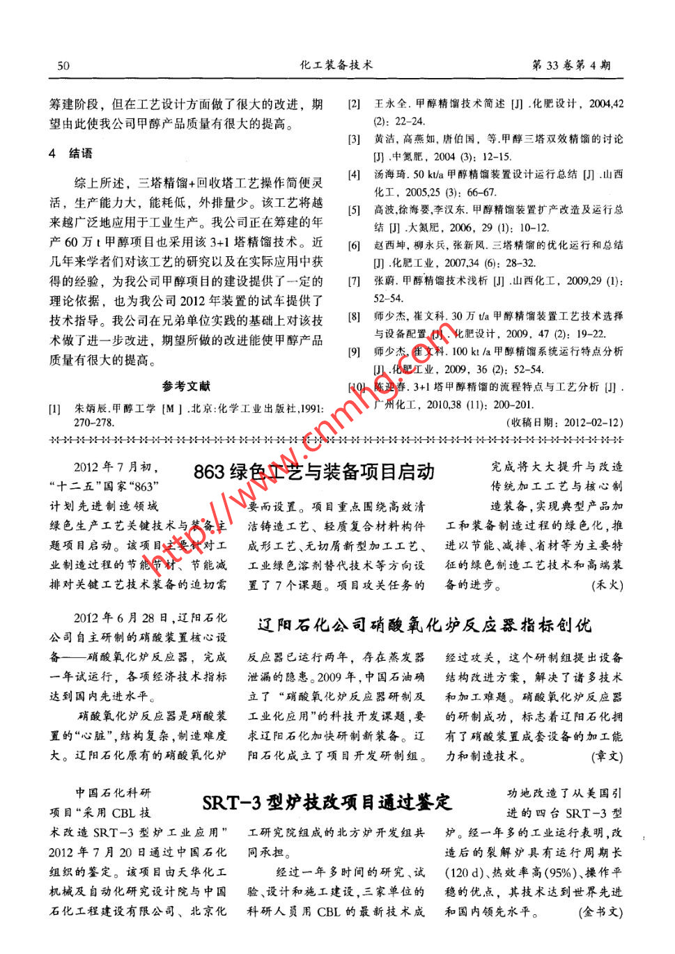 48化工裝備技術(shù)第33卷第4期2012年8月綜述甲醇精餾的研究進(jìn)展與應(yīng)用曹會(huì)敏*范智勇張國(guó)民劉永強(qiáng)(河南煤業(yè)化工集團(tuán)鶴煤化工分公司)摘要甲醇精餾是多個(gè)簡(jiǎn)單蒸餾的組合,是甲醇生產(chǎn)裝置的重要工序,其技術(shù)的好壞直接關(guān)系到精甲醇的質(zhì)量。對(duì)近幾年來(lái)國(guó)內(nèi)甲醇精餾技術(shù)的研究與應(yīng)用進(jìn)行了回顧和總結(jié)。關(guān)鍵詞甲醇精餾工藝流程粗甲醇精甲醇精餾塔回收塔中圖分類號(hào)TQ 021.4Research Progress and Application of Methanol DistillationCao Huimin Fan Zhiyong Zhang Guomin Liu Y ongqiangAbstract: M ethanol distilation is a combination of multiple simple ditillations, it is an importantprocess of metbanol production unit, and is technology is directly related to the quality of fine methanol. Inthis paper, the research and application of domestic methanol rectification technology in recent years aresummarized and reviewed.Key words: Methanol disillation; Process; Crude methanol; Fine methanol; Disillation column; Recoverytower0前言1甲醇精餾工藝原理及優(yōu)點(diǎn)甲醇作為一種重要的有機(jī)化工原料,其下游產(chǎn).1 工藝原理品越來(lái)越多。隨著甲醇衍生物及其下游產(chǎn)品的迅速甲醇精餾是利用粗甲醇中各組分揮發(fā)度不同,發(fā)展和甲醇燃料的推廣應(yīng)用,甲醇需求量將越來(lái)越將水加人待分離的混合液中,利用多次部分汽化和大,因此提高甲醇產(chǎn)品質(zhì)量和降低生產(chǎn)消耗就越來(lái)多次部分冷凝的方法,達(dá)到完全分離各組分、獲得越引起人們的關(guān)注。甲醇精餾是甲醇生產(chǎn)過(guò)程最重精甲醇的目的。要的一步,其技術(shù)的好壞直接關(guān)系到精甲醇的質(zhì)1.2 工藝優(yōu)點(diǎn)量。該工藝主要具有下述優(yōu)點(diǎn):減少甲醇在精餾過(guò)我公司(河南煤業(yè)化工集團(tuán)鶴煤化工分公司)程中的損耗; 臧少外排量,提高甲醇的收率和產(chǎn)品正在籌建的年產(chǎn)60萬(wàn)t甲醇項(xiàng)目采用天津市天大北質(zhì)量;生產(chǎn)能力大,利用再沸器熱源節(jié)省蒸汽。洋化工設(shè)備有限公司提供的三塔甲醇精餾+回收塔2甲醇精餾技術(shù)的研究與應(yīng)用技術(shù)。本文對(duì)近幾年來(lái)國(guó)內(nèi)甲醇精餾技術(shù)的研究與應(yīng)用進(jìn)行了回顧和總結(jié),期望能對(duì)我公司的甲醇項(xiàng)近年來(lái),由于催化劑、粗甲醇合成條件以及制目建設(shè)具有一定的參考作用。取原料氣的改進(jìn),粗甲醇的精餾過(guò)程相應(yīng)有較大的*曹會(huì)敏,女, 1982年生,碩士研究生。鶴壁市, 458000。2012年8月曹會(huì)敏等:甲醇精餾的研究進(jìn)展與應(yīng)用l9變更。最早用于對(duì)以鋅鉻催化劑合成的粗甲醇進(jìn)行餾原理和工藝流程,對(duì)甲醇精餾的操作要點(diǎn)和經(jīng)驗(yàn)精制,采用的是傳統(tǒng)的粗甲醇精餾工藝流程,目前進(jìn)行了總結(jié)。實(shí)際應(yīng)用證明,三塔精餾具有節(jié)能降工業(yè)上已不復(fù)采用。20世紀(jì)60年代后期,由于鋅耗、產(chǎn)品質(zhì)量高的優(yōu)點(diǎn),產(chǎn)品甲醇質(zhì)量同時(shí)符合國(guó)鉻催化劑的改進(jìn),銅系催化劑又開始用于甲醇的合家標(biāo)準(zhǔn)(GB 338~ 2004) 優(yōu)級(jí)品要求和美國(guó)聯(lián)邦成,大大改善了粗甲醇的質(zhì)量,因此粗甲醇精餾工0-M-232K的AA級(jí)標(biāo)準(zhǔn)。藝也得到簡(jiǎn)化和改進(jìn)"。目前,在工業(yè)上,甲醇精2.2 3+1 塔精餾的應(yīng)用餾工藝主要分為雙塔精餾工藝、三塔精餾工藝和采用三塔精餾+回收塔的工藝流程,主要是在3+1塔精餾工藝。預(yù)塔中去除粗甲醇中溶解的氣體以及輕組分(如二2.1雙塔 和三塔精餾工藝的應(yīng)用甲醚、甲酸甲酯),在加壓塔和常壓塔中去除水以及雙塔精餾是利用較高壓力的塔頂蒸汽作為相鄰重組分,從而獲得高純度的優(yōu)質(zhì)甲醇產(chǎn)品,同時(shí)側(cè)線壓力較低的精餾塔再沸器的熱源,而較低壓力精餾采出雜醇油。增設(shè)回收塔是為了減少?gòu)U水中的甲醇塔的再沸器即為較高壓力精餾塔的冷凝器。對(duì)于小含量,進(jìn)-步回收甲醇,提高產(chǎn)率。2010年陳迎春規(guī)模甲醇裝置,該工藝是比較合理的,但根據(jù)目前介紹了甲醇精餾的主要任務(wù)以及甲醇精餾工藝流程市場(chǎng)的需求以及能耗和投資等因素的考慮,大、中的選擇和發(fā)展,詳細(xì)介紹了節(jié)能型3+1塔的精餾工型甲醇裝置多采用三塔精餾工藝。藝流程及其特點(diǎn),并對(duì)甲醇精餾技術(shù)的控制要點(diǎn)和2004年王永全論述了甲醇精餾技術(shù)雙塔和三節(jié)能降耗進(jìn)行了工藝分析。指出在甲醇生產(chǎn)中,根塔精餾工藝,并對(duì)雙塔和三塔精餾技術(shù)的經(jīng)濟(jì)性進(jìn)據(jù)產(chǎn)品的要求來(lái)選擇合理的工藝技術(shù)和流程,就能行了比較。指出甲醇精餾三塔工藝技術(shù)可以為企業(yè)夠滿足生產(chǎn)要求和節(jié)省投資,既有利于控制甲醇產(chǎn)大幅度降低甲醇生產(chǎn)成本、提高產(chǎn)品質(zhì)量,具有顯品的質(zhì)量,也有利于節(jié)能降耗。目前,雖然對(duì)3+1著的經(jīng)濟(jì)效益和社會(huì)效益。黃潔等叫對(duì)甲醇三塔雙塔精餾技術(shù)的應(yīng)用研究還不多,但隨著對(duì)精甲醇需效精餾設(shè)計(jì)中的問(wèn)題