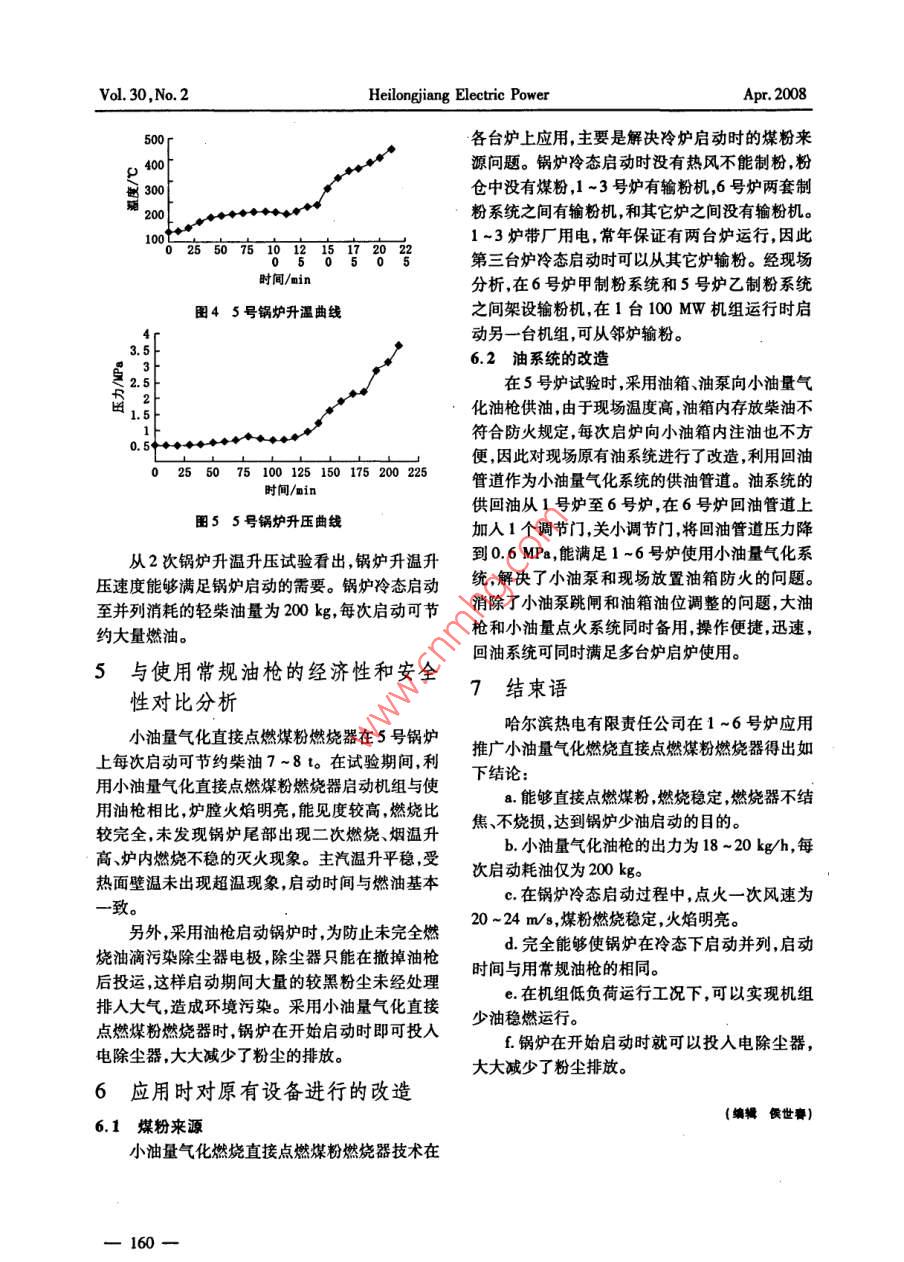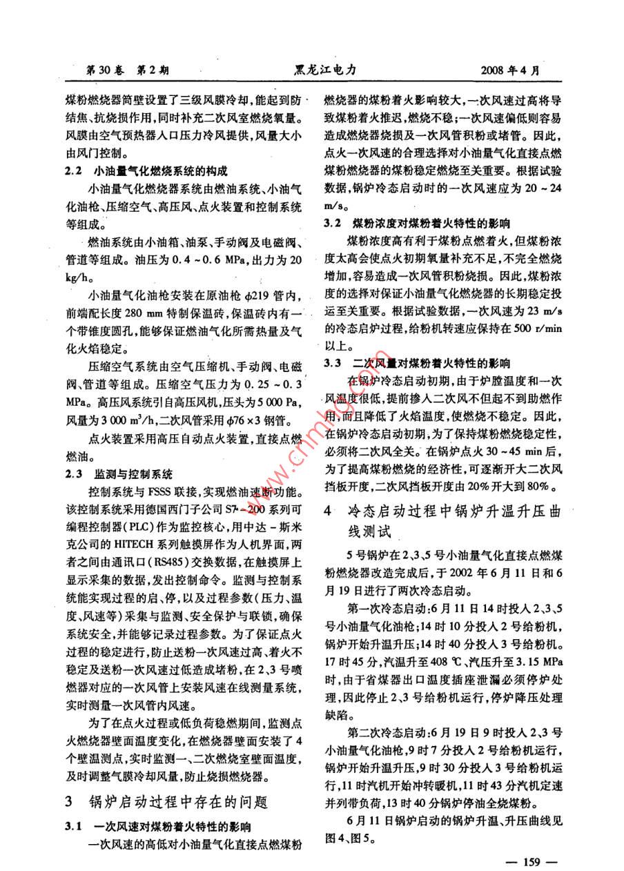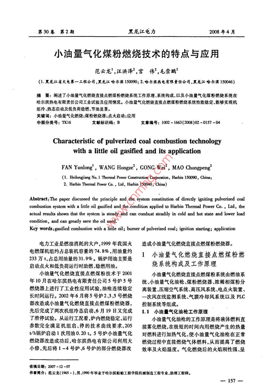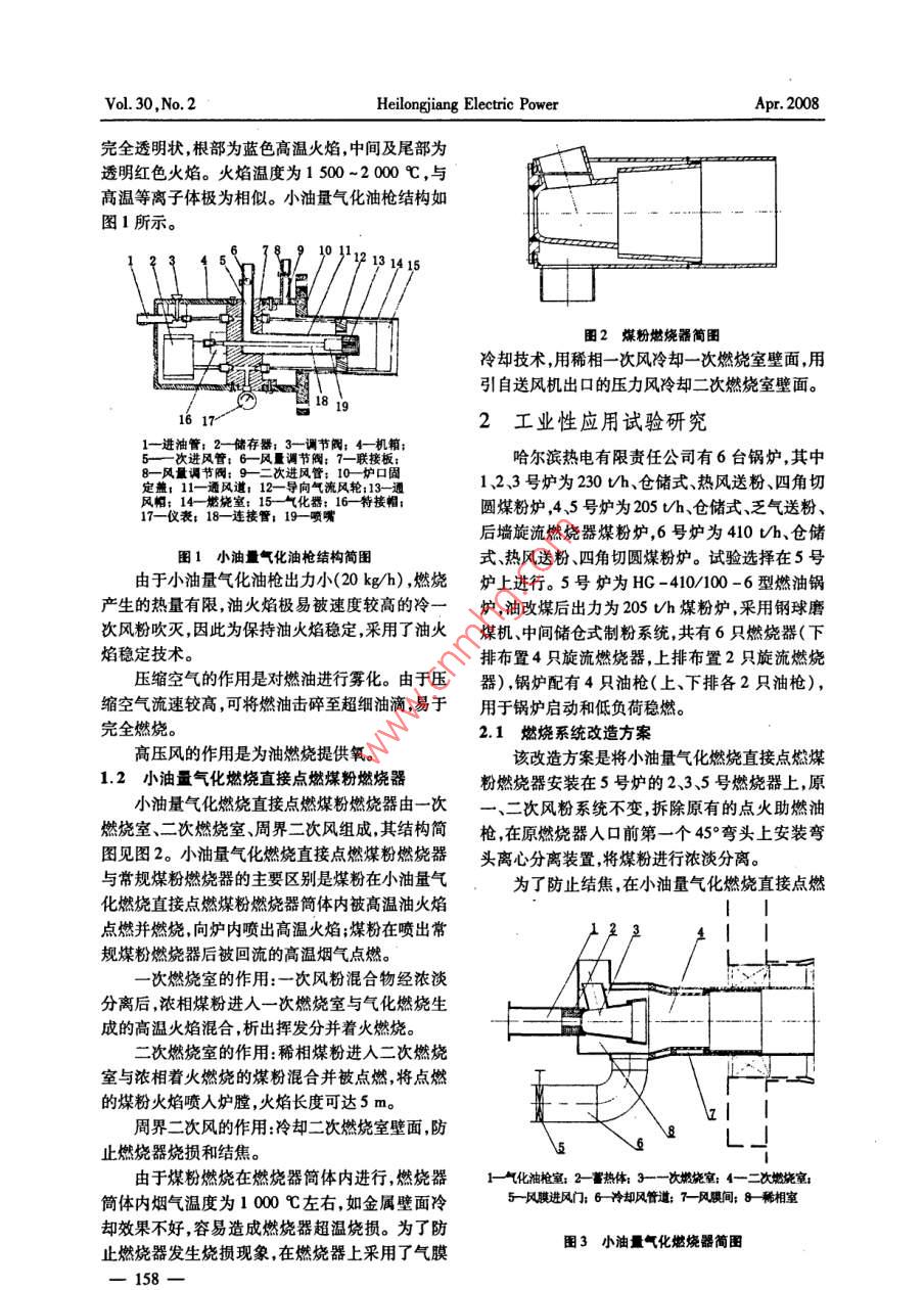 第30卷第2期黑龍江電力2008年4月小油量氣化煤粉燃燒技術(shù)的特點(diǎn)與應(yīng)用范云龍' ,汪洪澤”,宮偉”,毛崇鵬(1.黑龍江省火電第一工程公司,黑龍江哈爾濱150090; 2.哈爾濱熱電有限責(zé)任公司,黑龍江哈爾濱150046)摘要: 闡述了小油量氣化燃燒直接點(diǎn)燃煤粉燃燒系統(tǒng)工作原理、系統(tǒng)構(gòu)成,以及小油量氣化煤粉燃燒系統(tǒng)在哈爾濱熱電有限責(zé)任公司工業(yè)試驗(yàn)及應(yīng)用情況。小油量氣化燃燒直接點(diǎn)燃煤粉燃燒系統(tǒng)性能穩(wěn)定,能夠?qū)崿F(xiàn)機(jī)組冷、熱態(tài)啟動(dòng)及低負(fù)荷穩(wěn)燃,節(jié)油顯著。關(guān)鍵詞:小油量氣化燃燒;煤粉燃燒器;點(diǎn)火啟動(dòng);應(yīng)用中圖分類號(hào): TK16文獻(xiàn)標(biāo)識(shí)碼: B文章編號(hào): 1002 - 163(2008)02 -0157 -04Characteristic of pulverized coal combustion technologywith a little oil gasified and its applicationFAN Yunlong' , WANG Hongze2 , CONG Wei? , MAO Chongpeng'(1. Heilongjiang No. 1 Thermal Power Construction Corporntion, Harbin 150090, China;2. Harbin Thermal Power Co. , Ltd, Hurbin 150040, China)Abstract:The paper discussed the principle and the system constitutin of directly igniting pulverized coalcombustion system with a litle oil gasifed and the condition applied to Harbin Thermnal Power Co., Ltd, theactual results shown that the system is steady and can combust steadily in cold and hot state and lower loadcondition, and can grealy save the oil used.Key words:gasified combustion with a lttle oil; burmer of pulveried coal; ignition starting; application電力工業(yè)是燃油消耗的大戶, 1999年我國火造成小油量氣化燃燒直接點(diǎn)燃煤粉燃燒器。電燃煤機(jī)組約占總裝機(jī)容量的74.8% ,用油量約1小油量氣化燃燒直接點(diǎn)燃煤粉燃233萬t,占總用油量的31.9%。鍋爐用油主要是啟動(dòng)點(diǎn)火和低負(fù)荷運(yùn)行時(shí)助燃、穩(wěn)燃用油。燒系統(tǒng)構(gòu)成及工作原理小油量氣化燃燒直接點(diǎn)燃煤粉技術(shù)于2001小油量氣化燃燒直接點(diǎn)燃煤粉系統(tǒng)由燃油系年10月在哈爾濱熱電有限責(zé)任公司5號(hào)爐5號(hào)統(tǒng)、小油量氣化油槍煤粉燃燒器、濃稀相煤粉分燃燒器上進(jìn)行了工業(yè)性應(yīng)用試驗(yàn),油槍連續(xù)穩(wěn)定離裝置、壓縮空氣系統(tǒng)高壓風(fēng)系統(tǒng)、電點(diǎn)火裝置、長時(shí)間運(yùn)行。2002 年6月將5號(hào)爐2、3.5號(hào)燃燒一次風(fēng)在線監(jiān)測系統(tǒng)、氣膜冷卻風(fēng)系統(tǒng)以及PLC器改造成小油量氣化燃燒直接點(diǎn)燃煤粉燃燒器,控制系統(tǒng)等組成。先后完成了兩次機(jī)組冷態(tài)啟動(dòng),6月19日又完成1.1 小油量氣化油槍工作原理了滑停試驗(yàn)。從運(yùn)行工況看,爐內(nèi)燃燒穩(wěn)定,運(yùn)行小油量氣化油槍的工作原理是將液體燃料直參數(shù)完全滿足機(jī)組啟、停的技術(shù)曲線要求,205接霧化燃燒,在極短的時(shí)間內(nèi)用燃燒產(chǎn)生的熱量Vh鍋爐啟動(dòng)1次用油0.20 t。5號(hào)爐小油量氣化對燃料進(jìn)行加熱氣化,使小油量氣化油槍在正常燃燒器改造成功后,哈爾濱熱電有限公司利用大燃燒過程中直接燃燒氣體燃料,從而提高了燃燒小修,先后將1~4號(hào)爐、6號(hào)爐的部分燃燒器改效率及火焰溫度。氣化燃燒后的火焰剛性強(qiáng)、呈收稿日期: 20070 -12-07作者簡介:范云龍(1965 -) ,男,99年畢業(yè)于哈爾濱船舶工程學(xué)院機(jī)械制造工程專業(yè),助理工程師。-157-Vol. 30, No.2Heilongjiang Electric PowerApr. 2008完全透明狀,根部為藍(lán)色高溫火焰,中間及尾部為透明紅色火焰?;鹧鏈囟葹? 500~2000 C,與高溫等離子體極為相似。小油量氣化油槍結(jié)構(gòu)如圖1所示。12181415圖2煤粉燃燒器簡圄冷卻技術(shù),用稀相一次風(fēng)冷卻一-次燃燒室壁面,用引自送風(fēng)機(jī)出口的壓力風(fēng)冷卻二次燃燒室壁面。18 191617-2工業(yè)性應(yīng)用試驗(yàn)研究1一進(jìn)油管: 2-一儲(chǔ)存器: 3-調(diào)節(jié)閥: 4一機(jī)箱;哈爾濱熱電有限責(zé)任公司有6臺(tái)鍋爐,其中- ;風(fēng)量調(diào)節(jié)閥: 9-二次進(jìn)風(fēng)管: 10-爐口固1.2.3號(hào)爐為230Vh、倉儲(chǔ)式、熱風(fēng)送粉、四角切定蓋: 11一通風(fēng)道風(fēng)帽: 14-燃燒室: 15-氣化器: 16- 特接帽:圓煤粉爐,4、5號(hào)爐為205 Vh、倉儲(chǔ)式、乏氣送粉、17一儀表: 18- 連接管: 19一噴嘴后墻旋流燃燒器煤粉爐,6號(hào)爐為410 Vh、倉儲(chǔ)圖1小油量氣化油槍結(jié)構(gòu)簡圖式、熱風(fēng)送粉、四角切圓煤粉爐。試驗(yàn)選擇在5號(hào)由于小油量氣化油槍出力小(20 kg/h) ,燃燒爐上進(jìn)行。5號(hào)爐為HC -410/100 -6型燃油鍋產(chǎn)生的熱量有限,油火焰極易被速度較高的冷-一爐,油改煤后出力為205 Vh煤粉爐,采用鋼球磨次風(fēng)粉吹滅,因此為保持油火焰穩(wěn)定,采用了油火煤機(jī)、中間儲(chǔ)倉式制粉系統(tǒng),共有6只燃燒器(下焰穩(wěn)定技術(shù)。排布置4只旋流燃燒器,上排布置2只旋流燃燒壓縮空氣的作用是對燃油進(jìn)行霧化。由于壓器),鍋爐配有4只油槍(上、下排各2只油槍),縮空氣流速較高,可將燃油擊碎至超細(xì)油滴,易于用于鍋爐啟動(dòng)和低負(fù)荷穩(wěn)燃。完全燃燒。2.1燃燒系統(tǒng)改造方案高壓風(fēng)的作用是為油燃燒提供氧。該改造方案是將小油量氣化燃燒直接點(diǎn)燃煤1.2小油量 氣化燃