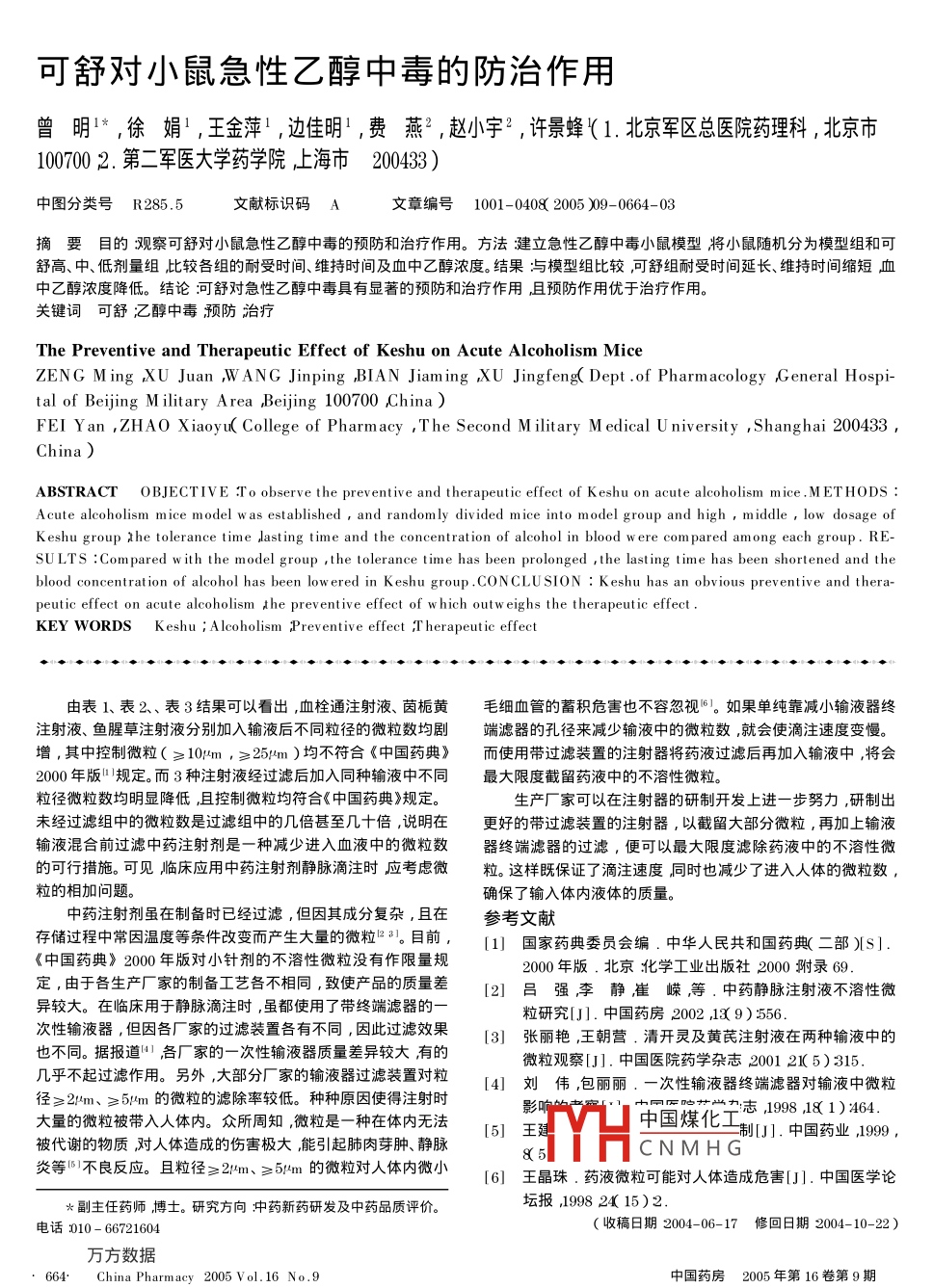 可舒對(duì)小鼠急性乙醇中毒的防治作用曾明*,徐娟,王金萍↓,邊佳明,費(fèi)燕2,趙小宇2,許景蜂(1.北京軍區(qū)總醫(yī)院藥理科,北京市1007002.第二軍醫(yī)大學(xué)藥學(xué)院上海市200439)中圖分類號(hào)R285.5文獻(xiàn)標(biāo)識(shí)碼文章編號(hào)1001-04082005)9-0664-03摘要目的觀察可舒對(duì)小鼠急性乙醇中毒的預(yù)防和治療作用。方法建立急性乙醇中毒小鼠模型將小鼠隨機(jī)分為模型組和可舒高、中、低劑量組比較各組的耐受時(shí)間、維持時(shí)間及血中乙醇濃度。結(jié)果與模型組比較可舒組耐受時(shí)間延長(zhǎng)、維持時(shí)間縮短血中乙醇濃度降低。結(jié)論河舒對(duì)急性乙醇中毒具有顯著的預(yù)防和治療作用且預(yù)防作用優(yōu)于治療作用。關(guān)鍵詞可舒乙醇中毒預(yù)防治療The Preventive and Therapeutic Effect of Keshu on Acute Alcoholism MiceZENG Ming XU Juan , WANG Jinping bian Jiam ing XU Jingfeng( Dept of Pharmacology General Hospital of Beijing M ilitary Area Beijing 100700 ChinaFEI Y an ZHAO Xiaoyu( College of Pharmacy The Second M ilitary Medical U niversity Shanghai 200433ChinaABSTRACT OBJECTIVE To observe the preventive and therapeutic effect of Keshu on acute alcoholism mice, METHODSAcute alcoholism mice model w as established and randomly divided mice into model group and high middle, low dosage ofKeshu group he tolerance time lasting time and the concentration of alcohol in blood w ere com pared among each group. RESULTS: Compared w ith the model group the tolerance time has been prolonged the lasting time has been shortened and theblood concentration of alcohol has been low ered in Keshu group. CONCLUSION Keshu has an obvious preventive and therapeutic effect on acute alcoholism the preventive effect of w hich outw eighs the therapeutic effectKEY WORDS Keshu Alcoholism pReventive effect Therapeutic effect由表1、表2、表3結(jié)果可以看出,血栓通注射液、茵梔黃毛細(xì)血管的蓄積危害也不容忽視。如果單純靠減小輸液器終注射液、魚(yú)腥草注射液分別加入輸液后不同粒徑的微粒數(shù)均劇端濾器旳孔徑來(lái)減少輸液中的微粒數(shù),就會(huì)使滴注速度變慢。增,其中控制微粒(≥10}m,≥25m)均不符合《中國(guó)藥典》而使用帶過(guò)濾裝置的注射器將藥液過(guò)濾后再加入輸液中,將會(huì)2000年版規(guī)定。而3種注射液經(jīng)過(guò)濾后加入同種輸液中不同最大限度截留藥液中的不溶性微粒。粒徑微粒數(shù)均明顯降低,且控制微粒均符合《中國(guó)藥典》規(guī)定。生產(chǎn)廠家可以在注射器的研制開(kāi)發(fā)上進(jìn)一步努力,研制出未經(jīng)過(guò)濾組中的微粒數(shù)是過(guò)濾組中的幾倍甚至幾十倍,說(shuō)明在更好的帶過(guò)濾裝置的注射器,以截留大部分微粒,再加上輸液輸液混合前過(guò)濾中藥注射劑是一種減少進(jìn)入血液中的微粒數(shù)器終端濾器的過(guò)濾,便可以最大限度濾除藥液中的不溶性微的可行措施??梢?jiàn)臨床應(yīng)用中藥注射劑靜脈滴注時(shí)應(yīng)考慮微粒。這樣既保證了滴注速度同時(shí)也減少了進(jìn)入人體的微粒數(shù),粒的相加問(wèn)題確保了輸入體內(nèi)液體的質(zhì)量。中藥注射劑雖在制備時(shí)已經(jīng)過(guò)濾,但因其成分復(fù)雜,且在參考文獻(xiàn)存儲(chǔ)過(guò)程中常因溫度等條件改變而產(chǎn)生大量的微粒23。目前[1」國(guó)家藥典委員會(huì)編.中華人民共和國(guó)藥典二部)S《中國(guó)藥典》2000年版對(duì)小針劑的不溶性微粒沒(méi)有作限量規(guī)2000年版.北京北學(xué)工業(yè)出版社2000附錄69定,由于各生產(chǎn)「家的制備工藝各不相同,致使產(chǎn)品的質(zhì)量差2]呂強(qiáng)李靜崔嶸簿,中藥?kù)o脈注射液不溶性微異較大。在臨床用于靜脈滴注時(shí),雖都使用了帶終端濾器的一粒研究[J.中國(guó)藥房2002,139)556次性輸液器,但因各廠家的過(guò)濾裝置各有不同,因此過(guò)濾效果[3]張麗艷王朝營(yíng).清開(kāi)靈及黃芪注射液在兩種輸液中的也不同。據(jù)報(bào)道,各廠家的一次性輸液器質(zhì)量差異較大有的微粒觀察[J].中國(guó)醫(yī)院藥學(xué)雜志20012K5)315幾乎不起過(guò)濾作用。另外大部分廠家的輸液器過(guò)濾裝置對(duì)粒41劉偉包麗麗.一次性輸液器終端濾器對(duì)輸液中微?!?μm、≥5}m的微粒的濾除率較低。種種原因使得注射時(shí)影響需志199881)464大量的微粒被帶入人體內(nèi)。眾所周知,微粒是一種在體內(nèi)無(wú)法被代謝的物質(zhì)對(duì)人體造成的傷害極大能引起肺肉芽腫靜脈51王中國(guó)煤化工制[J].中國(guó)藥業(yè),1999CNMHG炎等0不良反應(yīng)。且粒徑≥2m、≥5m的微粒對(duì)人體內(nèi)微小「6]王晶珠.藥液微??赡軐?duì)人體造成危害[].中國(guó)醫(yī)學(xué)論次副主任藥師博士。研究方向中藥新藥研發(fā)及中藥品質(zhì)評(píng)價(jià)。壇報(bào)19982415)2電話10-66721604(收稿日期2004-06-17修回日期2004-10-22)China pharmacy 2005 Vol 16 No 9中國(guó)藥房2005年第16卷第9期可舒是以李東垣《脾胃論》中的葛花解酲湯為基礎(chǔ)方經(jīng)加吸收度偵″同1.6.I"項(xiàng)方法制備。從標(biāo)準(zhǔn)曲線上查得每一吸收減由葛花、人參、陳皮等中藥組成的方劑。為研究其對(duì)乙醇急性值所對(duì)應(yīng)的乙醇濃度值再乘以稀釋倍數(shù)即得相應(yīng)血中乙醇濃中毒的治療作用,筆者通過(guò)建立動(dòng)物模型,觀察可舒