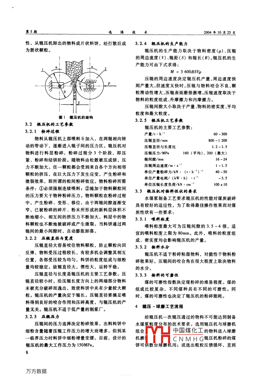 第5期選煤技術(shù)No. 52004年10月COAL PREPARATION TECHNOLOGYOct 2004文章編號(hào):1001-3571(2004)03-0007-03水煤漿生產(chǎn)新工藝張占棟,王柱勇2,劉珊2(1.撫順礦務(wù)局,遼寧撫順1130002.國(guó)家水煤漿工程技術(shù)研究中心,北京100013)摘要:介紹了采用輥壓機(jī)制備水煤漿的新工藝。該工藝可按煤質(zhì)調(diào)整工藝參數(shù),充實(shí)中間工序完善傳統(tǒng)制漿工藝流程,可用于新建或改造現(xiàn)有水煤漿廠,實(shí)現(xiàn)水煤漿廠單一系統(tǒng)大型化。關(guān)鍵詞:水煤漿;制備;輥壓機(jī);能耗;投資中圖分類號(hào):TQ536文獻(xiàn)標(biāo)識(shí)碼:A1概述自水媒漿技術(shù)問世以來,經(jīng)過20年研究開發(fā),2國(guó)內(nèi)外制漿磨機(jī)技術(shù)現(xiàn)狀我國(guó)的水煤漿技術(shù)水平和產(chǎn)品質(zhì)量均已居世界先進(jìn)目前,國(guó)內(nèi)外制漿工藝的磨碎設(shè)備大都采用球行列。目前,我國(guó)的年制漿生產(chǎn)能力達(dá)400多萬t,磨機(jī)。球磨機(jī)性能穩(wěn)定,運(yùn)行可靠。缺點(diǎn)是能耗3座大型制漿廠的制漿能力達(dá)到50萬/a以上。水高,噸漿耗電30~40kW·h;電能利用率低,有煤漿產(chǎn)品已在7臺(tái)電站鍋爐和50多臺(tái)工業(yè)鍋爐以效能耗不足5%。及100多臺(tái)各種窯爐上燃用,并取得一定經(jīng)濟(jì)效現(xiàn)有制漿廠多采用反擊式破碎機(jī)與球磨機(jī)聯(lián)合益。還有一些企業(yè)正在新建或擴(kuò)大制漿廠,水煤漿工藝系統(tǒng)。由于破碎機(jī)的出口粒度比較粗,進(jìn)入球用戶群呈不斷擴(kuò)大之勢(shì),極大地促進(jìn)了水煤漿產(chǎn)業(yè)磨機(jī)磨碎還需要很高的能耗。因此,需采用新型破發(fā)展碎設(shè)備,使其出口物料粒度達(dá)到或接近制漿粒度的對(duì)水煤漿而言,過去人們關(guān)心的是產(chǎn)品質(zhì)量、技術(shù)要求,從而減輕球磨機(jī)的負(fù)荷,部分或全部取技術(shù)性能、環(huán)境影響、設(shè)備可靠性、運(yùn)行安全性和代球磨機(jī)的功能,首選設(shè)備是輥壓機(jī)市場(chǎng)價(jià)格?,F(xiàn)在更關(guān)心的是企業(yè)燃用水煤漿的經(jīng)濟(jì)效益和社會(huì)效益。水煤漿代替燃油有很高的經(jīng)濟(jì)效3輥壓機(jī)益和社會(huì)效益,但與燃用煤粉比較,盡管燃用水煤輥壓機(jī)是20世紀(jì)80年代中期發(fā)展起來一種新漿的環(huán)境效益顯著,但其價(jià)格偏高,因此,未來水型粉磨設(shè)備,廣泛用于水泥工業(yè)。水煤漿制漿工藝煤漿技術(shù)的發(fā)展重點(diǎn)應(yīng)是提高產(chǎn)品質(zhì)量,降低生產(chǎn)引進(jìn)輥壓機(jī),只要按水煤漿成漿的技術(shù)要求,調(diào)整成本,擴(kuò)大應(yīng)用范圍。輥壓機(jī)的工藝參數(shù),完全可以取得提高產(chǎn)量、降低水煤漿價(jià)格偏高的主要原因是運(yùn)輸費(fèi)、添加劑能耗的效果費(fèi)和動(dòng)力(電)費(fèi)用高。為了提高水煤漿的市場(chǎng)3.1桃壓機(jī)的工作原理競(jìng)爭(zhēng)力,需要采取如下措施:①降低運(yùn)輸費(fèi)。關(guān)鍵輥壓機(jī)的主要部件是兩個(gè)直徑相同、軸線平行是要縮短煤源地、制漿廠與用戶之間的運(yùn)輸距離,的圓柱1)。兩個(gè)輥?zhàn)愚D(zhuǎn)速(n)相同,轉(zhuǎn)向制漿廠的選址應(yīng)就近用戶或用戶群。②降低添加劑相反,通過4個(gè)滾動(dòng)軸承安裝在一個(gè)機(jī)架上,其中費(fèi)用。有關(guān)部門應(yīng)加速開發(fā)高效、廉價(jià)環(huán)保型添加劑,促進(jìn)水煤漿產(chǎn)業(yè)的發(fā)展。③降低動(dòng)力費(fèi)。水煤個(gè)是固定輥(1),另一個(gè)是活動(dòng)輥(2),兩輥漿工藝系統(tǒng)中,破碎和磨碎設(shè)備的動(dòng)力消耗占制漿之間的間隙通過液壓系統(tǒng)調(diào)節(jié)。其工作過程為:電總能耗的70%以上,因此,應(yīng)從更新改造破碎磨動(dòng)機(jī)經(jīng)過減速器帶動(dòng)輥?zhàn)愚D(zhuǎn)動(dòng),待粉磨的松散物料碎工藝入手,采取有效的技術(shù)措施,開發(fā)新的制漿由上方喂料給人雙輥的間隙(S)中,由于雙輥表面向下運(yùn)動(dòng),物料隨著輥面向下移動(dòng),在A處收稿日期:2004-02-06(也就是拉入角α)開始受到破碎和擠壓,形成密作者簡(jiǎn)介:張占棟(1931-),男,河北省唐山市人,教授實(shí)中國(guó)煤化工粒內(nèi)部應(yīng)力達(dá)到破級(jí)高級(jí)工程師,原撫順礦務(wù)局副總工程師。電話:04132532391。CNMH(,粒徑變小或呈粉狀,以郃分稠粒廣生儇小襞毀,增大了物料的易磨第5期2004年10月25日性,從輥壓機(jī)卸出的物料成片狀料餅,經(jīng)打散后成3.2.4輥壓機(jī)的生產(chǎn)能力為散狀顆粒。輥壓機(jī)的生產(chǎn)能力取決于物料密度(p)、壓輥的周邊速度(V)、輥距(S)和輥長(zhǎng)(B)。輥壓機(jī)的生產(chǎn)能力可由下式求得M=3 600BSVp壓輥的周邊速度決定輥壓機(jī)產(chǎn)量,周邊速度快則產(chǎn)量大。但速度太快時(shí),壓輥與物料咬合不良,顆?;瑒?dòng)性增大,壓輥表面磨損激增。壓輥速度取決于物料的粒度組成、外摩擦力和內(nèi)摩擦力。壓輥間隙大小取決于產(chǎn)量物料的密實(shí)度、平均粒度和最大粒度。圖1輥壓機(jī)的結(jié)構(gòu)3.2.5概壓機(jī)工藝參數(shù)3.2輥壓機(jī)的工藝參數(shù)輥壓機(jī)的主要工藝參數(shù):3.2.1粉碎過程產(chǎn)量/t:h60-300物料從輥壓機(jī)上部喂料斗加入,在兩輥相向轉(zhuǎn)壓輥直
