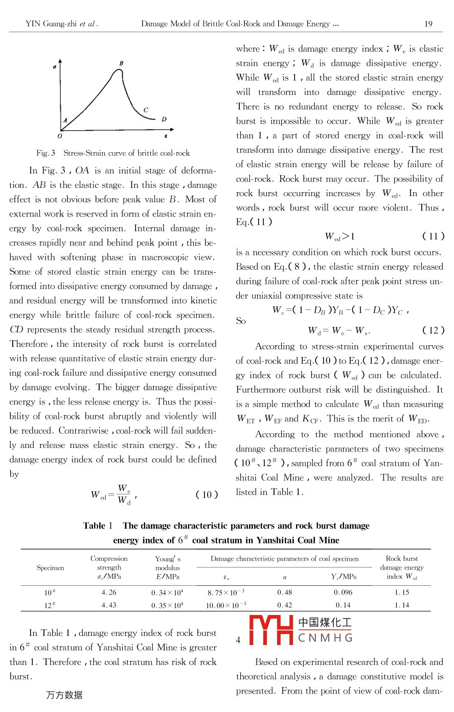 Jun.2003Journal of China University of Mining TechnologyVol 13 NoDamage Model of Brittle Coal-Rock andDamage Energy Index of rock burstYIN Guang-zh(尹光志y2, ZHANG Dong-ming張東明y2WEⅠ Zuo-an(魏作安y2,LIDg-e(李東偉y2(1. Key Lab. for the Exploitation of Southwest Resources and the EnvironmenDisaster Control Engineering, Ministry of Education Chongqing University Chongqing 400044, China2. College of Resource and Environmental Sciences Chongqing University Chongqing 400044, ChinaAbstract: Based on the mechanical experiment of brittle coal-rock and the damage mechanical theory a damage modelas established. Coal-Rock damage mechanical characteristic was researched. Furthermore interior energy transformation mechanism of rock was analyzed from the point of view of damage mechanics and damage energy release rate ofbrittle coal rock was derived. By analyzing the energy transformation of rock burst a new conception damage energyndex of rock burst was put forward. The condition of rock burst was also establishedKey words: coal-rock damage damage energy index rock burstCLC number: TD32 Document code: A Article ID: 1006-1266 2003 X1-0016-0ck from yanshitai coal mine, cho1 IntroductionThen, damage energy index of rock burst and its ocCoal-Rock is a kind of brittle material with o-curring condition are put forwardriginal damage. Its macrofracture failure is a result 2 Damage Constitutive Equation of Brittle Coalof nucleation development and coalescence of interiRockor microcracks. This could be viewed as evolvement, cumulation of damage. Since dougilf 1] apThere are lots of cracks in coal-rock. Under apto rock and concrete materials, Dragorf 2 and other scholars have researched on plied load cracks generate, propagate and interactcontinuous damage of rock and concrete according to with each other to give rise to a degradation of intethe principle and method of damage mechanics andrior characteristics. These phenomena lead to a corablished a correspondingmodel. In China, there are some scholars who have responding macroscopic mechanical responsedone some works to rock damage mechanics. Dong- Macroscopic fracture phenomena of coal-rock are as-cong 3 ]and Xia Mengferf4 5] led damage mechanicssociated with evolvement of microstructures and mito metal materials. Lingjianming 6] and KrajcioviC 7researched on damage mechanics characteristics andcro flawsconstitutive equations of rocklike materials and gotIn 1980, while researching on cracksome useful achievement. Damage constitutive equa- tion and its regularities of distribution about shaletion is established in this paper according to the exund中國煤化 Ty and Kipp3 presentedperimental result of uniaxial compressive test of coal- theHCNMH Ger unit volume in rockReceived date 2002-09-2Foundation item: Doctoral fund of ministry of education, China( 2000061115) the teaching and research award program for outstandingoung teachers in higher education institutions of MOe, P. R C., TRAPOYT)Biography: YIN Guang-zh( 1962-), male from Xichang Prowince, professor Ph. D, doctorial tutor engaged in the reseachon on rock me- and mining engineeringYIN Guang-zhi et alDamage Model of Brittle Coal-Rock and Damage Energyand strain met a relation as followsial compressive test, the constitutirelation parameters Es and n are determined and calhere:N is the cracks per unit volume; eI is culatedstrain k and m are constants of materialig. I and Fig. 2 show typical stress-strain exIt was supposed that damage variable under u- perimental curve under uniaxial load and theoreticalbiaxial compression load isdamage constitutive model curve separately of coal(1) rock specimens 10"and 12 from coal stratum 6"inwhere n is a constant of material: e is axial com- Yanshitai Coal Mine. From Fig. 1 and Fig. 2, theEq (5) could defeati v ccording to conception of effective stress, ef- scribe preferably stress-strain curve of brittle coalck undeaxialBased on equivalence strain principle that pre-sented by Lemaitre, the stain caused by stress ondamaged material is equivalent to strain caused by0255075100125effective stress on undamaged material. That isFig. 1 Brittle coal-rock damage constitutiveD(2)lel and experimental curves( 10 specimencurvewhere: o is stress; E is Youngs modulus'E=EExperimen(1-D) is youngs modulus of damaged material named as effective young s modulusEg.(2)could be expressed byF(1-D025507.5100125Eg. (3)represents the damage constitutive relationof damaged materialFig 2 Brittle coal-rock damage constitutiveWhile substituted D in Eq (3 )with Eq ( 1)model and experimental curves( 12"specimendamage constitutive relation of rock under uniaxial 3 Damage Energy Release Rate of Brittle Coalcompressive load may be expressed byRock and Damage Energy Index of Rock burstg=E(1-me")For damaged material, its elastic strain energyifand elastic residual energy arew(D)=le:E(D):s,(6)thenandThus the damage variable could be showed byoVoD)=Jo:E-(D)Damage energy release rate isAccording to Eg. (3)and Eq cconstitutive equation of rock under uniaxial stress is Y PaDpaD 2ee: dE(D).edye 1dD中國煤化工 and strain equivalenceEvolution equation of damage variable isprCN MH Grial it is known thatσ=(Ⅰ-D)1:a=MD):a,E: M(D)E(D)where Es and n are material parameters of rockFo數(shù)據(jù)(5) and experimental results of E(D)=E:MD)Journal of China University of Mining TechnologyVol 13 No. 1E(D=M(D):Ematerial has been destroyed while D<1. If damageand M(D=E:E(D)damage energy release rate is ywhere: E(D ) is effective stress tensor M(D ) is e2(1-D2)(9)ual to( I-D)After mathematical manipulation damage enBy Eg (9), failure of coal-rock not only isergy release rate is deducedcaused by state of stress but also depend on evolve-1+yment and accumulation of damage2E(1-D)2F(1-D)In uniaxial compressive experimentsotropic damage energy release rate could bededuced too according to eq (6), that is&e: FweS1=1.(8)If axial strain is e when coal-rock fail, d. andwhere we is elastic strain energy densit