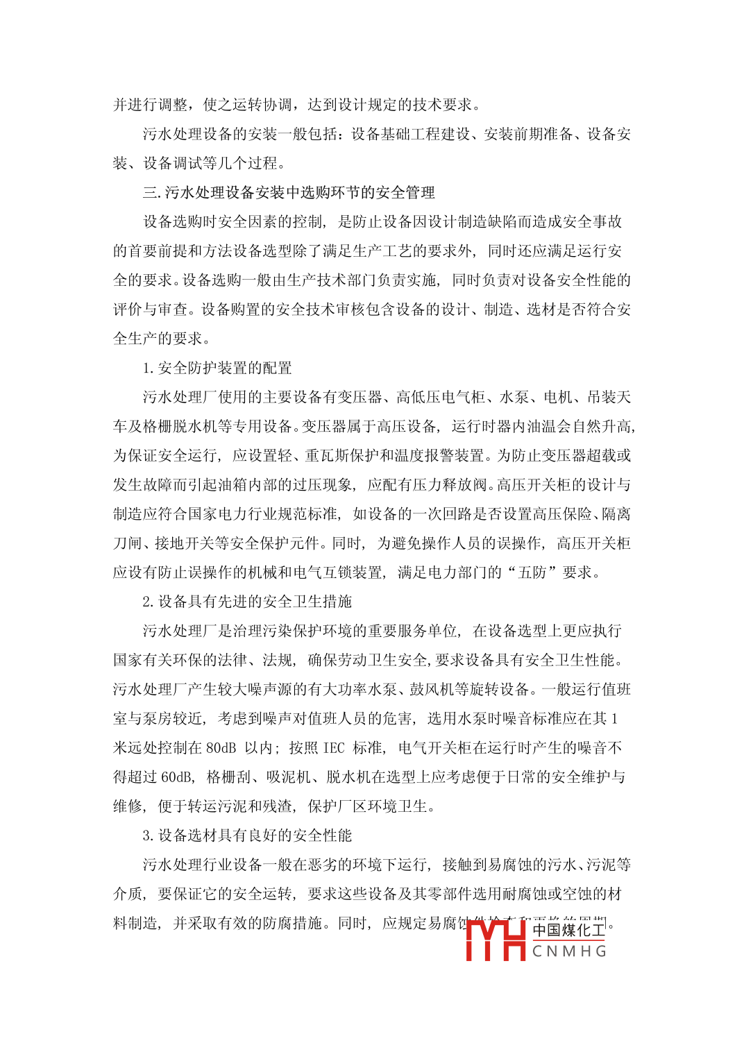 評(píng)析污水處理設(shè)備安裝的安全管理李靖棗莊甘霖實(shí)業(yè)有限公司井水處理廠山東 277012[摘要]近年國家環(huán)保執(zhí)法力度不斷加大,近年更是把污水治理作為環(huán)保工作的重中之重,各類城市污水處理廠近年更是如雨后春筍般的涌現(xiàn)。為保證污水處理廠的正常運(yùn)行和安全生產(chǎn),需對設(shè)備進(jìn)行安全管理。本文主要探討了污水處理設(shè)備的安全管理中的問題,對設(shè)備選購以及使用前后安全管理提出了一套行之有效的安全控制與管理方法,闡述了污水處理設(shè)備安裝的安全管理的一席問題。[關(guān)鍵詞]污水處理,設(shè)備安裝,安全管理中圖分類號(hào): U664.9+2文獻(xiàn)標(biāo)識(shí)碼: A文章編號(hào):一.前言近年,國家意識(shí)到保護(hù)環(huán)境是實(shí)施我國可持續(xù)發(fā)展的關(guān)鍵,并將防治水污染作為全國性重點(diǎn)。所以,建設(shè)城市污水處理廠已是刻不容緩的事。污水處理設(shè)備的安全、正常運(yùn)行對污水處理廠實(shí)現(xiàn)良好的處理效果非常關(guān)鍵,應(yīng)引起污水處理企業(yè)重視。因此,污水廠只有實(shí)行設(shè)備的安全管理,建立有效的制度和采用科學(xué)的管理方法,才能保證設(shè)備的安全運(yùn)行。二.污水處理設(shè)備安裝的含義1.當(dāng)前城市污水處理廠設(shè)備組成目前,城市污水處理工程大多采用氧化溝生物處理技術(shù)工藝。整個(gè)工程分為兩大部分,主體工程包括格柵間,提升泵房,出水井,沉砂池,計(jì)量槽,氧化溝,二沉池,尾部泵房等處理系統(tǒng)和污泥濃縮池,脫水機(jī)房等泥處理系統(tǒng)工程;附屬工程包括廠外截污管道,廠外供電等工程。主要設(shè)備有細(xì)格柵,除砂器,氧化溝曝氣轉(zhuǎn)蝶,污泥回流泵,二沉池刮泥機(jī)等設(shè)備。.2.污水處理機(jī)械設(shè)備流程污水處理機(jī)械設(shè)備進(jìn)行單體機(jī)械設(shè)備的安裝檢查。檢查合格后對設(shè)備進(jìn)行清洗,待廠區(qū)內(nèi)各類工藝管、線、軌道、傳送裝置安裝完成并將設(shè)備組成功能系統(tǒng)后.對單機(jī)設(shè)備進(jìn)行空載試驗(yàn)并調(diào)整其動(dòng)態(tài)技術(shù)參數(shù),中國煤化工式驗(yàn)MHCNMHG并進(jìn)行調(diào)整,使之運(yùn)轉(zhuǎn)協(xié)調(diào),達(dá)到設(shè)計(jì)規(guī)定的技術(shù)要求。污水處理設(shè)備的安裝一般包括: 設(shè)備基礎(chǔ)工程建設(shè)、安裝前期準(zhǔn)備、設(shè)備安裝、設(shè)備調(diào)試等幾個(gè)過程。三.污水處理設(shè)備安裝中選購環(huán)節(jié)的安全管理設(shè)備選購時(shí)安全因素的控制,是防止設(shè)備因設(shè)計(jì)制造缺陷而造成安全事故的首要前提和方法設(shè)備選型除了滿足生產(chǎn)工藝的要求外,同時(shí)還應(yīng)滿足運(yùn)行安全的要求。設(shè)備選購一般由生產(chǎn)技術(shù)部門負(fù)責(zé)實(shí)施,同時(shí)負(fù)責(zé)對設(shè)備安全性能的評(píng)價(jià)與審查。設(shè)備購置的安全技術(shù)審核包含設(shè)備的設(shè)計(jì)、制造、選材是否符合安全生產(chǎn)的要求。1.安全防護(hù)裝置的配置污水處理廠使用的主要設(shè)備有變壓器、高低壓電氣柜、水泵、電機(jī)、吊裝天車及格柵脫水機(jī)等專用設(shè)備。變壓器屬于高壓設(shè)備,運(yùn)行時(shí)器內(nèi)油溫會(huì)自然升高,為保證安全運(yùn)行,應(yīng)設(shè)置輕、重瓦斯保護(hù)和溫度報(bào)警裝置。為防止變壓器超載或發(fā)生故障而引起油箱內(nèi)部的過壓現(xiàn)象,應(yīng)配有壓力釋放閥。高壓開關(guān)柜的設(shè)計(jì)與制造應(yīng)符合國家電力行業(yè)規(guī)范標(biāo)準(zhǔn),如設(shè)備的一次回路是否設(shè)置高壓保險(xiǎn)、隔離刀閘、接地開關(guān)等安全保護(hù)元件。同時(shí),為避免操作人員的誤操作,高壓開關(guān)柜應(yīng)設(shè)有防止誤操作的機(jī)械和電氣互鎖裝置,滿足電力部門的“五防”要求。2.設(shè)備具有先進(jìn)的安全衛(wèi)生措施污水處理廠是治理污染保護(hù)環(huán)境的重要服務(wù)單位,在設(shè)備選型上更應(yīng)執(zhí)行國家有關(guān)環(huán)保的法律、法規(guī),確保勞動(dòng)衛(wèi)生安全,要求設(shè)備具有安全衛(wèi)生性能。污水處理廠產(chǎn)生較大噪聲源的有大功率水泵、鼓風(fēng)機(jī)等旋轉(zhuǎn)設(shè)備。-般運(yùn)行值班室與泵房較近,考慮到噪聲對值班人員的危害,選用水泵時(shí)噪音標(biāo)準(zhǔn)應(yīng)在其1米遠(yuǎn)處控制在80dB以內(nèi);按照IEC標(biāo)準(zhǔn),電氣開關(guān)柜 在運(yùn)行時(shí)產(chǎn)生的噪音不得超過60dB,格柵刮、吸泥機(jī)、脫水機(jī)在選型上應(yīng)考慮便于日常的安全維護(hù)與維修,便于轉(zhuǎn)運(yùn)污泥和殘?jiān)?,保護(hù)廠區(qū)環(huán)境衛(wèi)生。3.設(shè)備選材具有良好的安全性能污水處理行業(yè)設(shè)備一般在惡劣的環(huán)境下運(yùn)行,接觸到易腐蝕的污水、污泥等介質(zhì),要保證它的安全運(yùn)轉(zhuǎn),要求這些設(shè)備及其零部件選用耐腐蝕或空蝕的材料制造,并采取有效的防腐措施。同時(shí),應(yīng)規(guī)定易腐鈞” 中國煤化工。YHCNMHG四.設(shè)備使用中的安全管理1.交接班制度:污水處理廠-般 是實(shí)行24h連續(xù)運(yùn)行,為保養(yǎng)好