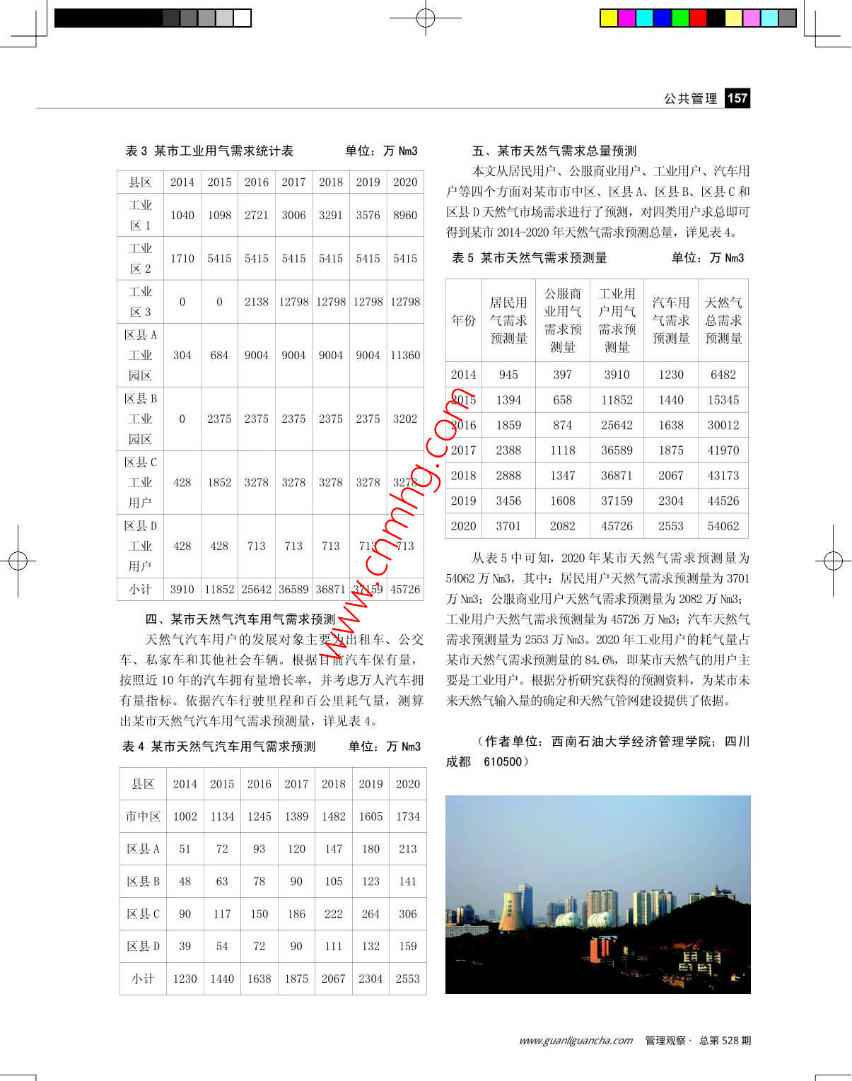 一φ-156公共管理關(guān)于某市天然氣需求預(yù)測分析亢億林王荔摘要:某市隨著社會(huì)經(jīng)濟(jì)的發(fā)展,產(chǎn)生了較為嚴(yán)二、某市公服商業(yè)用氣需求預(yù)測重的生態(tài)環(huán)境問題,根據(jù)市政府的統(tǒng)-部署,將引入天公服商業(yè)用氣包括飯店、酒店、賓館、洗浴場所、然氣改善能源消費(fèi)結(jié)構(gòu)。作者通過調(diào)查研究獲取相關(guān)寫字樓、 學(xué)校、醫(yī)院等公共建筑和商業(yè)企業(yè)等用戶的用資料,并采用科學(xué)的研究方法,對某市未來天然氣市氣量。 公服商業(yè)用氣需求量一般根據(jù)不同類型用戶的實(shí)場需求量進(jìn)行預(yù)測,為制定正確的經(jīng)濟(jì)決策提供依據(jù)。際燃料耗量調(diào) 查進(jìn)行計(jì)算,但是,由于缺少實(shí)際燃料消關(guān)鍵詞:居民用戶公服商業(yè)用戶 工業(yè)用戶耗數(shù)據(jù),因此采用占居民用氣比例進(jìn)行計(jì)算,不同城市車用戶天然氣需求預(yù)測公服商業(yè)占居民用氣的比例不一一樣。 參考國內(nèi)同類城市情況,測算得到公服商業(yè)2014年至2020年用氣需求量,為了實(shí)現(xiàn)社會(huì)經(jīng)濟(jì)的持續(xù)穩(wěn)定、清潔高效發(fā)展,詳見表2。某市“十二五”能源發(fā)展規(guī)劃提出,要通過引入天然表2某市公服商業(yè)用戶用氣需求預(yù)測量單位: 萬Nm3氣改善能源消費(fèi)結(jié)構(gòu)。本文在實(shí)地調(diào)查基礎(chǔ)上,根據(jù)收集的相關(guān)資料,采用線性回歸分析法、二次指數(shù)平縣區(qū)| 2014| 2015| 2016| 2017| 2018| 2019| 2020滑法及相關(guān)系數(shù)法,分別從居民用戶、公服商業(yè)用戶、市中區(qū)286| 504| 649| 816 960| 1126| 1386工業(yè)用戶、汽車用戶等四個(gè)方面預(yù)測了某市2014 -2020年天然氣市場需求量。區(qū)縣A | 1825| 426131| 106| 166一、 某市居民用氣需求預(yù)測區(qū)縣B| 19| 22| 341659| 73| 110目前某市的市中區(qū)、區(qū)縣A、區(qū)縣B、區(qū)縣C、區(qū)區(qū)縣C| 5584| 111| 14073| 208| 273縣D城市燃?xì)饫脷庠匆砸夯蜌鉃橹?,少量使用天然氣。由于少量居民使用天然氣,因此不能利用天區(qū)縣D| 1923| 35574| 914然氣歷年的消耗量來預(yù)測未來天然氣的需求量,只能小計(jì)39758 874| 1118| 1347 1608| 2082根據(jù)某市歷年人口和城鎮(zhèn)化率相關(guān)數(shù)據(jù),采用回歸分析和指數(shù)平滑法來預(yù)測2014年-2020年某市城市人三、某市工業(yè)用戶用氣需求預(yù)測口的數(shù)量,然后根據(jù)每人每年用氣量和逐年增加的氣某市是一座資源型工業(yè)城市,水電、釩鈦、銅鎳、化率,測算出某市居民天然氣需求量,詳見表1。沿鋅、稀土、磷化工、烤煙是某市主要產(chǎn)業(yè),同時(shí)這些支柱產(chǎn)業(yè)也是某市工業(yè)產(chǎn)業(yè)天然氣利用的主要方表1某市居民用戶用氣需求預(yù)測量單位:萬Nm3向。某市工業(yè)產(chǎn)業(yè)結(jié)構(gòu)基本是以稀土精礦冶煉、陶瓷縣區(qū)2014| 2015| 2016| 2017| 2018| 2019 2020加工和釩鈦磁鐵礦資源綜合利用為核心,由于缺乏天市中區(qū)716| 1008| 1297 1632| 1918| 2251| 2310然氣資源,某市工業(yè)企業(yè)的能源結(jié)構(gòu)以電力、煤炭為主。市中區(qū)作為- - 個(gè)優(yōu)秀旅游城市,在節(jié)能減排的壓區(qū)縣A | 2852| 104 151| 205| 265| 33力面前,應(yīng)將天然氣作為今后某市工業(yè)用燃料的主要區(qū)縣B| 2756| 85| 116 | 147| 183 220能源。通過對市中區(qū)的三個(gè)工業(yè)園區(qū)管委會(huì)、區(qū)縣A區(qū)縣C| 148| 210| 278| 352434 521| 546工業(yè)園區(qū)、區(qū)縣B工業(yè)園區(qū)、區(qū)縣C工業(yè)用戶以及區(qū)縣D工業(yè)用戶的走訪,獲取到了企業(yè)的相關(guān)資料,通區(qū)縣D| 2658| 91384 236| 294945| 1394| 1859| 2388| 2888 3456| 3701過對數(shù)據(jù)的統(tǒng)計(jì)分析,測算出某市2014- -2020年工業(yè)用戶天然氣需求量,詳見表3。?管理觀察,2014年 1月上旬出版一φ-公共管理157表3某市工業(yè)用氣需求統(tǒng)計(jì)表單位:萬Nm3五、某市天然氣需求總量預(yù)測本文從居民用戶、公服商業(yè)用戶、工業(yè)用戶、汽車用縣區(qū)2014| 2015 | 2016| 2017| 2018| 2019| 2020戶等四個(gè)方面對某市市中區(qū)、區(qū)縣A、區(qū)縣B、區(qū)縣C和工業(yè)區(qū)11040 1098| 2721| 3006 3291| 3576| 8960區(qū)縣D天然氣市場需求進(jìn)行了預(yù)測,對四類用戶求總即可得到某市2014- 2020年天然氣需求預(yù)測總量,詳見表4。區(qū)21710| 5415 5415| 5415 5415| 5415| 5415表5某市天然氣需求預(yù)測量公服商工業(yè)用|0| 2138 | 12798 | 12798 | 12798 | 12798居民用汽車用|天然氣區(qū)3年份|氣需求業(yè)用氣|戶用氣氣需求總需求需求預(yù)|需求預(yù)區(qū)縣A預(yù)測量測量預(yù)測量|預(yù)測量工業(yè)| 304 | 684 | 9004| 9004 | 9004| 9004 11360| 201494539739101230 .482區(qū)縣B2015139465811852| 144015345工業(yè)| 0 | 2375| 2375| 2375 2375 2375| 32022016185987425642 163830012園區(qū)2017 2388 111836589 187541970區(qū)縣C2018| 2888 134736871| 206743173工業(yè)| 428| 1852 | 3278| 3278| 3278| 3278| 3278用戶2019| 3456| 160837159| 23044452區(qū)縣D| 20203701208245726255354062工業(yè)| 428| 428713| 713| 713| 713 713從表5中可知,2020年某市天然氣需求預(yù)測量為小計(jì)3910 11852 | 25642 36589 36871 37159 4572654062 萬Nm3,其中:居民用戶天然氣需求預(yù)測量為3701萬Nm3;公服商業(yè)用戶天然氣需求預(y