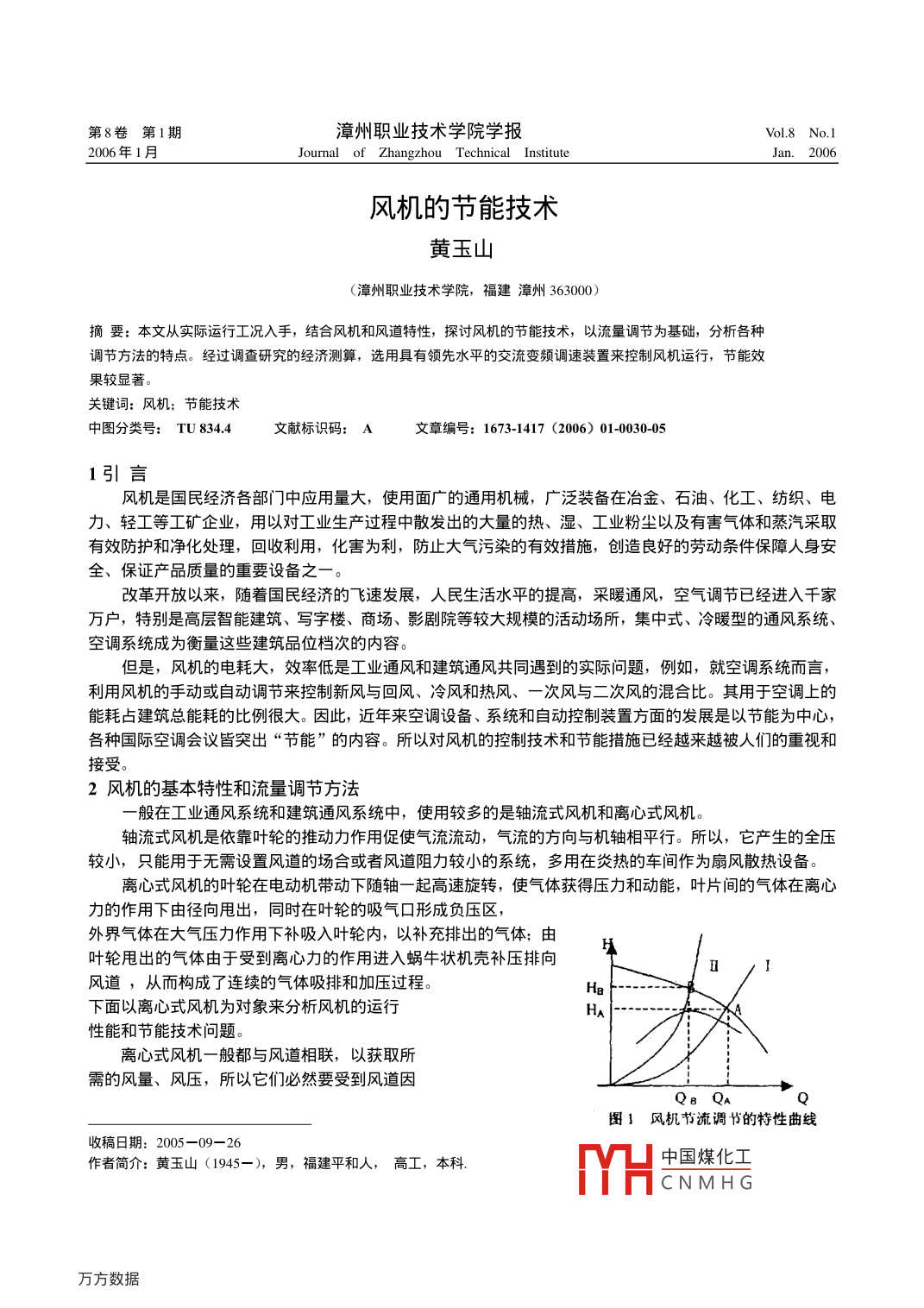 第8卷第1期漳州職業(yè)技術(shù)學院學報Vol 8 No. 1年1月Journal of Zhangzhou Technical InstituteJan.2006風機的節(jié)能技術(shù)黃玉山(漳州職業(yè)技術(shù)學院,福建漳州3630000摘要:本文從實際運行工況入手,結(jié)合風機和風道特性,探討風機的節(jié)能技術(shù),以流量調(diào)節(jié)為基礎(chǔ),分析各種調(diào)節(jié)方法的特點。經(jīng)過調(diào)査研究的經(jīng)濟測算,選用具有領(lǐng)先水平的交流變頻調(diào)速裝置來控制風機運行,節(jié)能效果較顯著。關(guān)鍵詞:風機;節(jié)能技術(shù)中圖分類號:TU8344文獻標識碼:A章編號:1673-1417(2006)010030051引言風機是國民經(jīng)濟各部門中應(yīng)用量大,使用面廣的通用機械,廣泛裝備在冶金、石油、化工、紡織、電力、輕工等工礦企業(yè),用以對工業(yè)生產(chǎn)過程中散發(fā)出的大量的熱、濕、工業(yè)粉塵以及有害氣體和蒸汽采取有效防護和凈化處理,回收利用,化害為利,防止大氣污染的有效措施,創(chuàng)造良好的勞動條件保障人身安全、保證產(chǎn)品質(zhì)量的重要設(shè)備之改革開放以來,隨著國民經(jīng)濟的飛速發(fā)展,人民生活水平的提高,采暖通風,空氣調(diào)節(jié)已經(jīng)進入千家萬戶,特別是高層智能建筑、寫字樓、商場、影劇院等較大規(guī)模旳活動場所,集中式、冷暖型的通風系統(tǒng)、空調(diào)系統(tǒng)成為衡量這些建筑品位檔次的內(nèi)容。但是,風機的電耗大,效率低是工業(yè)通風和建筑通風共同遇到的實際問題,例如,就空調(diào)系統(tǒng)而言,利用風機的手動或自動調(diào)節(jié)來控制新風與回風、冷風和熱風、一次風與二次風的混合比。其用于空調(diào)上的能耗占建筑總能耗的比例很大。因此,近年來空調(diào)設(shè)備、系統(tǒng)和自動控制裝置方面的發(fā)展是以節(jié)能為中心,各種國際空調(diào)會議皆突出“節(jié)能”的內(nèi)容。所以對風機的控制技術(shù)和節(jié)能措施已經(jīng)越來越被人們的重視和接受。2風機的基本特性和流量調(diào)節(jié)方法般在工業(yè)通風系統(tǒng)和建筑通風系統(tǒng)中,使用較多的是軸流式風機和離心式風機。軸流式風機是依靠葉輪的推動力作用促使氣流流動,氣流的方向與機軸相平行。所以,它產(chǎn)生的全壓較小,只能用于無需設(shè)置風道的場合或者風道阻力較小的系統(tǒng),多用在炎熱的車間作為扇風散熱設(shè)備。離心式風機的葉輪在電動機帶動下隨軸一起高速旋轉(zhuǎn),使氣體獲得壓力和動能,葉片間的氣體在離心力的作用下由徑向甩出,同時在葉輪的吸氣口形成負壓區(qū),外界氣體在大氣壓力作用下補吸入葉輪內(nèi),以補充排出的氣體;由葉輪甩出的氣體由于受到離心力的作用進入蝸牛狀機殼補壓排向風道,從而構(gòu)成了連續(xù)的氣體吸排和加壓過程。H下面以離心式風機為對象來分析風機的運行性能和節(jié)能技術(shù)問題。離心式風機一般都與風道相聯(lián),以獲取所需的風量、風壓,所以它們必然要受到風道因Qa QA圖1風機節(jié)流調(diào)節(jié)的特性曲線收稿日期:2005-09-26作者簡介:黃玉山(1945-),男,福建平和人,高工,本科.中國煤化工CNMHG第1期黃玉山:風機的節(jié)能技術(shù)素的制約。在研究風機的運行情況(即運行工作點)時,除了考慮風機的特性外,還應(yīng)考慮風道系統(tǒng)(包括介質(zhì))的特性,圖1是離心式風機部分與風道系統(tǒng)的HQ特性曲線圖。交叉點A和B分別表示處在兩種不同風道狀態(tài)(曲線Ⅰ和Ⅱ)下的系統(tǒng)的工作點。在生產(chǎn)過程中,一般是利用調(diào)節(jié)風機的流量來實現(xiàn)某一設(shè)定的工作狀態(tài)的,其調(diào)節(jié)方法大致有:調(diào)節(jié)出口閥門(檔板)調(diào)節(jié)節(jié)流閥(檔板)(風道節(jié)流調(diào)節(jié)法)調(diào)節(jié)入口閥門(檔板)不調(diào)速狀態(tài)調(diào)節(jié)風機入口導(dǎo)向器葉片:(風機本體調(diào)節(jié)法)風機流量調(diào)節(jié)電磁調(diào)速繞線式電機轉(zhuǎn)子串電阻調(diào)速有轉(zhuǎn)差損耗調(diào)速)定子調(diào)壓調(diào)速液力耦合器調(diào)速(機械調(diào)速)調(diào)速狀態(tài)繞線式電機串級調(diào)速高效調(diào)速變極調(diào)速變頻調(diào)速由上可知,風機的風量調(diào)節(jié)可以從風道系統(tǒng)或者設(shè)備本體兩個方面來采取措施:(1)屬于風道系統(tǒng)的方法是采用節(jié)流調(diào)節(jié)法,即在電源電壓和電動機轉(zhuǎn)速不變的情況下,于風機的進口(或出囗)風道中安裝節(jié)流閥或檔板,來改變風道中的流量。(2)屬于調(diào)節(jié)設(shè)備本體的方法則是在不變動風道系統(tǒng)的情況下,只在風機設(shè)備本身加以改造,如在風機的進風口處裝設(shè)導(dǎo)向器或者對電動機采用變速調(diào)節(jié)控制法不同的調(diào)節(jié)方法,所體現(xiàn)岀的運行工況是各不相同的。下面分別就各種調(diào)節(jié)流量的方法進行分析2.1節(jié)流調(diào)節(jié)法ny>n>n所謂節(jié)流調(diào)節(jié)是在不改變風機本身特性情況下,通過改變節(jié)流檔板的開度(比如用檔板關(guān)小風機出口的風門),也即改變節(jié)流阻力來控制氣體的流量。改變后,圖1中風道特性曲kk線從Ⅰ變動到Ⅱ,工作點便由A變到B,流量從Q減小到QB,風道阻力卻由HA增加到HB3??梢娺@種調(diào)節(jié)方法會