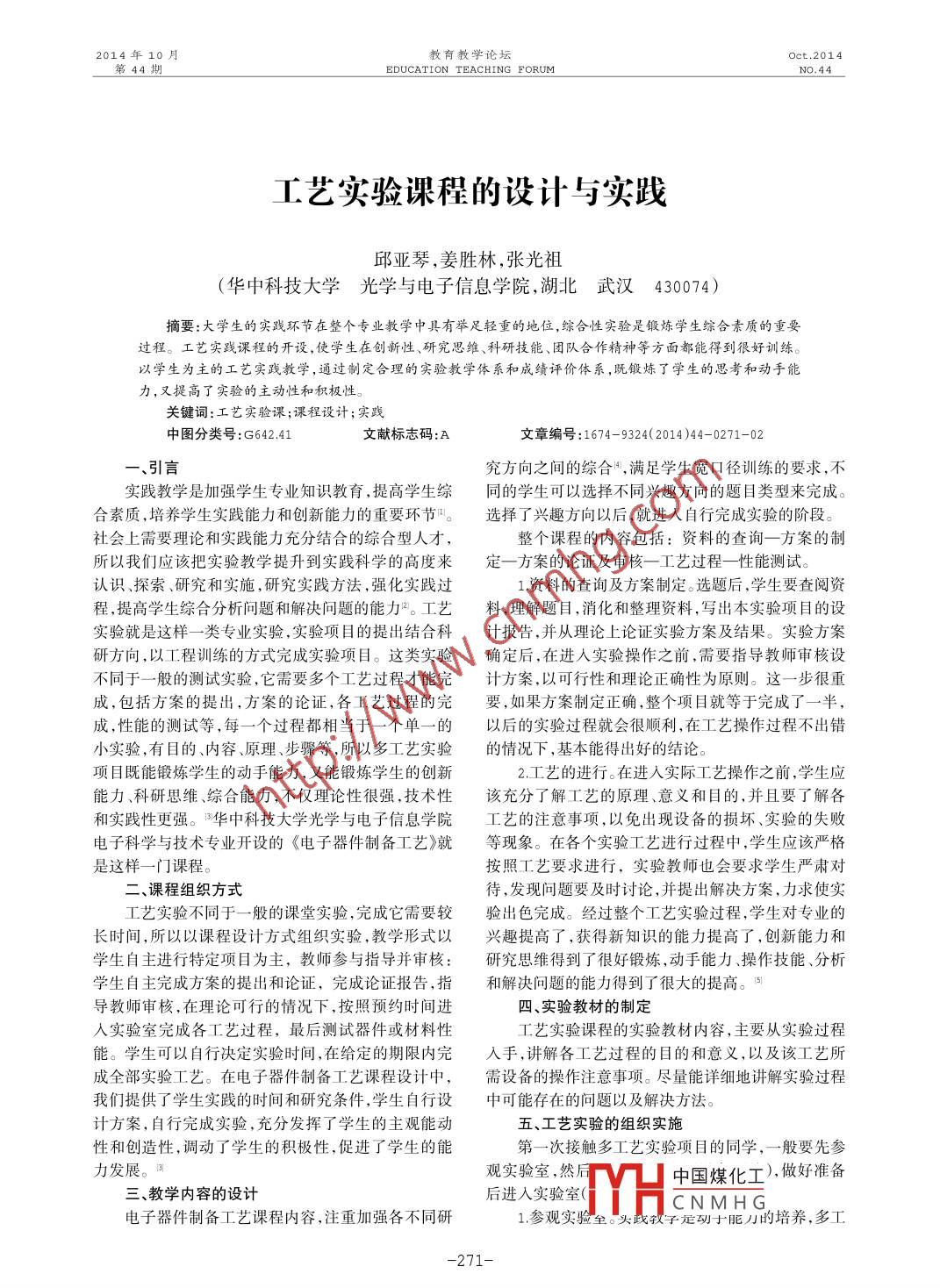 2014年10月教育教學論壇Oct.2014第44期EDUCATION TEACHING FORUM工藝實驗課程的設計與實踐邱亞琴,姜勝林,張光祖(華中科技大學光學與電子信息學院,湖北武漢430074)摘要:大學生的實踐環(huán)節(jié)在整個專業(yè)教學中具有舉足輕重的地位,綜合性實驗是鍛煉學生綜合素質的重要過程。工藝實踐課程的開設,使學生在創(chuàng)新性、硏究思維、科研技能、團隊合作精神等方面都能得到很妤訓練。以學生為主的工芑實踐教學,通過制定合理的實驗教學體系和成績評價體系,既鍛煉了學生的思考和動手能力,又提高了實驗的主動性和積極性。關鍵詞:工藝實驗課;課程設計;實踐中圖分類號:G642.41文獻標志碼:A文章編號:1674-9324(2014)44-0271-02引言究方向之間的綜合,滿足學生寬口徑訓練的要求,不實踐教學是加強學生專業(yè)知識教育,提高學生綜同的學生可以選擇不同興趣方向的題目類型來完成合素質,培養(yǎng)學生實踐能力和創(chuàng)新能力的重要環(huán)節(jié)。選擇了興趣方向以后,就進入自行完成實驗的階段。社會上需要理論和實踐能力充分結合的綜合型人才整個課程的內容包括:資料的查詢一方案的制所以我們應該把實驗教學提升到實踐科學的高度來定一方案的論證及審核一工藝過程一性能測試。認識、探索、研究和實施,研究實踐方法,強化實踐過1資料的查詢及方案制定。選題后,學生要查閱資程,提高學生綜合分析問題和解決問題的能力2。工藝料,理解題目,消化和整理資料,寫出本實驗項目的設實驗就是這樣一類專業(yè)實驗,實驗項目的提出結合科計報告,并從理論上論證實驗方案及結果。實驗方案研方向,以工程訓練的方式完成實驗項目。這類實驗確定后,在進人實驗操作之前,需要指導教師審核設不同于一般的測試實驗,它需要多個工藝過程才能完計方案,以可行性和理論正確性為原則。這一步很重成,包括方案的提出,方案的論證,各工藝過程的完要,如果方案制定正確,整個項目就等于完成了一半,成,性能的測試等,每一個過程都相當于一個單一的以后的實驗過程就會很順利,在工藝操作過程不出錯小實驗,有目的、內容、原理、步驟等,所以多工藝實驗的情況下,基本能得出好的結論項目既能鍛煉學生的動手能力,又能鍛煉學生的創(chuàng)新2.工藝的進行。在進入實際工藝操作之前,學生應能力、科研思維、綜合能力,不僅理論性很強,技術性該充分了解工藝的原理、意義和目的,并且要了解各和實踐性更強。華中科技大學光學與電子信息學院工藝的注意事項,以免出現(xiàn)設備的損壞、實驗的失敗電子科學與技術專業(yè)開設的《電子器件制備工藝》就等現(xiàn)象。在各個實驗工藝進行過程中,學生應該嚴格是這樣一門課程按照工藝要求進行,實驗教師也會要求學生嚴肅對二、課程組織方式待,發(fā)現(xiàn)問題要及時討論,并提出解決方案,力求使實工藝實驗不同于一般的課堂實驗,完成它需要較驗出色完成。經(jīng)過整個工藝實驗過程,學生對專業(yè)的長時間,所以以課程設計方式組織實驗,教學形式以興趣提高了,獲得新知識的能力提高了,創(chuàng)新能力和學生自主進行特定項目為主,教師參與指導并審核:研究思維得到了很好鍛煉,動手能力、操作技能、分析學生自主完成方案的提出和論證,完成論證報告,指和解決問題的能力得到了很大的提高。5導教師審核,在理論可行的情況下,按照預約時間進四、實驗教材的制定實驗室完成各工藝過程,最后測試器件或材料性工藝實驗課程的實驗教材內容,主要從實驗過程能。學生可以自行決定實驗時間,在給定的期限內完人手,講解各工藝過程的目的和意義,以及該工藝所成全部實驗工藝。在電子器件制備工藝課程設計中,需設備的操作注意事項。盡量能詳細地講解實驗過程我們提供了學生實踐的時間和研究條件,學生自行設中可能存在的問題以及解決方法計方案,自行完成實驗,充分發(fā)揮了學生的主觀能動五、工藝實驗的組織實施性和創(chuàng)造性,調動了學生的積極性,促進了學生的能第一次接觸多工藝實驗項目的同學,一般要先參力發(fā)展。觀實驗室然后V中國煤化工),做好準備三、教學內容的設計后進入實驗室(CNMHG電子器件制備工藝課程內容,注重加強各不同研1參觀實驗全子定于刀的培養(yǎng),多工2712014年10月教育教學論壇oct.2014EDUCATION TEACHING FORUM藝實驗也不例外,但它與傳統(tǒng)的專業(yè)測試實驗又不這個環(huán)節(jié)可以大大減少實驗中破壞性事件(如損同,需要完成一系列的操作才能達到教學目的。所以壞設備等)的發(fā)生概率。實驗前對即將要接觸的各環(huán)節(jié)(如設備、流程、注意事2實驗預約。實驗預約是一個很重要的環(huán)節(jié)。工藝項等)必須做到心中有數(shù),提前熟悉實驗室,對實驗設實驗的預約不同于一般實驗,主要是針對設備的預備有感性認識,實驗過程可能出現(xiàn)的一些問題應該在約。由于實驗學生人數(shù)多,設備有限,在實驗進行期進入實驗室之前就有心理準備,才能做到實驗時有的間,所有設備全天開放,而進行實驗的學生要分時分放矢。參觀實驗室可以以小組或班級為單位進入實驗段進入實驗室。為了更好地安排實驗時間,我們設計室,實驗教師針對具體事項進行講解,解答學生心中了一個預約表格(表1),學生可以根據(jù)表格提示預約。的疑問。表1電子