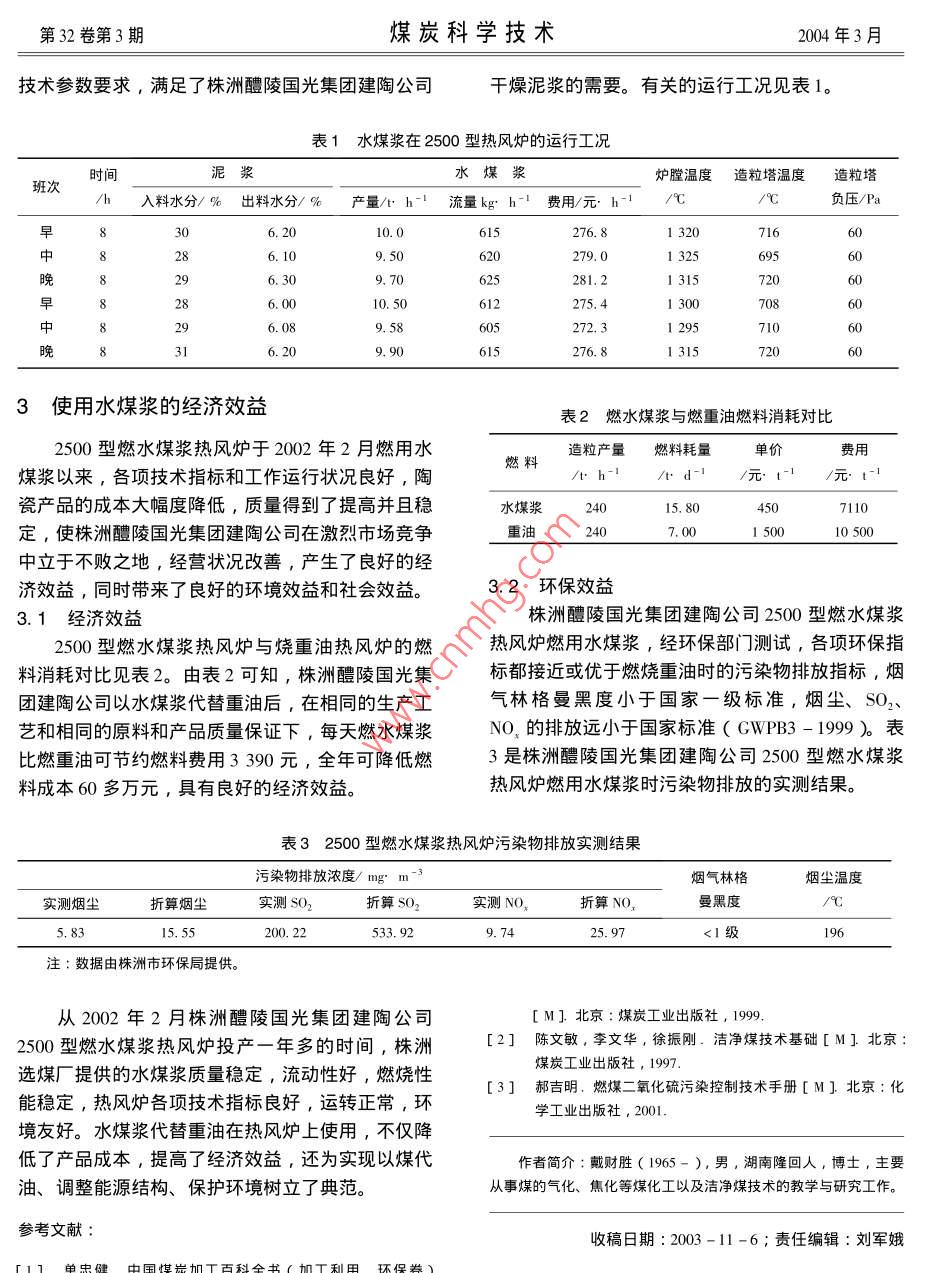 第32卷第3期煤炭科學(xué)技術(shù)2004年3月水煤漿在熱風(fēng)爐上的應(yīng)用戴財(cái)勝,張曉峰21,湖南科技大學(xué)化工系,湖南湘潭411201;2.株洲選煤廠,湖南株洲412005)摘要:水煤漿在熱風(fēng)爐上燃燒試驗(yàn)表明,用水煤漿代替重油作熱風(fēng)爐的燃料,技術(shù)上切實(shí)可行,經(jīng)濟(jì)效益良好,環(huán)境效益和社會(huì)效益顯著。關(guān)鍵詞:水煤漿;熱風(fēng)爐;燃燒中圖分類號(hào):TQ534.4文獻(xiàn)標(biāo)識(shí)碼:B文章編號(hào):0253-2336(2004)03-0052-0Application of coal water mixture to hot-blast stoveDAI Cai-sheng, ZHANG Xiao-feng(l. Department of Chemical Engineering, Hunan University of Science and Tchnology Xiangtan 411201 China2. Zhuzhou Coal Preparation Plant, Zhuzhou 421005, China煤炭是我國的主要能源,在今后相當(dāng)長的時(shí)間煤漿制備技術(shù),還在多年的水煤漿燃燒技術(shù)研究與內(nèi),以煤為主的能源消費(fèi)結(jié)構(gòu)將不會(huì)改變。制約煤探索中積累了豐富的經(jīng)驗(yàn)。該廠根據(jù)株洲醴陵國光炭應(yīng)用的主要因素是煤炭加工利用造成環(huán)境污染以集團(tuán)建陶公司的生產(chǎn)工藝和技術(shù)條件,將原重油爐及煤炭的燃燒效率低,因此,提高煤的利用效率和拆除,自行開發(fā)了2500型燃水煤漿的熱風(fēng)爐代替減少燃煤環(huán)境污染的潔凈煤技術(shù)獲得了快速發(fā)展。原燃重油的熱風(fēng)爐,技術(shù)參數(shù)如下水煤漿是一種很好的煤基代油燃料,它由約30%產(chǎn)熱能力/GJh14.187-10.467的水、70%的煤以及約1%的添加劑組成,是中國水煤漿耗量/kg:h250~650積極推廣使用的潔凈煤技術(shù)之一。水煤漿的制備技啟動(dòng)耗油量/kg術(shù)與工藝已經(jīng)成熟,但水煤漿的燃燒使用卻是近4啟動(dòng)耗時(shí)/min年來才逐步開發(fā)、示范、推廣,走向?qū)嵱谩⒊墒靿嚎s空氣耗量/m3,min1.5總裝機(jī)容量/kW的。特別是水煤漿在株洲東苑賓館2th蒸汽鍋爐燃燒效率/%上的成功使用以及水煤漿在汕頭萬豐熱電有限公司煙塵排放濃度/mg<2002號(hào)爐、茂名熱電廠1號(hào)爐上的使用情況表明,水煤漿在這些鍋爐中的燃燒性能良好,鍋爐熱效率為2水煤漿在2500型熱風(fēng)爐上的使用情況98%~99.6%,爐渣含碳量為1.92%~2.4%,2500型燃水煤漿的熱風(fēng)爐于2002年2月通過O3、NO、煙塵等各項(xiàng)環(huán)保排放指標(biāo)低,符合環(huán)有關(guān)技術(shù)部門的驗(yàn)收,由株洲選煤廠提供質(zhì)量穩(wěn)定保要求,為我國大力推廣使用水煤漿創(chuàng)造了條件。的優(yōu)質(zhì)水煤漿,水煤漿的質(zhì)量指標(biāo)如下1技術(shù)參數(shù)濃度(干基)/%65±2灰分(干基)/%株洲醴陵國光集團(tuán)建陶公司熱風(fēng)爐原燒重油,黏度/mPa1000~2500每天燃油7~8t,因燃油成本高(重油1500元粒度(<74m含量)/%發(fā)熱量/MJ·kgt),造成陶瓷產(chǎn)品成本高,在激烈的市場競爭中<0.8企業(yè)處于虧損的艱難局面。為了降低產(chǎn)品成本,扭揮發(fā)分/%轉(zhuǎn)虧損局面,該企業(yè)經(jīng)過多方的調(diào)研、分析、決穩(wěn)定性靜置3個(gè)月不產(chǎn)生硬沉淀策,認(rèn)為用水煤漿代替重油技術(shù)上可行,可大幅度水煤漿代替重油在2500型熱風(fēng)爐上進(jìn)行了近地降低產(chǎn)品成本,是解決陶瓷產(chǎn)品成本髙的最佳途?一?月的燃燒試驗(yàn)表眀,水煤漿能穩(wěn)定燃燒,燃燒第32卷第3期煤炭科學(xué)技術(shù)2004年3月技術(shù)參數(shù)要求,滿足了株洲醴陵國光集團(tuán)建陶公司千燥泥漿的需要。有關(guān)的運(yùn)行工況見表1。表1水煤漿在2500型熱風(fēng)爐的運(yùn)行工況班次時(shí)間爐膛溫度造粒塔溫度造粒塔h入料水分/%出料水分/%產(chǎn)量/h1流量kgh-1費(fèi)用/元,hi負(fù)壓/P早2010.0615276.86.109620279.0晚9,70281.210.50612中9.587108319.90615276.8131572063使用水煤漿的經(jīng)濟(jì)效益表2燃水煤漿與燃重油燃料消耗對(duì)比2500型燃水煤漿熱風(fēng)爐于200)2年2月燃用水造粒產(chǎn)量燃料耗量單價(jià)費(fèi)用煤漿以來,各項(xiàng)技術(shù)指標(biāo)和工作運(yùn)行狀況良好,陶燃料瓷產(chǎn)品的成本大幅度降低,質(zhì)量得到了提高并且穩(wěn)水煤漿10定,使株洲醴陵國光集團(tuán)建陶公司在激烈市場競爭重油150010500中立于不敗之地,經(jīng)營狀況改善,產(chǎn)生了良好的經(jīng)濟(jì)效益,同時(shí)帶來了良好的環(huán)境效益和社會(huì)效益。3.2環(huán)保效益3.1經(jīng)濟(jì)效益株洲醴陵國光集團(tuán)建陶公司2500型燃水煤漿2500型燃水煤漿熱風(fēng)爐與燒重油熱風(fēng)爐的燃熱風(fēng)爐燃用水煤漿,經(jīng)環(huán)保部門測試,各項(xiàng)環(huán)保指料消耗對(duì)比見表2。由表2可知,株洲醴陵國光集標(biāo)都接近或優(yōu)于燃燒重油時(shí)的污染物排放指標(biāo),煙團(tuán)建陶公司以水煤漿代替重油后,在相同的生產(chǎn)工氣林格曼黑度小于國家一級(jí)標(biāo)準(zhǔn),煙塵、SO2藝和相同的原料和產(chǎn)品質(zhì)量保證下,每天燃水煤漿NO.的排放遠(yuǎn)小于國家標(biāo)準(zhǔn)(GWPB3-1999表比燃重油可節(jié)約燃料費(fèi)用3390元,全年可降低燃3是株洲醴陵國光集團(tuán)建陶公司2500型燃水煤漿料成本60多萬元,具有良好的經(jīng)濟(jì)效益。熱風(fēng)爐燃用水煤漿時(shí)污染物排放的實(shí)測結(jié)果。型燃水煤漿熱風(fēng)爐污染物排放實(shí)測結(jié)果污染物煙氣林格煙塵