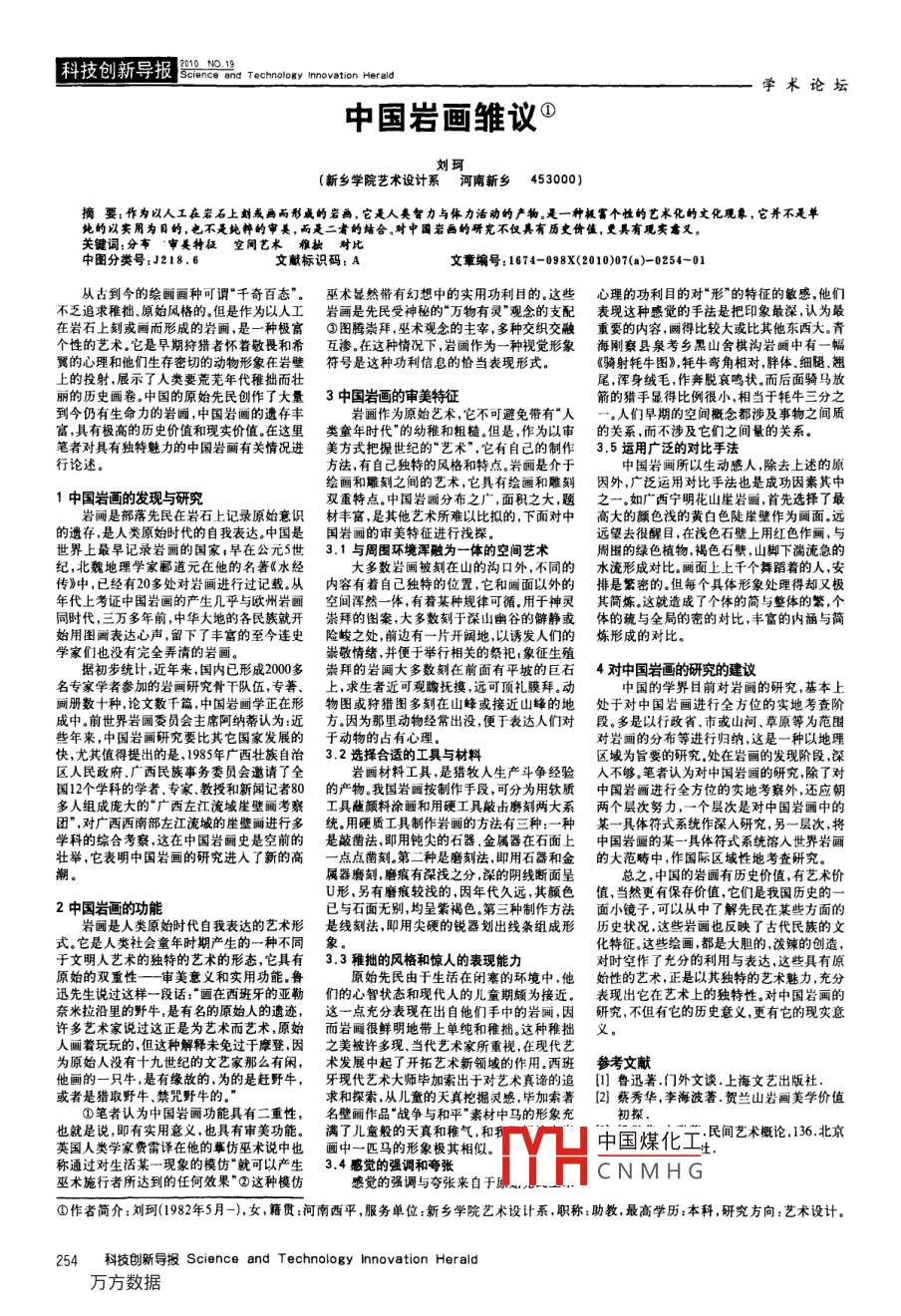 科技創(chuàng)新導(dǎo)報e:mm學(xué)術(shù)論壇中國巖畫雛議0(新鄉(xiāng)學(xué)院藝術(shù)設(shè)計系河南新鄉(xiāng)453000)摘要:作為以人工在巖石上刻或畫而形成的巖畫,它是人奏智力與體力活動的產(chǎn)物。是一種機害個性的藝術(shù)化的文化現(xiàn)象,它并不是單純的以實用為目的,也不是燉粹的審美,而是二者的結(jié)合,對中國巖畫的聽究不僅具有歷史價值,更具有現(xiàn)實禽義關(guān)鍵詞:分布審美特征空間藝術(shù)稚拙對比中圖分類號:J218.6文獻標識碼:A文章編號:1674-098xX(2010)07(a)-0254-01從古到今的繪畫畫種可謂“千奇百態(tài)”。巫術(shù)顯然帶有幻想中的實用功利目的。這些心理的功利目的對“形”的特征的敏感他們不乏追求稚拙原始風(fēng)格的。但是作為以人工巖畫是先民受神秘的“萬物有靈觀念的支配表現(xiàn)這種感覺的手法是把印象最深,認為最在巖石上刻或畫而形成的巖畫,是一種極富③圖騰崇拜,巫術(shù)觀念的主宰,多種交織交融重要的內(nèi)容,畫得比較大或比其他東西大。青個性的藝術(shù)。它是早期狩獵者懷著敬畏和?;B在這種情況下,巖畫作為一種視覺形象海剛察縣泉考鄉(xiāng)黑山舍棋溝巖畫中有一幅翼的心理和他們生存密切的動物形象在巖壁符號是這種功利信息的恰當表現(xiàn)形式?!厄T射牦牛圖》,牦牛彎角相對胖體細8翹上的投射展示了人類要荒蕪年代稚拙而壯尾,渾身絨毛,作奔脫哀鳴狀。而后面騎馬放麗的歷史畫卷中國的原始先民創(chuàng)作了大量3中國巖畫的審美特征箭的獵手顯得比例很小,相當于牦牛三分之到今仍有生命力的巖畫,中國巖畫的遺存豐巖畫作為原始藝術(shù),它不可避免帶有“人一。人們早期的空間概念都涉及事物之間質(zhì)富,具有極高的歷史價值和現(xiàn)實價值。在這里類童年時代”的幼稚和粗糙。但是,作為以審的關(guān)系,而不涉及它們之間量的關(guān)系筆者對具有獨特魅力的中國巖畫有關(guān)情況進美方式把操世紀的“藝術(shù)”,它有自己的制作35運用廣泛的對比手法行論述。方法,有自己獨特的風(fēng)格和特點。巖畫是介于中國巖畫所以生動感人,除去上述的原繪畫和羅刻之間的藝術(shù),它具有繪畫和雕刻因外,廣泛運用對比手法也是成功因素其中1中國巖畫的發(fā)現(xiàn)與研究雙重特點。中國巖畫分布之廣,面積之大,題之一如廣西寧明花山崖巖畫,首先選擇了最巖畫是部落先民在巖石上記錄原始意識材豐富,是其他藝術(shù)所難以比擬的,下面對中高大的顏色淺的黃白色陡崖壁作為畫面。遠的遺存,是人類原始時代的自我表達。中國是國巖畫的審美特征進行淺探遠望去很醒目,在淺色石壁上用紅色作畫,與世界上最早記錄巖畫的國家;早在公元5世3.1與周圍環(huán)境渾融為一體的空間藝術(shù)周圍的綠色植物褐色石壁,山腳下湍流急的紀,北魏地理學(xué)家酈道元在他的名著《水經(jīng)大多數(shù)巖畫被刻在山的溝口外,不同的水流形成對比。畫面上上千個舞蹈著的人,安傳》中,已經(jīng)有20多處對巖畫進行過記載從內(nèi)容有著自己獨特的位置,它和畫面以外的排是繁密的。但每個具體形象處理得卻又極年代上考證中國巖畫的產(chǎn)生幾平與歐州巖畫空間渾然一體,有著某種規(guī)律可循。用于神靈其簡煉這就造成了個體的簡與整體的繁,個同時代,三萬多年前,中華大地的各民族就開崇拜的圖案,大多數(shù)刻于深山幽谷的僻靜或體的疏與全局的密的對比,豐富的內(nèi)涵與簡始用圖畫表達心聲,留下了豐富的至今連史險峻之處,前邊有一片開闊地,以誘發(fā)人們的煉形成的對比學(xué)家們也沒有完全弄清的巖畫。崇敬情緒,并便于舉行相關(guān)的祭祀,象征生殖據(jù)初步統(tǒng)計近年來國內(nèi)已形成2000多崇拜的巖畫大多數(shù)刻在前面有平坡的巨石4對中國巖畫的研究的建議名專家學(xué)者參加的巖畫研究骨干隊伍,專著、上,求生者近可觀瞻撫摸,遠可頂禮膜拜。動中國的學(xué)界目前對巖畫的研究,基本上冊數(shù)十種,論文數(shù)千篇,中國巖畫學(xué)正在形物圖或狩獵圖多刻在山峰或接近山峰的地處于對中國巖畫進行全方位的實地考查階成中。前世界巖畫委員會主席阿納蒂認為:近方因為那里動物經(jīng)常出沒,便于表達人們對段。多是以行政省、市或山河、草原等為范圍些年來,中國巖畫研究要比其它國家發(fā)展的于動物的占有心理對巖畫的分布等進行歸納,這是一種以地理快,尤其值得提出的是,1985年廣西壯族自治3.2選擇合適的工具與材料區(qū)域為旨要的研究。處在巖畫的發(fā)現(xiàn)階段,深區(qū)人民政府廣西民族事務(wù)委員會邀請了全巖畫材料工具,是獵牧人生產(chǎn)斗爭經(jīng)驗入不夠。筆者認為對中國巖畫的研究除了對國12個學(xué)科的學(xué)者專家教授和新聞記者80的產(chǎn)物。我國巖畫按制作手段,可分為用軟質(zhì)中國巖畫進行全方位的實地考察外,還應(yīng)朝多人組成龐大的“廣西左江流域崖壁畫考察工具蘸顏料涂畫和用硬工具蔽擊磨刻兩大系兩個層次努力一個層次是對中國巖畫中的團”,對廣西西南部左江流域的崖壁畫進行多統(tǒng)用硬質(zhì)工具制作巖畫的方法有三種:一種某一具體符式系統(tǒng)作深入研究,另一層次,將學(xué)科的綜合考察,這在中國巖畫史是空前的是敲鑿法,即用鈍尖的石器金屬器在石