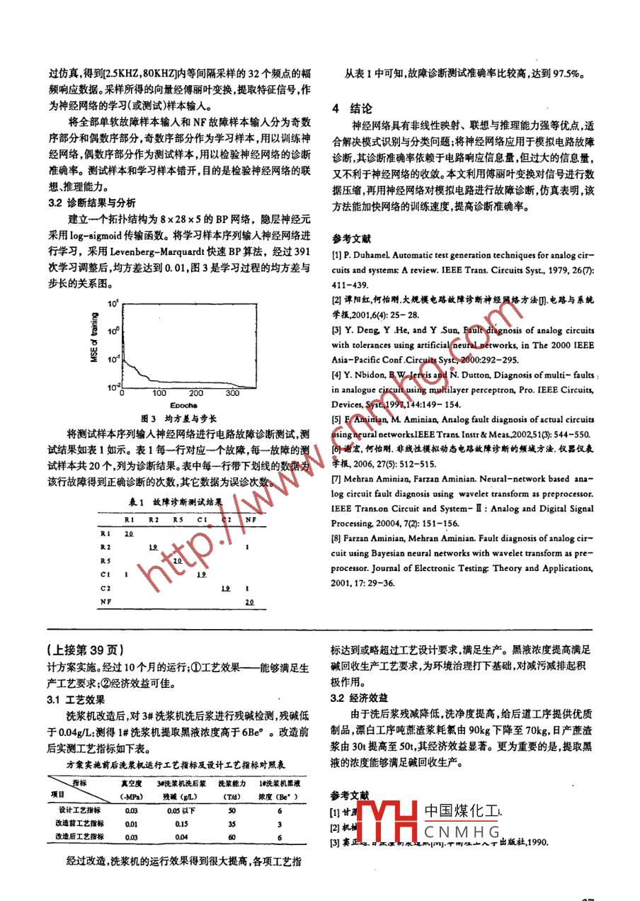 2007年12月廣西輕工業(yè)第12期(總第109期)GUANGXI JOURNAL OF LIGHT INDUSTRY機械與電氣洗漿機改造研究李仲明福建糖業(yè)股份有限公司,福建漳州363000【摘要】福糖公司日產(chǎn)紙漿50t擴建項目自1992年投產(chǎn)以來洗選工序三臺27m2轉鼓式真空洗漿機及漂白工序三臺20m2轉鼓式真空洗漿機一直不能正常投入運行,嚴重影響整個項目的效益。1995年8月為解決這個難題,特別設計了采用噴射真空系統(tǒng)強制外真空及空氣內(nèi)剝漿,改造洗漿機獲得成功?!娟P鍵詞】洗漿機;真空度;噴射真空;內(nèi)剝漿【中圖分類號】Ts734【文獻標識碼】A【文章編號】1003-2673(2007)12-0039-011問題的提出補汁器、水泵、水封池等設備,完善真空系統(tǒng)。該真空系統(tǒng)配置1992年紙漿廠日產(chǎn)紙漿50噸擴建并相應配置堿回收工如圖1程。紙漿洗選工序選用三臺27m2轉鼓式真空洗漿機,串聯(lián)使真空系統(tǒng)工作原理:用。漂白工序CEH三段漂白選用三臺20m2轉鼓式真空洗漿噴射泵抽水(水封池內(nèi)白水)打入噴射冷凝器水室通過多機,三段漂白各自獨立使用。原設計真空洗漿機的真空是依靠個噴嘴射出,多束水射流集中于噴射冷凝器喉管并經(jīng)水腿落本臺黑液水腿落差產(chǎn)生的。錐形分配閥的閥芯表面是玻璃纖入水封池由此噴射冷凝器氣室產(chǎn)生負壓(真空)維、樹脂材料制作的。剝漿利用高壓風機的氣體(空氣刮刀)進因負壓將洗漿機真空區(qū)的氣體抽出。抽出的氣體含有水蒸行外剝漿。設備在生產(chǎn)運行中存在如下缺陷。氣和少量黑液,氣體和水蒸氣經(jīng)噴射泠凝器泠凝排進水封池(1)洗漿機真空度低(001Mpa以下)洗漿能力不夠洗后黑液經(jīng)補汁器收集排人黑液槽。漿殘堿在015g幾以上;此真空系統(tǒng)操作簡單,其噴射冷凝水可以形成閉路循環(huán)2)黑液提取率低,濃度低,1#機黑液槽標測黑液濃度不足部分可以用造紙生產(chǎn)的白水補充。3Be°以下,不能適應堿回收的生產(chǎn)要求;22內(nèi)剝漿系統(tǒng)設計(3)由于真空度低,漿料上網(wǎng)困難;剝漿效果差漿料經(jīng)常原設計是在剝漿區(qū)轉鼓外,距網(wǎng)面不小于6mm裝一空氣糊網(wǎng)”,生產(chǎn)能力達不到設計能力的50%;刮刀。利用空氣刮刀進行剝漿。(4)錐形閥表面材料經(jīng)常磨損、脫落。水膜被破壞大氣區(qū)糊網(wǎng)”。單靠空氣刮刀進行剝漿不能解決問題。設計新方與真空區(qū)串通相互影響不能正常工作。且檢修工作量大費案—內(nèi)剝漿。將高壓風機出口風管與真空洗漿機分配閥大氣用高,經(jīng)常檢修,不能連續(xù)工作區(qū)管道接通使高壓空氣直接進入洗漿機轉鼓的大氣區(qū),形成由鼓內(nèi)向外吹氣,將洗后漿剝離。改造方案的設計這個方案不增加設備,只須接通管道拆除空氣刮刀。操作真空洗漿機存在的缺陷嚴重制約紙漿的生產(chǎn)針對問題,簡單,又能達到工藝要求,滿足生產(chǎn)。詳細解讀洗漿機的結構性能及其作用。找出關鍵因素①必須23分配閥改造提高真空度②解決剝漿問題;③改造錐形分配閥選擇閥芯表要實現(xiàn)提高真空度與內(nèi)剝漿技術有機結合并產(chǎn)生積極的面材料。效果,就必須對洗漿機分配閥的罰芯進行改造,保證分配閥閥21真空系統(tǒng)的設計芯與閥體配合良好。否則分配閥各功能區(qū)相互串通不能達到采用外部強制真空替代原設計由本臺黑液水腿落差產(chǎn)生預期效果。的負壓。可采用的真空設備有:①羅茨真空泵;②往復式真空改造方法:①剔除閥芯表面玻璃纖維與樹脂材料;②在閥泵;③水噴射真空抽氣器④水環(huán)式真空泵,等等。芯與閥體接觸表面堆焊金屬錫,提高表層材料與閥芯的黏結現(xiàn)有閑置設備水噴力,克服表層材料脫落現(xiàn)象;③對閥芯(與閥體接觸的)表面進射冷凝器TPD6。通過行研磨。保證閥芯與閥體的接觸面積控制好閥芯與閥體的接設計計算該型號冷凝器觸間隙;強化功能區(qū)擋板能夠滿足27m3轉鼓式改造后,分配閥的功能充分體現(xiàn)防止各功能區(qū)串通。提高真空洗漿機正常運行洗漿機各功能區(qū)的作用。從而保證“提高真空度與內(nèi)剝漿相結求合技術”的利用閑置設備水噴中國煤化工1交表某2-汁黃粉T06射冷凝器TPD6,配置3CNMHG4一水封池;5一噴射泵6sh9;6-黑液檜1995年9月對三臺27m2轉鼓式真空洗漿機進行上述設【作者簡介】李仲明研究方向:機械謾備與管理(下轉第37頁過仿真得到25KHZ,80KHZ內(nèi)等間隔采樣的32個頻點的幅從表1中可知故障診斷測試準確率比較高達到975%。頻響應數(shù)據(jù)。采樣所得的向量經(jīng)傅麗葉變換提取特征信號,作為神經(jīng)網(wǎng)絡的學習(或測試)樣本輸入4結論將全部單軟故障樣本輸入和NF故障樣本輸入分為奇數(shù)神經(jīng)網(wǎng)絡具有非線性映射、聯(lián)想與推理能力強等優(yōu)點適序部分和偶數(shù)序部分奇數(shù)序部分作為學習樣本,用以訓練神合解決模式識別與分類問題;將神經(jīng)網(wǎng)絡應用于模擬電路故障經(jīng)網(wǎng)絡偶數(shù)序部分作為測試樣本,用以檢驗神經(jīng)網(wǎng)絡的診斷診斷其診斷準確率依賴于電路響應信息量,但過大的信息量準確率。測試樣本和學習樣本錯開,目的是檢驗神經(jīng)網(wǎng)絡的聯(lián)又不利于神經(jīng)網(wǎng)絡的收斂。本文利用傅麗葉變換對信號進行數(shù)想、推理能力。據(jù)壓縮再用神經(jīn