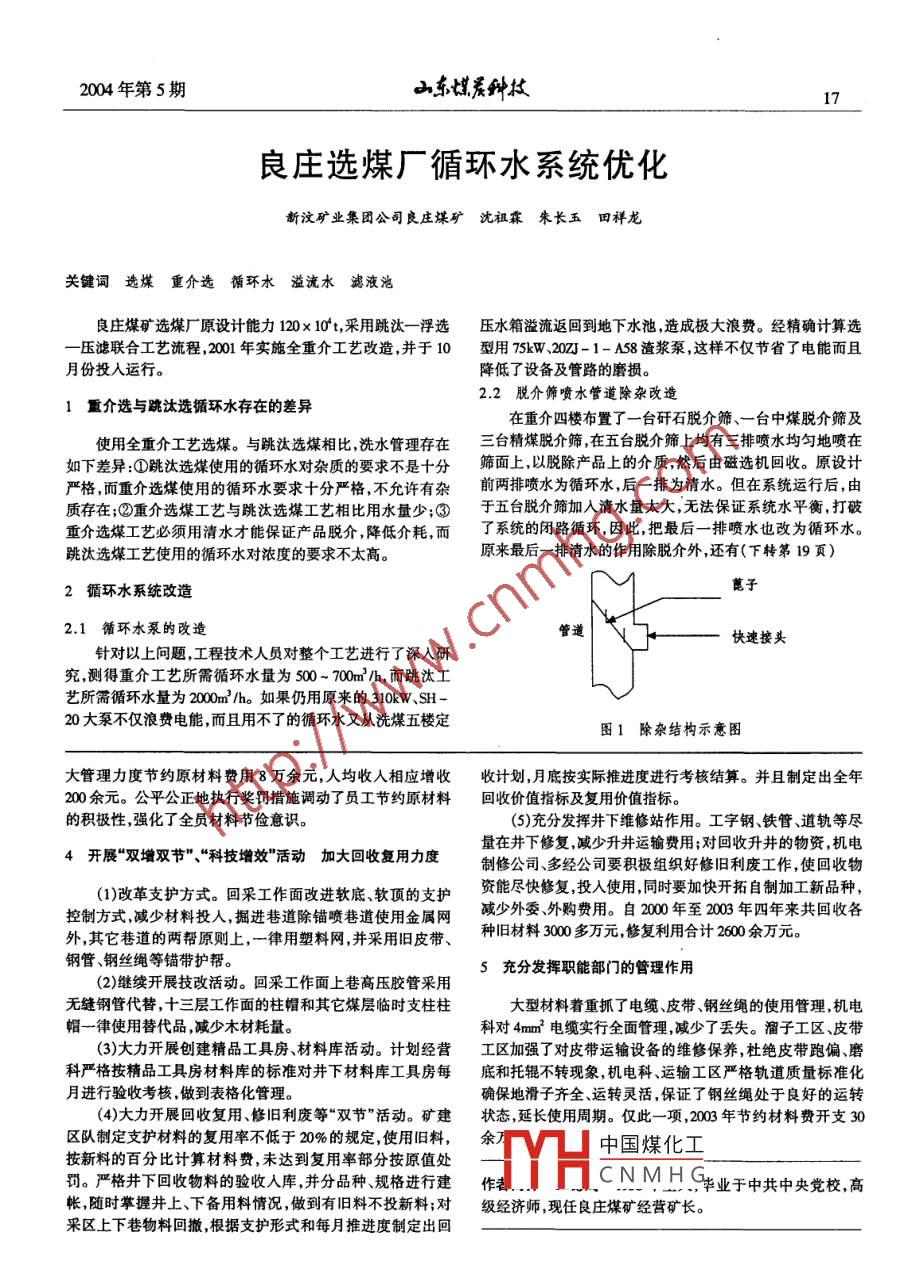 2004年第5期.山東煤居種林17良莊選煤廠循環(huán)水系統(tǒng)優(yōu)化新汶礦業(yè)集團(tuán)公司良莊煤礦沈祖霖 朱長(zhǎng)玉田祥龍關(guān)鍵詞選煤重介選循環(huán)水溢流水濾液池良莊煤礦選煤廠原設(shè)計(jì)能力120x 10't,采用跳汰一浮選壓水箱溢流返回到地 下水池,造成極大浪費(fèi)。經(jīng)精確計(jì)算選-壓濾聯(lián)合工藝流程,2001年實(shí)施全重介工藝改造,并于10型用 75kW、20zJ- 1- A58渣漿泵,這樣不僅節(jié)省了電能而且月份投入運(yùn)行。降低了設(shè)備及管路的磨損。2.2脫介篩噴水管道 除雜改造1重介選與跳汰選循環(huán)水存在的差異在重介四樓布置了一臺(tái)矸石脫介篩、-臺(tái)中煤脫介篩及使用全重介工藝選煤。與跳汰選煤相比,洗水管理存在三臺(tái)精煤脫介篩,在五臺(tái)脫介篩上均有三排噴水均勻地噴在如下差異:①跳汰選煤使用的循環(huán)水對(duì)雜質(zhì)的要求不是十分篩面 上,以脫除產(chǎn)品上的介質(zhì),然后由磁選機(jī)回收。原設(shè)計(jì)嚴(yán)格,而重介選煤使用的循環(huán)水要求十分嚴(yán)格,不允許有雜前兩排噴水為循環(huán)水,后一排為清水。但在系統(tǒng)運(yùn)行后,由質(zhì)存在;②重介選煤工藝與跳汰選煤工藝相比用水量少;③于五臺(tái)脫介篩加人清水量太大,無(wú)法保證系統(tǒng)水平衡,打破重介選煤工藝必須用清水才能保證產(chǎn)品脫介,降低介耗,而了系統(tǒng)的閉路循環(huán),因此,把最后--排噴水也改為循環(huán)水。跳汰選煤工藝使用的循環(huán)水對(duì)濃度的要求不太高。原來(lái)最后一排清水的作用除脫介外,還有(下轉(zhuǎn)第19頁(yè))蓖子2循環(huán)水系統(tǒng)改造2.1 循環(huán)水泵的改造管道快速接頭針對(duì)以上問(wèn)題,工程技術(shù)人員對(duì)整個(gè)工藝進(jìn)行了深入研究,測(cè)得重介工藝所需循環(huán)水量為500 ~ 700m' /h,而跳汰工藝所需循環(huán)水量為2000m2 /ho如果仍用原來(lái)的310kW.SH-20大泵不僅浪費(fèi)電能,而且用不了的循環(huán)水又從洗煤五樓定圖1除雜結(jié)構(gòu)示意圖大管理力度節(jié)約原材料費(fèi)用8萬(wàn)余元,人均收人相應(yīng)增收收計(jì)劃,月底按實(shí)際推進(jìn)度進(jìn)行考核結(jié)算。并且制定出全年200余元。公平公正地執(zhí)行獎(jiǎng)罰措施調(diào)動(dòng)了員工節(jié)約原材料回收價(jià)值指標(biāo)及復(fù)用價(jià)值指標(biāo)。的積極性,強(qiáng)化了全員材料節(jié)儉意識(shí)。(5)充分發(fā)揮井下維修站作用。工字鋼鐵管、道軌等盡4開展“雙增雙節(jié)" 、“科技增效"活動(dòng)加大回收復(fù)用力度量在井下修復(fù),減少升井運(yùn)輸費(fèi)用;對(duì)回收升井的物資,機(jī)電制修公司多經(jīng)公司要積極組織好修舊利廢工作,使回收物(1)改革支護(hù)方式?;夭晒ぷ髅娓倪M(jìn)軟底、軟頂?shù)闹ёo(hù)資能盡快修復(fù),投人使用,同時(shí)要加快開拓自制加工新品種,控制方式,減少材料投人,掘進(jìn)巷道除錨噴巷道使用金屬網(wǎng)減少外委外購(gòu)費(fèi)用。自2000年至2003年四年來(lái)共回收各外,其它巷道的兩幫原則上,一律用塑料網(wǎng),并采用舊皮帶、種舊材料3000多萬(wàn)元,修復(fù)利用合計(jì)2600余萬(wàn)元。鋼管、鋼絲繩等錨帶護(hù)幫。5充分發(fā)揮職能部門的管理作用(2)繼續(xù)開展技改活動(dòng)。回采工作面上巷高壓膠管采用無(wú)縫鋼管代替,十三層工作面的柱帽和其它煤層臨時(shí)支柱柱大型材料著重抓了電纜皮帶、鋼絲繩的使用管理,機(jī)電帽一律使用替代品,減少木材耗量??茖?duì)4mn2?電纜實(shí)行全面管理,減少了丟失。溜子工區(qū)、皮帶(3)大力開展創(chuàng)建精品工具房材料庫(kù)活動(dòng)。計(jì)劃經(jīng)營(yíng)工區(qū)加強(qiáng)了對(duì)皮帶運(yùn)輸設(shè)備的維修保養(yǎng),杜絕皮帶跑偏、磨科嚴(yán)格按精品工具房材料庫(kù)的標(biāo)準(zhǔn)對(duì)井下材料庫(kù)工具房每底和托輥不轉(zhuǎn)現(xiàn)象, 機(jī)電科、運(yùn)輸工區(qū)嚴(yán)格軌道質(zhì)量標(biāo)準(zhǔn)化月進(jìn)行驗(yàn)收考核,做到表格化管理。確保地滑子齊全運(yùn)轉(zhuǎn)靈活,保證了鋼絲繩處于良好的運(yùn)轉(zhuǎn)(4)大力開展回收復(fù)用、修舊利廢等“雙節(jié)"活動(dòng)。礦建狀態(tài),延長(zhǎng)使用周期。僅此- -項(xiàng),2003年節(jié)約材料費(fèi)開支30區(qū)隊(duì)制定支護(hù)材料的復(fù)用率不低于20%的規(guī)定,使用舊料,中國(guó)煤化工按新料的百分比計(jì)算材料費(fèi),未達(dá)到復(fù)用率部分按原值處罰。嚴(yán)格井下回收物料的驗(yàn)收人庫(kù),并分品種、規(guī)格進(jìn)行建JYH. c NM H G業(yè)于中共中央黨校,高帳,隨時(shí)掌握井上、下備用料情況,做到有舊料不投新料;對(duì)級(jí)經(jīng)濟(jì)師 ,現(xiàn)任良莊煤礦經(jīng)營(yíng)礦長(zhǎng)。采區(qū)上下巷物料回撤,根據(jù)支護(hù)形式和每月推進(jìn)度制定出回2004年第5期山東媒居鐘技19表2改造前、后效果分析撈坑穩(wěn)流系統(tǒng)改進(jìn)后,按年人洗原煤120 萬(wàn)t,精煤價(jià)格改造前改造后630元/t計(jì)算,實(shí)際效益增加為:120萬(wàn)tx 1.28% x 630元/t=967.68萬(wàn)元人洗原煤量()4500開車時(shí)間(h)16作者簡(jiǎn)介朱長(zhǎng)玉男,1967 年出生,1991年畢業(yè)于中國(guó)礦撈坑
