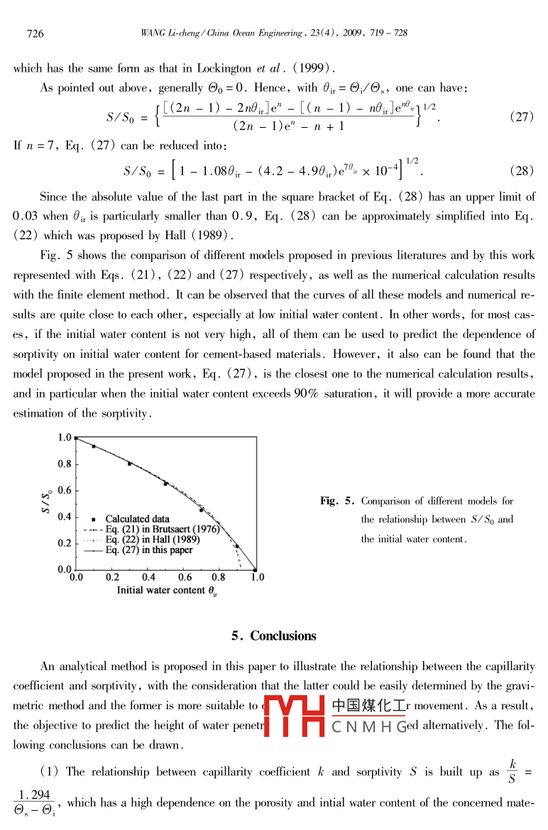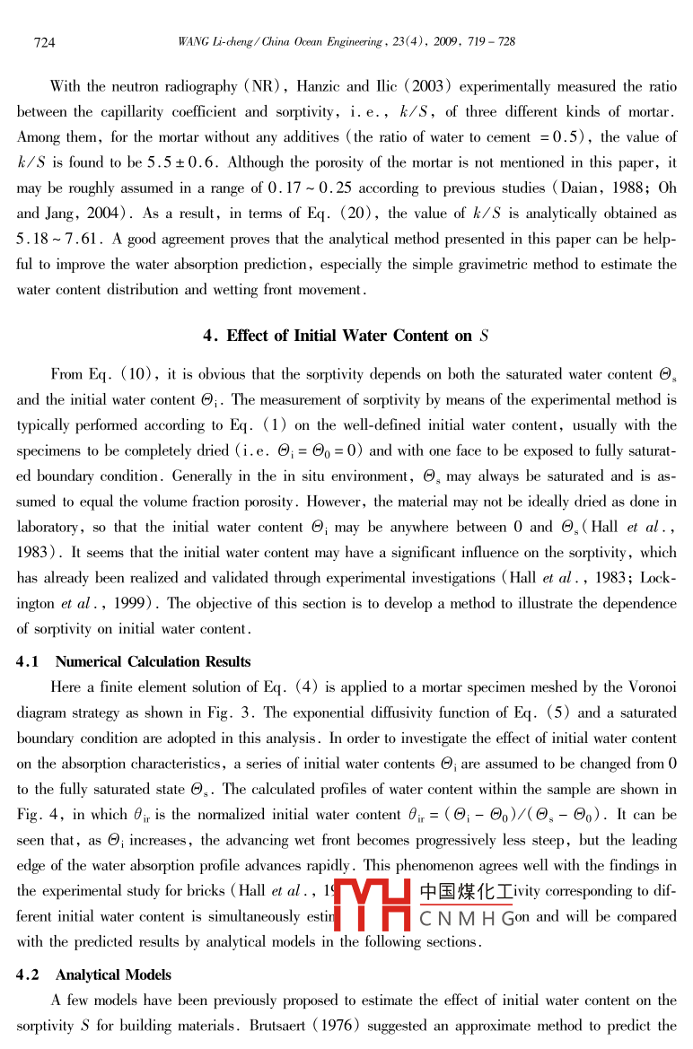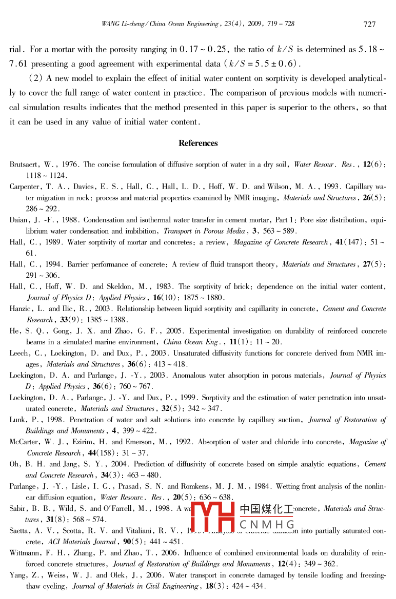 China 0cean Engnering,Vol.23, No.4, pp.719 - 728C 2009 Chinese Ocean Engineering Sociely, ISSN 0890-5487Analytical Methods for Prediction of Water Absorption inCement-Based Material*WANG Li-cheng (王立成)1State Key Laboratory of Coastal and Ofshore Engineering ,Dalian University of Technology ,Dalian 116024, China(Received 9 September 2008; received revised form 5 May 2009; accepled 24 August 2009)ABSTRACTThe capillary absorption of water by unsaturated cement-based material is the main reason of degradation of thestructures subjected to an aggressive environment since water often acts as the transporting medium for damaging contami-nants. It is well known that the capillarity coficient and sorptivity are two important parameters to characterize the waterabsorption of porous materials. Generally, the former is used to describe the penetration depth or height of water trans-port, which must be measured by special and advanced equipment. In contrast,the sorptivity represents the relationshipbetween cumulative volume of water uptake and the square root of the elapsed time, which can be easily measured by thegravimetric method in a normal laboratory condition. In the present study, an analytical method is developed to build upa bridge between these two parameters, with the purpose that the sorptivity or the gravimetric method can be used to prdict the penetration depth of water absorption. Additionally, a new model to explain the dependence of sorptivity on initialwater content of the material is developed in order to fit the in situ condition. The comparison of predicted results by theanalytical method with experimental data or numerical calculation results, as well as some previous models, validates thefeasibility of the methods presented in this paper.Key words: uater absorption ; capillarity cofficient ; sorptivity; cement- based material ; initial uwater content1. IntroductionThe cement- based materials, such as the mortar and concrete, are often subjected to deteriorationprocesses in which water usually acts as the principal medium to transmit aggressive agents (e.g. chlo-ride or sulfate ions) (Yang et al., 2006). It is typical for the structures that are subjected to repeatedwetting and drying regimes, for example, the tidal zone of marine structures ,fluctuating groundwater,exterior facades, tunnel linings, and the materials are rarely in a state of full saturation ( Zhuang andLin, 1989; Saetta et al.,1993; Leech et al., 2003; He et al., 2005 ). The ingress process ofchloride ions ,largely depends on the water absorption process and water content, because under satu-rated conditions ions can diffuse through the continuously water-illed channels. However, when thewater content decreases, the diffusion process is hindered bv the decrease of mumber of the water-filledporous channels (Satta et al.,1993). Under中國煤化Iwalter uplake by cpillayMHCNMHG.* This work was financially supported by the Key Programs of Minitry of Education of China (Grant No. 109046), theScientific Research Foundation for the Returned Overseas Chinese Scholars, State Eduation Ministry, and the Pro-gram of Innovative Research Team of Education of China (Grant No. IRT 0518)1 Corresponding author. E-mail: wanglicheng2000@ 163 . com720WANG Li-cheng/ China Ocean Engineering, 23(4), 2009, 719- 728absorption plays a more dominant role in the ingress of chloride ions and also in the durability of mate-rials (Lunk, 1998).Several methods are available to measure the water absorption property of cement-based materials .Among them, the gravimetric method is the simplest one and therefore has been widely used in someprevious researches and applications although some other advanced techniques have also been utilized(Carpenter et al., 1993; Hanzic and lic, 2003). It is known that the shortcoming of gravimeticmethod is that it can not provide the information of moisture distribution in a sample. As a result it isimpossible to determine the position and movement of the advancing wetting front. However, in somecases, the profile of moisture content as well as the position of wetting front is of great importance toprecisely predict the material durability ( Hanzic and lic, 2003; Parlange et al., 1984).The sorptivity has been widely used to characterize the water absorption property of building ma-terials since it is a well-defined physical parameter and can be easily measured by means of the gravi-metric method. Hence it is also regarded as a measure of the potential durability of cement-based mate-rials ( Hall, 1989; Lockington and Parlange, 2003). The sorptivity defines the rate of water uptake byany porous material when it is exposed to a free water source. When the gravimetric method is applied,the cumulative volume of the absorbed water per unit area of the inflow surface,i, is expressed as :i = Stl,(1)where S is the sorptivity. Usually, S is experimentally determined in a defined initial state of dryness,but it has been revealed that the sorptivity also strongly depends on the initial and final water content ofthe material (Hall, 1994).The purpose of the present work is to propose an analytical method to predict the moisture distri-bution in a specimen during the water absorption process and the front wetting position based on thesorptivity obtained by the traditional gravimetric method. In addition, the dependence of sorptivity oninitial water content is also under consideration.2. Unsaturated Flow Theory2.1 Fundamental Governing EquationAccording to the moisture content, water transport in porous materials can be classified into twotypes, i.e. permeability and sorptivity. Permeability describes the flow of a fluid (e.g, water or air)under the action of gravity or a pressure gradient; sorptivity ( also defined as penetration) is linked to .characterize an unsaturated material's ability to absorb and transmit water by capillary suction forces(McCarter et al.,1992; Sabir et al., 1998)_hat the permeabilty is awrong parame