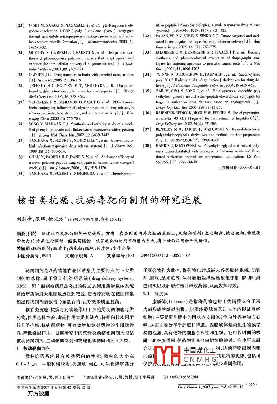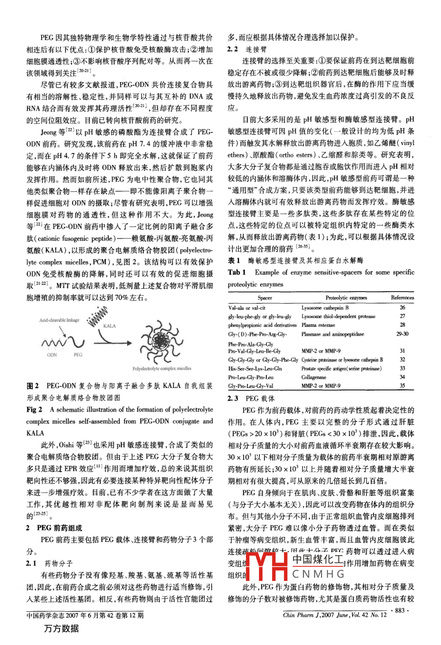 綜述聚乙二醇前藥的研究進(jìn)展蔣福升,丁志山,呂圭源(浙江中醫(yī)藥大學(xué)杭州31003)摘要:目的綜述近年聚乙二醇前藥研究進(jìn)展。方法查閱近十年來國內(nèi)外有關(guān)聚乙二醇前藥文獻(xiàn),對以聚乙二醇為載體的前藥種類、前藥組成及其存在的相關(guān)問題等方面進(jìn)行了綜述。結(jié)果與結(jié)論聚乙二醇由于其獨(dú)特物理學(xué)和生物學(xué)特性,因而在前藥合成領(lǐng)城得到廣泛應(yīng)用。相對原游離藥物,聚♂二醇前藥可以顯著優(yōu)化原游離藥物的藥動(dòng)學(xué)和藥效學(xué)性質(zhì),但存在諸多不足;并且國內(nèi)在這一領(lǐng)域起步較晚,相關(guān)研究報(bào)道也很少,有待進(jìn)一步深入研究。關(guān)鍵詞:聚乙二醇;前藥;載體;連接臂中圖分類號:R943文獻(xiàn)標(biāo)識(shí)碼:A文章編號:1001-2494(2007)12-0881-05聚乙二醇( polyethylene glycol,PEG)與藥物分子連接的方式大致可分為兩種:永久鍵合和非永久鍵合。永久鍵Lysozyme合,即PEG通過化學(xué)鍵與藥物分子穩(wěn)定結(jié)合,而藥物分子仍然能夠有效發(fā)揮藥效,前期大多數(shù)蛋白類藥物以該方式與PEG形成穩(wěn)定復(fù)合物;非永久鍵合,即PEG通過化學(xué)鍵與藥物分子間形成“不穩(wěn)定的結(jié)合”,該類復(fù)合物往往需要在一定的pH值或某些特定的酶存在的條件下,水解釋放出原游離CO+H N-Lysozyme藥物后才能有效發(fā)揮療效;后者即為目前所述的PEG前藥作為傳統(tǒng)藥物制劑輔料的PEG,由于其獨(dú)特物理學(xué)和生圖1可釋放PEG-溶酶體前藥合成及其血漿中釋放圖示3物學(xué)特性2,在前藥合成領(lǐng)域得到廣泛應(yīng)用。筆者對目前以 Fig I rPEG-lysozyme prodrug synthesis and release of lysozymePG為載體的前藥種類前藥組成及其存在的相關(guān)問題等方 from the rPEG-lysozyme conjugates in rat plasma3面作一綜述的飛速發(fā)展,藥物研究又拓展了眾多新的研究領(lǐng)域,如多肽、1PEG前藥種蛋白質(zhì)、核酸類藥物等。其中尤以前兩者較為成熟,至200對于PEG前藥的分類目前沒有統(tǒng)一的標(biāo)準(zhǔn),根據(jù)所連年,美國已批準(zhǔn)80多個(gè)多肽/蛋白藥物進(jìn)入市場,350多個(gè)已接藥物種類不同主要可分為以下3類:①PEG多肽蛋白質(zhì)用于臨床試驗(yàn),占該年全部臨床試驗(yàn)藥物的1/3左右前藥(包括抗體及其某些特異性片段);②PEC有機(jī)小分子研究表明,多肽/蛋白藥物存在較高生物活性,但是臨床前藥;③PEG-核酸前藥。根據(jù)連接臂敏感性不同可分為:①應(yīng)用還存在一定問題,例如易被蛋白酶水解、體內(nèi)循環(huán)半衰pH敏感型前藥;②酶敏感型前藥。根據(jù)整個(gè)前藥分子組成期( half-life)短、水溶性差、腎小球清除率高及具有免疫原性及其水解釋放特性不同可分為:①二連體前藥( bipartite和抗原性等。此外,大多多肽/蛋白藥物均通過皮下或靜注PEG prodrugs主要由PEG、連接臂和藥物分子3部分組給藥,使用不便。直到1978年,Davi等首次應(yīng)用PEG對成,前藥水解直接釋放出藥物分子);②三連體前藥( aspartate蛋白質(zhì)藥物進(jìn)行了修飾,并使蛋白藥物給藥后的穩(wěn)定性得到PEG conjugate主要由PEC、連接臂1作為水解引發(fā)部分、了極大的提高。此后,他們在研究中更是出乎意料地發(fā)現(xiàn)連接臂2和藥物分子4部分,前藥先在連接臂1處引發(fā)水解長鏈PEG可以覆蓋在被修飾蛋白藥物表面而形成一防護(hù)釋放出連接臂2和藥物分子復(fù)合物然后連接臂2繼續(xù)自身罩,從而有效避免了蛋白酶的降解作用;同時(shí)PEG還可以與“催化”水解最終釋放出藥物分子,圖1)34。根據(jù)PEG相水分子通過氫鍵締合形成水化層,從而增加了蛋白質(zhì)水溶性對分子質(zhì)量不同可分為:①小分子PEG前藥;②高分子PEG并降低了腎小球?yàn)V過率;此外,毒副作用及免疫原性也得到前藥等。以下將根據(jù)上述第一種分類方法分別對這3種前極大改善56)。藥進(jìn)行闡述現(xiàn)在,PEG修飾蛋白藥物已經(jīng)成功應(yīng)用于臨床,如PEG1,1PEG多肽/蛋白質(zhì)前藥干擾素a2b( PEG-Intron A)、PEG-非格司亭( PEG-filgras治療藥物主要以化學(xué)藥物為主,近年來,隨著生物技術(shù)中國煤化工呈隨著技術(shù)的進(jìn)步以及CNMHG基金項(xiàng)目:浙江省自然科學(xué)基金資助項(xiàng)目(M303722;Y20676;浙江省中醫(yī)藥重點(diǎn)壩∴JEUI丿作者簡介:蔣福升,男,學(xué)士·通訊作者:丁志山,男,副研究員,碩士生導(dǎo)師Te:(0571)86613666E-mal: zjtcmdzs@163.co中國藥學(xué)雜志2007年6月第42卷第12期Chin Pharm J, 2007 June, Vol. 42 No. 12研究的深人,研究者發(fā)現(xiàn),經(jīng)PEG修飾后藥物的藥動(dòng)學(xué)性質(zhì)非他明等藥物研究也有所報(bào)道但效果均不如原游離藥雖然得到明顯改善,但很多多肽/蛋白藥物藥效活性反而低物。研究表明,大多數(shù)有機(jī)小分子藥物只有以游離狀態(tài)存在于原游離藥物。多肽/蛋白藥物(如酶或抗體等)往往通時(shí)才能發(fā)揮藥效;為此,目前大多研究多采用PEG非永久鍵過底物與酶活性位點(diǎn)的緊密接觸或配體受體形式牢固結(jié)合合形式負(fù)載有機(jī)小分子藥物,即PEG有機(jī)小分子前藥。而發(fā)揮效應(yīng),一旦其活性位點(diǎn)或其附近經(jīng)永久鍵合PEG修Conover等叫以 PEG為載體,甘氨酸為連接臂,通過飾后,則酶的催化活性及抗體與受體的結(jié)合作用將被阻