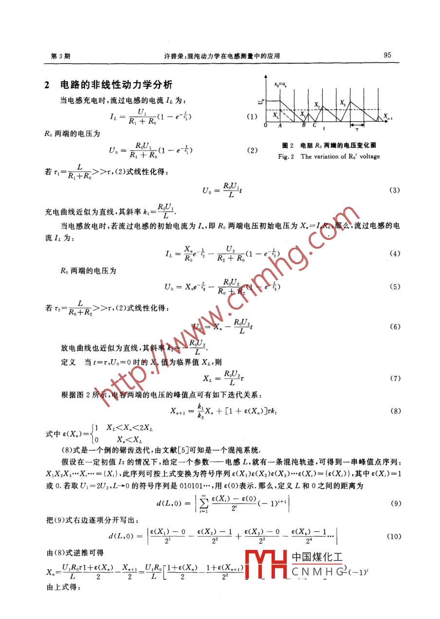 第5卷第3期太原師范學院學報(自然科學版)2006年9月JoURNAL OF TAIYUAN NORMAL UNIVERSITY(Natural Science Edition)Sept. 2006混沌動力學在電感測量中的應用許碧榮(南平師范高等專科學校電子工程系,福建武夷山354300〔摘要〕將混沌理論用于測量,是測量研究及非線性科學應用研究的一個突破,此方法具有極髙的靈敏度和分辨率,因此,提出一種以電感為敏感元件,利用電流源提供初始值的混沌測量系統(tǒng)實現電感的測量,經驗誣具有極髙的精度和良妤的線性度,說明了利用混沌理論實現電感測量的可行性〔關鍵詞〕混沌;測量;電感;電流源〔文章編號]1672-2027(2006)03-0094-04〔中圖分類號]TM930;O415.5〔文獻標識碼〕A0引言混沌理論是一門發(fā)展迅速的前沿科學,混沌系統(tǒng)的最大特點是參數敏感性和初值敏感性參數敏感性是指,當混沌系統(tǒng)的參數有一微小變化時,經過一定時間的演化,其混沌軌道也將發(fā)生顯著的變化12.同樣,初值敏感性是指混沌系統(tǒng)中初值有一微小變化就會引起混沌軌道的很大變化36.這就是混沌測量的理論依據,混沌測量具有極高的靈敏度和極高的分辨率,被認為這是很有發(fā)展前途的領域因此,本文提出一種以電感為敏感元件,由電流源提供系統(tǒng)的初值的混沌測量系統(tǒng),實現電感高精度的測量1微弱電流混沌測量電路電路如圖1所示,U1和U2是電壓源電感L為敏感元件,電流源Is提供系統(tǒng)的初值G是邏輯電路,它根據比較器P的輸出電壓決定電子開關K1或K2的開或關源,對電感L充電使1。1R十R,此。B8時,R兩端電壓為U,即Un=V.=1BBMo邑。信號到達邏輯電路G,邏輯電路G輸出信號把壓倉之下保千比收圖轉,由高電平變低電平,使邏輯電路G動作ku山LG把K2斷開,K1合上,電壓源U1對電感L充電,R兩端電壓隨之上升.當下一個脈沖信號到達時,邏輯電路G把K1斷開,K2合上E又開始下一個周期的放電和充電過程.這圖1微弱電流混沌測量電路樣,U。的運動軌跡就如圖2中的BX1CX2Fig. 1 The chaotic measurement circuits of weak current,由此運動軌跡,可得到一串峰值點序列:X1X2X3…X…只要適當調整U1、U2和r就可以使電路處在混沌狀態(tài).中國煤化工收稿日期:2006-05-19CNMHG基金項目:福建教育廳資助項目TB05184,校青年教師科研基金資助項目XQL05016.作者簡介:許碧榮(1973-),男,福建詔安人,碩士,南平師范高等專科學校電子工程系講師,主要從事信號檢測及處理的研究第3期許碧榮:混沌動力學在電感測量中的應用2電路的非線性動力學分析當電感充電時,流過電感的電流l為:R+ Ro(1R。兩端的電壓為(2)圖2電阻R兩端的電壓變化圖Fig. 2 The variation of R,' voltageL若=R+R>>,2)式線性化得:充電曲線近似為直線其斜率和=當電感放電時,若流過電感的初始電流為l,即R。兩端電壓初始電壓為Xn=InR0,那么,流過電感的電流為:1=R一R,+RC(1-c(4)R兩端的電壓為Uo=Xe,Rtrd1-e?)若v=R+R:>x,(2)式線性化得:放電曲線也近似為直線,其斜率k2=定義當t=x,U0=0時的Xn值為臨界值XL,則(7)根據圖2所示,電容兩端的電壓的峰值點可有如下迭代關系:x,=kx,+[1+e(x,)h1X1