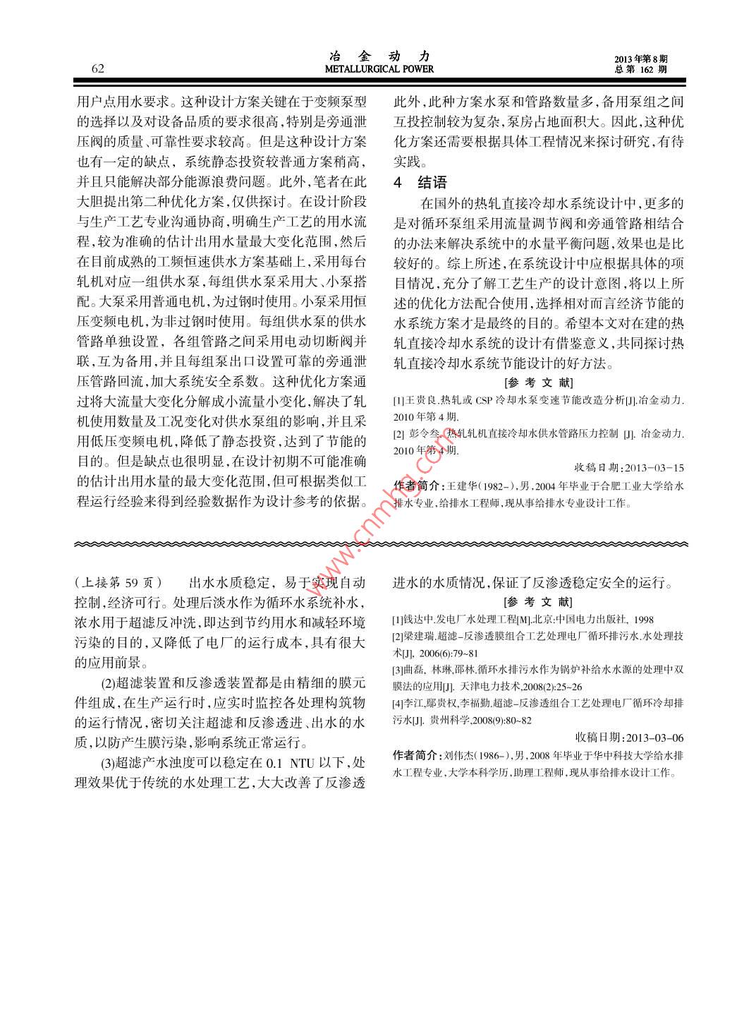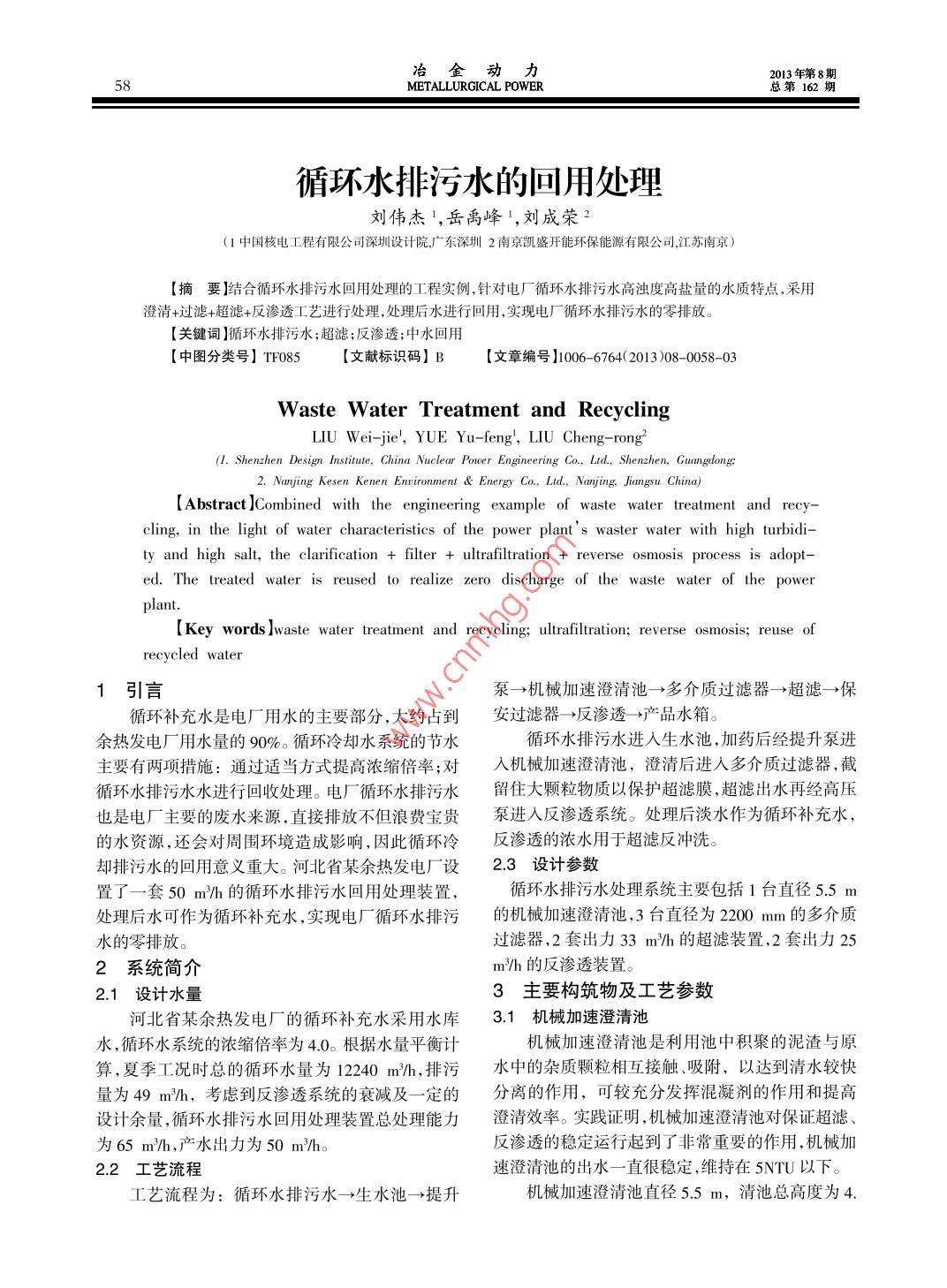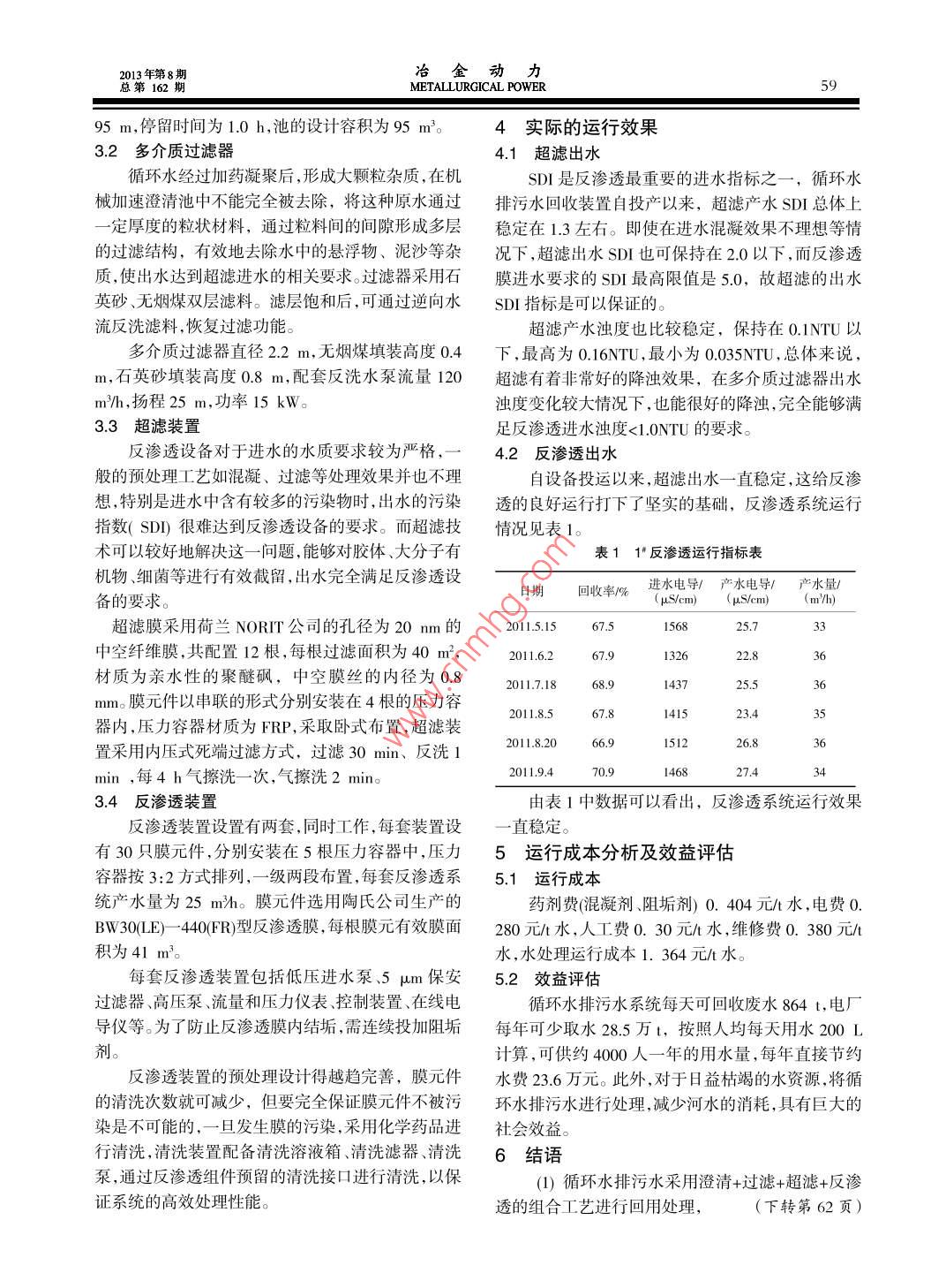 冶金動力013年第8期METALLURGICAL POWER總第162期循環(huán)水排污水的回用處理劉偉杰1,岳禹峰1,劉成榮2(1中國核電工程有限公司深圳設(shè)計院廣東深圳2南京覬盛開能環(huán)保能源有限公司江蘇南京)【摘要】結(jié)合循環(huán)水排污水回用處理的工程實例,針對電廠循環(huán)水排污水高濁度高鹽量的水質(zhì)特點,采用澄清+過濾+超濾+反滲透工藝進行處理,處理后水進行回用,實現(xiàn)電廠循環(huán)水排污水的零排放。關(guān)鍵詞】循環(huán)水排污水;超濾;反滲透;中水回用【中圖分類號】TF085【文獻標(biāo)識碼】B【文章編號】1006-6764(2013)08-0058-03Waste Water Treatment and RecyclingLIU Wei-jie, YUE Yu-feng, LIU Cheng-rong( Shenzhen Design Institute, China Nucle2. Nanjing Kesen Kenen Environment Energy Co, Ltd, Nanjing, Jiangsu Chir[Abstract ]Combined with the engineering example of waste water treatment and recycling, in the light of water characteristics of the power plants waster water with high turbidity and high salt, the clarification filter ultrafiltration reverse osmosis process is adopted. The treated water is reused to realize zero discharge of the waste water of the power(Key words waste water treatment and recycling; ultrafiltration; reverse osmosis; reuse ofrecycled water1引言泵→機械加速澄清池→多介質(zhì)過濾器→超濾→保循環(huán)補充水是電廠用水的主要部分,大約占到安過濾器→反滲透→產(chǎn)品水箱。余熱發(fā)電廠用水量的90%。循環(huán)冷卻水系統(tǒng)的節(jié)水循環(huán)水排污水進入生水池,加藥后經(jīng)提升泵進主要有兩項措施:通過適當(dāng)方式提高濃縮倍率;對入機械加速澄清池,澄清后進入多介質(zhì)過濾器,截循環(huán)水排污水水進行回收處理。電廠循環(huán)水排污水留住大顆粒物質(zhì)以保護超濾膜,超濾出水再經(jīng)高壓也是電廠主要的廢水來源,直接排放不但浪費寶貴泵進入反滲透系統(tǒng)。處理后淡水作為循環(huán)補充水,的水資源,還會對周圍環(huán)境造成影響,因此循環(huán)冷反滲透的濃水用于超濾反沖洗。卻排污水的回用意義重大。河北省某余熱發(fā)電廠設(shè)2.3設(shè)計參數(shù)置了一套50m/h的循環(huán)水排污水回用處理裝置循環(huán)水排污水處理系統(tǒng)主要包括1臺直徑5.5m處理后水可作為循環(huán)補充水,實現(xiàn)電廠循環(huán)水排污的機械加速澄清池,3臺直徑為2200m的多介質(zhì)水的零排放過濾器,2套出力33m/h的超濾裝置,2套出力252系統(tǒng)簡介m3/h的反滲透裝置。21設(shè)計水量3主要構(gòu)筑物及工藝參數(shù)河北省某余熱發(fā)電廠的循環(huán)補充水采用水庫31機械加速澄清池水,循環(huán)水系統(tǒng)的濃縮倍率為40。根據(jù)水量平衡計機械加速澄清池是利用池中積聚的泥渣與原算,夏季工況時總的循環(huán)水量為12240m/h,排污水中的雜質(zhì)顆粒相互接觸、吸附,以達到清水較快量為49m沿h,考慮到反滲透系統(tǒng)的衰減及一定的分離的作用,可較充分發(fā)揮混凝劑的作用和提高設(shè)計余量,循環(huán)水排污水回用處理裝置總處理能力澄清效率。實踐證明,機械加速澄清池對保證超濾為65mh,產(chǎn)水出力為50m3/h反滲透的穩(wěn)定運行起到了非常重要的作用,機械加2.2工藝流程速澄清池的出水一直很穩(wěn)定,維持在5NTU以下。工藝流程為:循環(huán)水排污水→生水池一提升機械加速澄清池直徑5.5m,清池總高度為4.年第8期冶金動力第162期METALLURGICAL POWER5995m,停留時間為1.0h,池的設(shè)計容積為95m3。4實際的運行效果32多介質(zhì)過濾器4.1超濾出水循環(huán)水經(jīng)過加藥凝聚后,形成大顆粒雜質(zhì),在機SDI是反滲透最重要的進水指標(biāo)之一,循環(huán)水械加速澄清池中不能完全被去除,將這種原水通過排污水回收裝置自投產(chǎn)以來,超濾產(chǎn)水SD總體上定厚度的粒狀材料,通過粒料間的間隙形成多層穩(wěn)定在1.3左右。即使在進水混凝效果不理想等情的過濾結(jié)構(gòu),有效地去除水中的懸浮物、泥沙等雜況下,超濾出水SD也可保持在2.0以下,而反滲透質(zhì),使出水達到超濾進水的相關(guān)要求。過濾器采用石膜進水要求的SD最高限值是50,故超濾的出水英砂、無煙煤雙層濾料。濾層飽和后,可通過逆向水SD指標(biāo)是可以保證的。流反洗濾料,恢復(fù)過濾功能超濾產(chǎn)水濁度也比較穩(wěn)定,保持在0.1NTU以多介質(zhì)過濾器直徑2.2m,無煙煤填裝高度0.4下,最高為0.16NTU,最小為0.035NTU,總體來說,,石英砂填裝高度0.8m,配套反洗水泵流量120超濾有著非常好的降濁效果,在多介質(zhì)過濾器出水m3/h,揚程25m,功率15kW。濁度變化較大情況下,也能很好的降濁,完全能夠滿3.3超濾裝置足反滲透進水濁度<10NTU的要求。反滲透設(shè)備對于進水的水質(zhì)要求較為嚴(yán)格,4.2反滲透出水般的預(yù)處理工藝如混凝、過濾等處理效果并也不理自設(shè)備投運以來,超濾出水一直穩(wěn)定,這給反滲想,特別是進水中含有較多的污染物時,出水的污染透的良好運行打下了堅實的基礎(chǔ),反滲透系統(tǒng)運行指數(shù)(SD)很難達到反滲透設(shè)備的要求。而超濾技情況見表1術(shù)可以較好地解決這一問題,能夠?qū)δz體、大分子有表11反滲透運行指標(biāo)表機物、細菌等進行有效截留,出水完全滿足反滲透設(shè)備的要求B回收率%心sm(pscm(mh超濾膜采用荷蘭NORT公司的孔徑為20m的0115.1567.51568中空纖維膜,共配置12根,每