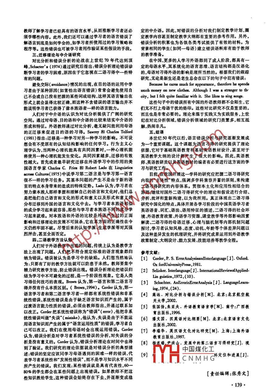 2008年第2期世紀(jì)橋.No. 2,2008(總第148期)Shi Ji Qiao(General No. 148)應(yīng)用對比分析和錯(cuò)誤分析吳彩萍(金華職業(yè)技術(shù)學(xué)院,浙江金華321017)摘要:當(dāng)對比分析運(yùn)用于教學(xué)的時(shí)候,它不再是純語言學(xué)的,而是吸收和運(yùn)用心理學(xué)、心理語言學(xué)等學(xué)科的理論,成為一門跨學(xué)科的研究。貫徹本土化和應(yīng)用性相結(jié)合的原則,對國外二語習(xí)得研究中的理論和假設(shè)進(jìn)行介紹、分析、批評和重新構(gòu)建,以為我所用。關(guān)鍵詞:應(yīng)用對比分析;錯(cuò)誤分析;語言教學(xué)對比分析,也叫對比語言學(xué),主要是對語言變體進(jìn)行共預(yù)見的方法?!?Lado 的這一-假設(shè)不僅成為對比語言學(xué) 的基本時(shí)的比較研究,發(fā)現(xiàn)他們的共性和差異。對比語言學(xué)在上世思想,也影響了 全世界的外語教學(xué)。紀(jì)50年代初至60年代中期在美國得到了蓬勃發(fā)展。60年二、錯(cuò)誤分析代后期,應(yīng)用語言學(xué)和語言教學(xué)受認(rèn)知心理語言學(xué)的影響,隨著國際上語言學(xué)的不斷發(fā)展,人們對前者的批判性研逐漸轉(zhuǎn)向?qū)φZ言習(xí)得過程的研究,因此70年代以后,錯(cuò)誤分究的深人,Lado 的對比分析理論也受到人們的質(zhì)疑。一種批析在很大程度上取代了對比分析。然而,這一時(shí)期對比語言評來 自對對比分析的預(yù)測能力的懷疑;另一種批評涉及兩種學(xué)在歐洲卻得到了很大的發(fā)展。目前,許多美國應(yīng)用語言學(xué)語 言對比的可行性問題;人們發(fā)現(xiàn)Lado的理論實(shí)際上基于家也認(rèn)識到、在外語教學(xué)中錯(cuò)誤分析與對比分析都發(fā)揮了一語言學(xué) 上的結(jié)構(gòu)主義和心理學(xué)上的行為主義。這種研究和定的作用。呂叔湘先生指出,“只有比較才能看出各種語文運(yùn)用帶 有很大的片面性,它對外語教學(xué)的指導(dǎo)性并不全面。表現(xiàn)法的共同之點(diǎn)和特殊之點(diǎn)"。對比語言學(xué)的理論意義正對比分析認(rèn)為通過認(rèn)定 L和L2的語言結(jié)構(gòu)差異能夠預(yù)見是通過對比,使我們加深對所對比語言的認(rèn)識,同時(shí)也促進(jìn)學(xué)習(xí)者在學(xué)習(xí)該門外語中可能會犯哪些錯(cuò)誤,從而,教師可整個(gè)語言學(xué)研究的深人,完善某些語言理論。在應(yīng)用方面,以采取措施預(yù)防這種錯(cuò)誤的出現(xiàn)。對比分析的基本主張是對比語言學(xué)對于外語教學(xué)翻譯、雙語辭典的編纂等都有著當(dāng)母語的習(xí)慣與目的語不同的時(shí)候,犯錯(cuò)誤的可能性就大, .直接的指導(dǎo)意義。當(dāng)對比分析運(yùn)用于教學(xué)的時(shí)候,它不再是學(xué)習(xí)者會把母語中的習(xí)慣遷移到目的語中形成干擾。這就純語言學(xué)的,而是吸收和運(yùn)用心理學(xué)心理語言學(xué)等學(xué)科的是“ 母語干擾理論”。但是人們發(fā)現(xiàn):母語與目的語之間的差理論,成為一門跨學(xué)科的研究。錯(cuò)誤分析研究學(xué)習(xí)者語言錯(cuò)參數(shù)很大的地方不-定出現(xiàn)很大的錯(cuò)誤,而相似的地方卻誤的類型和原因,它與對比分析的關(guān)系不是相互取代和排出現(xiàn)很多問題。 人們在二語教學(xué)中發(fā)現(xiàn),用對比分析來預(yù)見斥,而是共存和互補(bǔ)。學(xué)習(xí)者的困難與錯(cuò)誤在某些方面是有效的,可是在某些方面-.對比分析卻是失敗的,因此, Lado的對比分析受到力量許多語言學(xué)家對比分析的概念是由上個(gè)世紀(jì)著名語言學(xué)家Bejanin的質(zhì)疑和抨擊。 [Wardhaugh( 1970) ,Slinker(1972) ,RichardWhorf 1941年提出的,他通過對兩種或者更多的語言進(jìn)行共(1974) ,Teylor( 1975)].在這種情況下,人們開始對行為注時(shí)比較發(fā)現(xiàn)它們在結(jié)構(gòu)和功能上的異同。對普通語言學(xué)的意進(jìn)行檢討對遷移學(xué)說的科學(xué)性進(jìn)行重新論證。在此基礎(chǔ)理論進(jìn)行修正或者補(bǔ)充,或者提出更新。第-一個(gè)系統(tǒng)地闡述上,- -種新的學(xué)說一 錯(cuò)誤分析理論誕生了,盡管它同認(rèn)知.并把對比理論御用與教學(xué)的是美國著名結(jié)構(gòu)主義語言學(xué)家、注意仍然有一定距離。錯(cuò)誤分析理論認(rèn)為;在習(xí)得第二語言語言教學(xué)專家Robert Lado,他在其著作linguistics across cul-過程中,人們所犯下的錯(cuò)誤和習(xí)得第-語言時(shí)-樣,都是“發(fā)ture( 1957)中提出了這樣的假設(shè):“人們傾向于把本民族的語展性錯(cuò)誤" ,這些錯(cuò)誤都來源于過分類推( overgelazain)、言和文化形式、意義以及他們的分布遷移到外族的語言和文不完全規(guī)則運(yùn)用(incomplete ule aplication)和錯(cuò)誤概念假化中去。他們在主動使用外語時(shí)也是-樣"。對比分析的設(shè)( hypothesizing of fnlse concepts)。( Selinker, 1972)。Rich-初衷是試圖以行為主義心理學(xué)和結(jié)構(gòu)主義語盲學(xué)作為理論ards(1971)認(rèn)為,這些錯(cuò)誤“反映了學(xué)習(xí)者在特定階段的學(xué)支撐,來解決第二語言學(xué)習(xí)與教學(xué)中的問題。對比分析假設(shè)習(xí)能力.因此,這些錯(cuò)誤有個(gè)體之間的差異"。錯(cuò)誤是語言學(xué)目標(biāo)是通過兩種語言系統(tǒng)(L1和I2)的對比,發(fā)現(