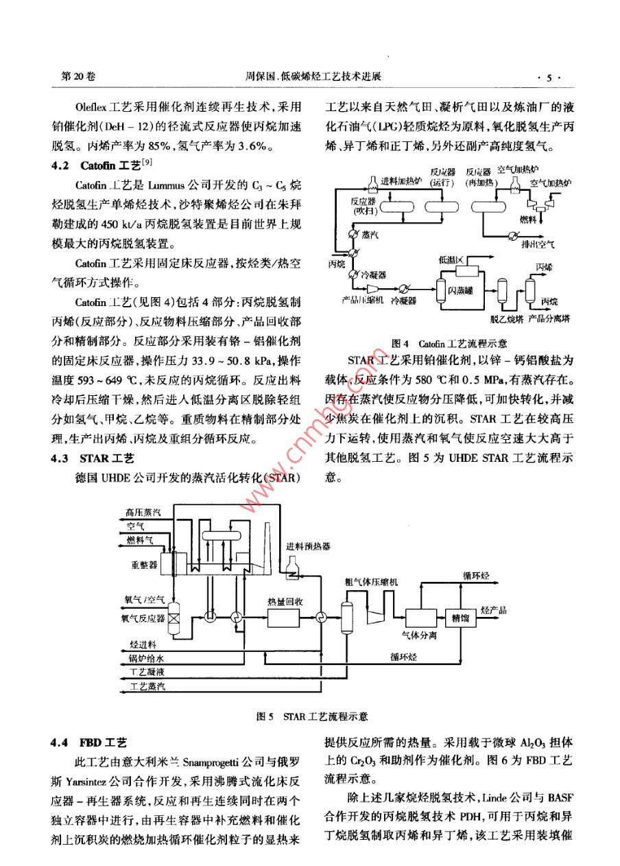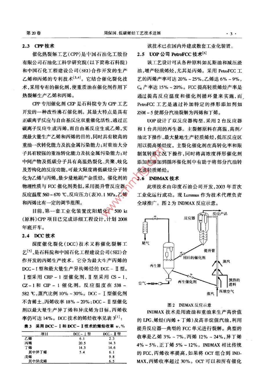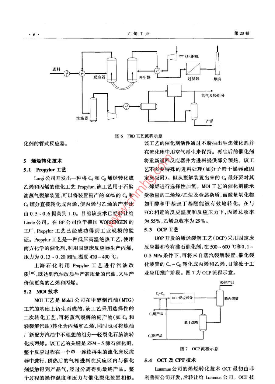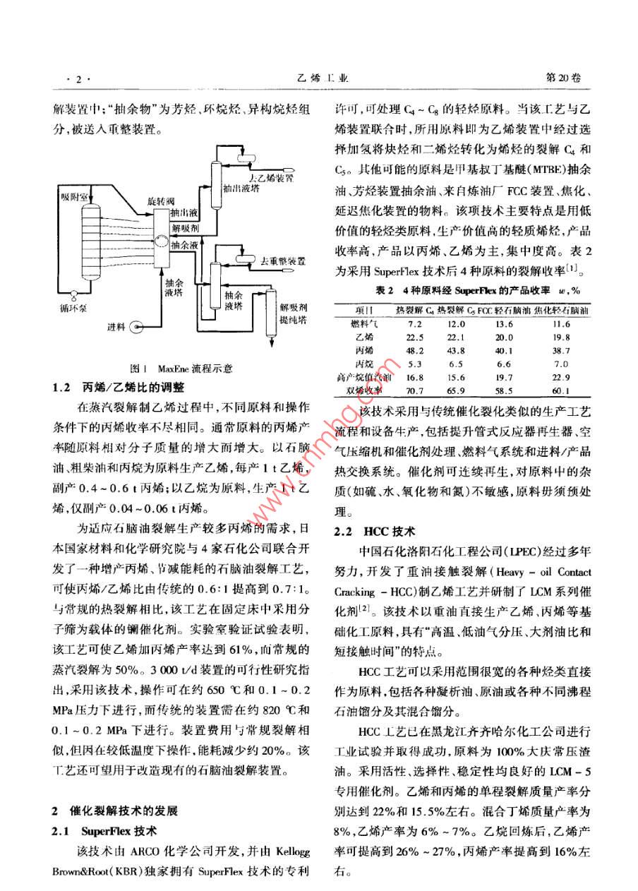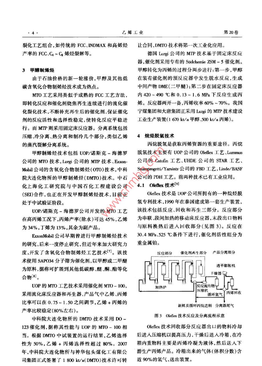 綜述乙烯τ業(yè)2008.20(3) 1~7ETYLENE INDUSTRY低碳烯烴工藝技術(shù)進(jìn)展周保國(中國石化工程建設(shè)公司,北京, 100101)摘要:介紹生產(chǎn)己烯和丙烯工藝技術(shù)的進(jìn)展。包括傳統(tǒng)的蒸汽裂解工藝的優(yōu)化,催化裂解技術(shù)的發(fā)展以及烷烴脫氫及烯烴轉(zhuǎn)化等技術(shù)的應(yīng)用。關(guān)鍵詞:乙烯;丙烯;裂解;烷烴脫氫;烯烴轉(zhuǎn)化乙烯和丙烯等低碳烯烴是重要的有機(jī)化工原用;二元和三元制冷技術(shù);HRS技術(shù)等等??傊?隨著工程塑料等衍生物需求的迅速增長,對乙技 術(shù)的不斷進(jìn)步使傳統(tǒng)乙烯裂解技術(shù)更趨完善。烯和丙烯的需求也逐漸增加。在乙烯和丙烯需求1.1原料優(yōu)化 - MaxEne工藝增長的同時(shí),烯烴生產(chǎn)技術(shù)也在不斷發(fā)展和更新,MaxEne工藝技術(shù)由UOP公司開發(fā),圖1為該原料多樣化、低能耗、提高烯烴收率是烯烴技術(shù)發(fā)工藝流程示意。該工藝通過采用吸附分離裝置從展的大方向。除了傳統(tǒng)的蒸汽裂解和催化裂化在全餾程石腦油(Cs ~ Cn )中分離出正構(gòu)烷烴,從而技術(shù)上不斷地進(jìn)行優(yōu)化外,新的烯烴生產(chǎn)技術(shù)也以提高裂解裝置進(jìn)料中正構(gòu)烷烴濃度來提高乙烯在不斷進(jìn)行開發(fā)試驗(yàn),有些已經(jīng)應(yīng)用于工業(yè)化。收率。 MaxEne 技術(shù)對裂解產(chǎn)物收率的影響見表1。由于生產(chǎn)乙烯、丙烯的主要原料-原油的價(jià)格長表1應(yīng)用MaxEne對產(chǎn)物收率的影響1o,%期居高不下,傳統(tǒng)蒸汽裂解技術(shù)的優(yōu)化、裂解原料項(xiàng)H基難工況MaxEine. .配氫氣0.92的最大化利用及生產(chǎn)高收率乙烯、丙烯的其它技甲大16.07術(shù)的重要性日益突出。因此,全面了解烯烴生產(chǎn)乙烯28.5538.15丙烯15.1415.03技術(shù)是非常必要的。丁烯8.446.82以下對生產(chǎn)乙烯和丙烯的技術(shù)進(jìn)展進(jìn)行介苯9.485.78裂解汽油15.9110.06紹。LPG5.437.17富含正構(gòu)烷烴的石腦油是較好的裂解原料,1傳統(tǒng)蒸汽裂解的優(yōu)化而含少量正構(gòu)烷烴,富含芳烴、環(huán)烷烴、異構(gòu)烷烴管式蒸汽裂解深冷分離仍是當(dāng)今世界乙烯生的石腦油是較好的催化重整的原料。因此該工藝產(chǎn)的主流技術(shù),也是不斷發(fā)展完善的傳統(tǒng)烯烴生十分適合燕氣裂解裝置、煉油廠及芳烴廠組成的產(chǎn)技術(shù)。近年來該技術(shù)無突破性或稱革命性的變聯(lián)合裝置。工藝中采用定型選擇吸附劑,在模擬革,技術(shù)的進(jìn)步主要側(cè)重于節(jié)能降耗、優(yōu)化流程、移動床中,進(jìn)行吸附分離,正構(gòu)烷烴先從石腦油中節(jié)省投資等方面。具體表現(xiàn)在:裂解爐的大型化,選擇性吸附,然后用烷烴類解吸劑解吸,解吸劑用單臺爐能力已由20世紀(jì)90年代的60- 80k/a,提分餾法回收并 循環(huán)使用。該工藝有兩股產(chǎn)物物高到目前的275 kU/a(石腦油裂解)。據(jù)稱, Lummus流,“抽出物”為濃縮的正構(gòu)烷烴,被送人石腦油裂新開發(fā)的SRT- X裂解爐能力已經(jīng)達(dá)到325 kV/a,目前尚未商業(yè)化應(yīng)用;急冷油臧粘系統(tǒng)和熱回收收稿日期:2007-12- 10。系統(tǒng)改進(jìn);壓縮系統(tǒng)注水降溫、防結(jié)焦和干氣密封作者簡介:周保國(1976- ),男,江蘇人, 1998爾畢業(yè)于浙江大技術(shù);熱泵技術(shù);高效塔板、高熱通量換熱器的采學(xué)化工系,獲「.學(xué)學(xué)1:學(xué)位.現(xiàn)從中石油化工設(shè)計(jì), C藝I程師。乙烯工業(yè)第20卷解裝置中:“抽余物”為芳烴.環(huán)烷烴、異構(gòu)烷烴組許可,可處理C4~ Ce的輕烴原料。當(dāng)該工藝與乙.分,被送入重整裝置。烯裝置聯(lián)合時(shí),所用原料即為乙烯裝置中經(jīng)過選擇加氫將炔烴和二烯烴轉(zhuǎn)化為烯烴的裂解C4和上乙烯裝置Cs。其他可能的原料是甲基叔丁基醚( MTBE)抽余抽出液塔油芳烴裝置抽余油、來自煉油廠FCC裝置、焦化、| 吸附室旋轉(zhuǎn)閥抽出液延遲焦化裝置的物料。該項(xiàng)技術(shù)主要特點(diǎn)是用低解吸劑價(jià)值的輕烴類原料,生產(chǎn)價(jià)值高的輕質(zhì)烯烴,產(chǎn)品抽余液去重幣裝霞收率高,產(chǎn)品以丙烯、乙烯為主,集中度高。表2為采用SuperFlex技術(shù)后4種原料的裂解收率[1]。表2 4 種原料經(jīng)SuperPex的產(chǎn)品收率w,%抽余循環(huán)泵.液塔| 解吸劑項(xiàng)目熱裂解G熱裂解Cs FOC輕石腦油焦化輕石腦油|提純塔進(jìn)料o燃料氣7.212.013.611.6了乙烯22.52.120.019.8丙烯48.243.840.138.7丙烷5.36.56.67.0圖1 MaxEme 流程示意商產(chǎn)烷值汽油16.815.619.722.91.2丙烯/乙烯比 的調(diào)整雙烯收率70.765.958.50.1在蒸汽裂解制乙烯過程中,不同原料和操作該技術(shù)采用與傳統(tǒng)催化裂化類似的生產(chǎn)工藝條件下的丙烯收率不盡相同。通常原料的丙烯產(chǎn)流程 和設(shè)備生產(chǎn).包括提升管式反應(yīng)器再生器、空率隨原料相對分子質(zhì)量的增大而增大。以石腦氣壓縮機(jī) 和催化劑處理、燃料氣系統(tǒng)和進(jìn)料/產(chǎn)品油、粗柴油和丙烷為原料生產(chǎn)乙烯,每產(chǎn)1 t乙烯,熱交換系統(tǒng)。催化劑可連續(xù)再生,對原料中的雜副產(chǎn)0.4~0.6 t丙烯;以乙烷為原料,生產(chǎn)1 t乙質(zhì)(如硫、水、氧化物和氮)不敏感,原料毋須預(yù)處烯,僅副產(chǎn)0.04 ~ 0.06 t丙