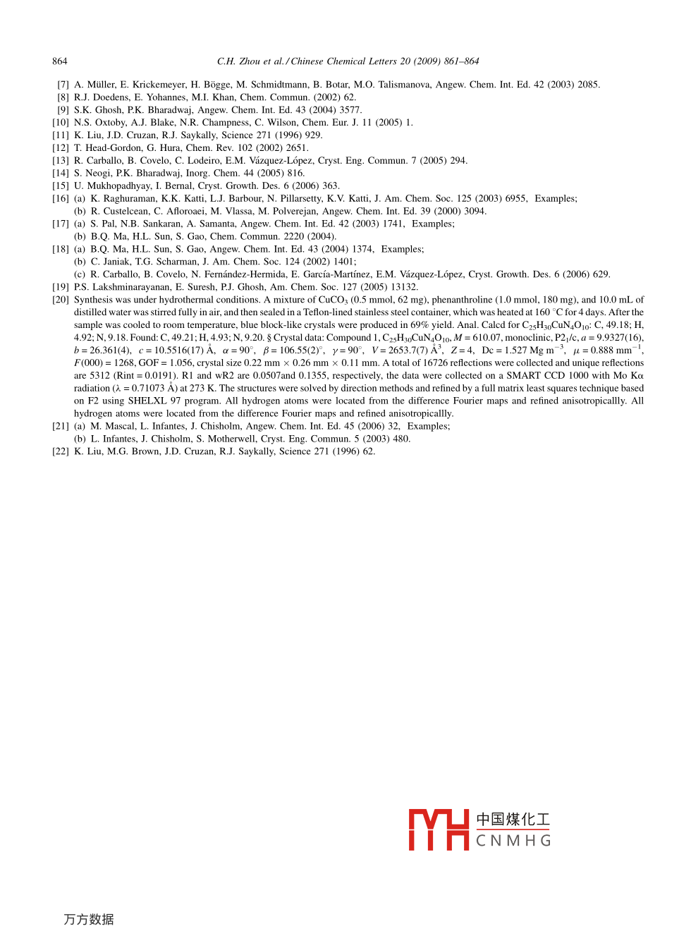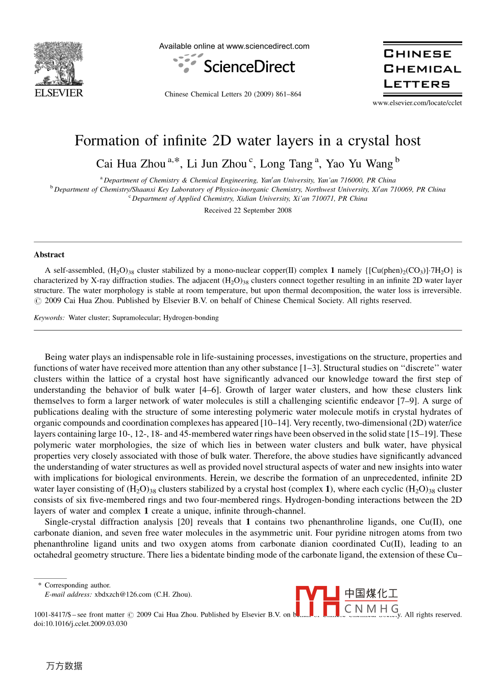 Available online at www.sciencedirect.comCHINESEScienceDirectC HEMICALL .ETTERSELSEVIERChinese Chemical Letters 20 (2009) 861- 864www.elsevier.com/locate/ccletFormation of infinite 2D water layers in a crystal hostCai Hua Zhou**, Li Jun Zhou°, Long Tang", Yao Yu Wang“Department of Chemistry & Chemical Engineering, Yan' an University, Yan'an 716000, PR Chinab Department of Chemistry/Shaanxi Key Laboratory of Physico inorganic Chemistry, Northwest University, Xi an 710069, PR China° Department of Applied Chemistry, Xidian Universit, Xi an 710071, PR ChinaReceived 22 September 2008AbstractA self assembled, (H2O)38 cluster stabilized by a mono nuclear copper(I) complex 1 namely {[Cu(phen)2(CO3)]-7H2O} ischaracterized by X-ray diffraction studies. The adjacent (H2O)38 clusters connect together resulting in an infinite 2D water layerstructure. The water morphology is stable at room temperature, but upon thermal decomposition, the water loss is irreversible.◎2009 Cai Hua Zhou. Published by Elsevier B.V. on behalf of Chinese Chemical Society. All rights reserved.Keywords: Water cluster, Supramolcular; Hydrogen. bondingBeing water plays an indispensable role in life-sustaining processes, investigations on the structure, properties andfunctions of water have received more attention than any other substance [1-3]. Structural studies on“discrete'”waterclusters within the lattice of a crystal host have significantly advanced our knowledge toward the first step ofunderstanding the behavior of bulk water [4 -6]. Growth of larger water clusters, and how these clusters linkthemselves to form a larger network of water molecules is still a challenging scientific endeavor [7- -9]. A surge ofpublications dealing with the structure of some interesting polymeric water molecule motifs in crystal hydrates oforganic compounds and coordination complexes has appeared [10- 14]. Very recently, two-dimensional (2D) waterl/icelayers containing large 10-, 12-, 18- and 45-membered water rings have been observed in the solid state [15-19]. Thesepolymeric water morphologies, the size of which lies in between water clusters and bulk water, have physicalproperties very closely associated with those of bulk water. Therefore, the above studies have significantly advancedthe understanding of water structures as well as provided novel structural aspects of water and new insights into waterwith implications for biological environments. Herein, we describe the formation of an unprecedented, infinite 2Dwater layer consisting of (H2O)38 clusters stabilized by a crystal host (complex 1), where each cyclic (H2O)38 clusterconsists of six five-membered rings and two four-membered rings. Hydrogen-bonding interactions between the 2Dlayers of water and complex 1 create a unique, infinite through-channel.Single-crystal diffraction analysis [20] reveals that 1 contains two phenanthroline ligands, one Cu(II), onecarbonate dianion, and seven free water molecules in the asymmetric unit. Four pyridine nitrogen atoms from twophenanthroline ligand units and two oxygen atoms from carbonate dianion coordinated Cu(I), leading to anoctahedral geometry structure. There lies a bidentate binding mode of the carbonate ligand, the extension of these Cu-Corresponding author.E-mail adress: xbdxzch@ 126. com (C.H. Zhou).中國煤化工1001-8417/$ - see front matter◎2009 Cai Hua Zhou. Published by EIlsevier B.V. on IMYHCNMHGAll rights reserved.doi: 10.1016/.cclet.2009.03.030862C.H. Zhou et al./ Chinese Chemical Letters 20 (2009) 861- -864。01?!?294Fig. 1. 2D sheet structure in crystalographic ab plane (hydrogen atoms are onitted for clarity).O bonds [Cu- _O5 2.287(6) and Cu- _O4 2.683 (6) A] should ascribe to the Jahn- -Teller effect. The complex 1 isassociated with free water molecules through O1-H.. .O9w, O2- -H..O4w,03- H..O4w and O3- H.. .O6w .hydrogen-bonding interactions form a 2D sheet structure in crystallographic [0 01] plane (Fig. 1). The 2D sheets arefurther extended along [0 01] plane by hydrogen bonds among water molcules generating a 3D supramolecularstructure. (see supporting information, Fig. S2).n order to investigate the function of organic-metal complexes stabilizing various water topologies irenvironments resembling those in living systems, we have examined the topology structure of the supramolecularassembly of the water molecules. Seven water molecules exist in coordination complex crystal host, which formed aninfinite 2D water layer in the [1 0 0] plane by hydrogen bonds. The 2D water layer is composed of a unique (H2O)38cluster with symmetric center (Fig.2), which is formed by a type of tetramer and a type of pentamer. Basically, the905010ρ9.....中國煤化工MYHCNMHGFig. 2. The 2D layer of water is composed of a unique (H2O)38 clusters (hydrogen atoms are omitted for clarity).C.H. Zhou et al./Chinese Chemical Letters 20 (2009) 861- 864863(H2O)38 cluster unit is an assembly of six (H2O)s and two (H2O)4 subunits. Water molcules connected together byhydrogen bonds. According to the classification system of common aggregation states adopted by hydrogen-bondedwater molecules [21], this cycle (H2O)38 belongs to a L38(10)5(2)4(2)4(1) pattern, and it possesses D2a-symmetry.Although the data collction for the complex 1 is carried out under liquid-nitrogen temperature conditions (100 K)most of the water hydrogen atoms were never located, however, positions of the water molecules constituting the 2Dsupramolecular architecture were determined unequivocally. The subunit (H2O)s comprised five different oxygenatoms (O6w, O7w, O8w, O9w, O10w) whose conformation is similar to cyclopentane with one water molecule raisingup above the plane formed by the other four oxygen atoms. The water pentamer topology described here is inagreement with the puckered ring achieved from both experimental and theoretical studies by Liu et al. [22]. Adjacentpentamers connected each other by the way of centers of inversion, these pentamers produce a 1D T4(2)